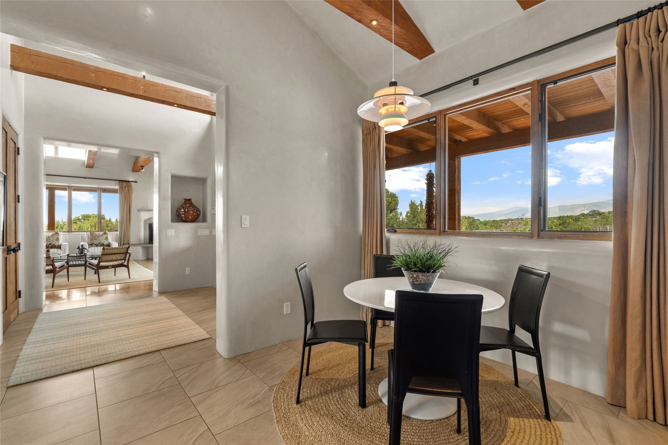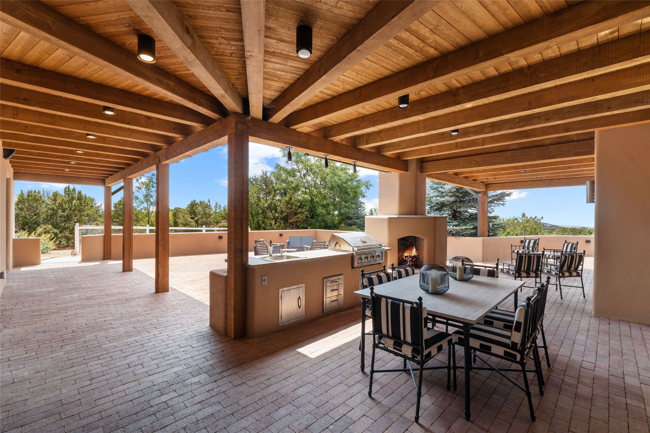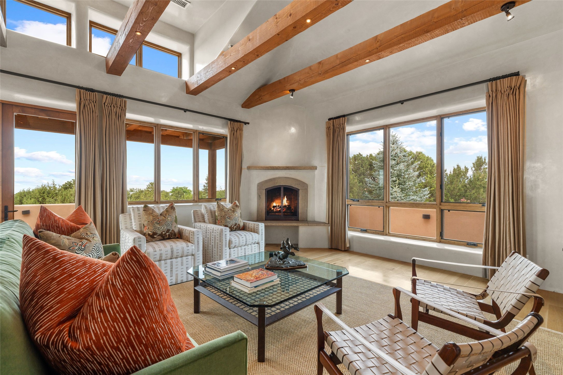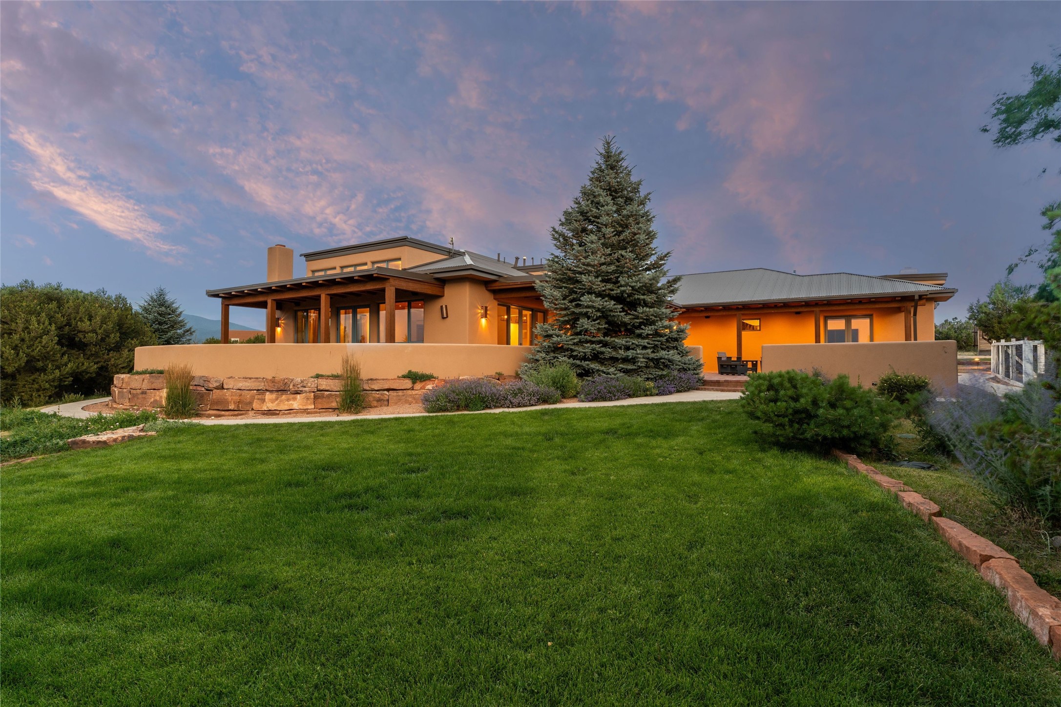 Northern New Mexican style 5-bedroom, 4.5-bath custom-built 5,200 sq. ft. home spanning over 2.5 acres offers panoramic 180-degree views that stretch from the majestic Sangre de Cristo Mountains to the captivating Badlands and Los Alamos.Positioned at the end of a private, gated drive and surrounded by an 8-foot-high coyote fence, this residence is a true entertainer's delight. The open floor plan flows effortlessly into spacious covered and uncovered patios, ideal for hosting both intimate gatherings and grand celebrations. Crafted by Driscoll Construction in 2015, the home showcases bespoke design elements, including custom solid wood doors, white oak flooring, and elegant plaster walls throughout the common areas and primary suite. Enjoy the warmth of three fireplaces, including one on the expansive 1,500 sq. ft. portal, where you can relish both sunrise and sunset vistas.The gourmet kitchen invites culinary creativity with its generous center island, clerestory windows, premium appliances, and double dishwashers. Prioritize wellness with a primary bath steam shower, a 300 sq. ft. gym, an outdoor 6-person sauna, a vegetable garden on drip irrigation, and a fully enclosed chicken coop.Additional highlights include a pitched metal roof, an oversized 3-car garage, photovoltaic solar energy, and rainwater harvesting. Recent upgrades in 2023 encompass new stucco, water filtration, a dog run, and an outdoor grill. Enjoy convenient access to downtown Santa Fe, all while embracing the serene beauty of this exceptional property.