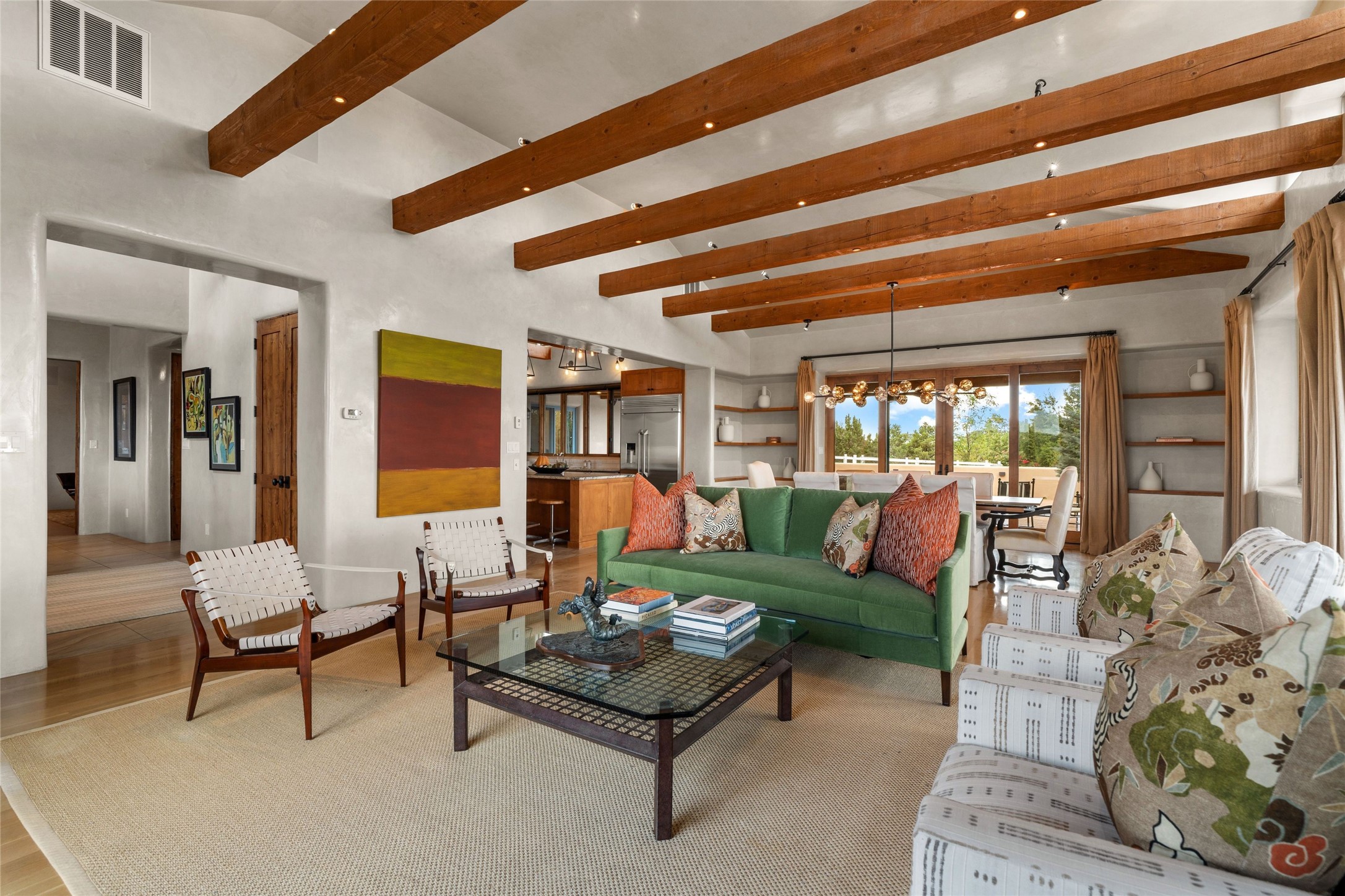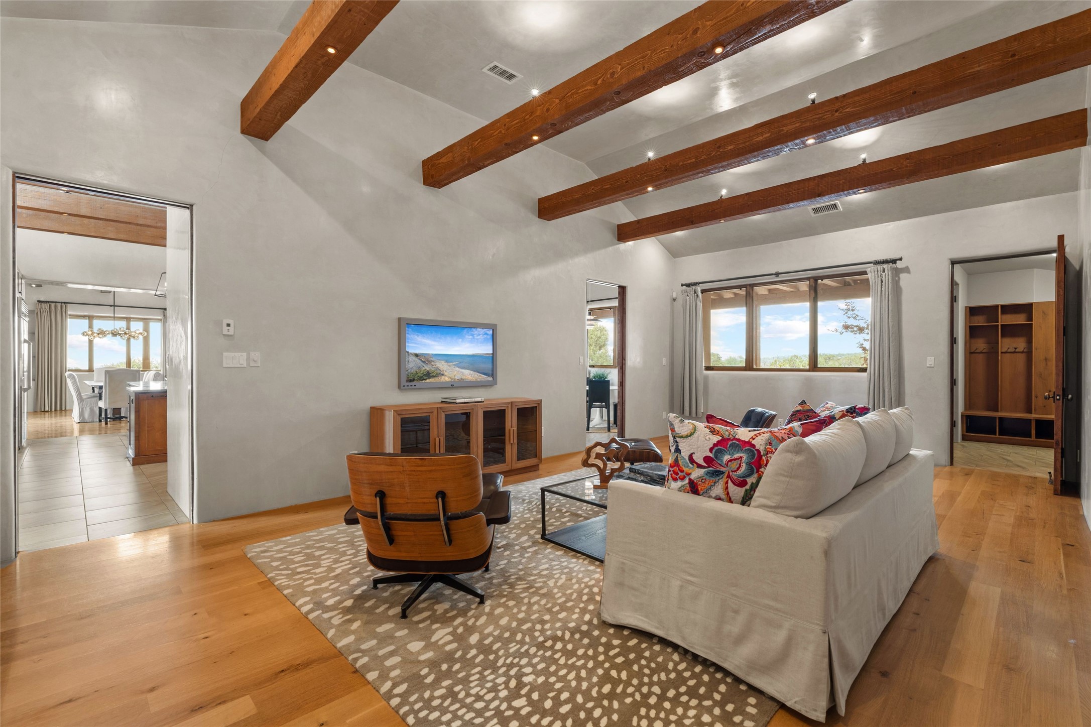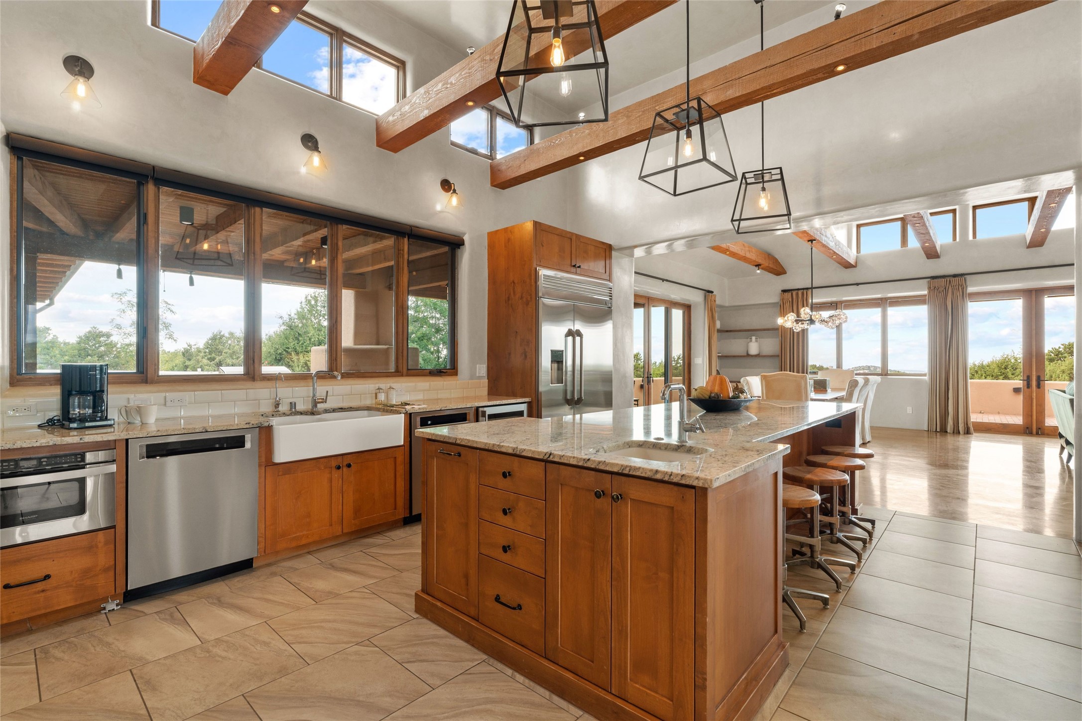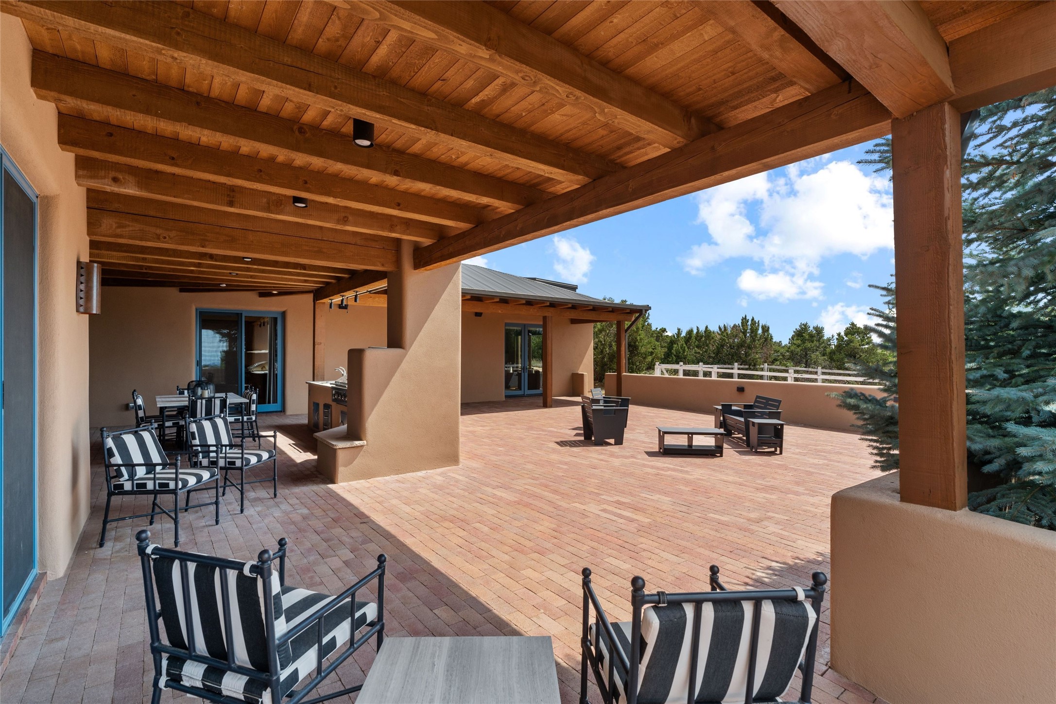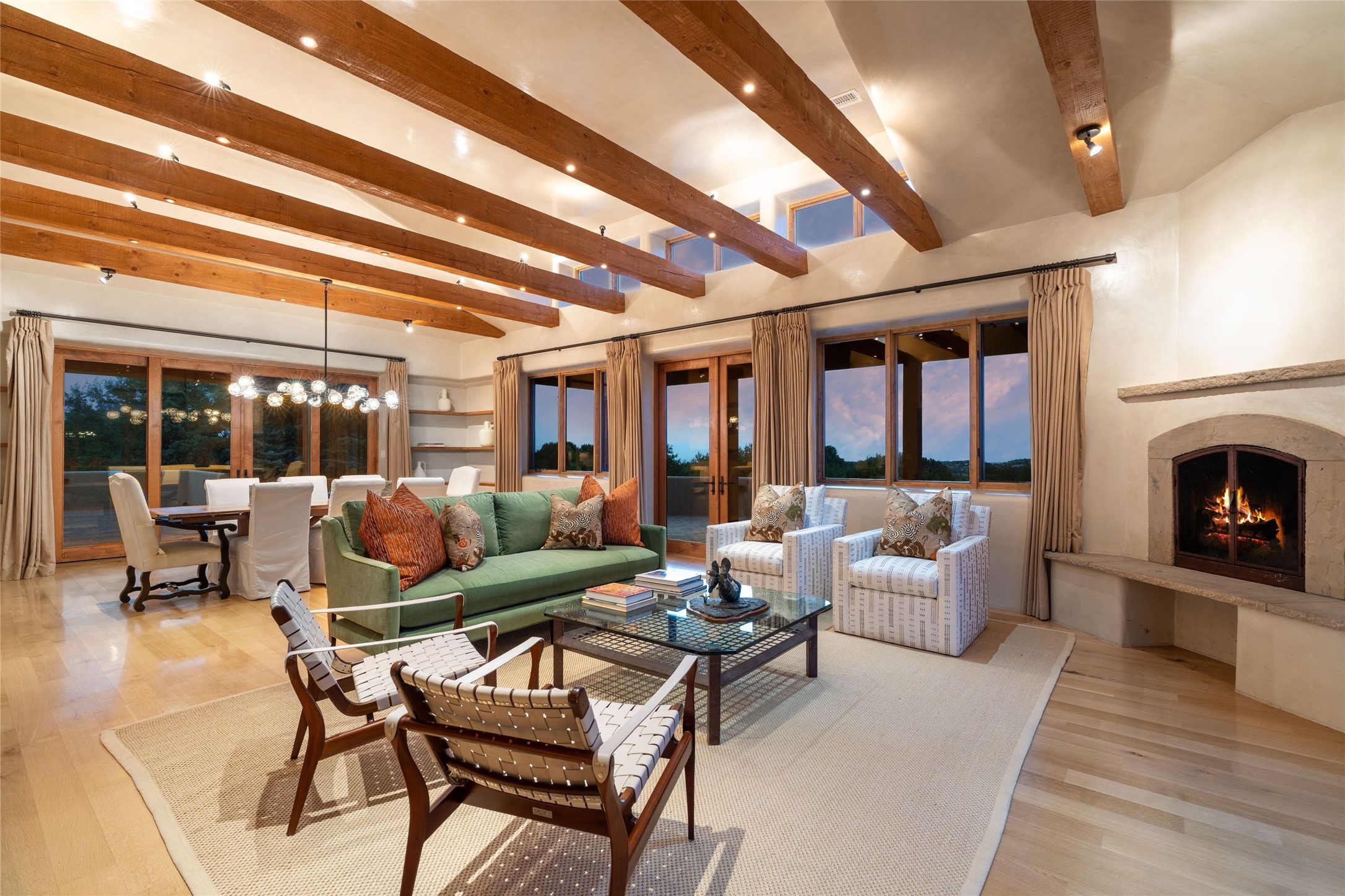 Northern New Mexican style 5-bedroom, 4.5-bath custom-built 5,200 sq. ft. home spanning over 2.5 acres offers panoramic 180-degree views that stretch from the majestic Sangre de Cristo Mountains to the captivating Badlands and Los Alamos.Positioned at the end of a private, gated drive and surrounded by an 8-foot-high coyote fence, this residence is a true entertainer's delight. The open floor plan flows effortlessly into spacious covered and uncovered patios, ideal for hosting both intimate gatherings and grand celebrations. Crafted by Driscoll Construction in 2015, the home showcases bespoke design elements, including custom solid wood doors, white oak flooring, and elegant plaster walls throughout the common areas and primary suite. Enjoy the warmth of three fireplaces, including one on the expansive 1,500 sq. ft. portal, where you can relish both sunrise and sunset vistas.The gourmet kitchen invites culinary creativity with its generous center island, clerestory windows, premium appliances, and double dishwashers. Prioritize wellness with a primary bath steam shower, a 300 sq. ft. gym, an outdoor 6-person sauna, a vegetable garden on drip irrigation, and a fully enclosed chicken coop.Additional highlights include a pitched metal roof, an oversized 3-car garage, photovoltaic solar energy, and rainwater harvesting. Recent upgrades in 2023 encompass new stucco, water filtration, a dog run, and an outdoor grill. Enjoy convenient access to downtown Santa Fe, all while embracing the serene beauty of this exceptional property.