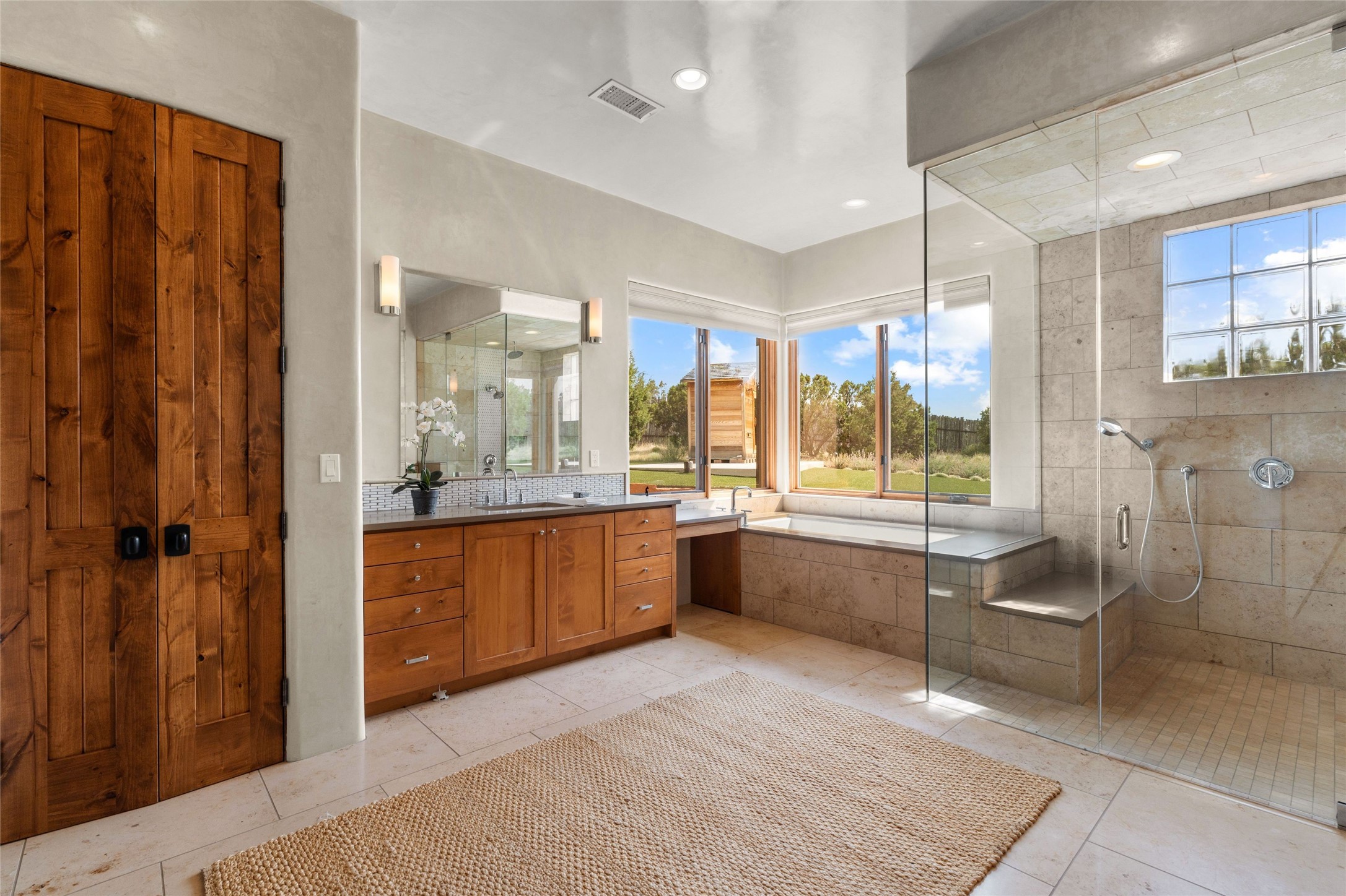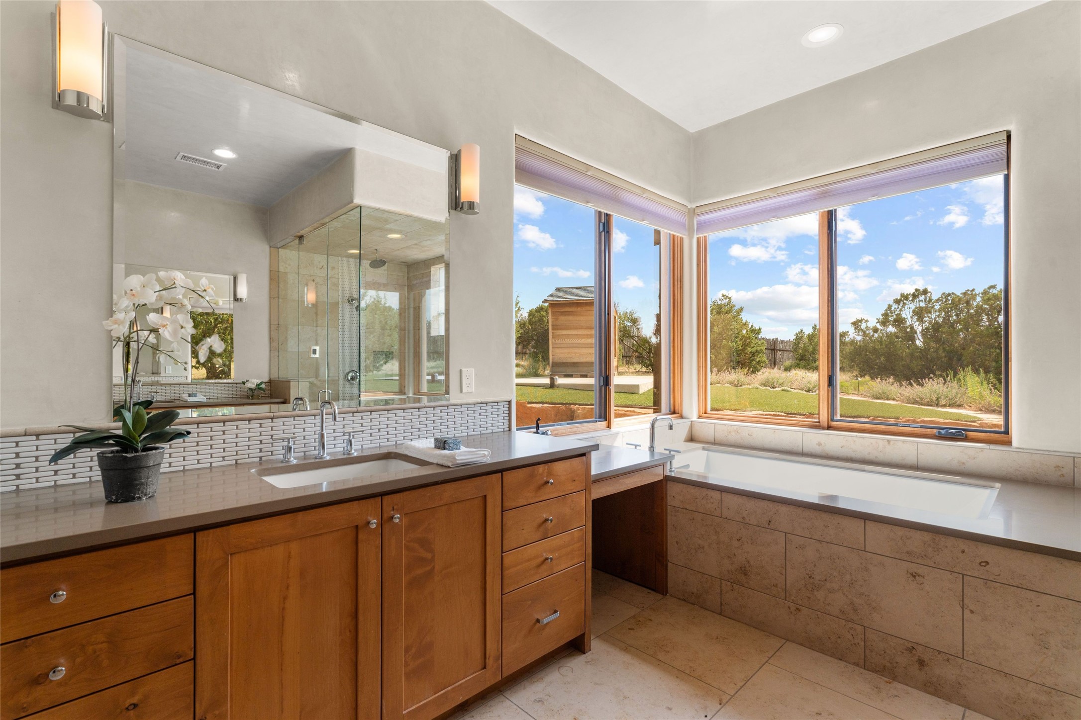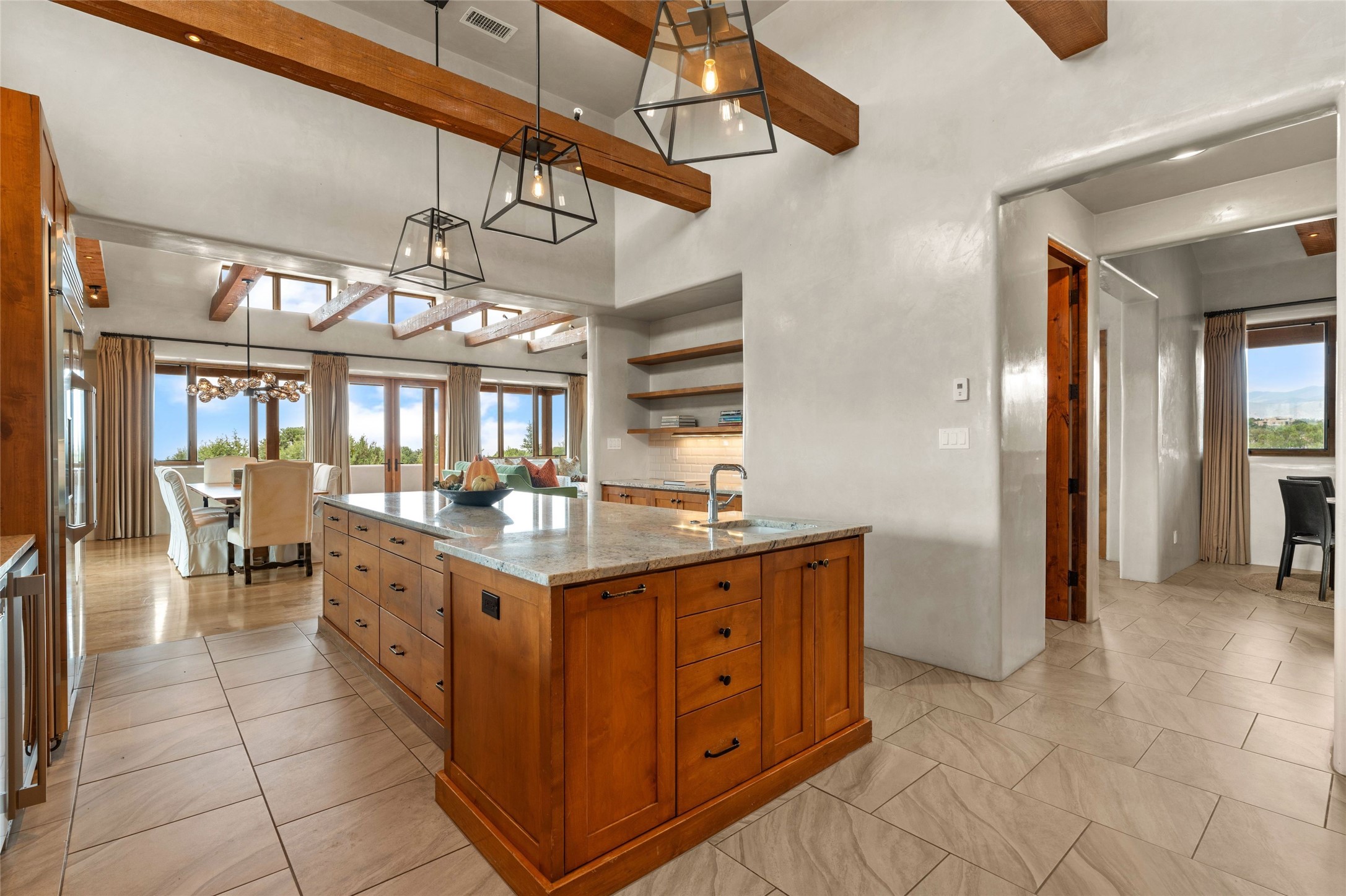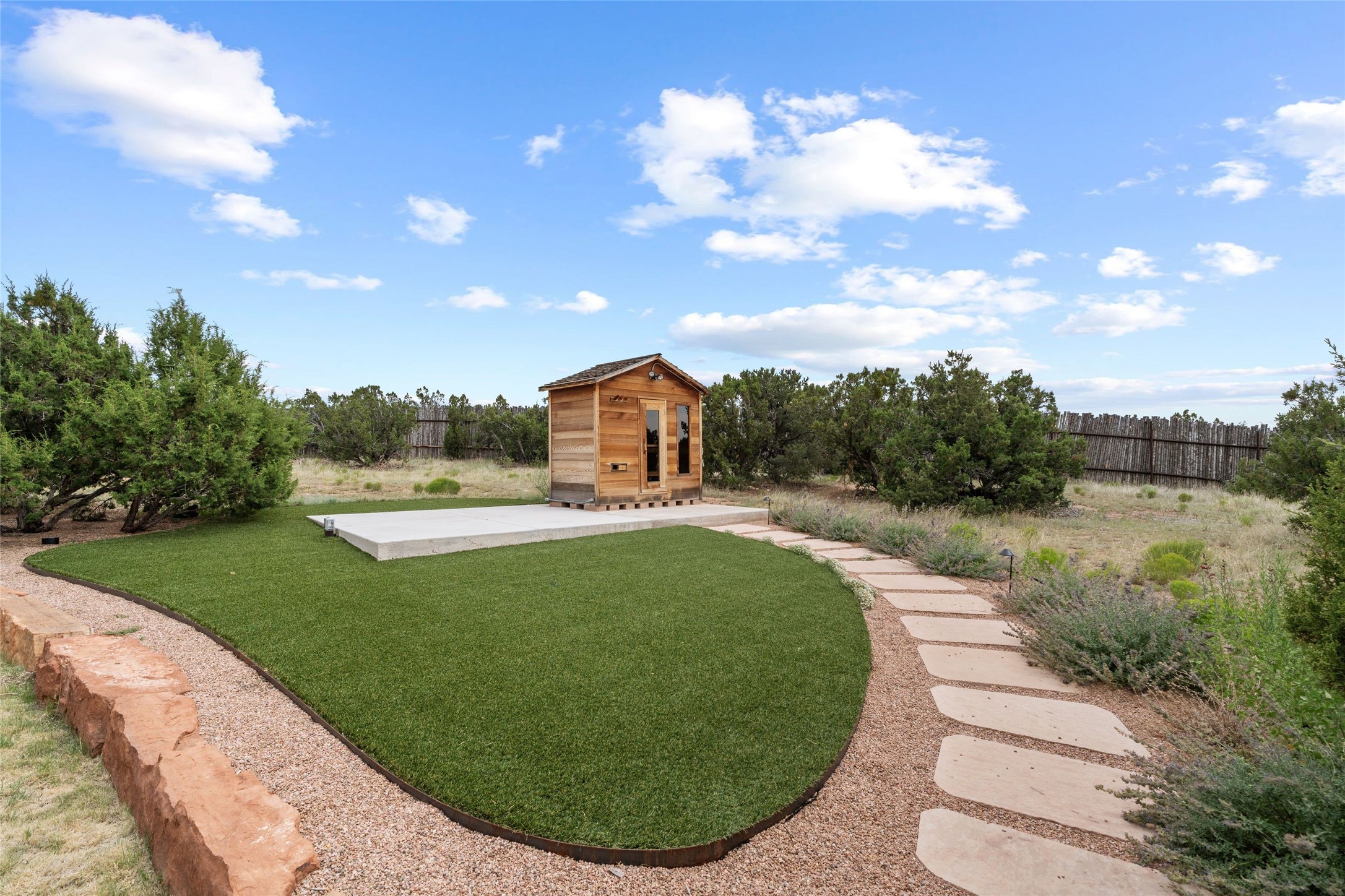 Northern New Mexican style 5-bedroom, 4.5-bath custom-built 5,200 sq. ft. home spanning over 2.5 acres offers panoramic 180-degree views that stretch from the majestic Sangre de Cristo Mountains to the captivating Badlands and Los Alamos.Positioned at the end of a private, gated drive and surrounded by an 8-foot-high coyote fence, this residence is a true entertainer's delight. The open floor plan flows effortlessly into spacious covered and uncovered patios, ideal for hosting both intimate gatherings and grand celebrations. Crafted by Driscoll Construction in 2015, the home showcases bespoke design elements, including custom solid wood doors, white oak flooring, and elegant plaster walls throughout the common areas and primary suite. Enjoy the warmth of three fireplaces, including one on the expansive 1,500 sq. ft. portal, where you can relish both sunrise and sunset vistas.The gourmet kitchen invites culinary creativity with its generous center island, clerestory windows, premium appliances, and double dishwashers. Prioritize wellness with a primary bath steam shower, a 300 sq. ft. gym, an outdoor 6-person sauna, a vegetable garden on drip irrigation, and a fully enclosed chicken coop.Additional highlights include a pitched metal roof, an oversized 3-car garage, photovoltaic solar energy, and rainwater harvesting. Recent upgrades in 2023 encompass new stucco, water filtration, a dog run, and an outdoor grill. Enjoy convenient access to downtown Santa Fe, all while embracing the serene beauty of this exceptional property.