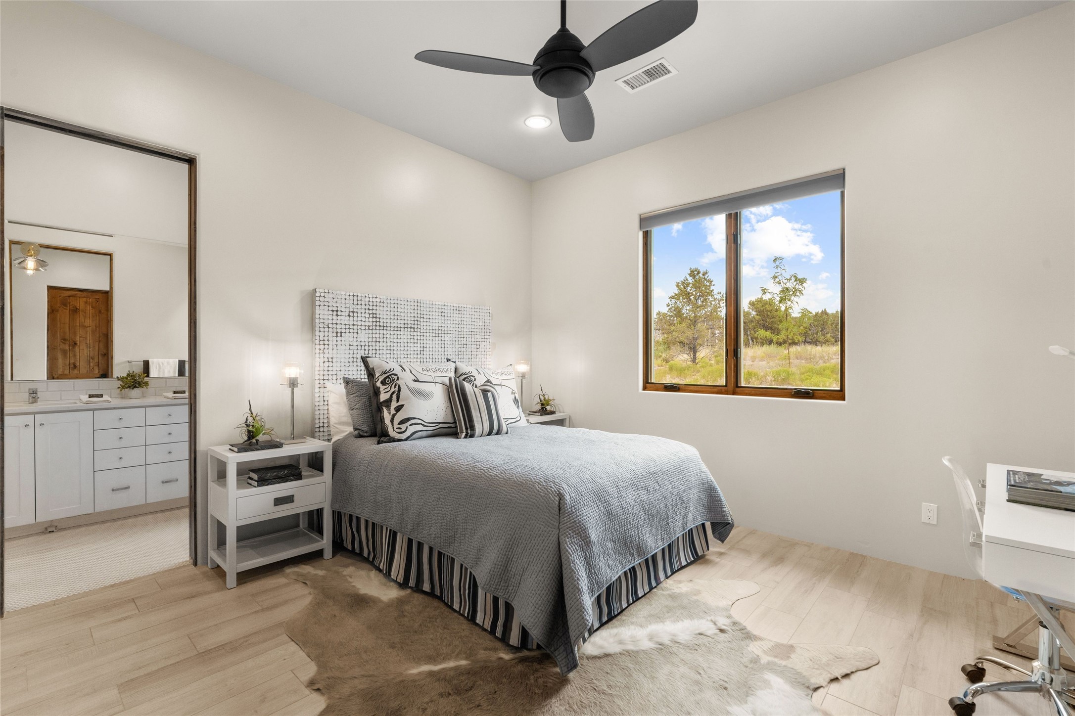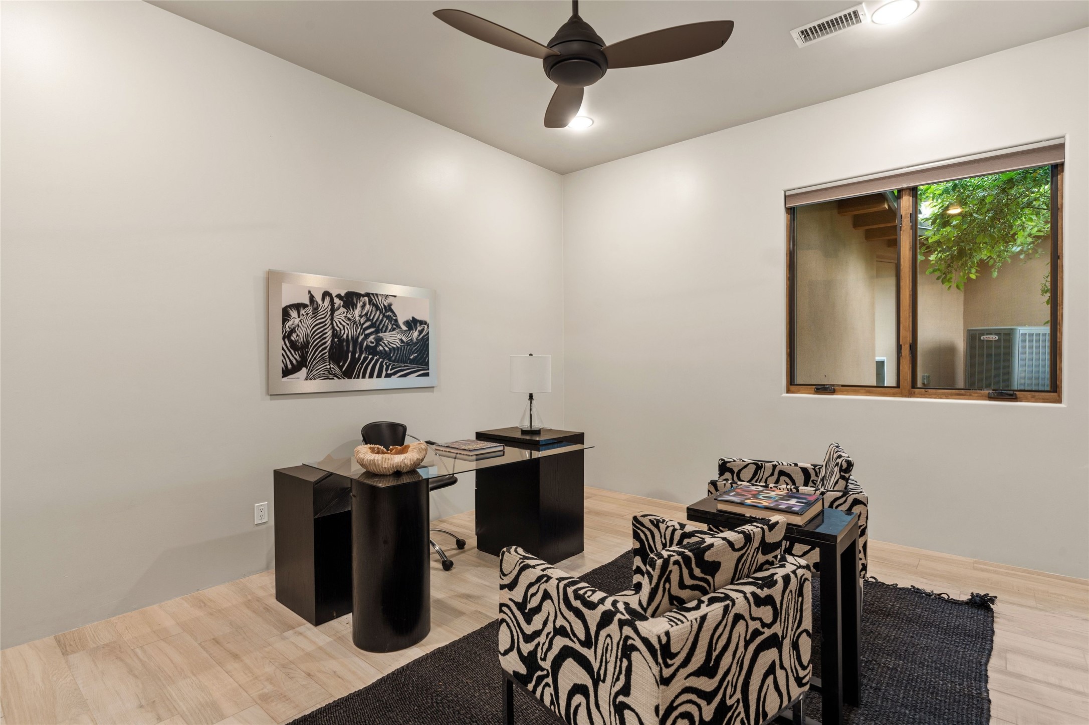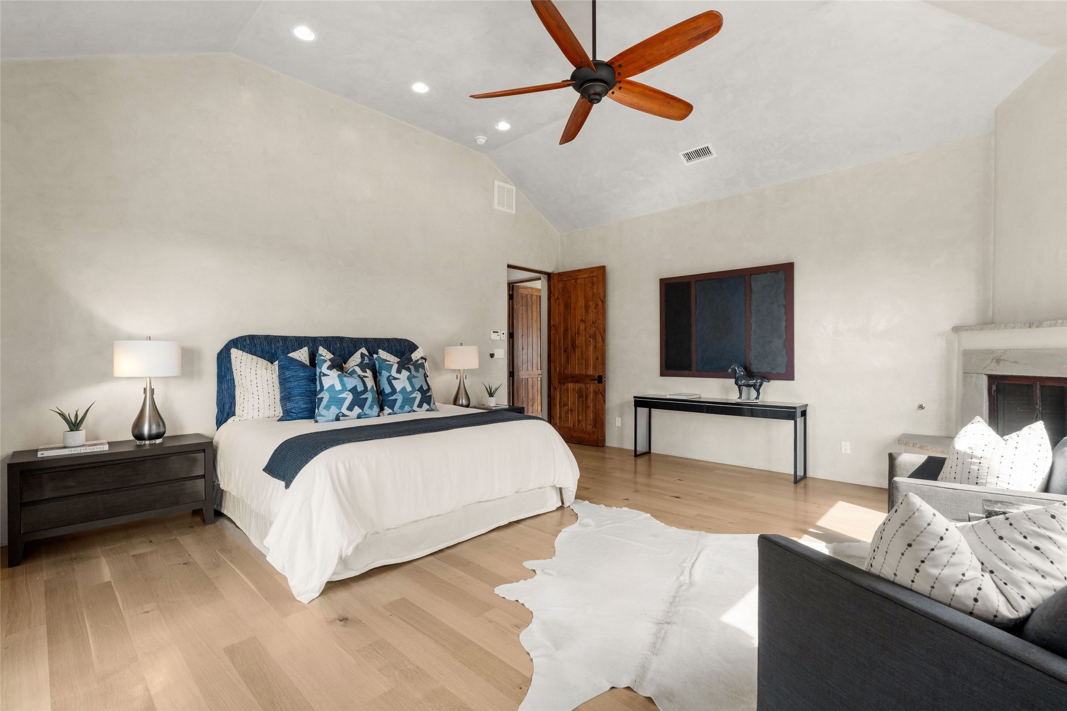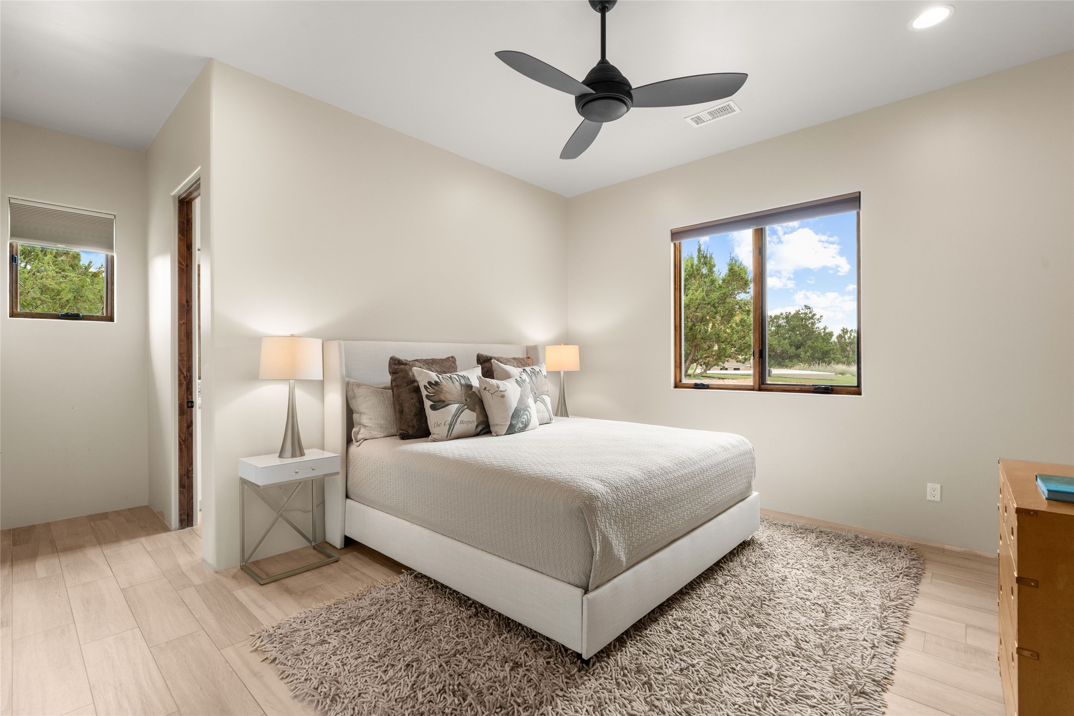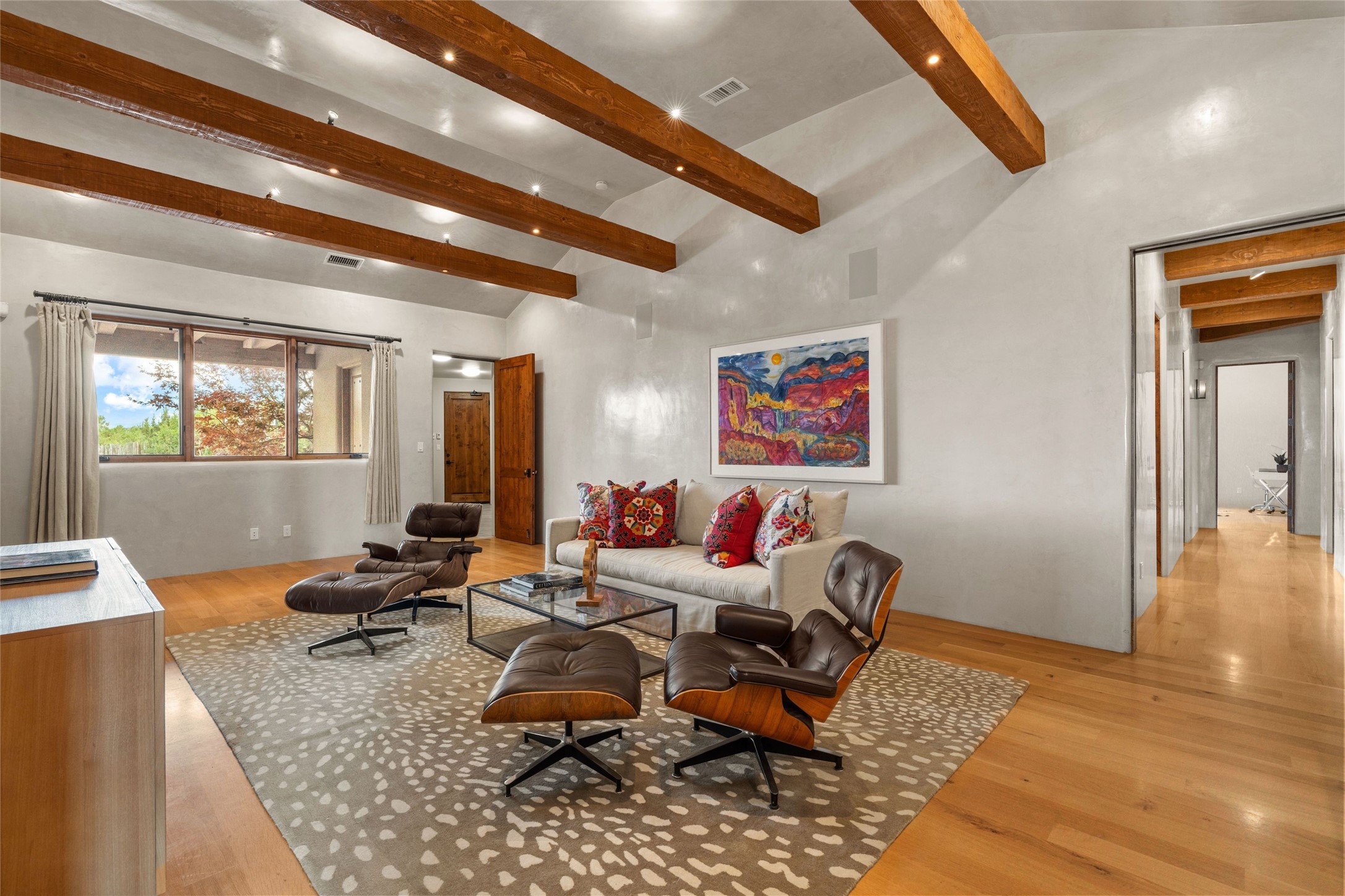 Northern New Mexican style 5-bedroom, 4.5-bath custom-built 5,200 sq. ft. home spanning over 2.5 acres offers panoramic 180-degree views that stretch from the majestic Sangre de Cristo Mountains to the captivating Badlands and Los Alamos.Positioned at the end of a private, gated drive and surrounded by an 8-foot-high coyote fence, this residence is a true entertainer's delight. The open floor plan flows effortlessly into spacious covered and uncovered patios, ideal for hosting both intimate gatherings and grand celebrations. Crafted by Driscoll Construction in 2015, the home showcases bespoke design elements, including custom solid wood doors, white oak flooring, and elegant plaster walls throughout the common areas and primary suite. Enjoy the warmth of three fireplaces, including one on the expansive 1,500 sq. ft. portal, where you can relish both sunrise and sunset vistas.The gourmet kitchen invites culinary creativity with its generous center island, clerestory windows, premium appliances, and double dishwashers. Prioritize wellness with a primary bath steam shower, a 300 sq. ft. gym, an outdoor 6-person sauna, a vegetable garden on drip irrigation, and a fully enclosed chicken coop.Additional highlights include a pitched metal roof, an oversized 3-car garage, photovoltaic solar energy, and rainwater harvesting. Recent upgrades in 2023 encompass new stucco, water filtration, a dog run, and an outdoor grill. Enjoy convenient access to downtown Santa Fe, all while embracing the serene beauty of this exceptional property.