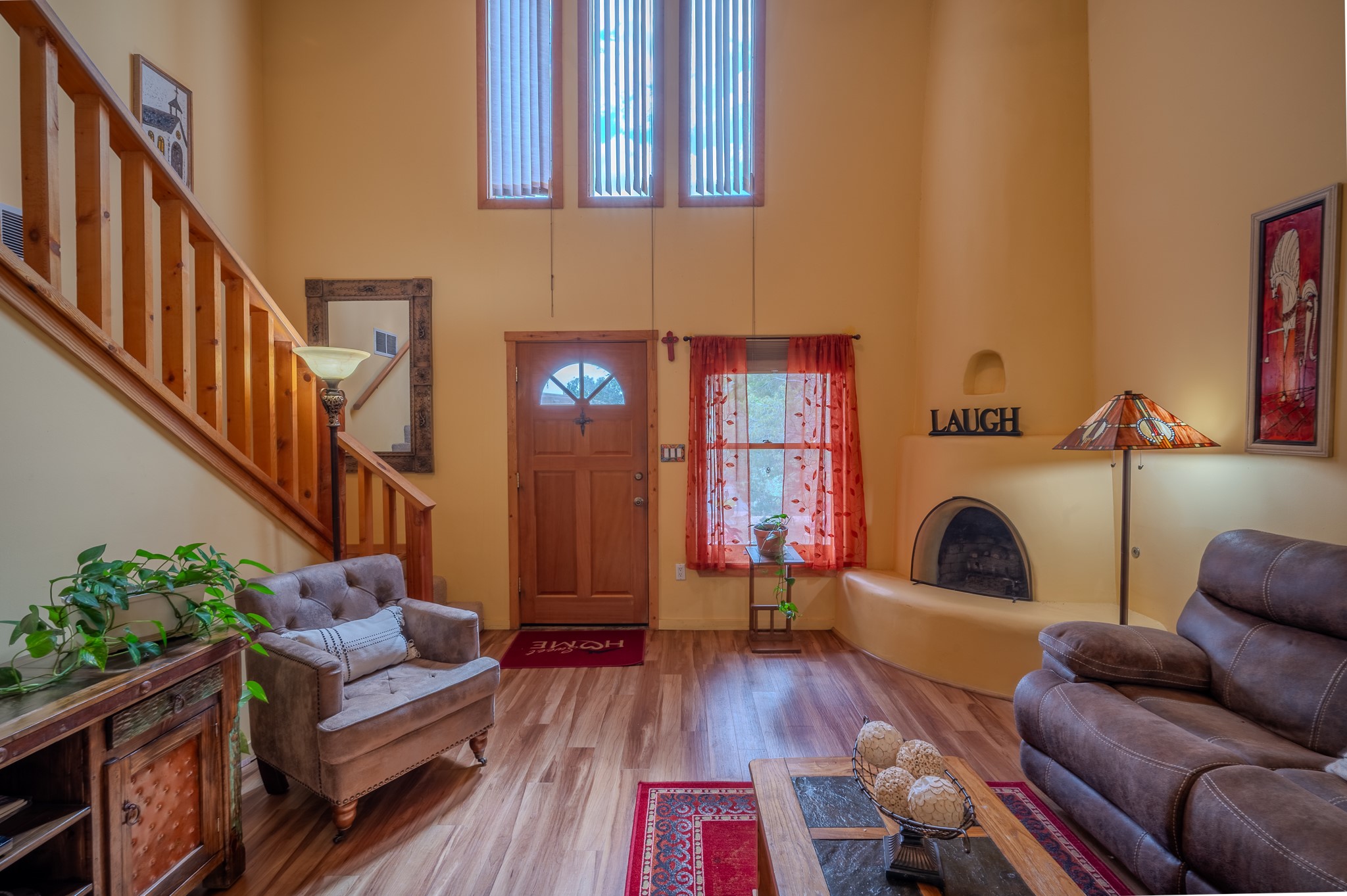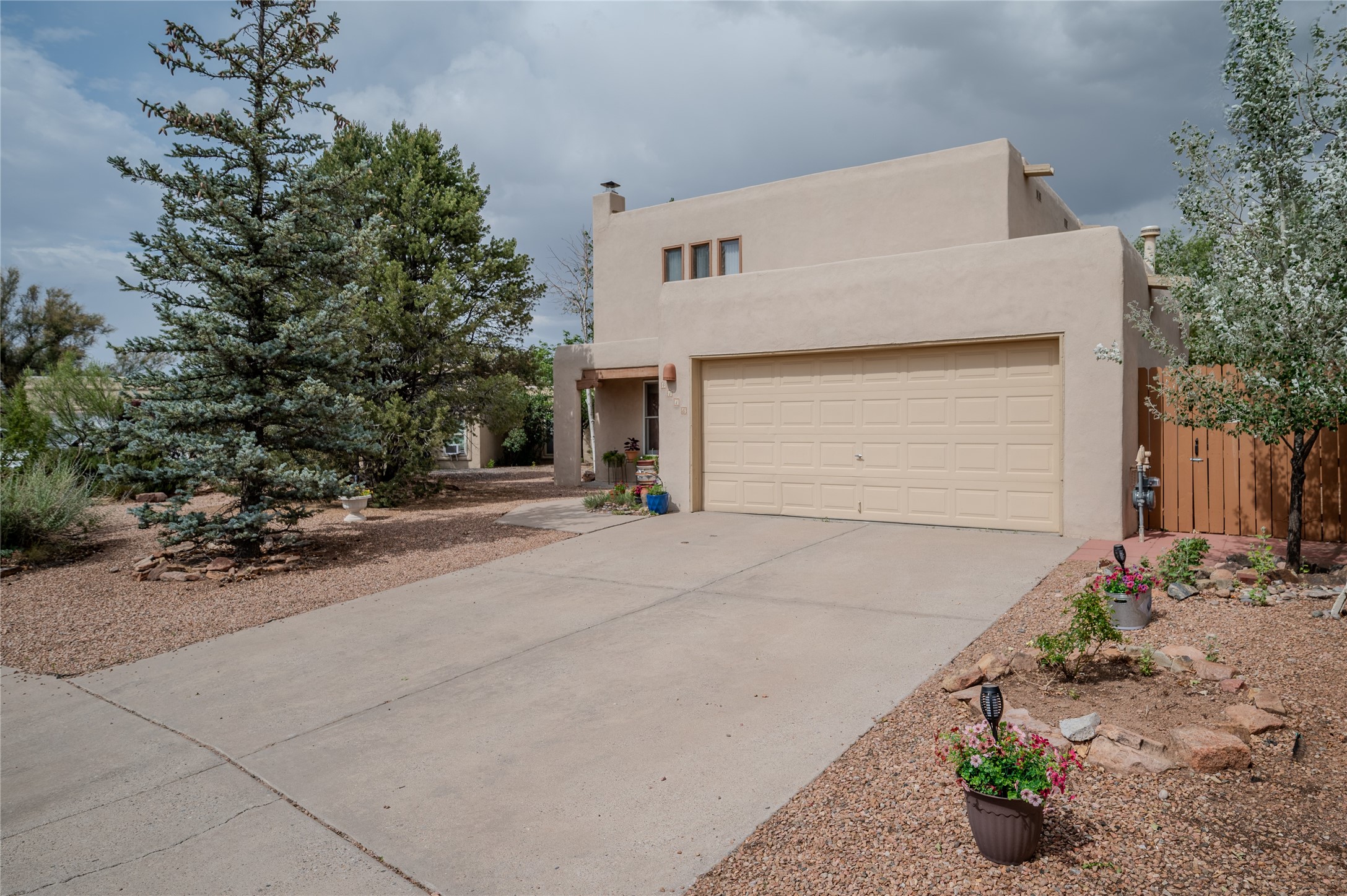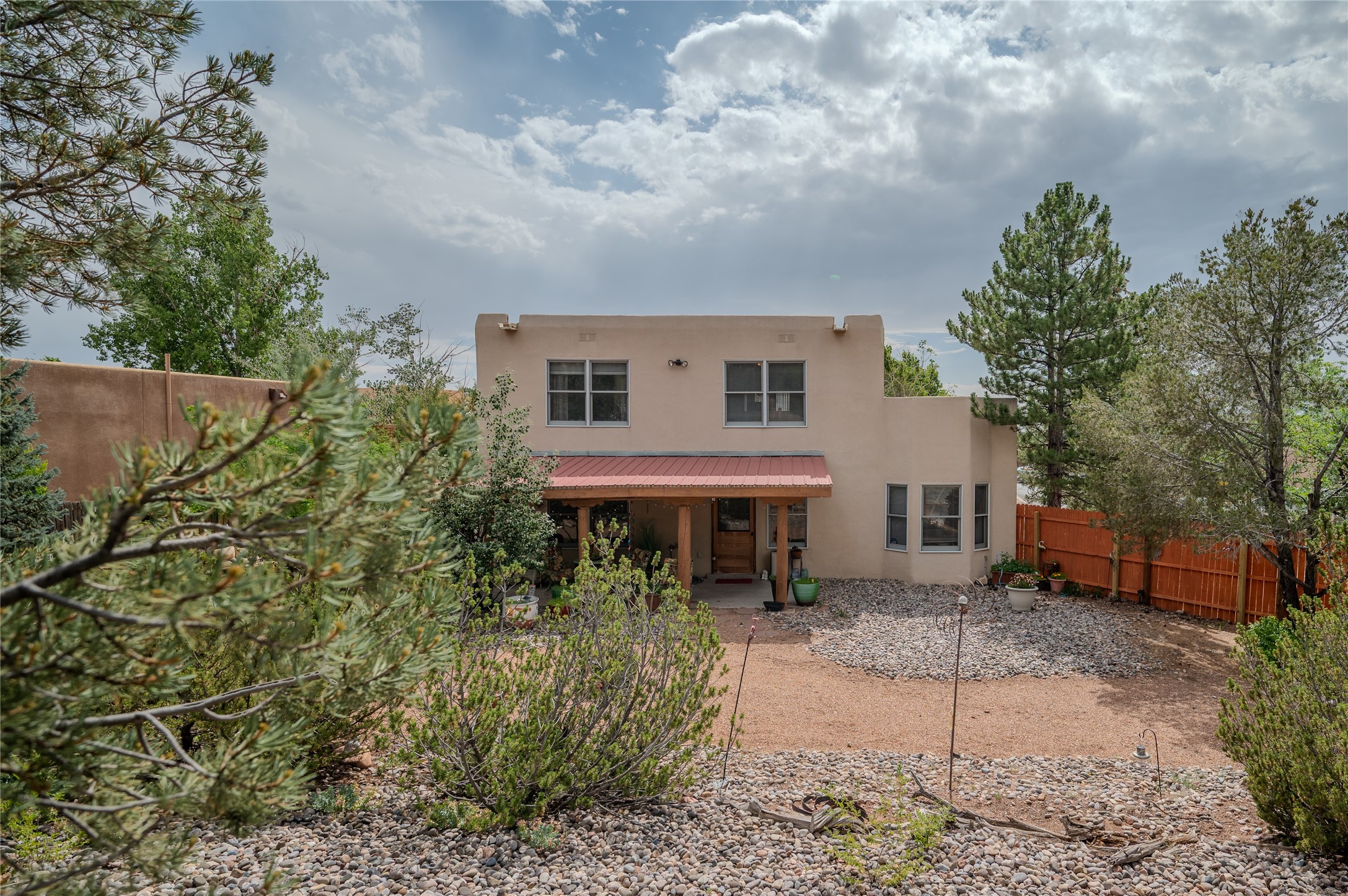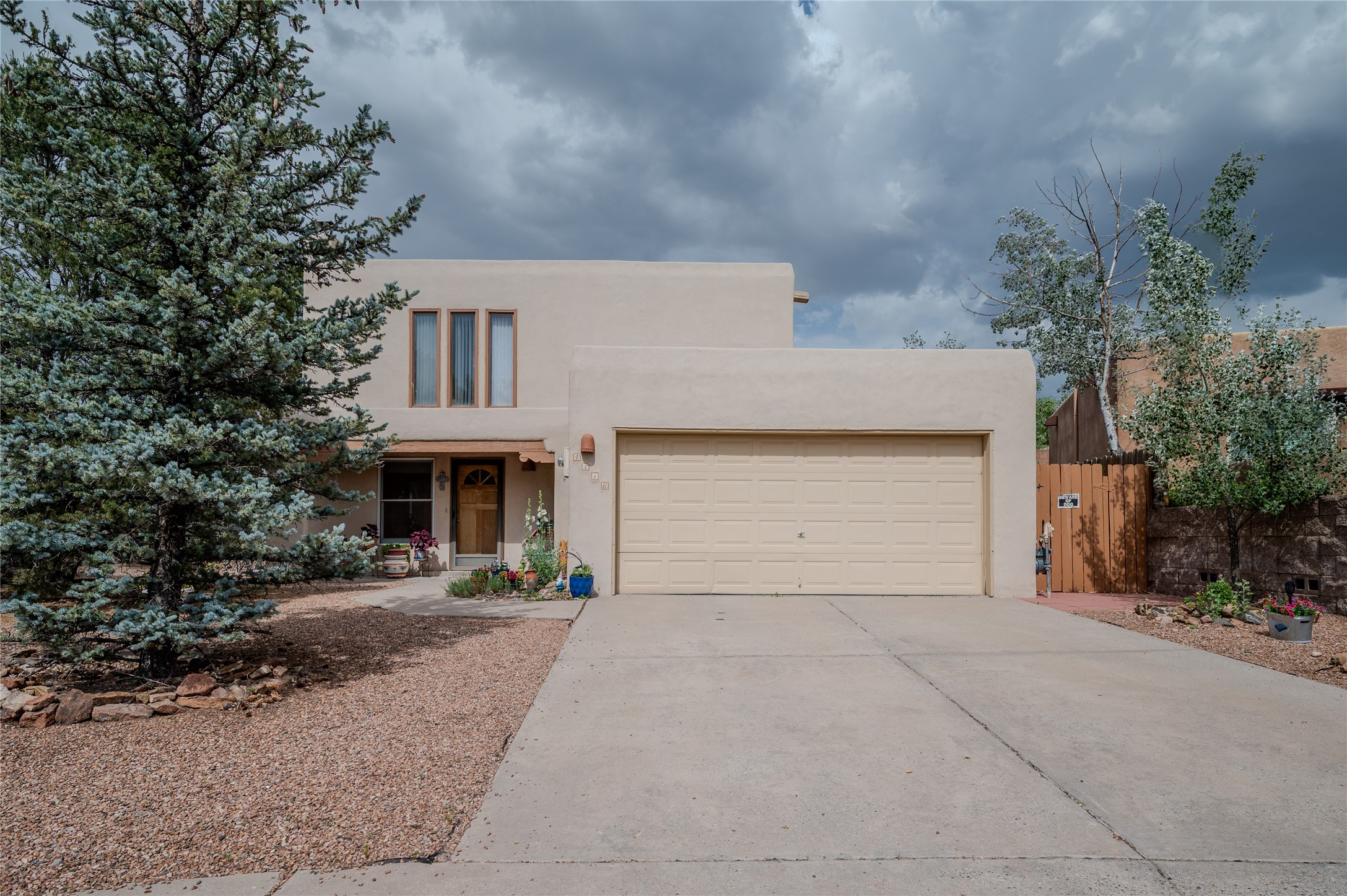 Live 8 years longer. Eat nuts, laugh out loud every day, and live in a house with stairs. A bedroom and bath on the ground floor and a master suite on the second floor including an office with a deck. The office could be converted to a bedroom if needed. Semi open floor plan, high ceilings and great outdoor spaces. Yardage, yes. This yard is big enough for your pets, your play, and your garden. Currently xeri-scaped there is all kinds of room for your plantings. Located in a desirable gated neighborhood with parks and trails, the location is an easy commute to Los Alamos, Albuquerque and just minutes to downtown Santa Fe. Call soon. This is a great value.