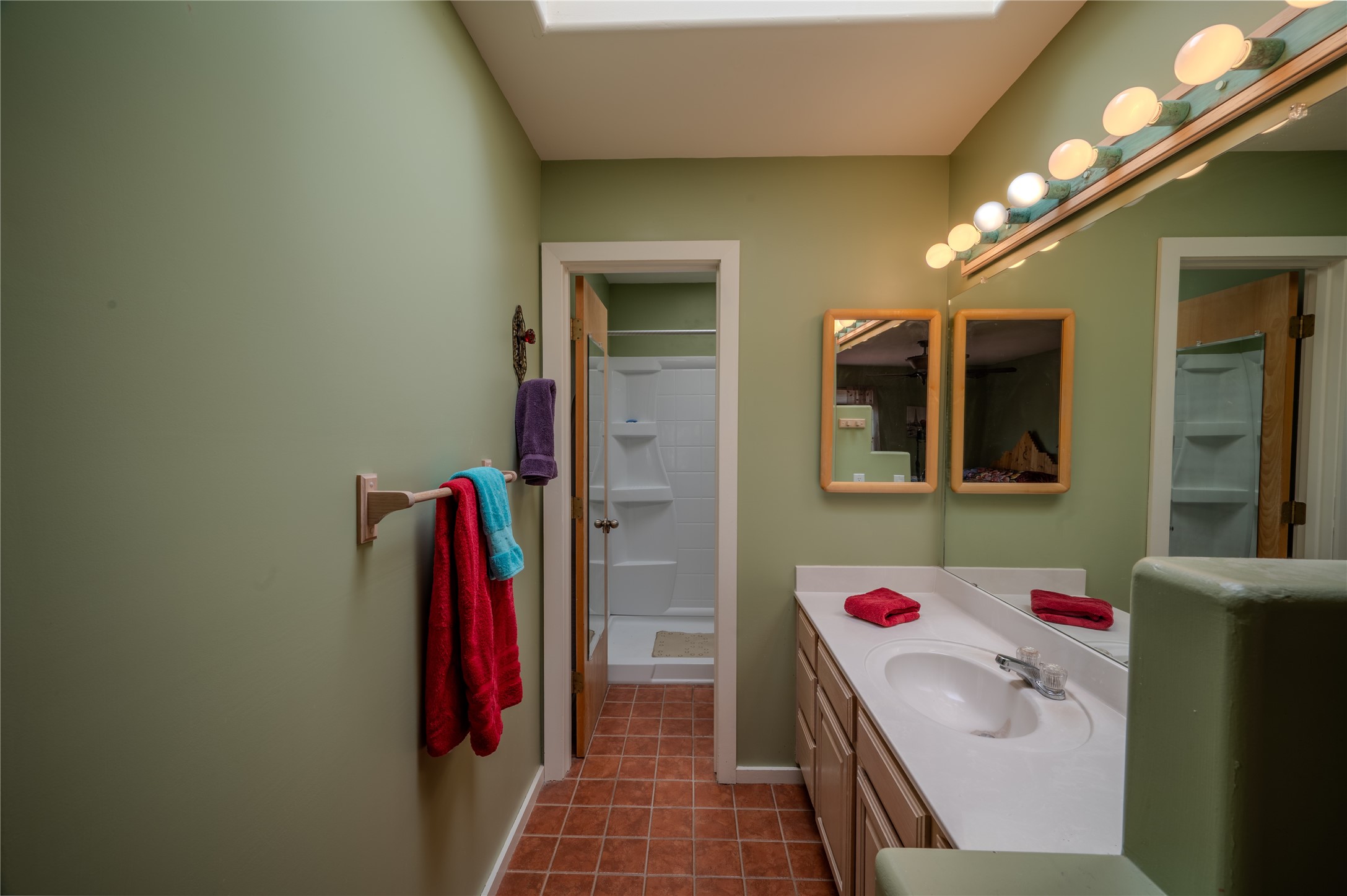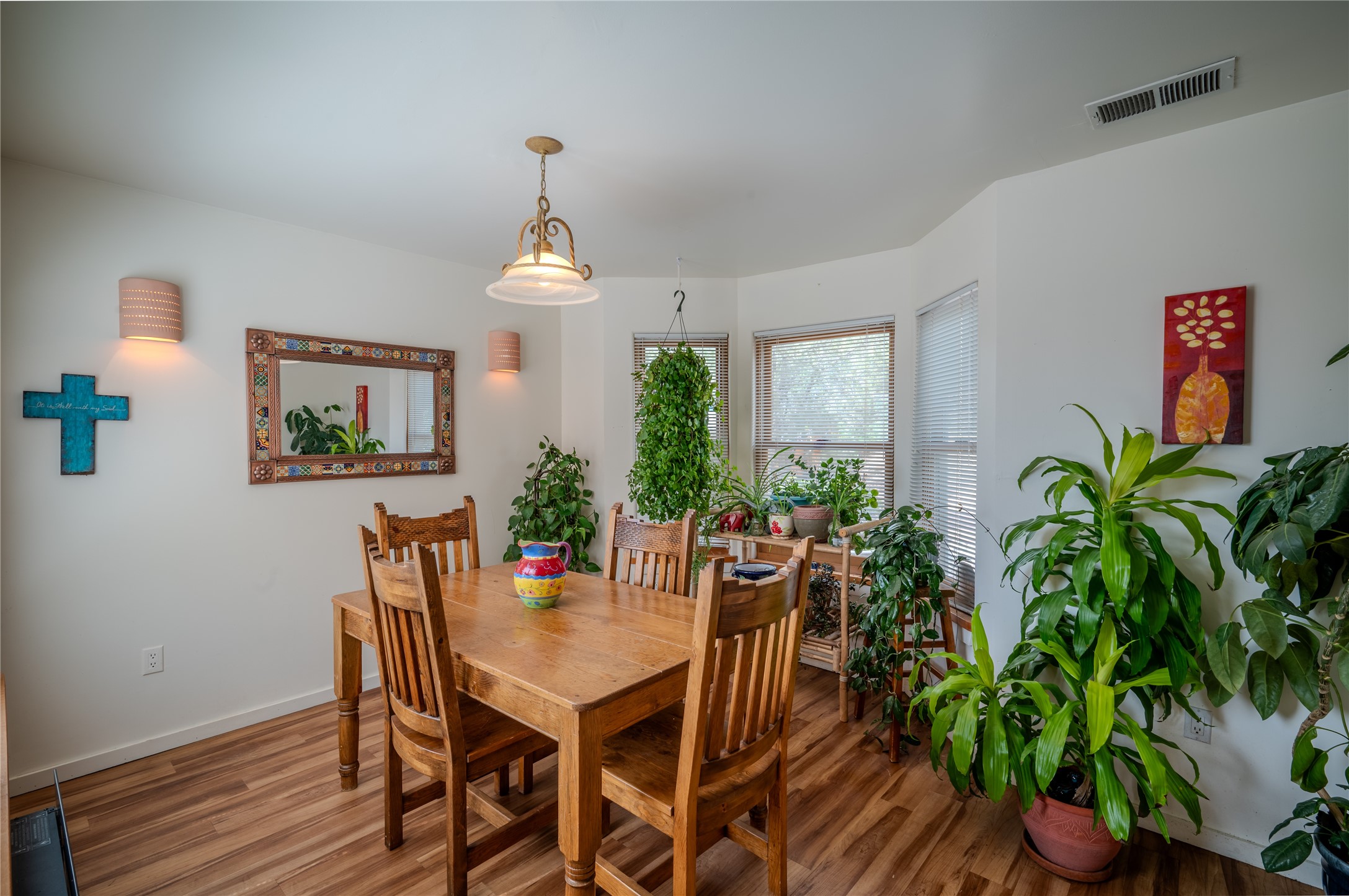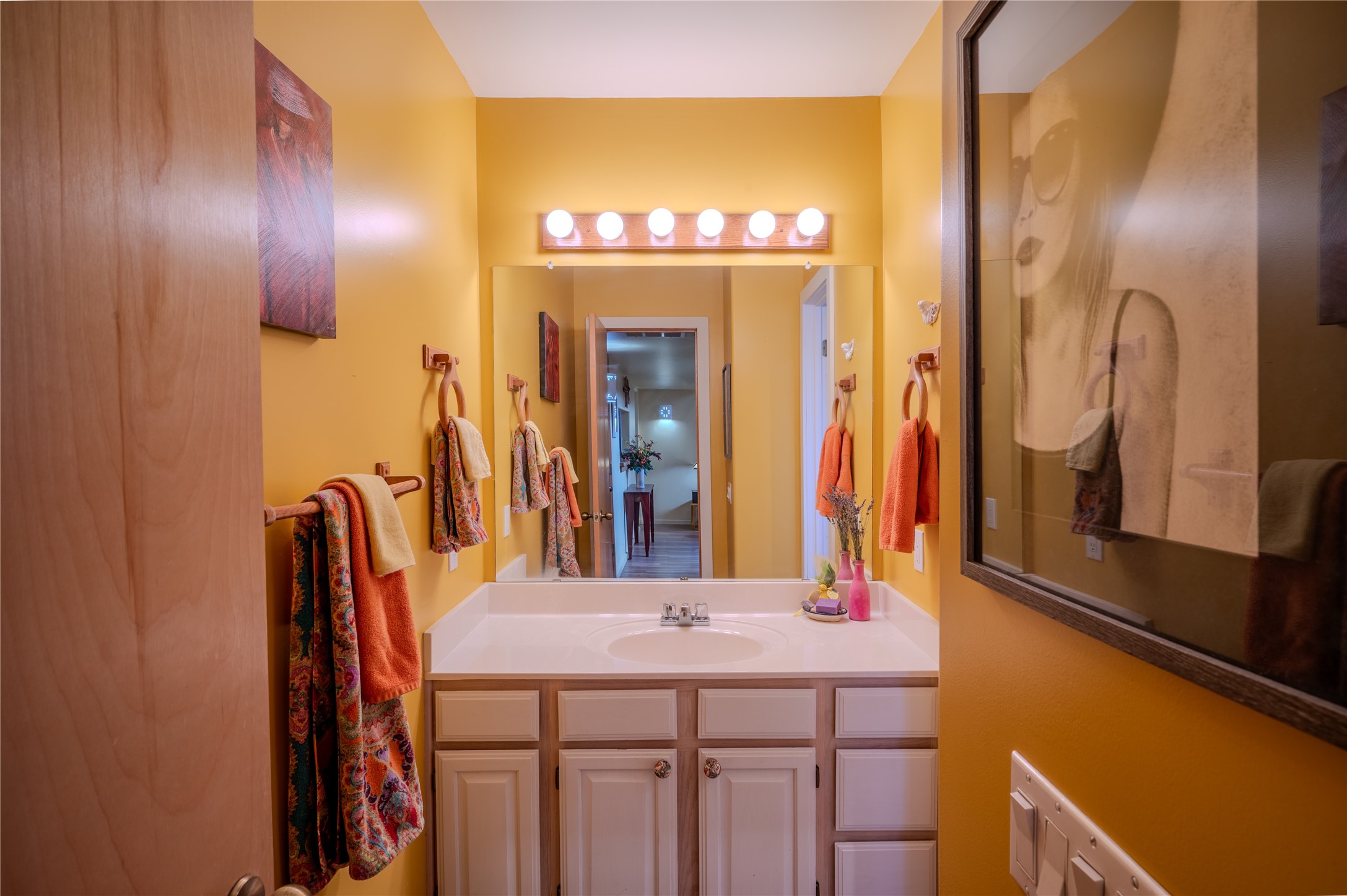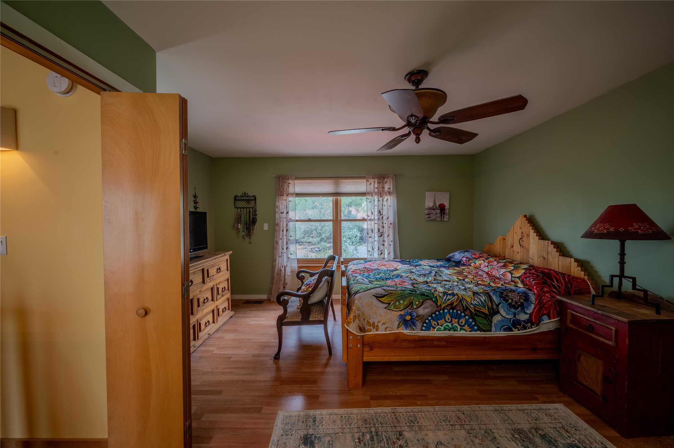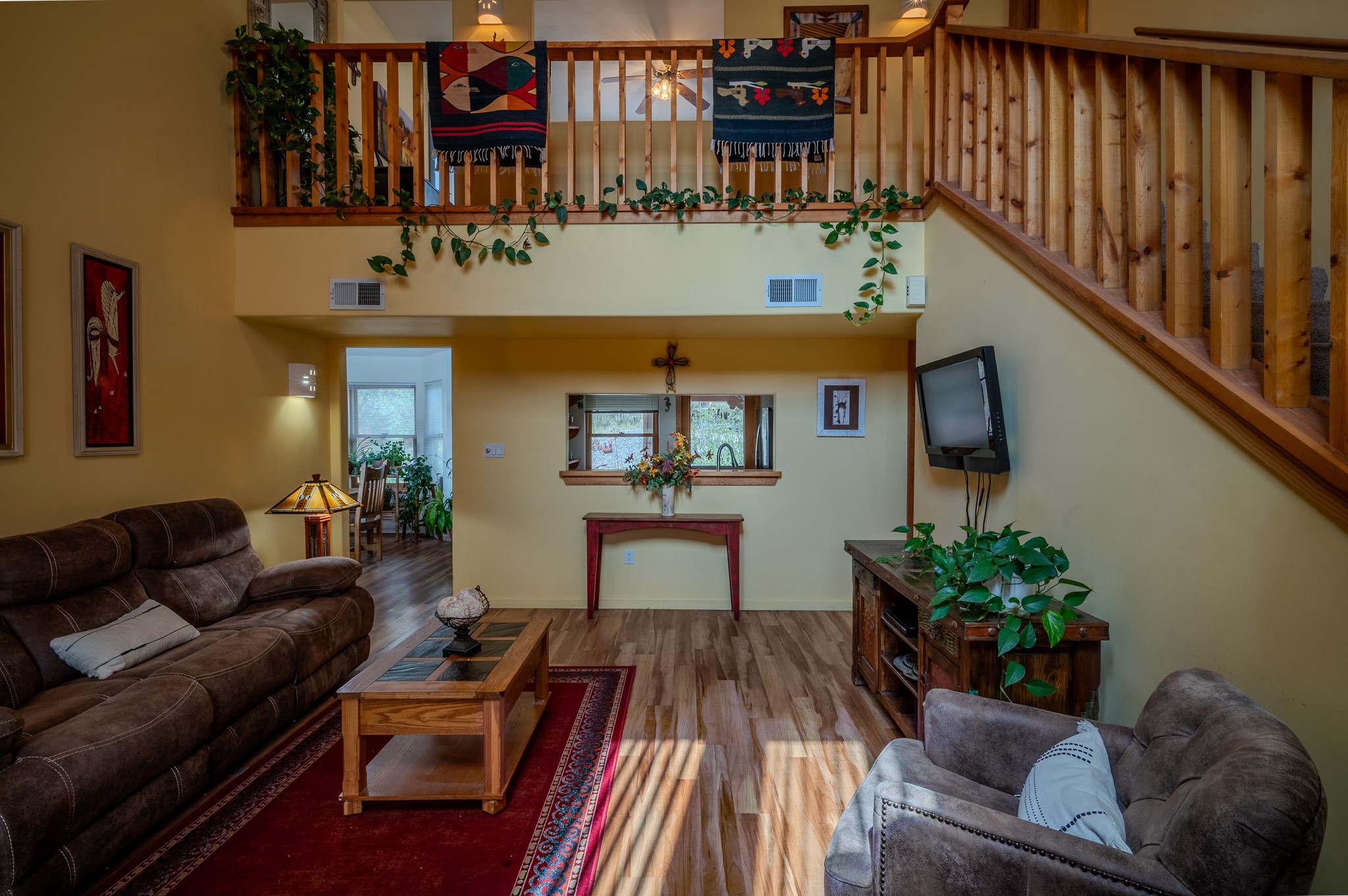 Live 8 years longer. Eat nuts, laugh out loud every day, and live in a house with stairs. A bedroom and bath on the ground floor and a master suite on the second floor including an office with a deck. The office could be converted to a bedroom if needed. Semi open floor plan, high ceilings and great outdoor spaces. Yardage, yes. This yard is big enough for your pets, your play, and your garden. Currently xeri-scaped there is all kinds of room for your plantings. Located in a desirable gated neighborhood with parks and trails, the location is an easy commute to Los Alamos, Albuquerque and just minutes to downtown Santa Fe. Call soon. This is a great value.