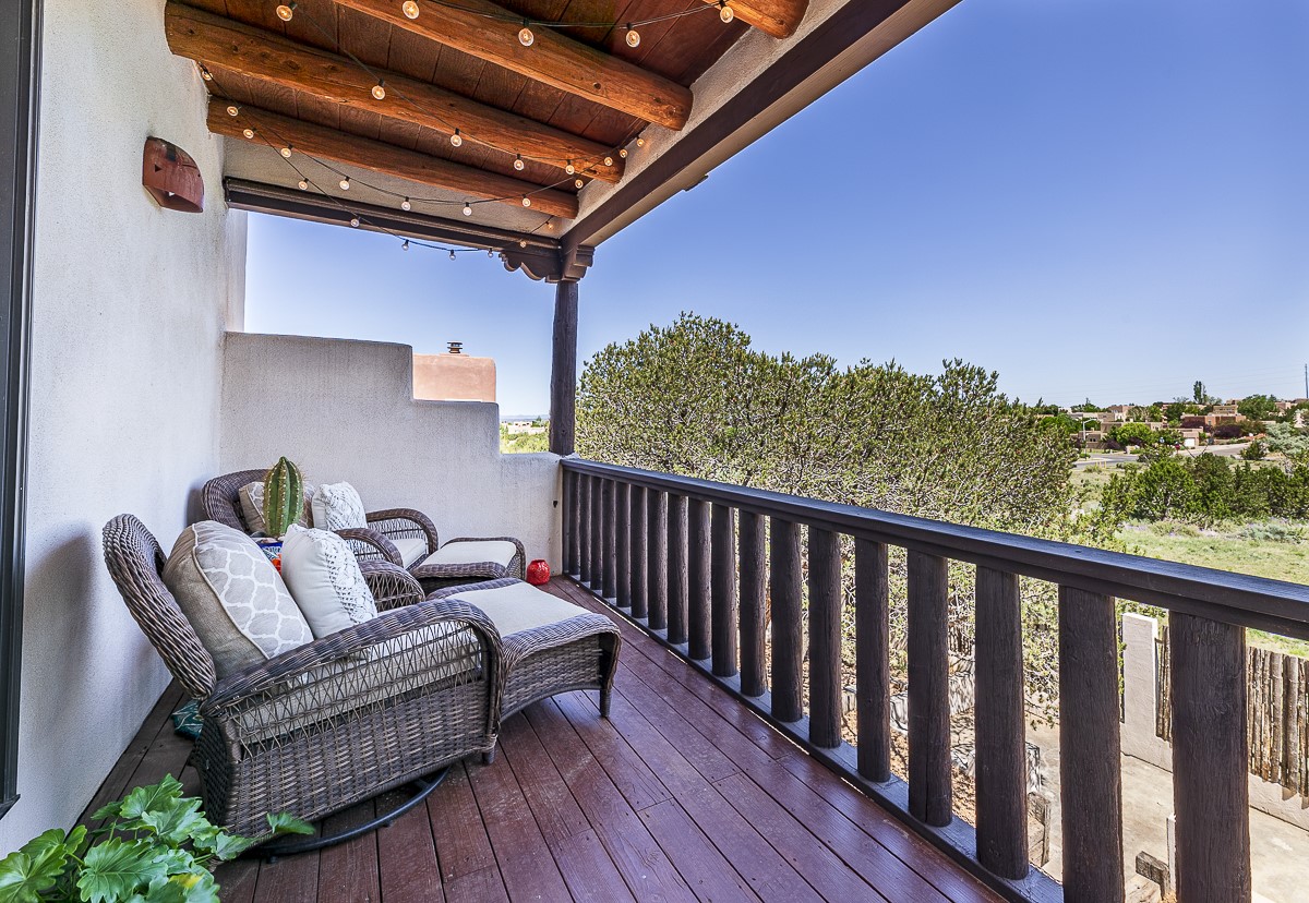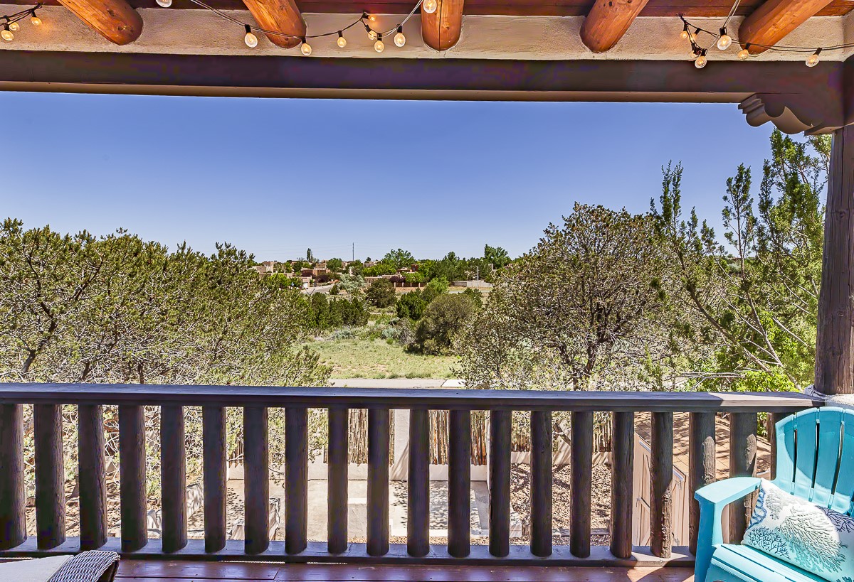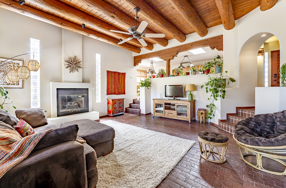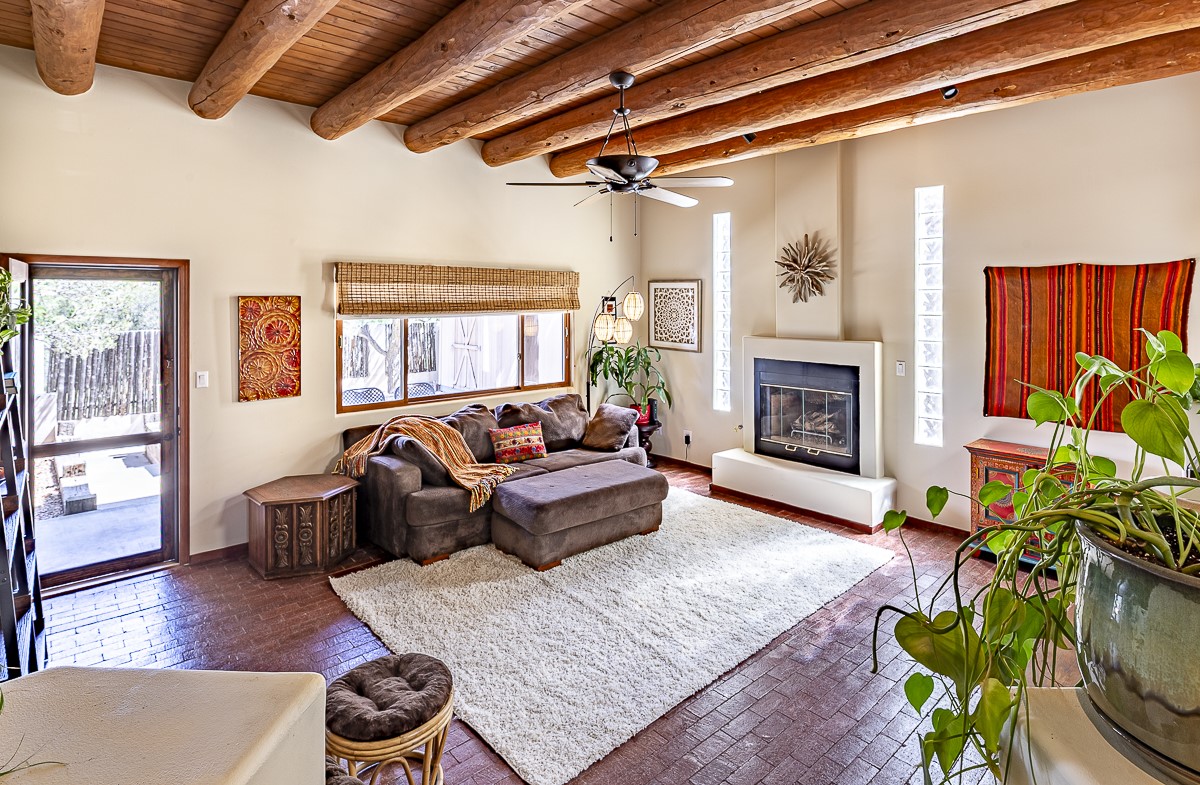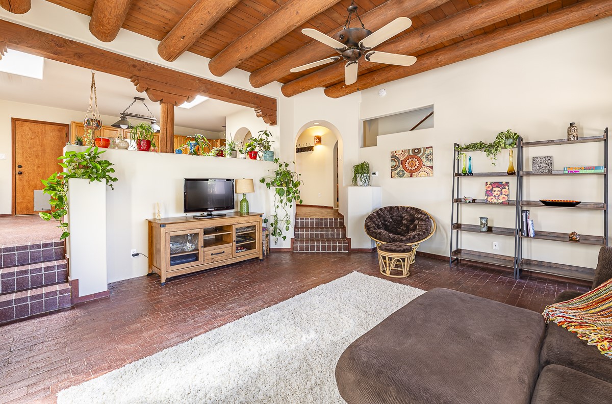 When you are looking for that perfect house and it finally arrives! This home invites you to sit on the cool and comfortable upper balcony overlooking a greenspace with views of both the Jemez and Sangre de Cristo Mountains. Pueblo style character and earthy finishes such as brick floors, fireplace and vigas welcome you to this classic Santa Fe home featuring two main level bedrooms with full bath and a spacious primary bedroom suite on the upper level. The sunken living room is incredibly cozy and inviting and it walks out to a walled back yard with a covered portal for outdoor dining. In a beloved neighborhood with 2-car garage and easy access to all things Santa Fe, this may just be the one!