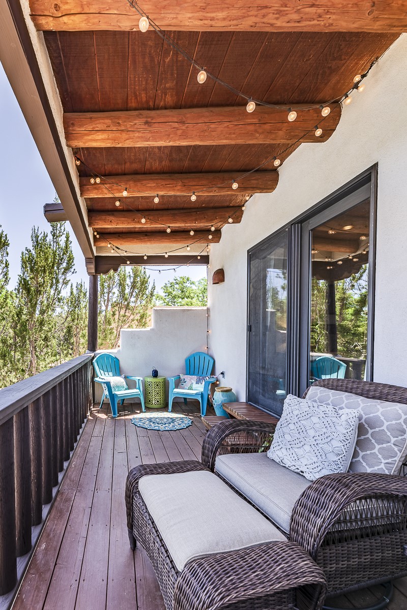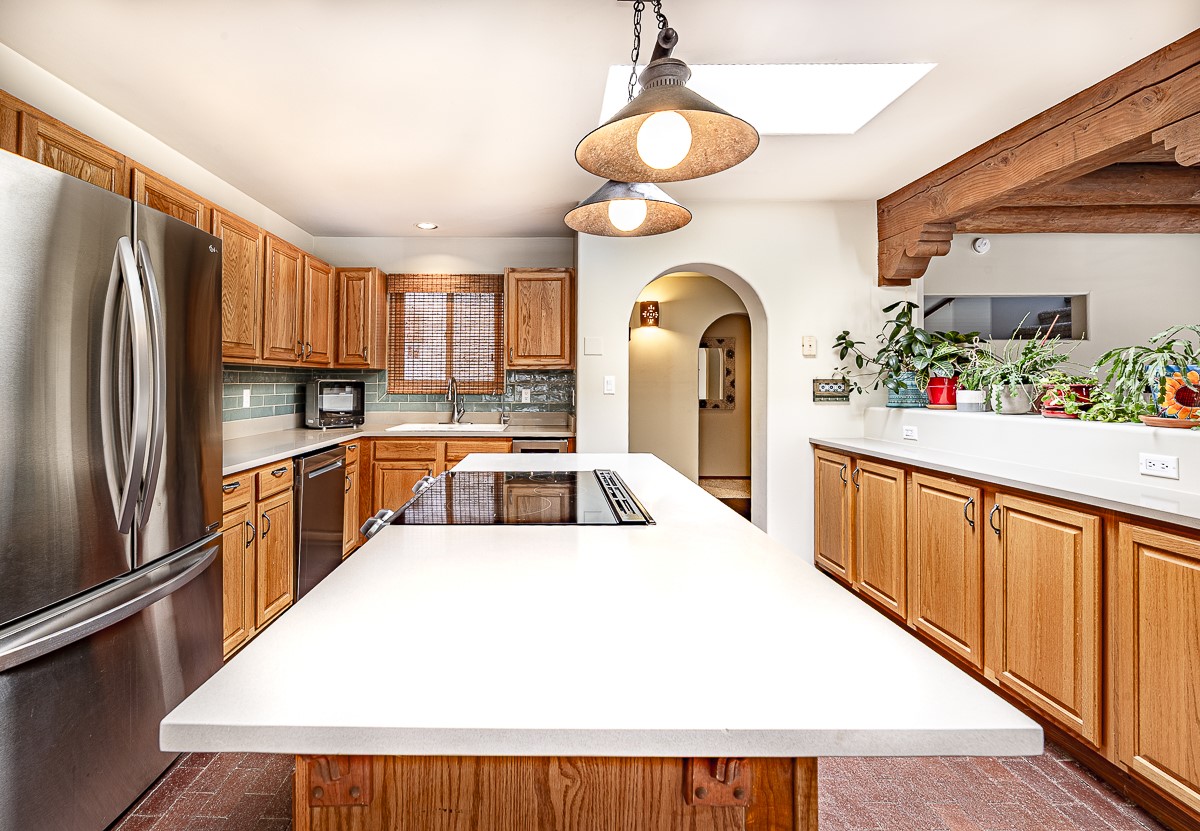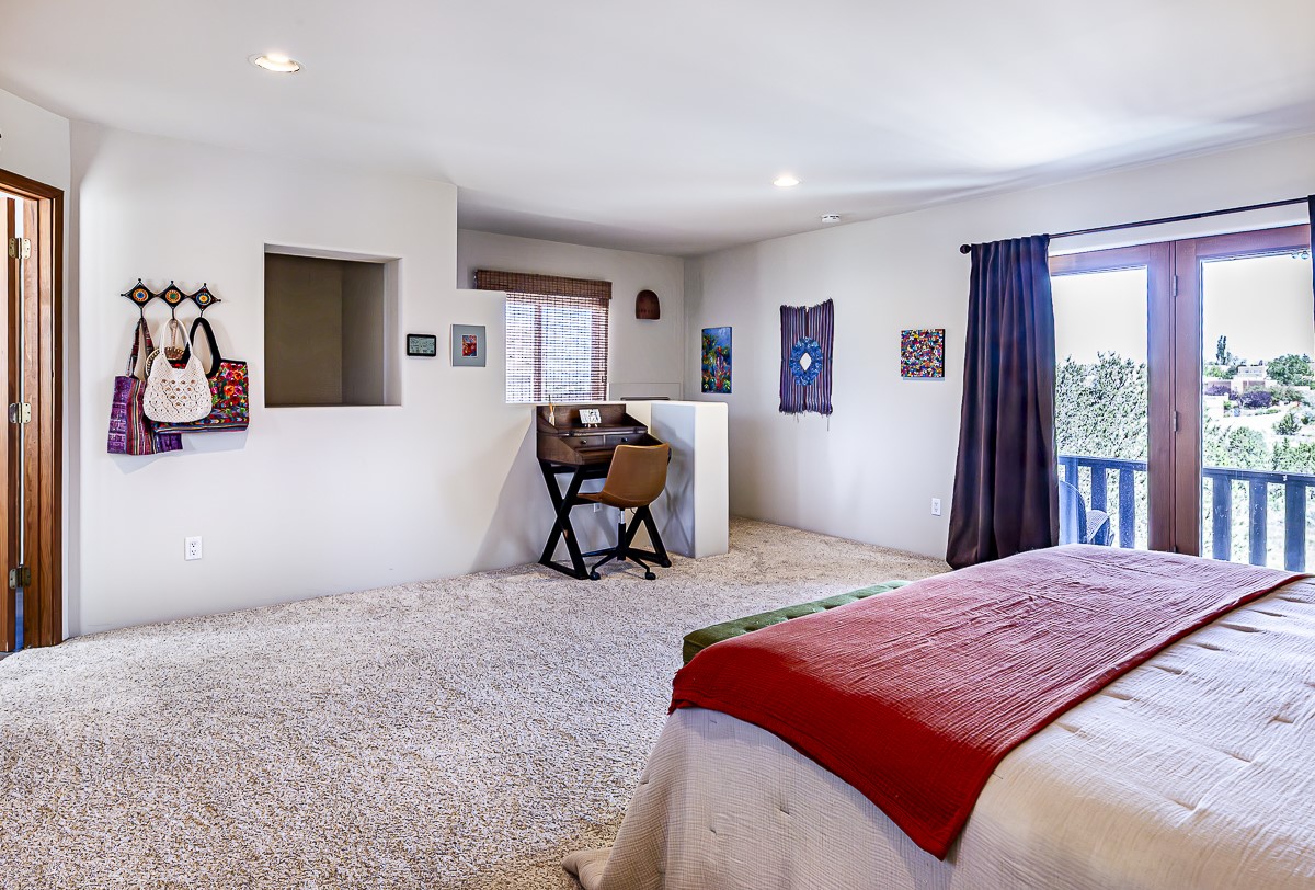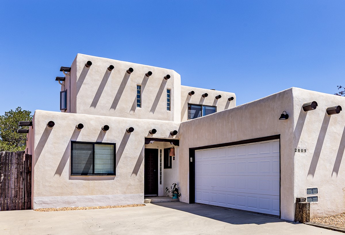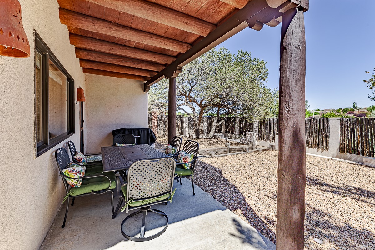 When you are looking for that perfect house and it finally arrives! This home invites you to sit on the cool and comfortable upper balcony overlooking a greenspace with views of both the Jemez and Sangre de Cristo Mountains. Pueblo style character and earthy finishes such as brick floors, fireplace and vigas welcome you to this classic Santa Fe home featuring two main level bedrooms with full bath and a spacious primary bedroom suite on the upper level. The sunken living room is incredibly cozy and inviting and it walks out to a walled back yard with a covered portal for outdoor dining. In a beloved neighborhood with 2-car garage and easy access to all things Santa Fe, this may just be the one!