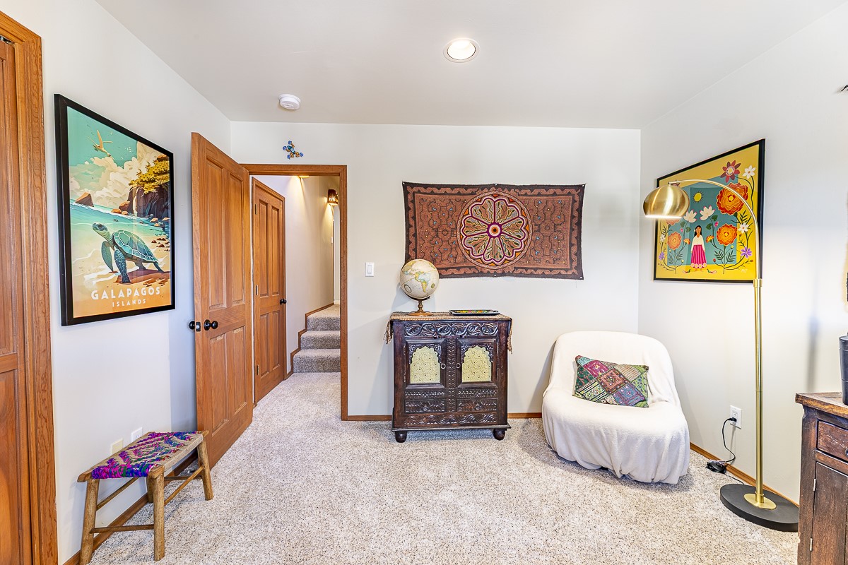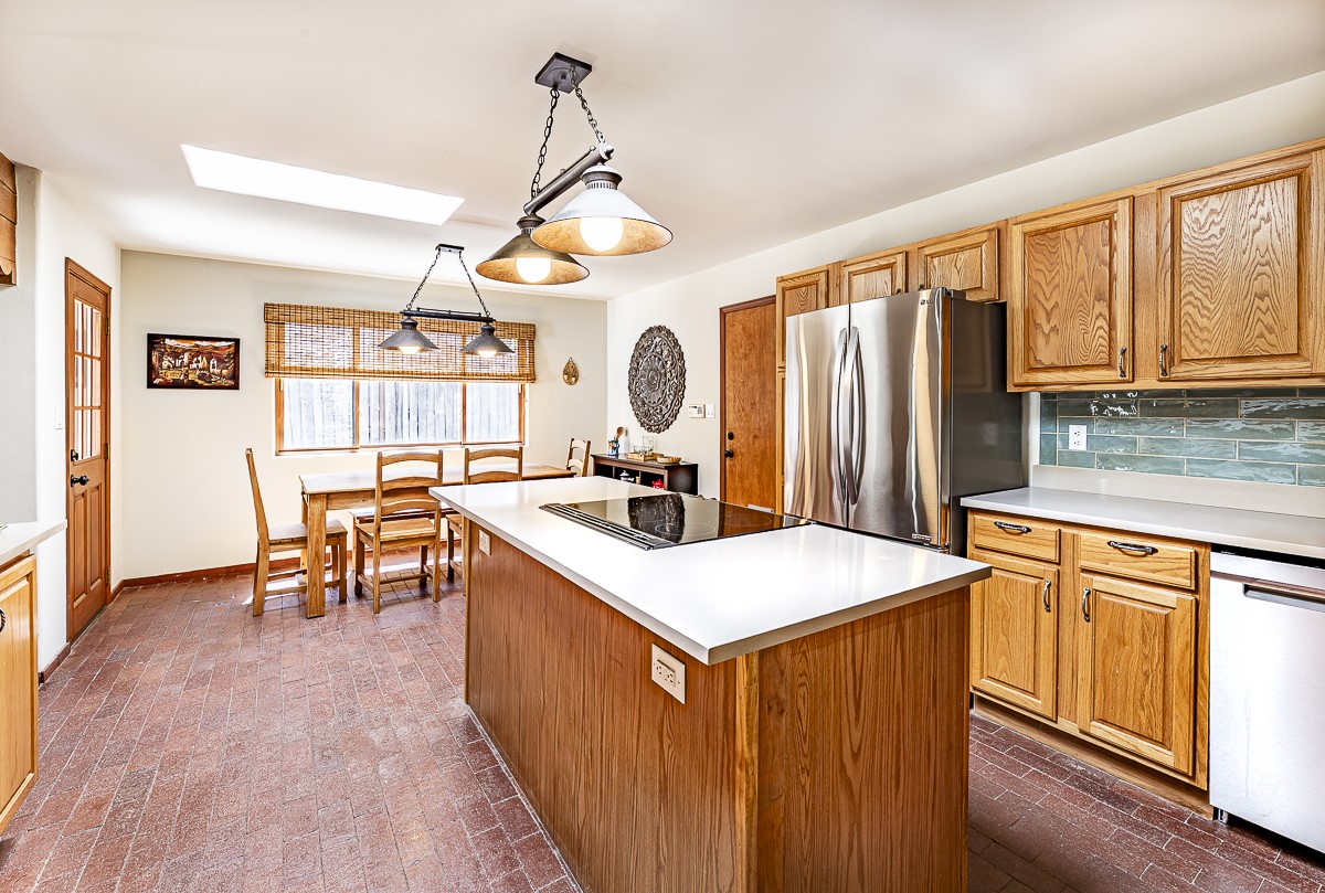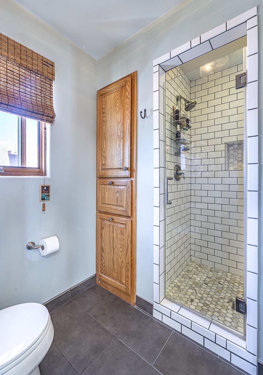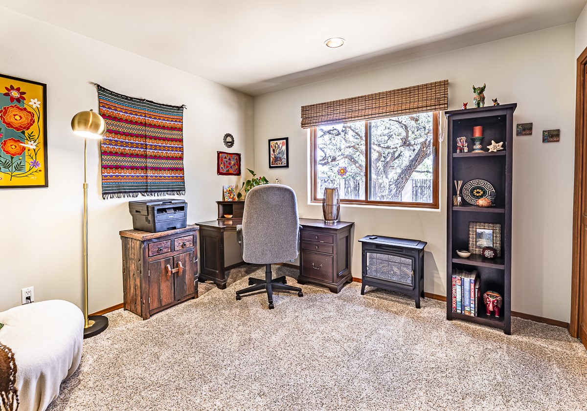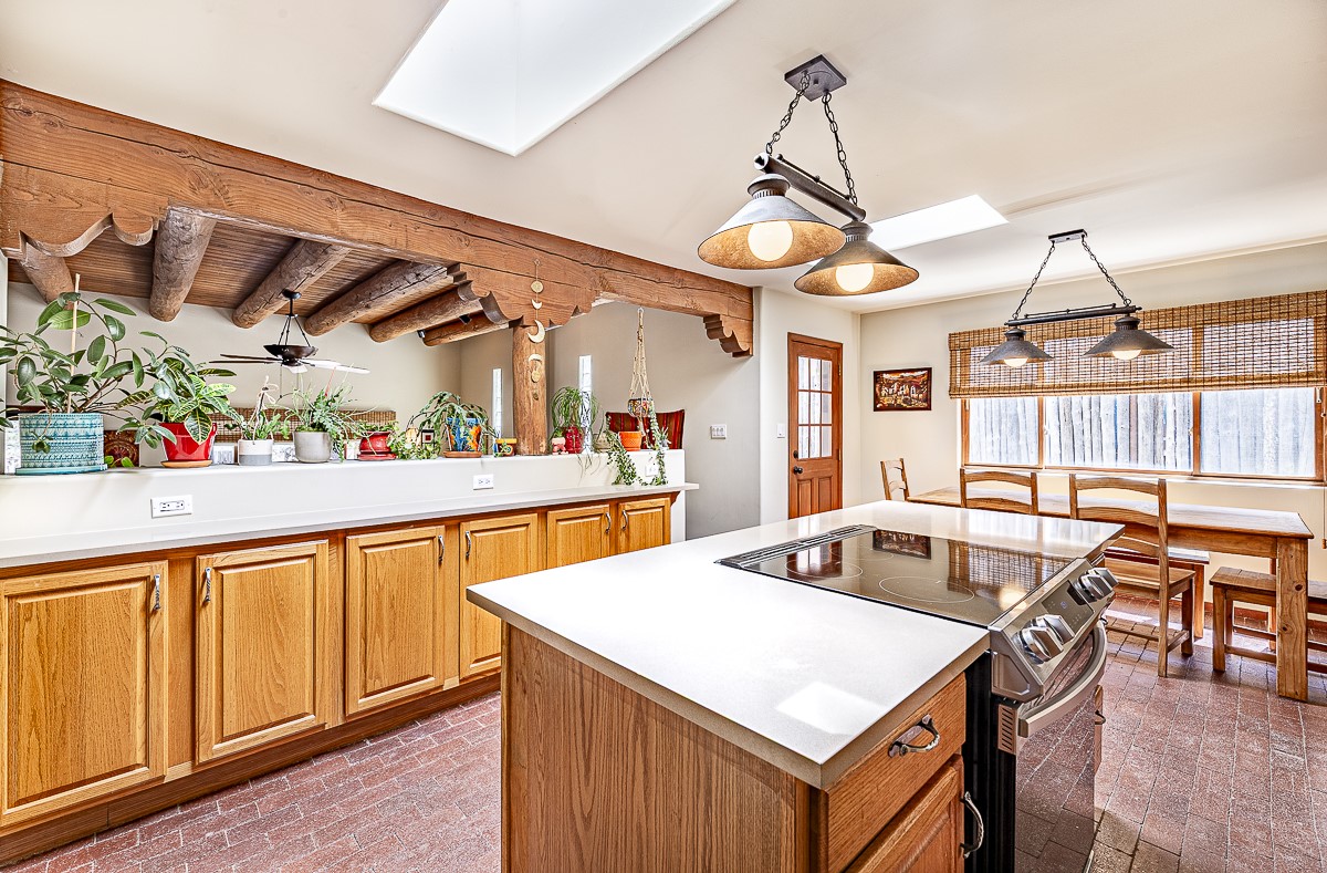 When you are looking for that perfect house and it finally arrives! This home invites you to sit on the cool and comfortable upper balcony overlooking a greenspace with views of both the Jemez and Sangre de Cristo Mountains. Pueblo style character and earthy finishes such as brick floors, fireplace and vigas welcome you to this classic Santa Fe home featuring two main level bedrooms with full bath and a spacious primary bedroom suite on the upper level. The sunken living room is incredibly cozy and inviting and it walks out to a walled back yard with a covered portal for outdoor dining. In a beloved neighborhood with 2-car garage and easy access to all things Santa Fe, this may just be the one!