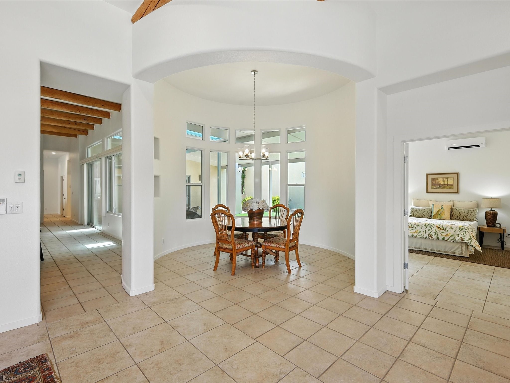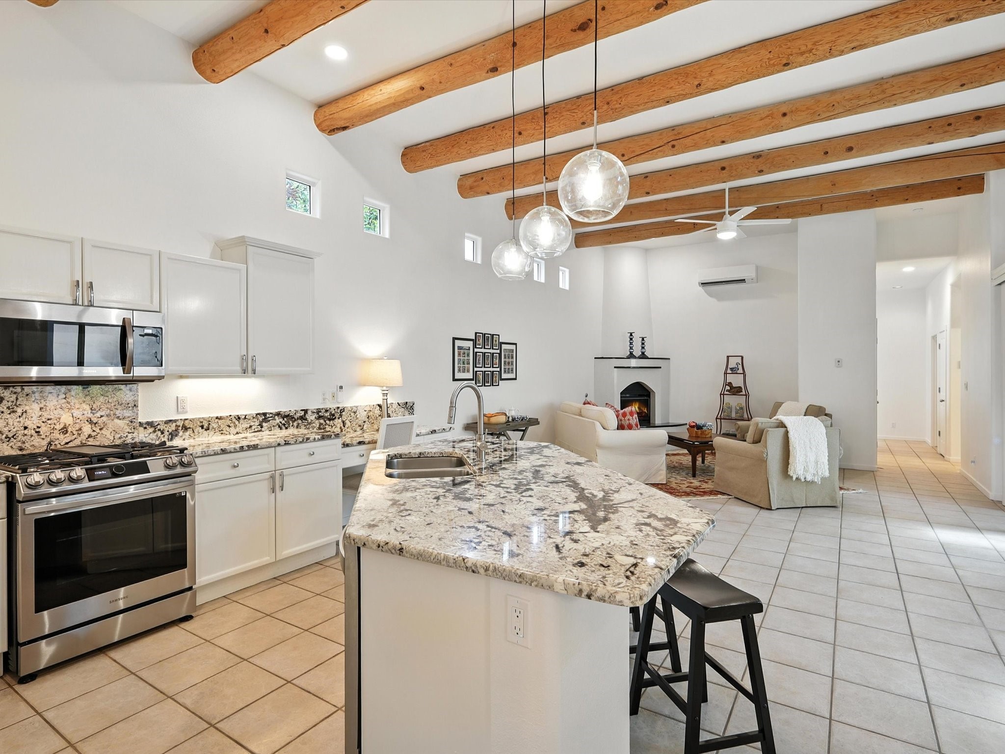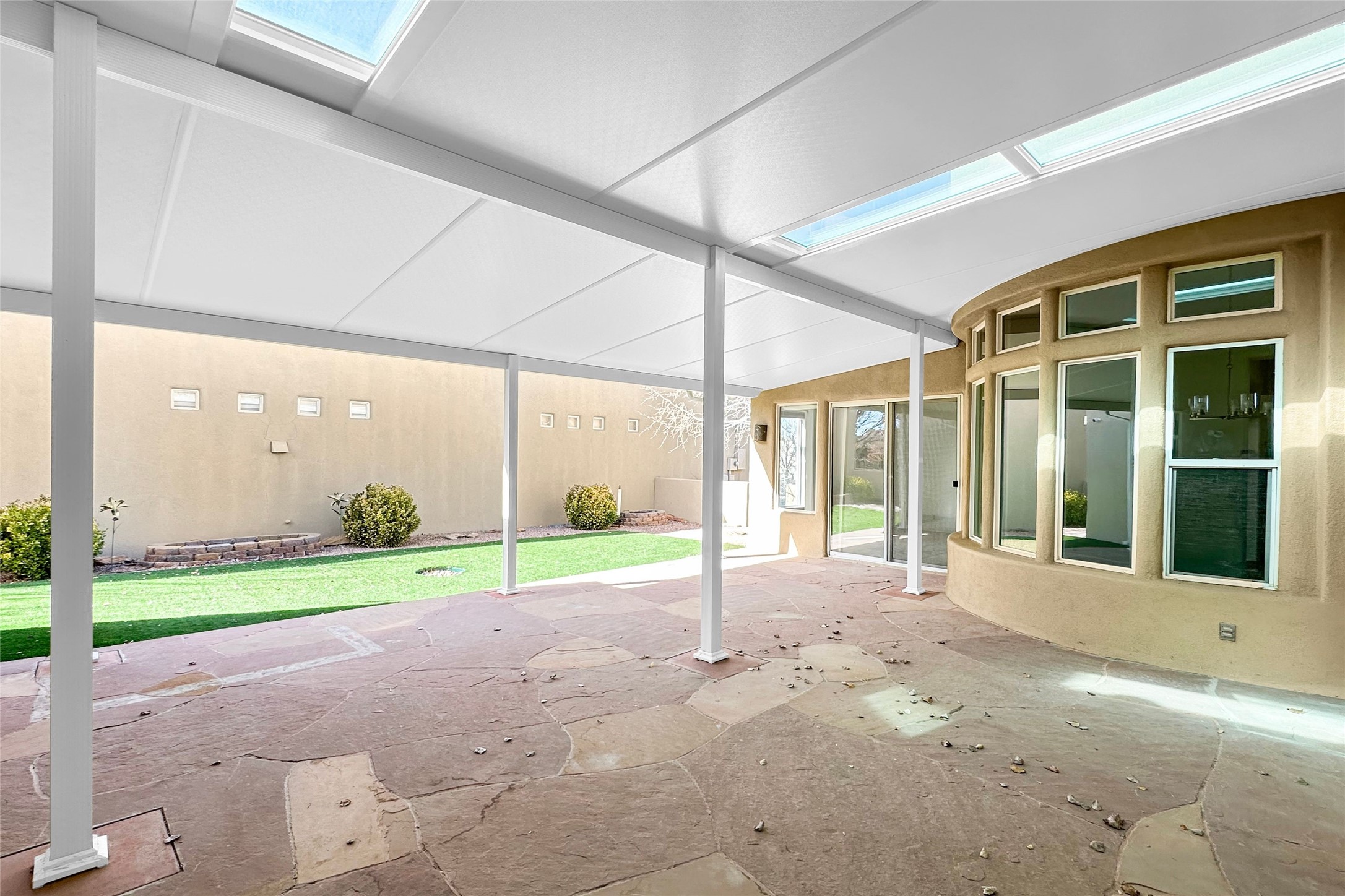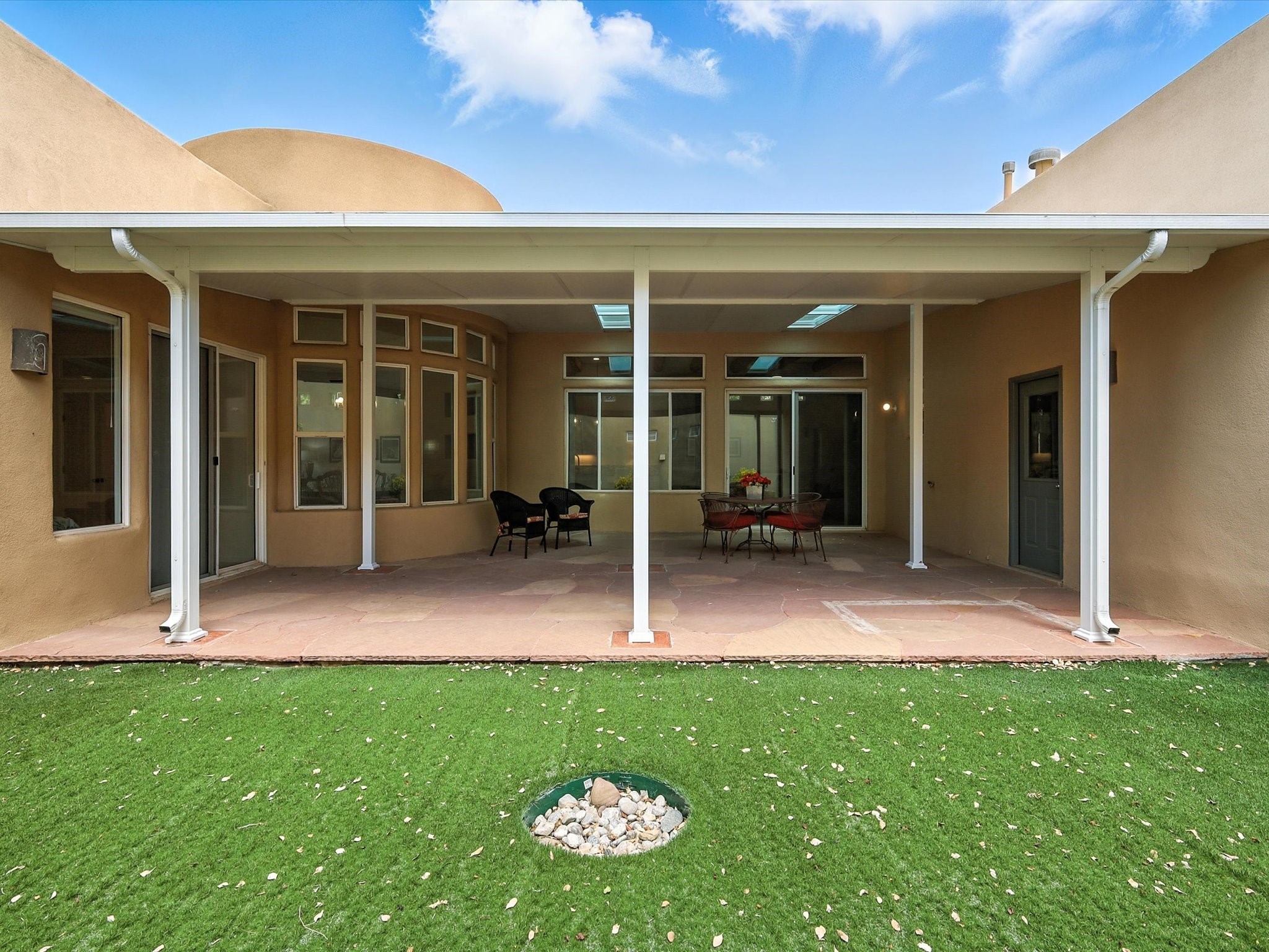 Newly staged and great new price, take another look! Exceptional property in Rancho Viejo, near trail access! Meticulously cared-for home greets you with Santa Fe charm, showcased by the stunning exposed Vigas & expansive ceilings in the living room. The seamless flow from the living room to the formal dining area boasts picturesque windows that overlook a beautifully landscaped backyard, inviting an abundance of natural light. Retreat to the primary suite, conveniently located off the living room, where you'll find direct access to a covered patio & the serene backyard. The luxurious primary bathroom features a separate jetted tub, a stylish shower, granite countertops with dual sinks, & a spacious walk-in closet. Discover a gorgeous kitchen that is both spacious & functional - highlighted by granite countertops, undermount lighting, stainless steel appliances, & a large island. This culinary haven opens to a generous family room, exposed Vigas & a cozy corner gas fireplace, creating the perfect setting for gatherings. Sliding doors from the family room lead to the expansive covered patio, ideal for entertaining. The other wing has a guest bathroom with granite countertops and a custom tub/shower, along with two well-appointed guest bedrooms that provide excellent separation from the primary suite. There is also a versatile bonus room suitable for an office, gym, theater, or other uses. The laundry room boasts upper cabinets & a utility sink, with direct access to both the garage & a secondary walled-in yard. The outdoor space of this property is truly a highlight, featuring a custom covered patio spanning over 600 sq. ft., perfect for entertaining, seamlessly flowing into a beautifully landscaped yard complete with artificial turf, lush shrubs, & an aspen tree. NEW ROOF IN 2024! Located within the Rancho Viejo community, enjoy access to parks, miles of scenic walking trails, and breathtaking views. Come experience the beauty of this Santa Fe gem today!