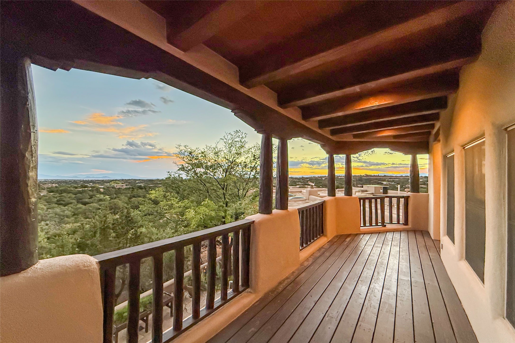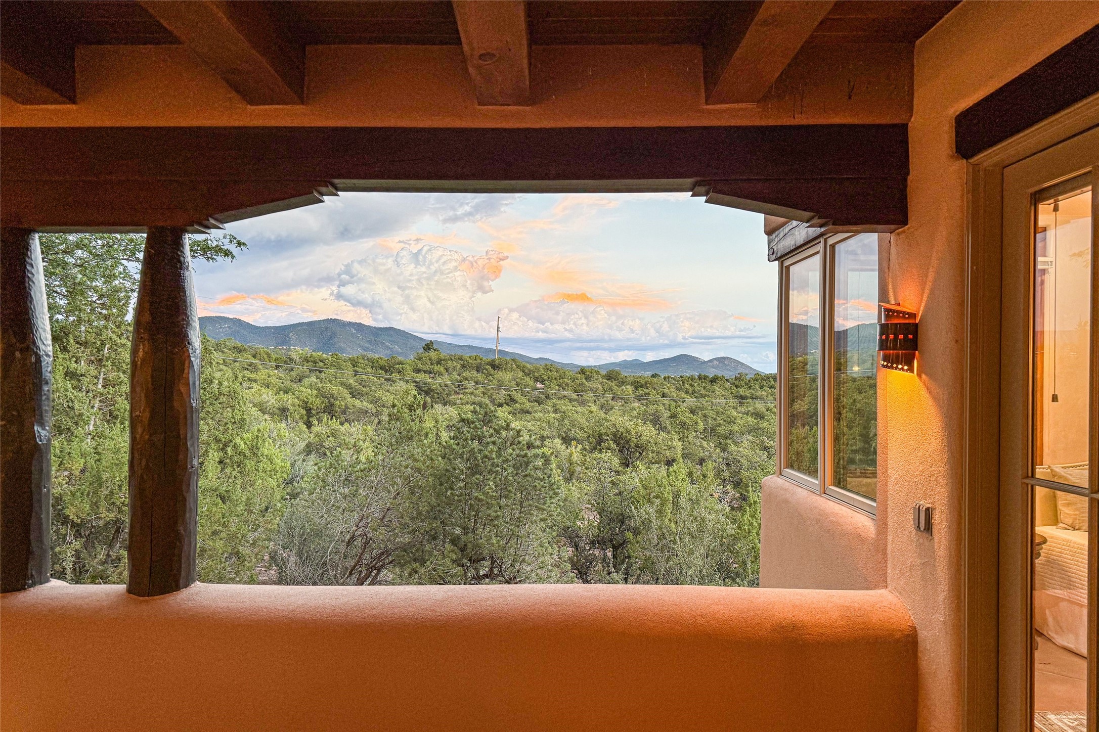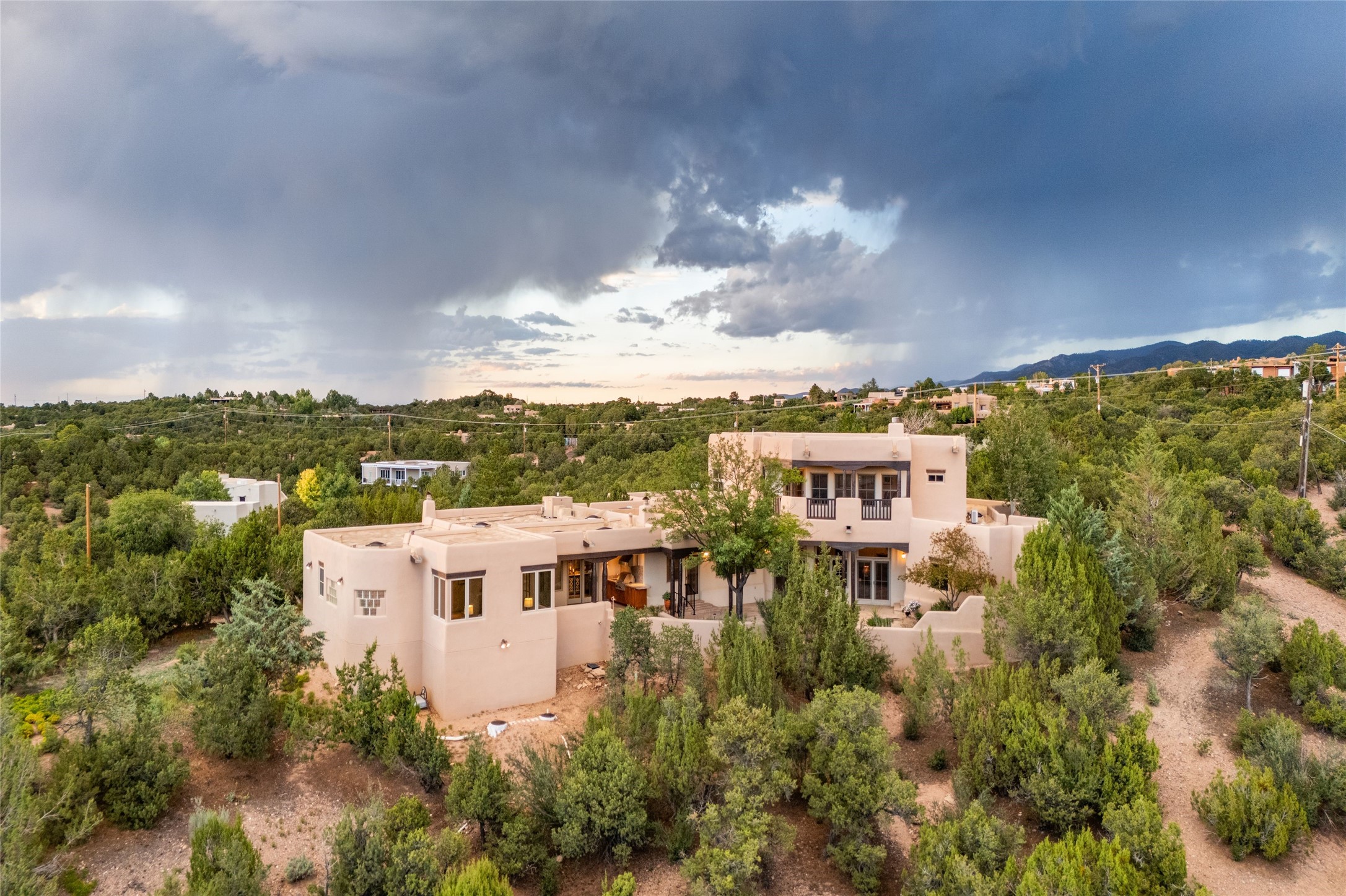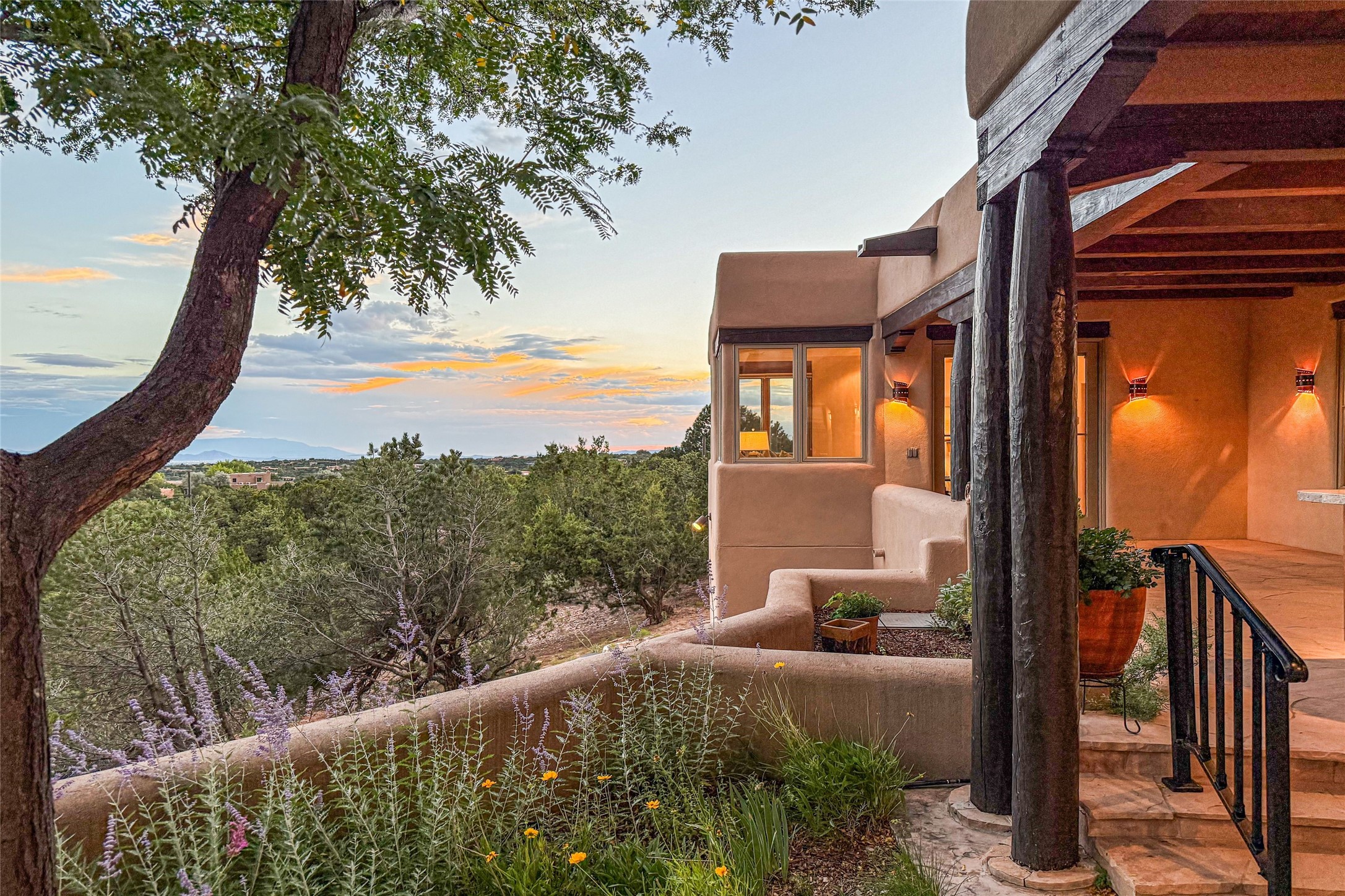 Discover panoramic views and refined details throughout this beautifully crafted pueblo style residence by renowned builder Bruce Thompson. With 3 beds/4 baths (including 2 primary suites) and 4,875 sq. feet, plus elegant finishes like diamond plaster walls and features like ceiling beams and stained glass doorways, this home blends luxury with timeless character. The grand entry reveals soaring ceilings with clerestory windows, and leads into the heart of the home, a grand living room that showcases city and mountain views and is anchored by a stone fireplace. Designed by David Naylor, the kitchen is a chef's dream--fully updated with high-end appliances including Sub-Zero and Wolf, custom cabinetry, skylight, wine refrigerator, reverse osmosis system, large pantry, and a stylish breakfast nook with a gas fireplace. The Taj Royale Ceasarstone counter tops create a luxurious finish. This home features two primary suites. The first, on its own wing and floor, offers great privacy, a spa-like bath retreat and a balcony with sweeping views. A second primary suite on the main floor is a newer addition built by Cricket Roulette and is perfect for guests or multi-generational living. Also private and peaceful, this large suite has direct access to the main portal and is fully handicap accessible, including the large shower. This addition also features a stone alcove for art display, a family room with gas fireplace, and direct access to the outdoor kitchen. The guest bedroom and office, on the other side of the home, share a private courtyard with a tranquil waterfall feature. This home makes living easy with ample storage spaces, walk-in closets, and a cedar closet.Nestled in the picturesque Vista Encantada neighborhood, centrally and conveniently located between downtown and the opera, this home is an inviting blend of artful design and comfort.