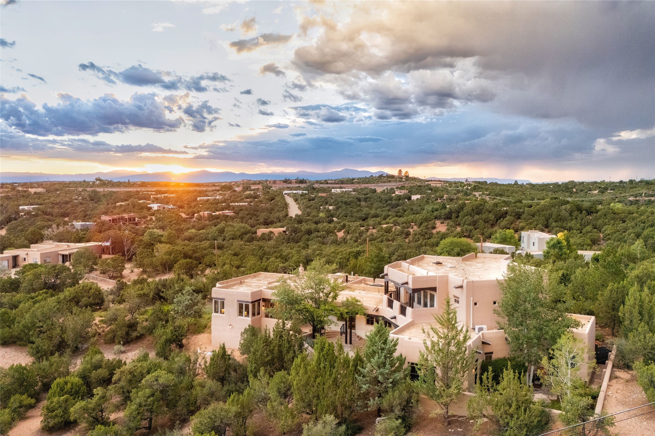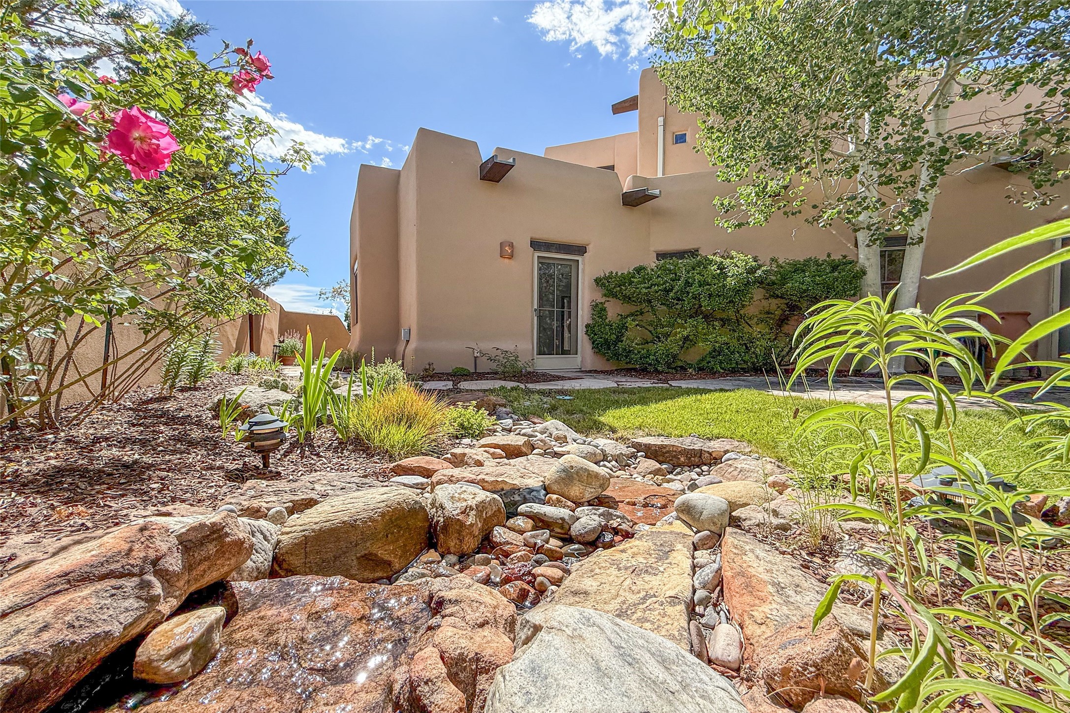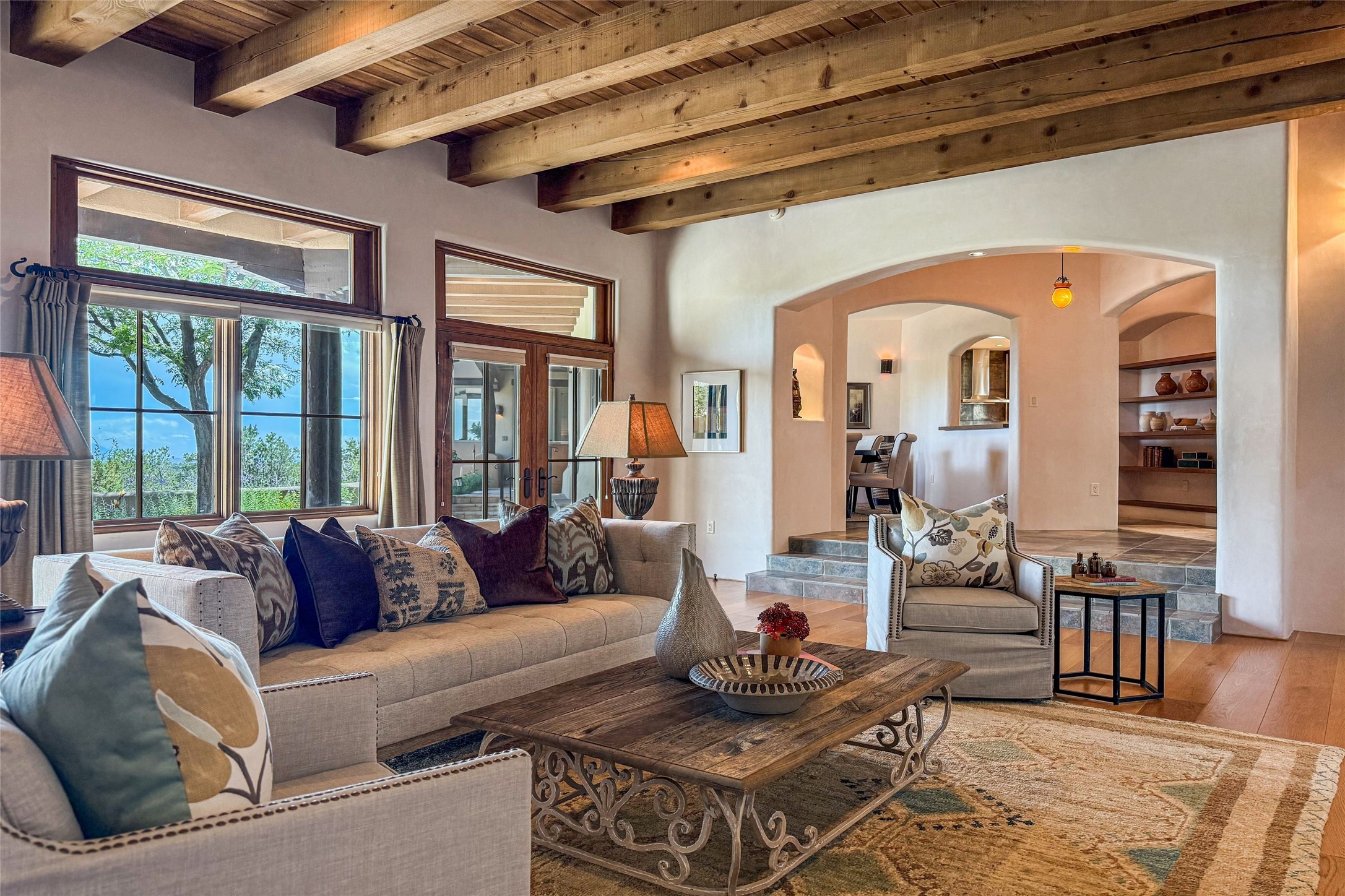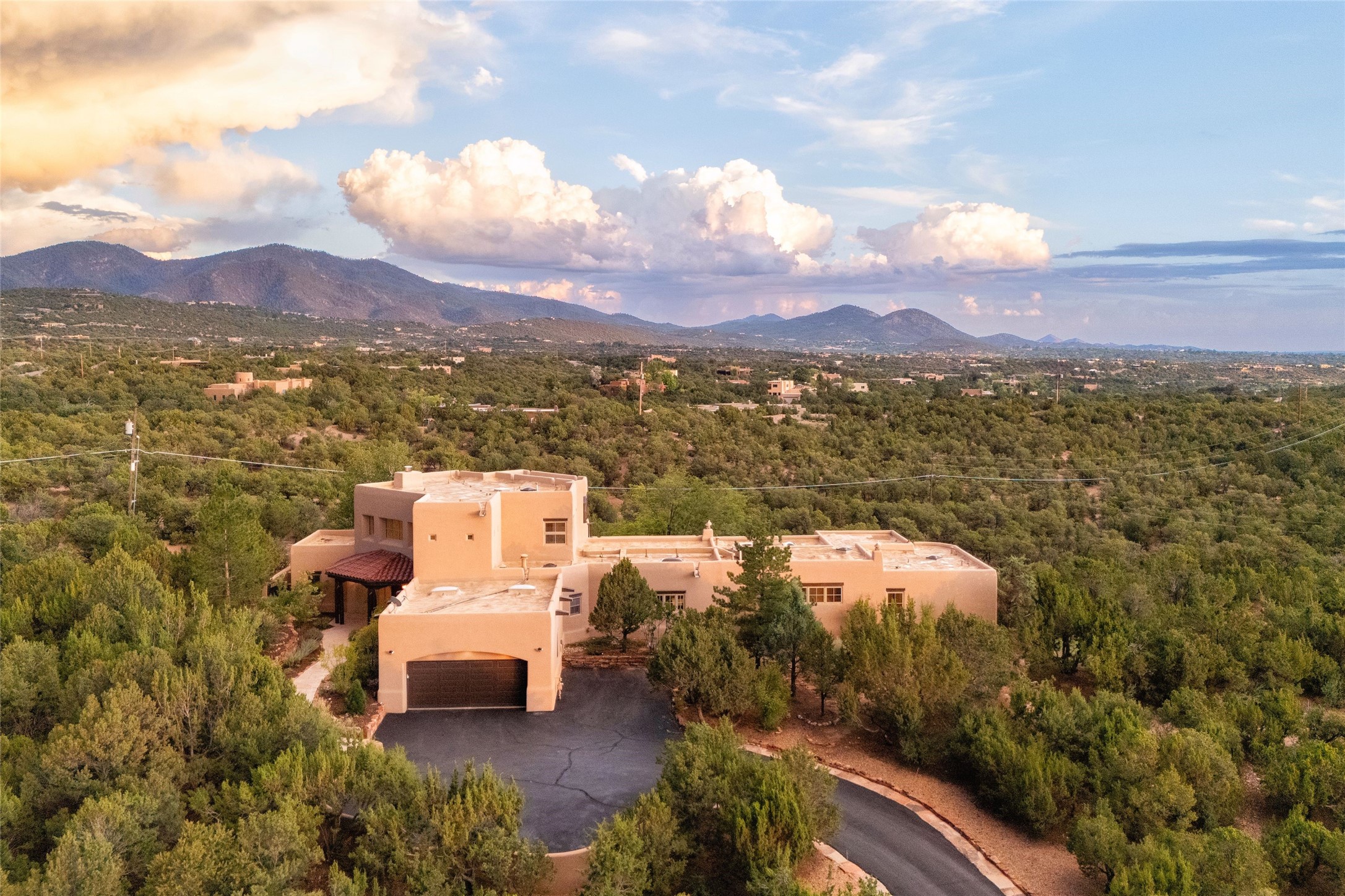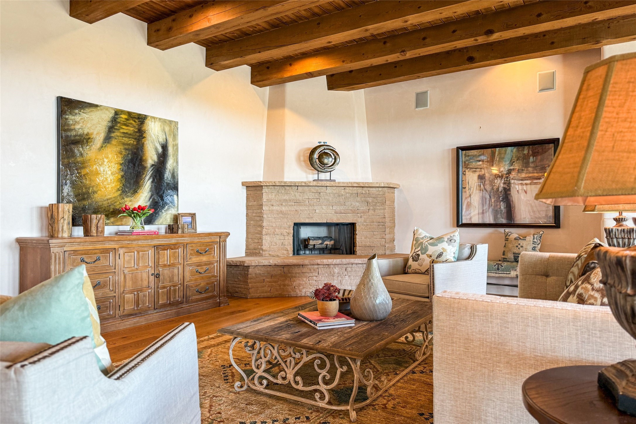 Discover panoramic views and refined details throughout this beautifully crafted pueblo style residence by renowned builder Bruce Thompson. With 3 beds/4 baths (including 2 primary suites) and 4,875 sq. feet, plus elegant finishes like diamond plaster walls and features like ceiling beams and stained glass doorways, this home blends luxury with timeless character. The grand entry reveals soaring ceilings with clerestory windows, and leads into the heart of the home, a grand living room that showcases city and mountain views and is anchored by a stone fireplace. Designed by David Naylor, the kitchen is a chef's dream--fully updated with high-end appliances including Sub-Zero and Wolf, custom cabinetry, skylight, wine refrigerator, reverse osmosis system, large pantry, and a stylish breakfast nook with a gas fireplace. The Taj Royale Ceasarstone counter tops create a luxurious finish. This home features two primary suites. The first, on its own wing and floor, offers great privacy, a spa-like bath retreat and a balcony with sweeping views. A second primary suite on the main floor is a newer addition built by Cricket Roulette and is perfect for guests or multi-generational living. Also private and peaceful, this large suite has direct access to the main portal and is fully handicap accessible, including the large shower. This addition also features a stone alcove for art display, a family room with gas fireplace, and direct access to the outdoor kitchen. The guest bedroom and office, on the other side of the home, share a private courtyard with a tranquil waterfall feature. This home makes living easy with ample storage spaces, walk-in closets, and a cedar closet.Nestled in the picturesque Vista Encantada neighborhood, centrally and conveniently located between downtown and the opera, this home is an inviting blend of artful design and comfort.