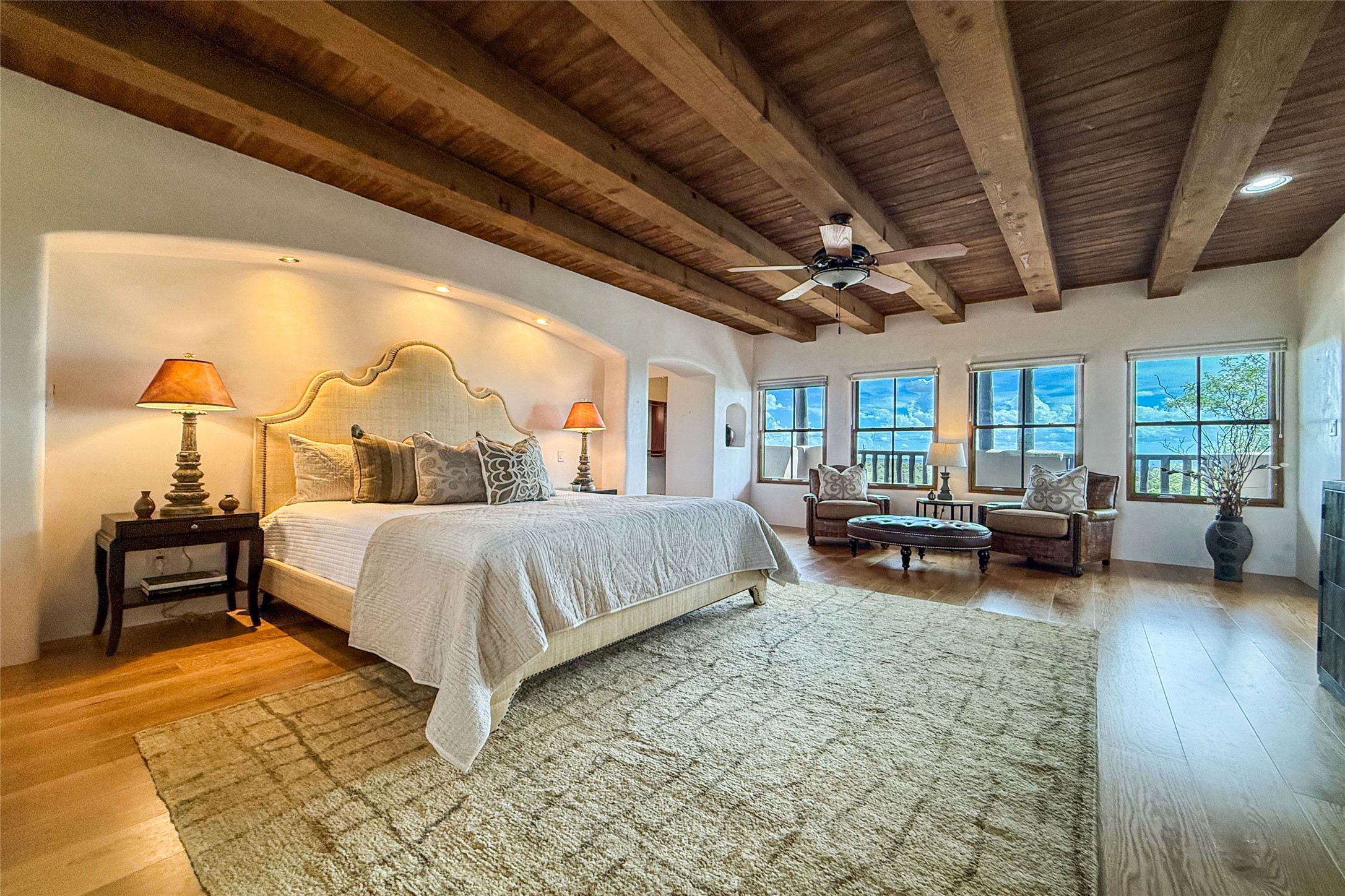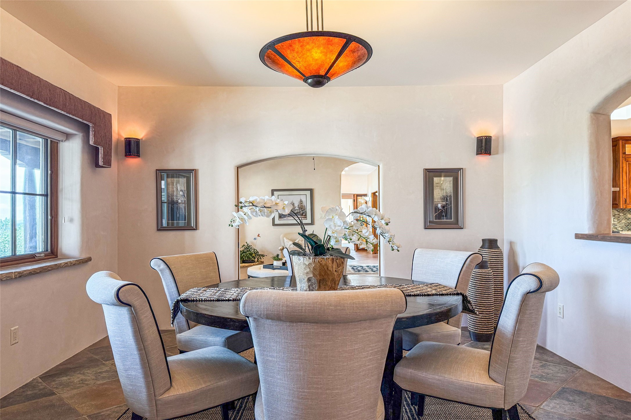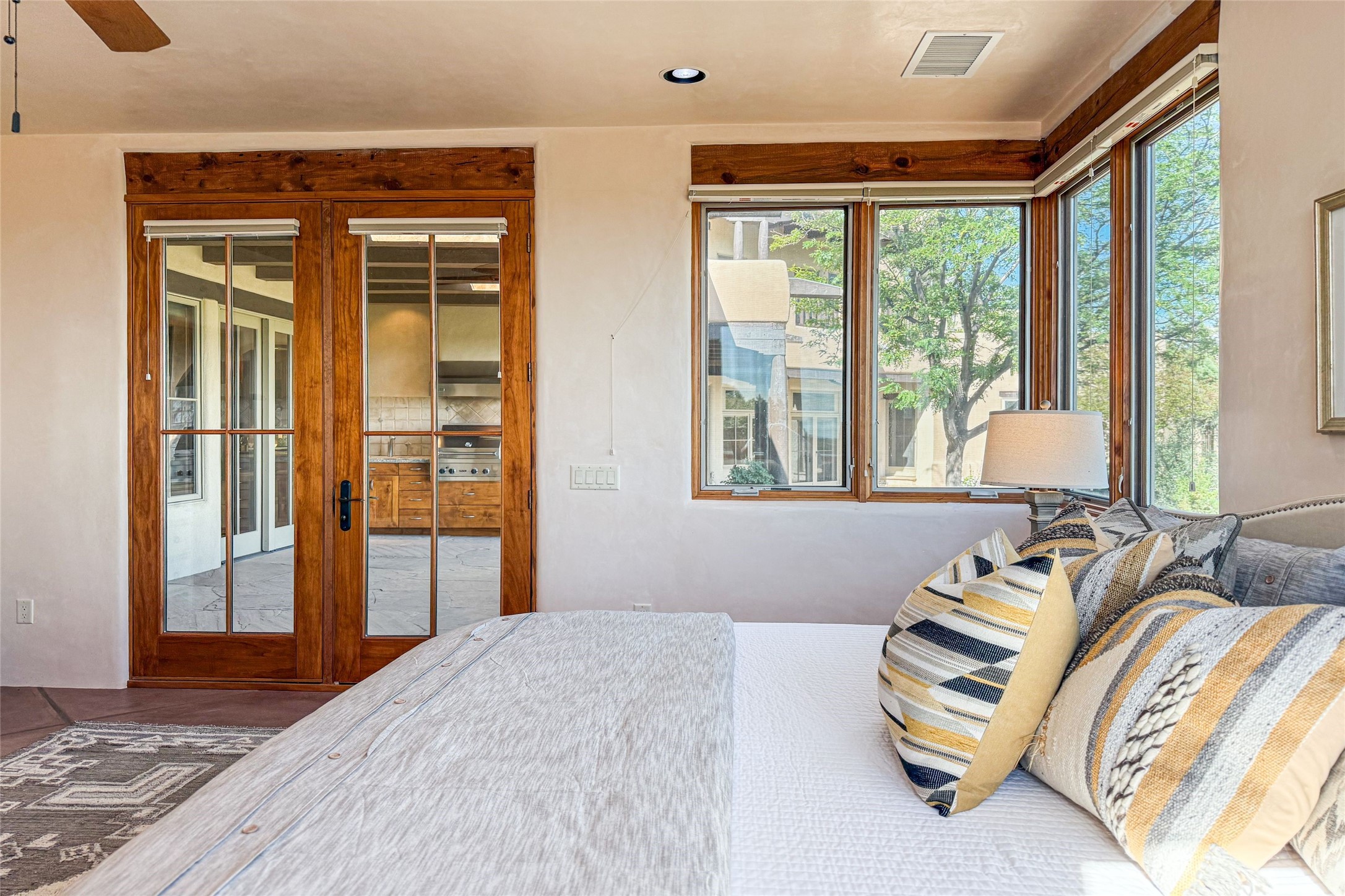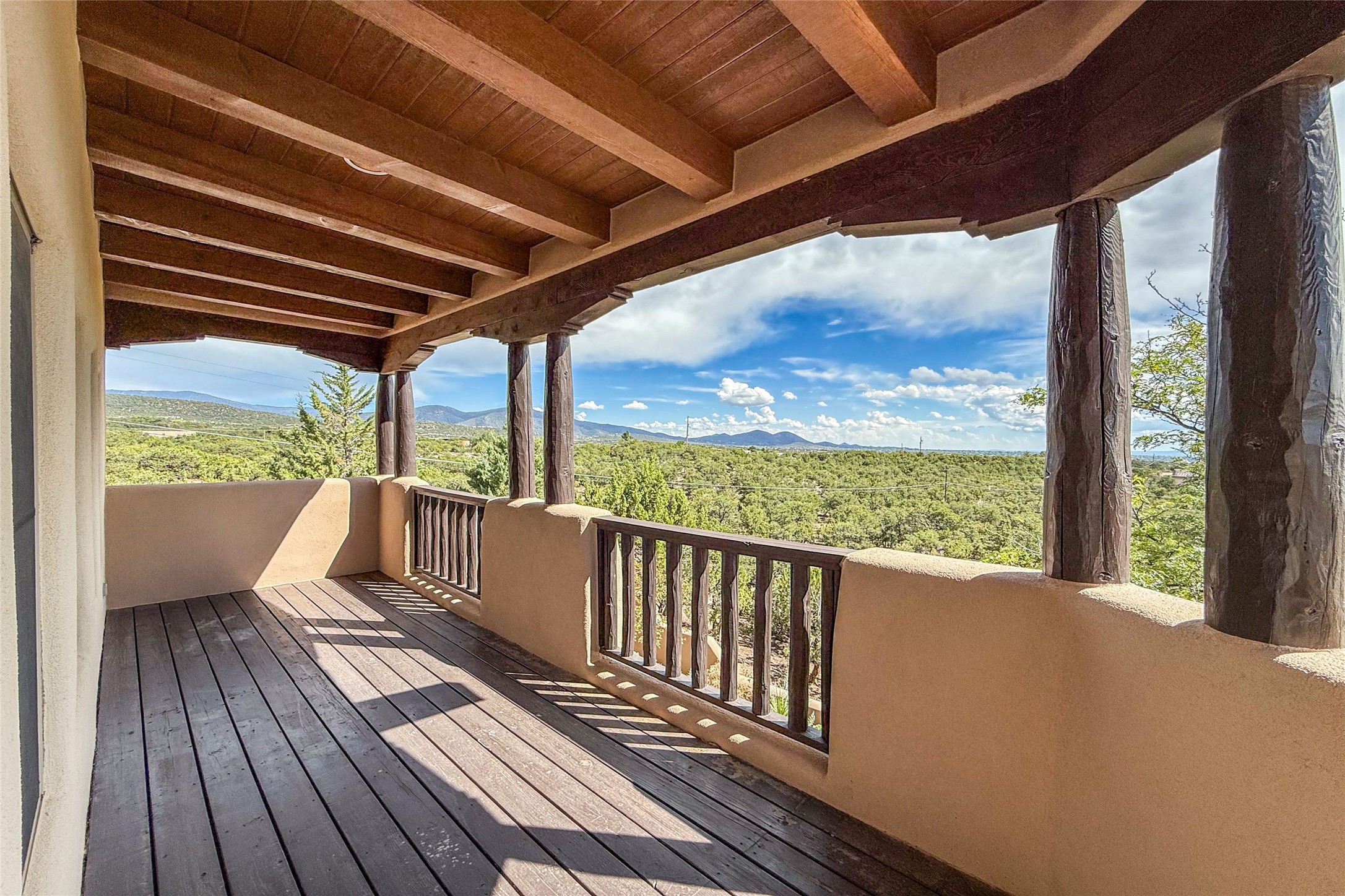 Discover panoramic views and refined details throughout this beautifully crafted pueblo style residence by renowned builder Bruce Thompson. With 3 beds/4 baths (including 2 primary suites) and 4,875 sq. feet, plus elegant finishes like diamond plaster walls and features like ceiling beams and stained glass doorways, this home blends luxury with timeless character. The grand entry reveals soaring ceilings with clerestory windows, and leads into the heart of the home, a grand living room that showcases city and mountain views and is anchored by a stone fireplace. Designed by David Naylor, the kitchen is a chef's dream--fully updated with high-end appliances including Sub-Zero and Wolf, custom cabinetry, skylight, wine refrigerator, reverse osmosis system, large pantry, and a stylish breakfast nook with a gas fireplace. The Taj Royale Ceasarstone counter tops create a luxurious finish. This home features two primary suites. The first, on its own wing and floor, offers great privacy, a spa-like bath retreat and a balcony with sweeping views. A second primary suite on the main floor is a newer addition built by Cricket Roulette and is perfect for guests or multi-generational living. Also private and peaceful, this large suite has direct access to the main portal and is fully handicap accessible, including the large shower. This addition also features a stone alcove for art display, a family room with gas fireplace, and direct access to the outdoor kitchen. The guest bedroom and office, on the other side of the home, share a private courtyard with a tranquil waterfall feature. This home makes living easy with ample storage spaces, walk-in closets, and a cedar closet.Nestled in the picturesque Vista Encantada neighborhood, centrally and conveniently located between downtown and the opera, this home is an inviting blend of artful design and comfort.