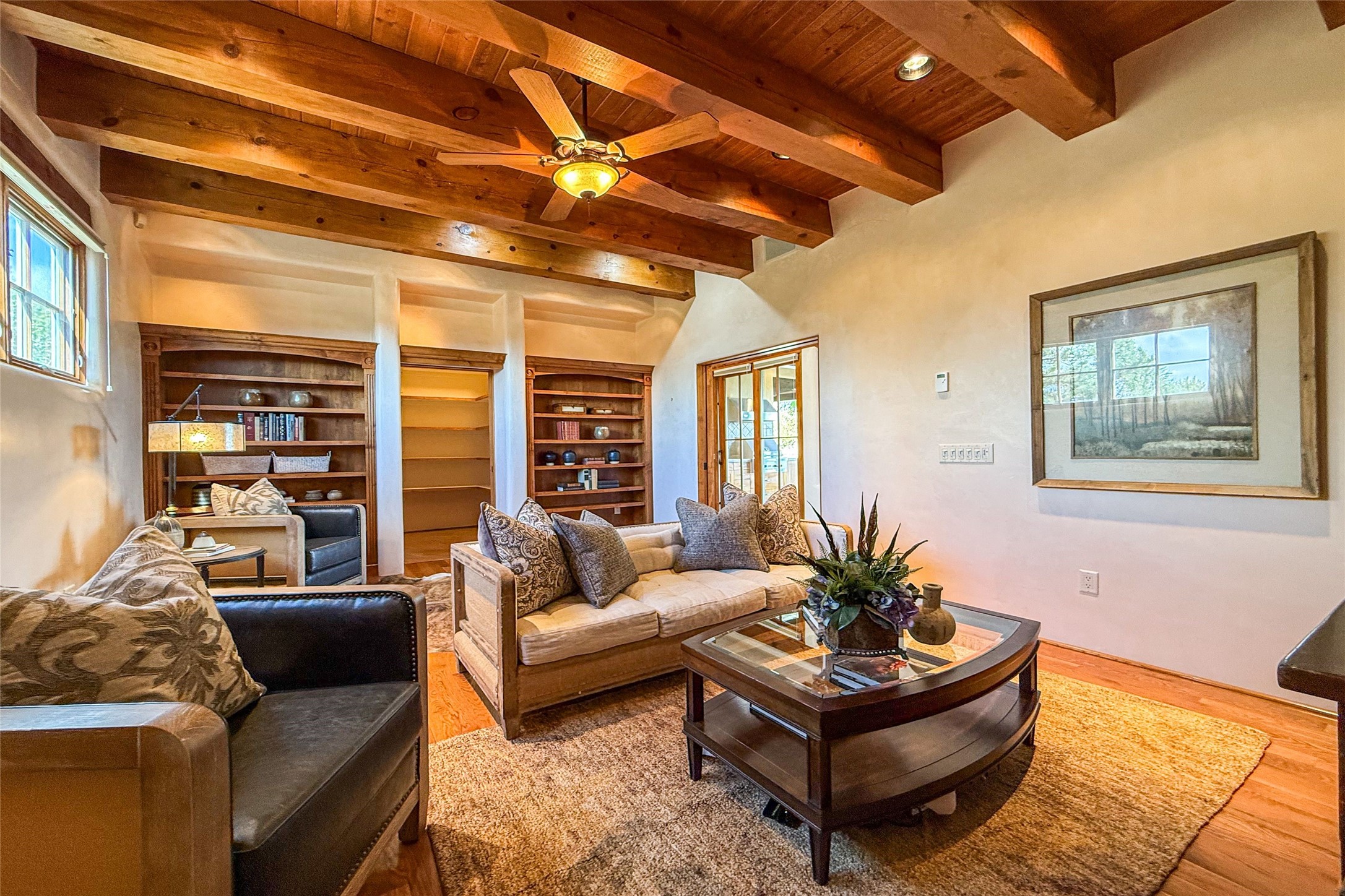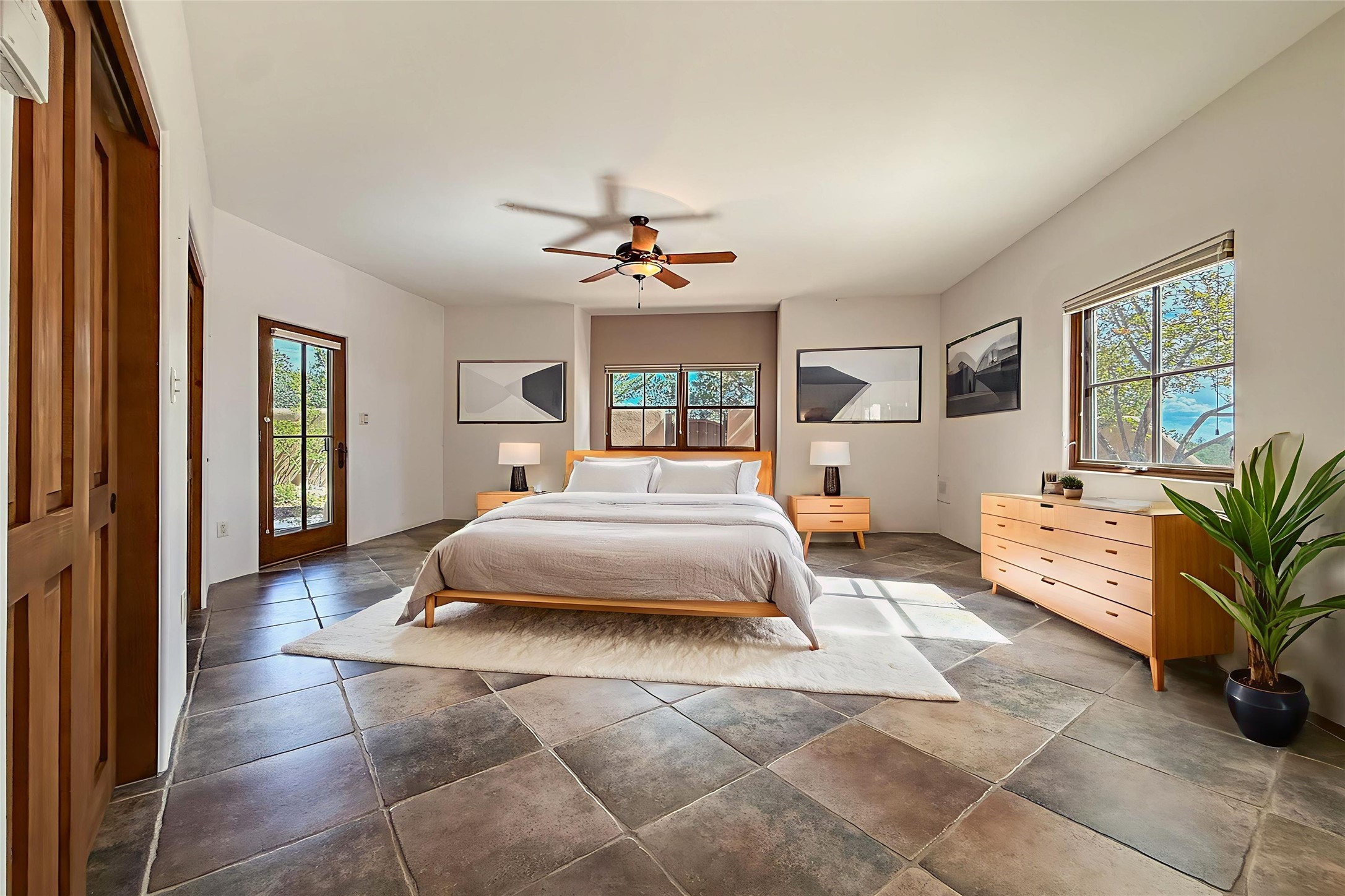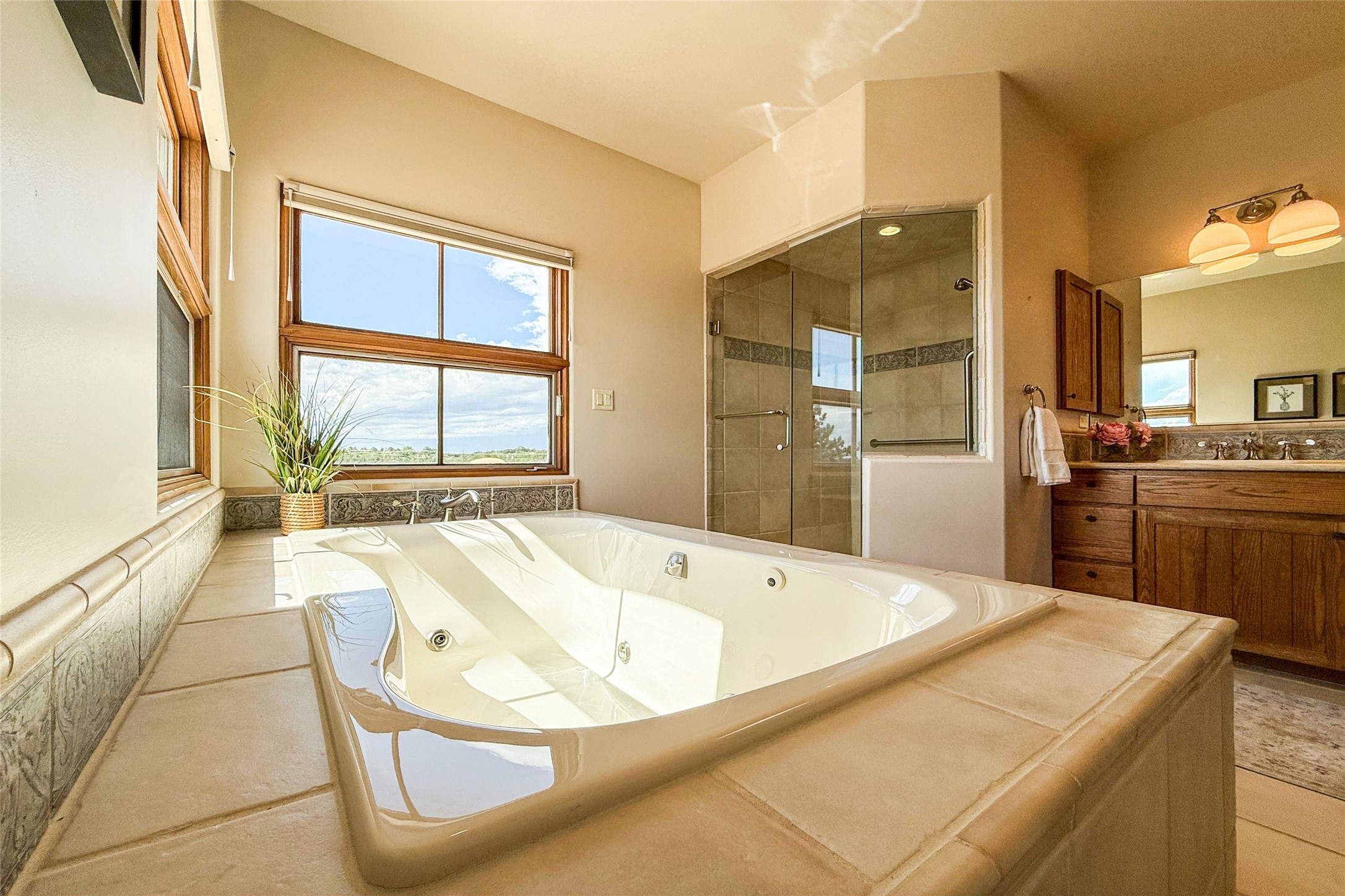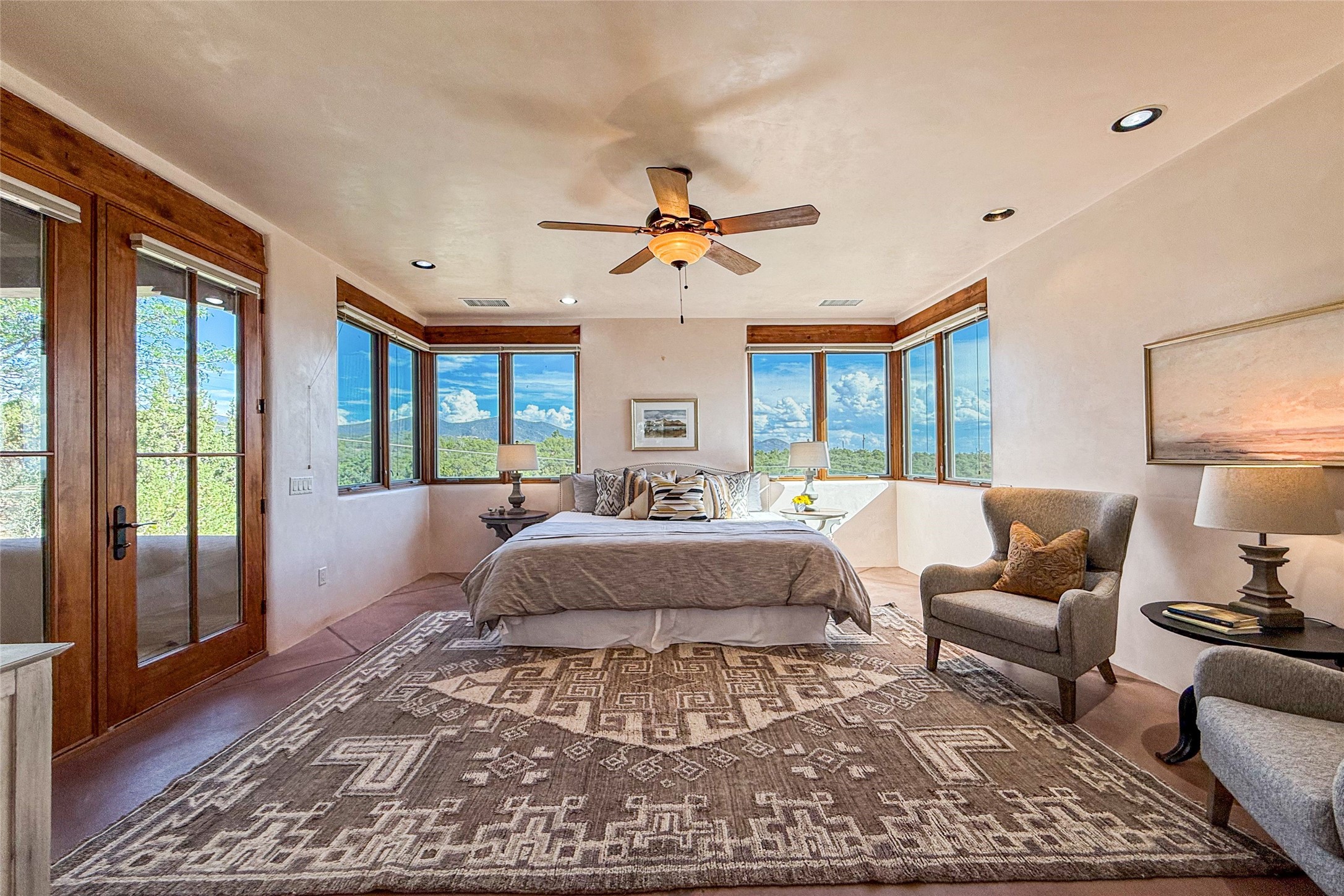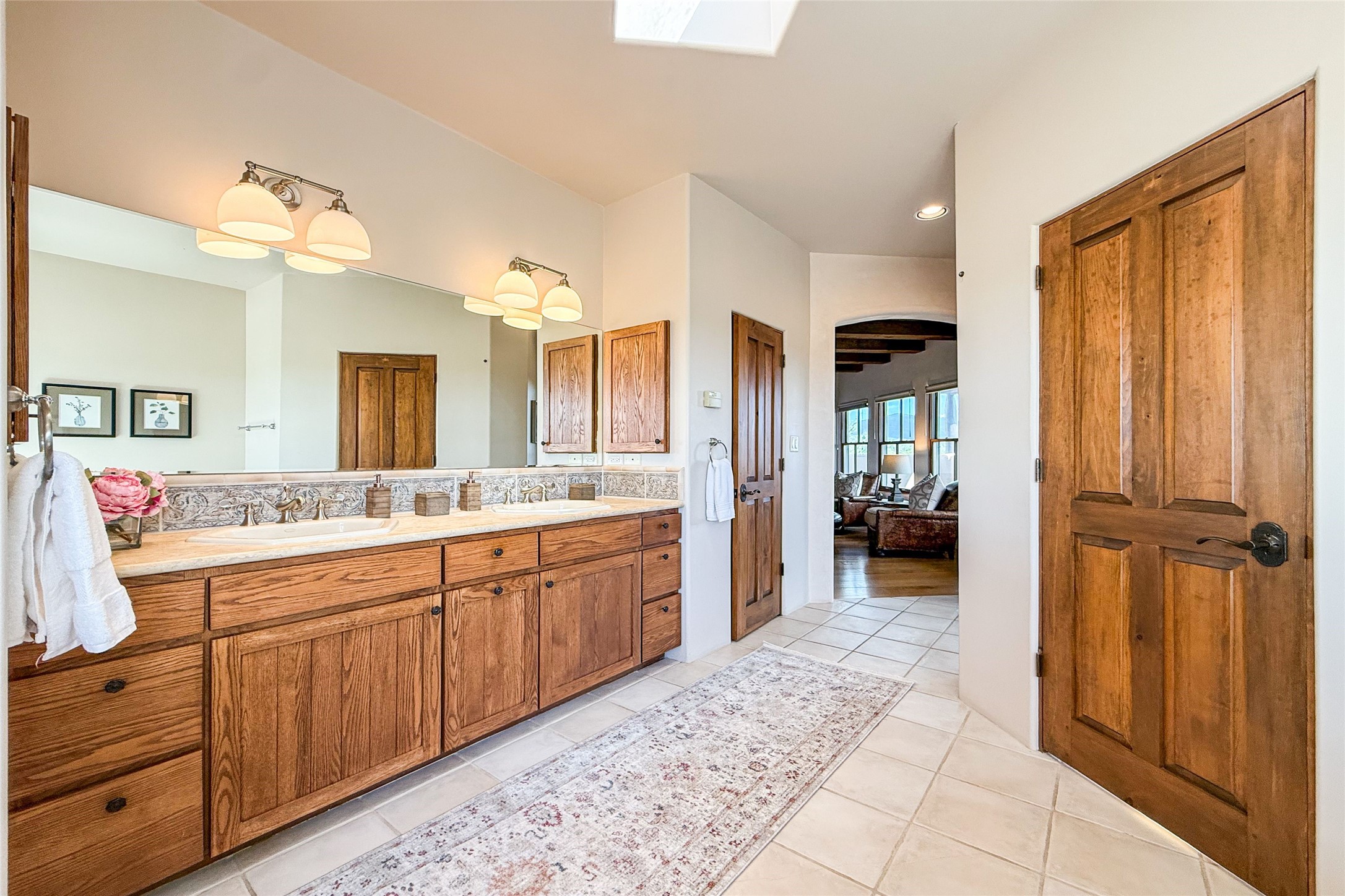 Discover panoramic views and refined details throughout this beautifully crafted pueblo style residence by renowned builder Bruce Thompson. With 3 beds/4 baths (including 2 primary suites) and 4,875 sq. feet, plus elegant finishes like diamond plaster walls and features like ceiling beams and stained glass doorways, this home blends luxury with timeless character. The grand entry reveals soaring ceilings with clerestory windows, and leads into the heart of the home, a grand living room that showcases city and mountain views and is anchored by a stone fireplace. Designed by David Naylor, the kitchen is a chef's dream--fully updated with high-end appliances including Sub-Zero and Wolf, custom cabinetry, skylight, wine refrigerator, reverse osmosis system, large pantry, and a stylish breakfast nook with a gas fireplace. The Taj Royale Ceasarstone counter tops create a luxurious finish. This home features two primary suites. The first, on its own wing and floor, offers great privacy, a spa-like bath retreat and a balcony with sweeping views. A second primary suite on the main floor is a newer addition built by Cricket Roulette and is perfect for guests or multi-generational living. Also private and peaceful, this large suite has direct access to the main portal and is fully handicap accessible, including the large shower. This addition also features a stone alcove for art display, a family room with gas fireplace, and direct access to the outdoor kitchen. The guest bedroom and office, on the other side of the home, share a private courtyard with a tranquil waterfall feature. This home makes living easy with ample storage spaces, walk-in closets, and a cedar closet.Nestled in the picturesque Vista Encantada neighborhood, centrally and conveniently located between downtown and the opera, this home is an inviting blend of artful design and comfort.