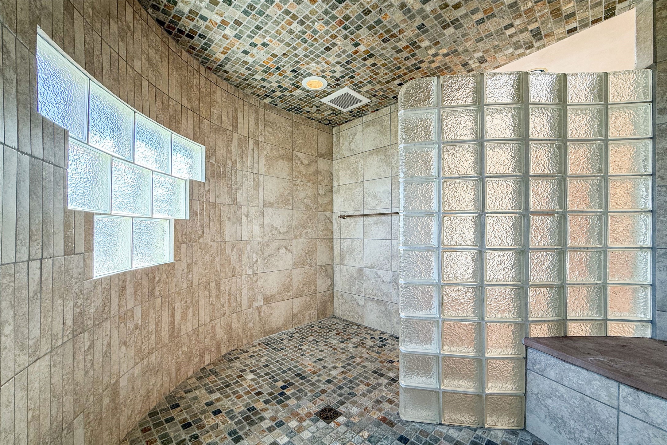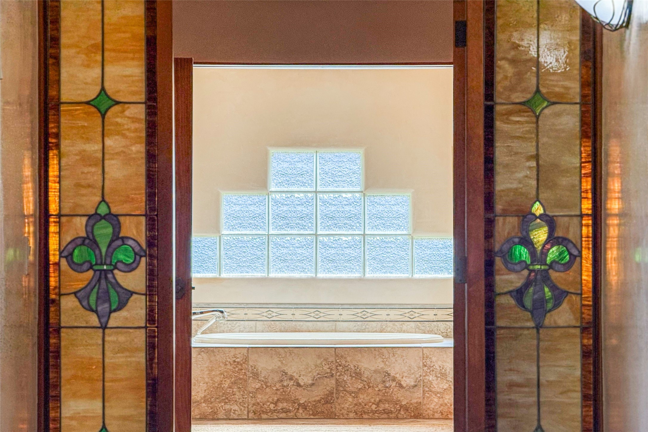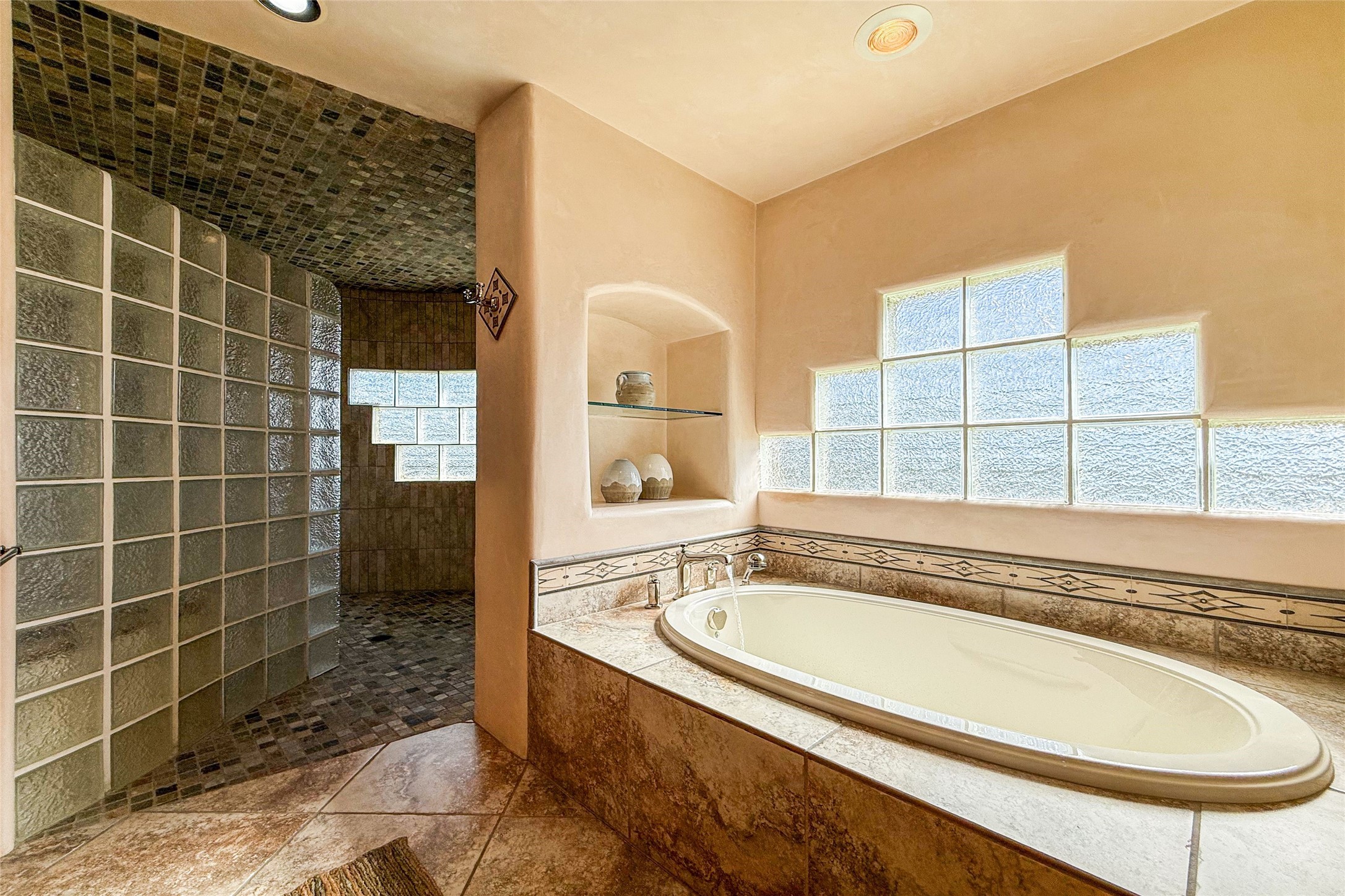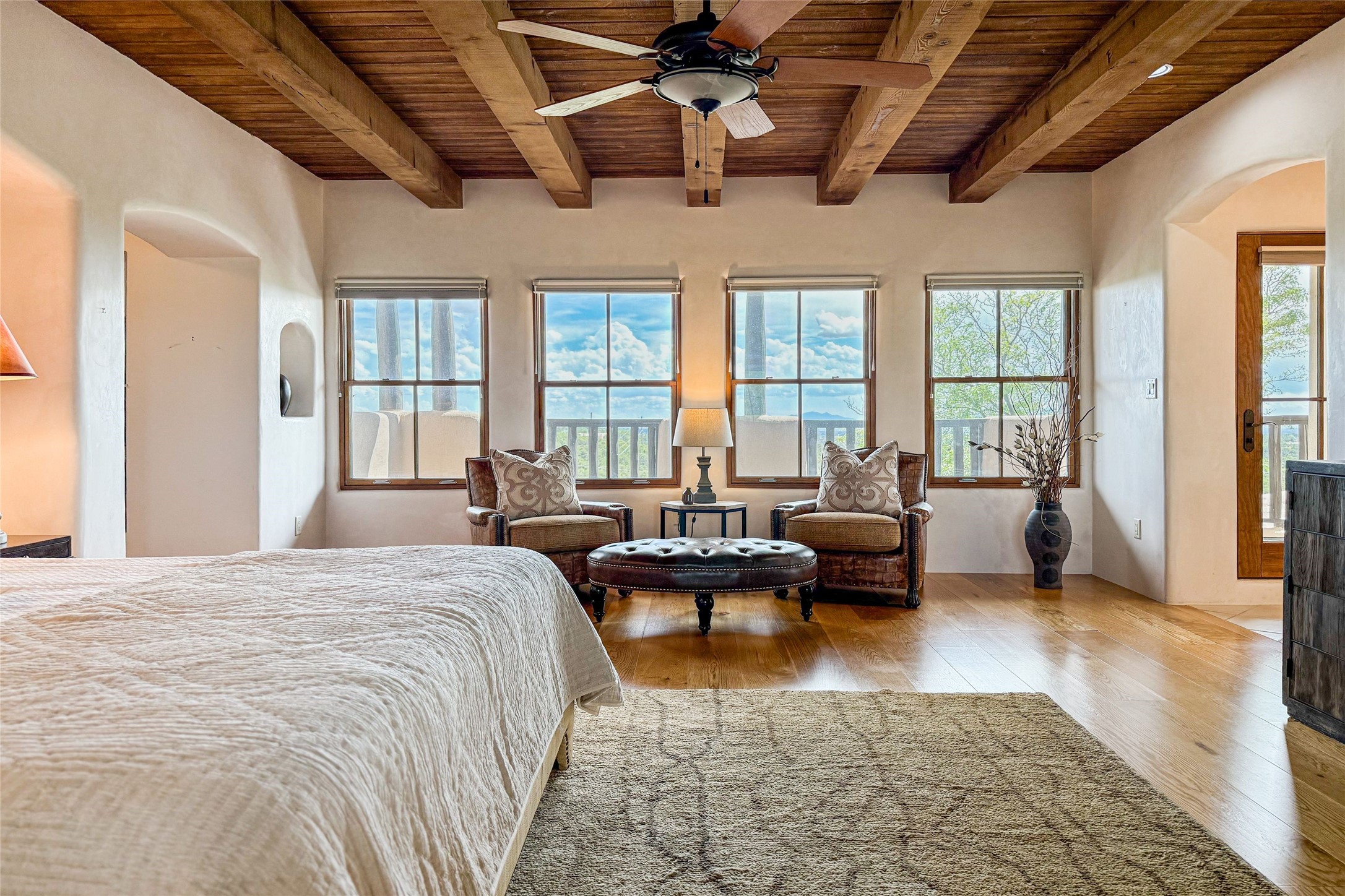 Discover panoramic views and refined details throughout this beautifully crafted pueblo style residence by renowned builder Bruce Thompson. With 3 beds/4 baths (including 2 primary suites) and 4,875 sq. feet, plus elegant finishes like diamond plaster walls and features like ceiling beams and stained glass doorways, this home blends luxury with timeless character. The grand entry reveals soaring ceilings with clerestory windows, and leads into the heart of the home, a grand living room that showcases city and mountain views and is anchored by a stone fireplace. Designed by David Naylor, the kitchen is a chef's dream--fully updated with high-end appliances including Sub-Zero and Wolf, custom cabinetry, skylight, wine refrigerator, reverse osmosis system, large pantry, and a stylish breakfast nook with a gas fireplace. The Taj Royale Ceasarstone counter tops create a luxurious finish. This home features two primary suites. The first, on its own wing and floor, offers great privacy, a spa-like bath retreat and a balcony with sweeping views. A second primary suite on the main floor is a newer addition built by Cricket Roulette and is perfect for guests or multi-generational living. Also private and peaceful, this large suite has direct access to the main portal and is fully handicap accessible, including the large shower. This addition also features a stone alcove for art display, a family room with gas fireplace, and direct access to the outdoor kitchen. The guest bedroom and office, on the other side of the home, share a private courtyard with a tranquil waterfall feature. This home makes living easy with ample storage spaces, walk-in closets, and a cedar closet.Nestled in the picturesque Vista Encantada neighborhood, centrally and conveniently located between downtown and the opera, this home is an inviting blend of artful design and comfort.