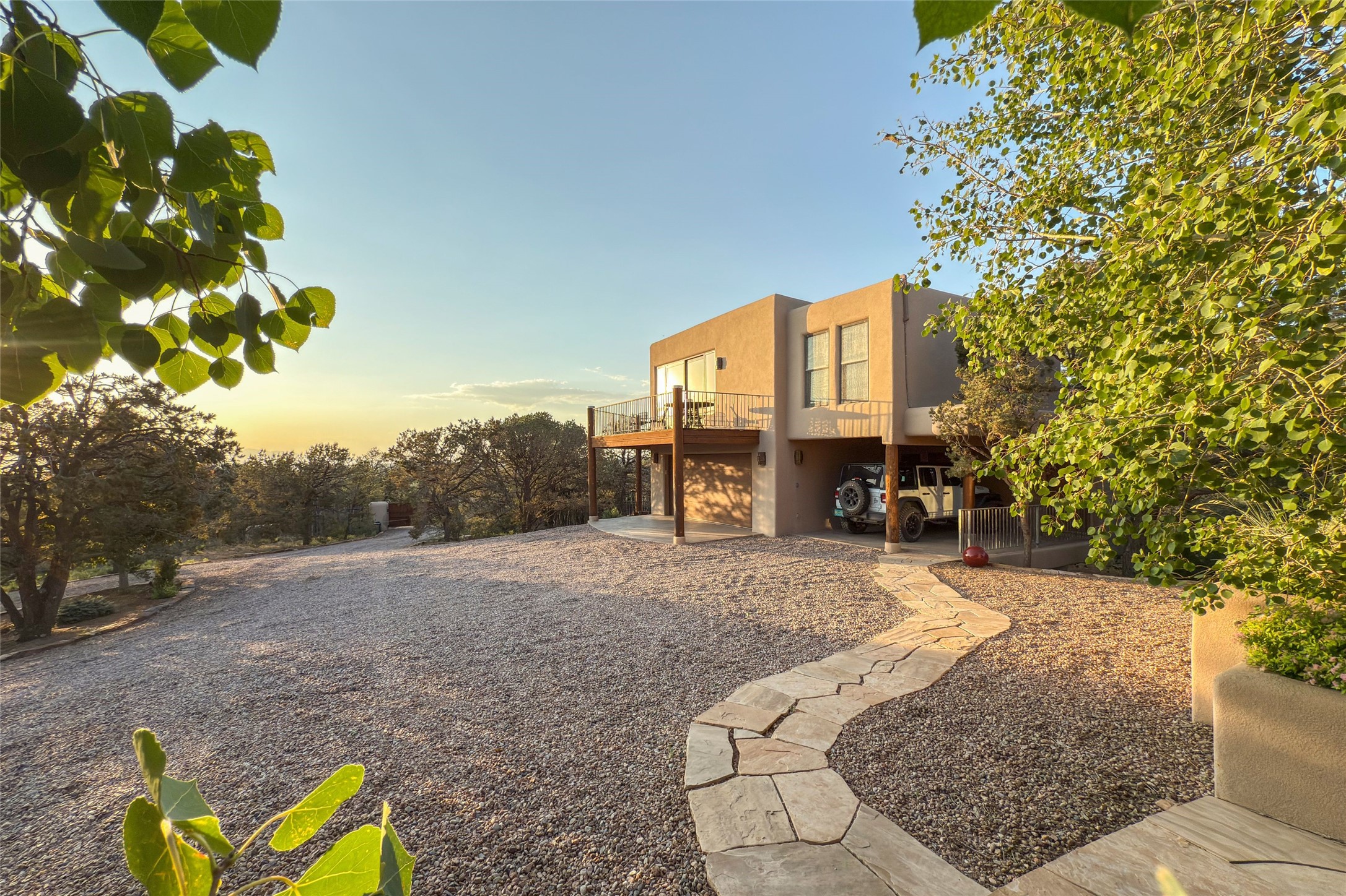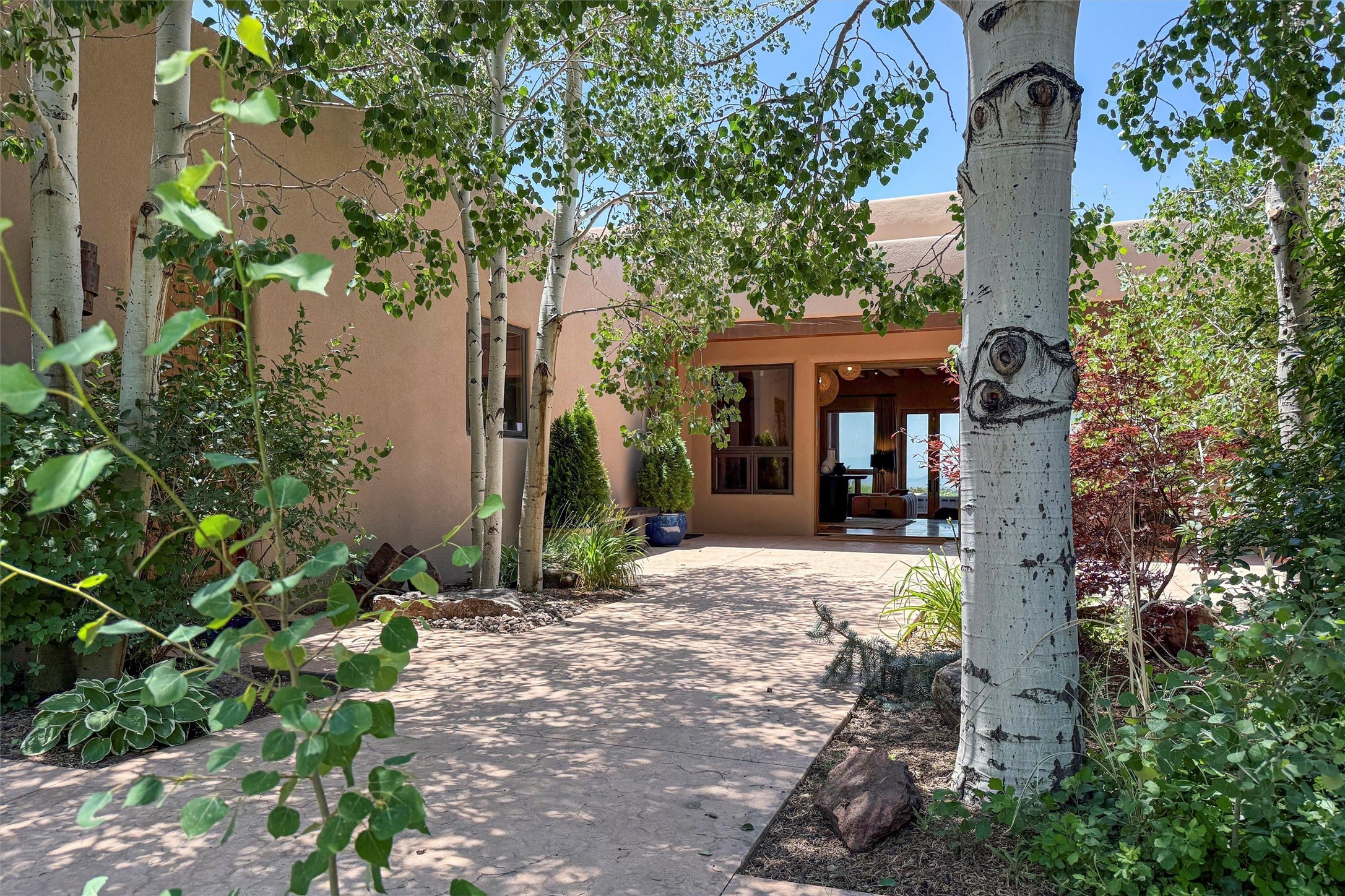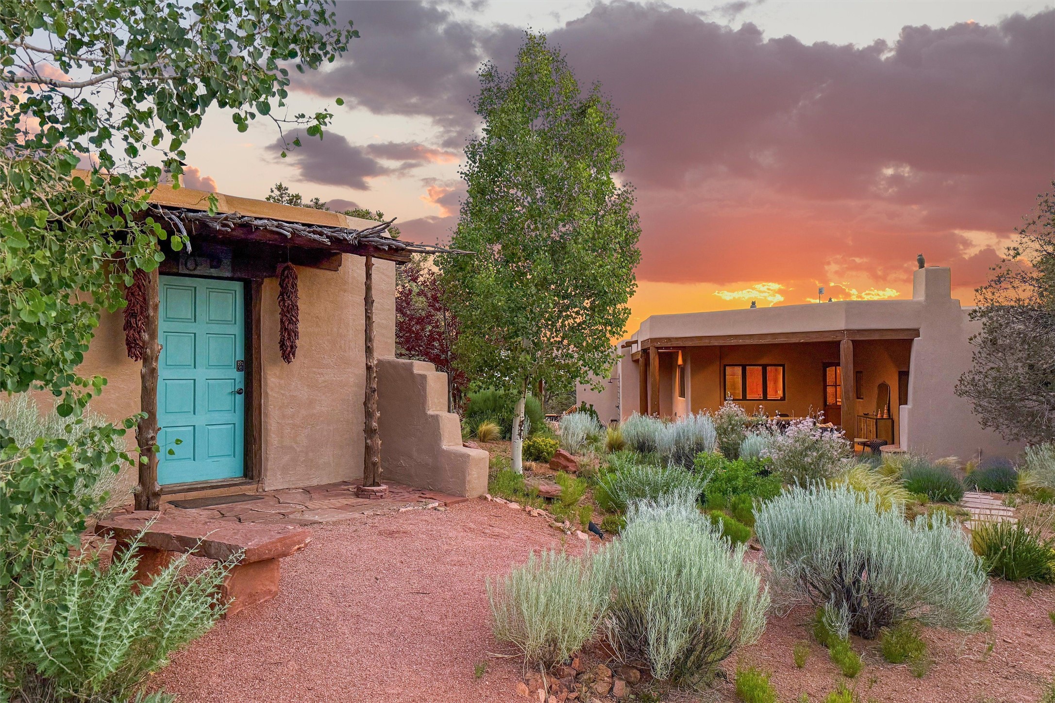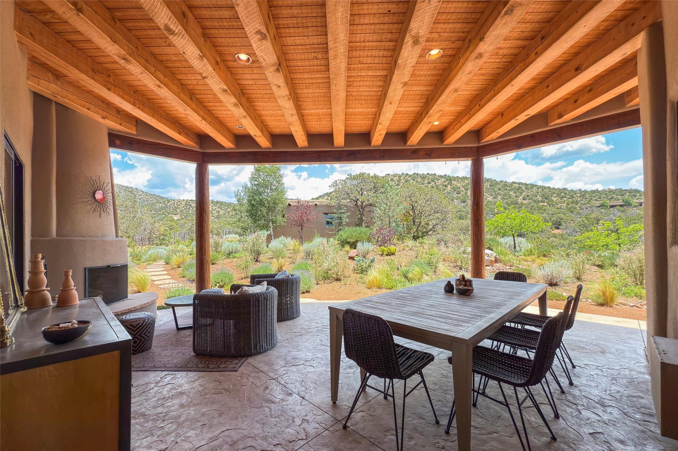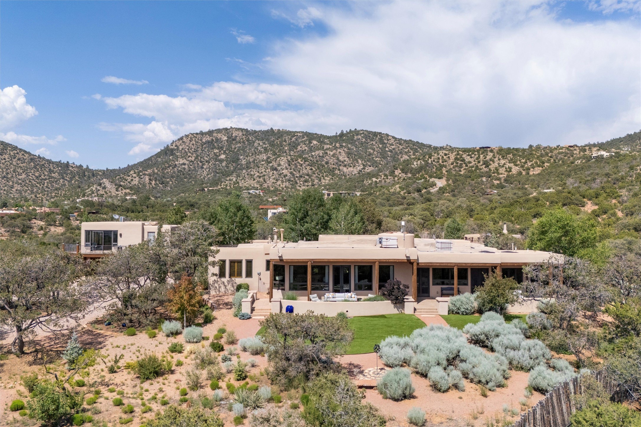 Embrace a lifestyle of sophistication and creativity in this stunning Northern New Mexico Compound that offers dramatic views of Sun and Moon Mountain. Situated on 2.5 acres, this special residence invites you to revel in the beauty of the surrounding landscape, with mountain vistas and city lights visible from indoor windows and the expansive 2,500 sq. ft. covered portal. A private quarter-mile walking path winds through the property, offering a tranquil way to connect with the land and enjoy the scenery. Gather around the outdoor kiva fireplace to enjoy views of the enchanting New Mexican nights. The property includes a main residence with two spacious bedrooms, a detached bedroom with a full bath, and a one-bedroom casita with a living area, kitchen, and full bath. In addition, there is a 100-year-old adobe studio. Inside the main house, the large great room is highlighted by soaring vigas and a striking, stacked stone fireplace that serves as the focal point. Culinary enthusiasts will delight in the generous gourmet kitchen, equipped with a central island and top-tier appliances. Retreat to the owner's suite, featuring another stacked stone fireplace, a jacuzzi tub, and an infrared sauna with an open-air cold plunge pool. The outside space is complete with a cedar tub, outdoor shower, and fire pit. Convenience and comfort are enhanced with a whole house generator. Recent upgrades include a new boiler system, water softener, modernized electrical, a new pantry system, custom California Closets and more. Fully fenced yard with drip irrigation is enhanced by the recent planting of over 30 trees. Located minutes from the Historic Santa Fe Plaza.