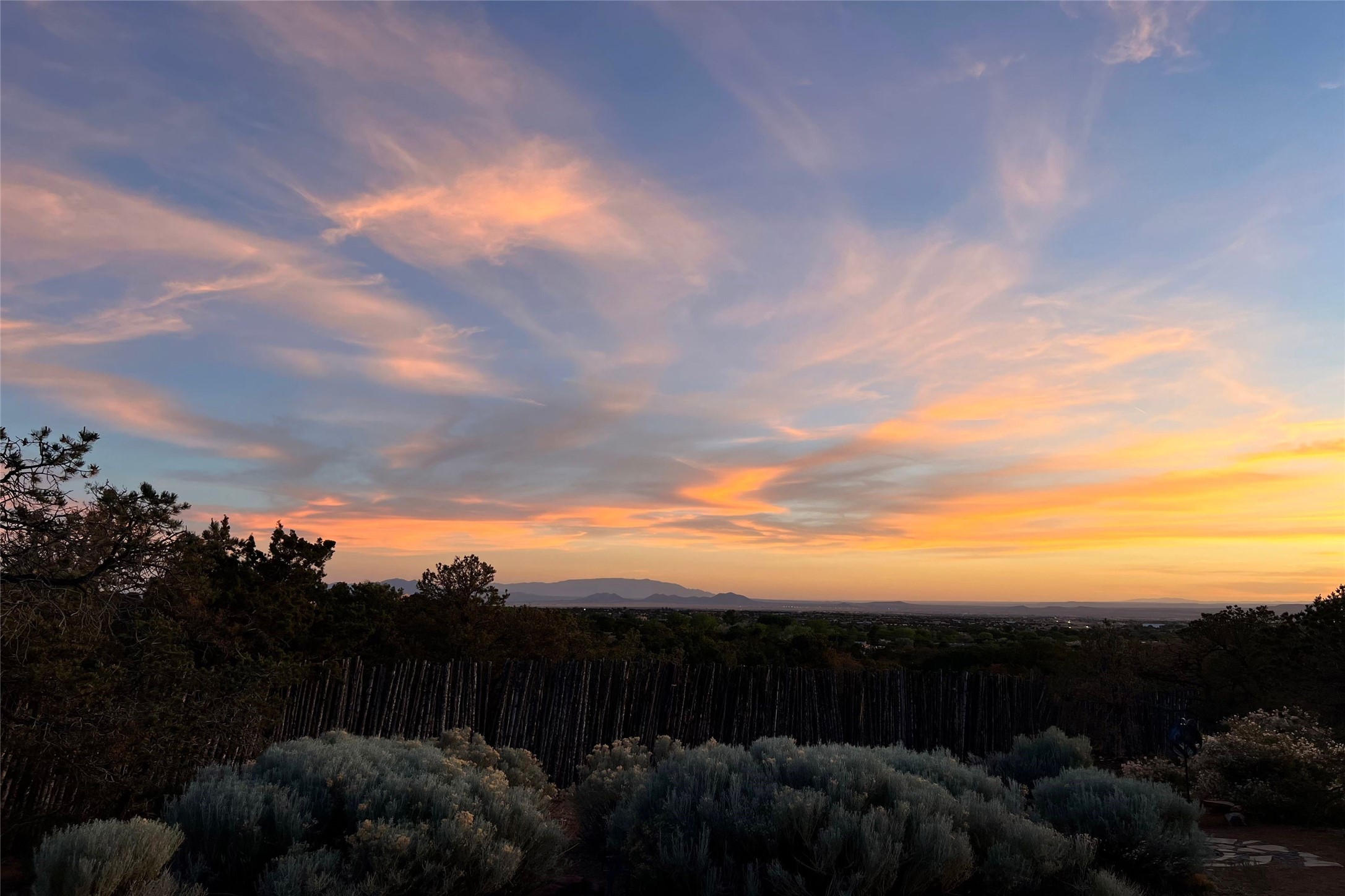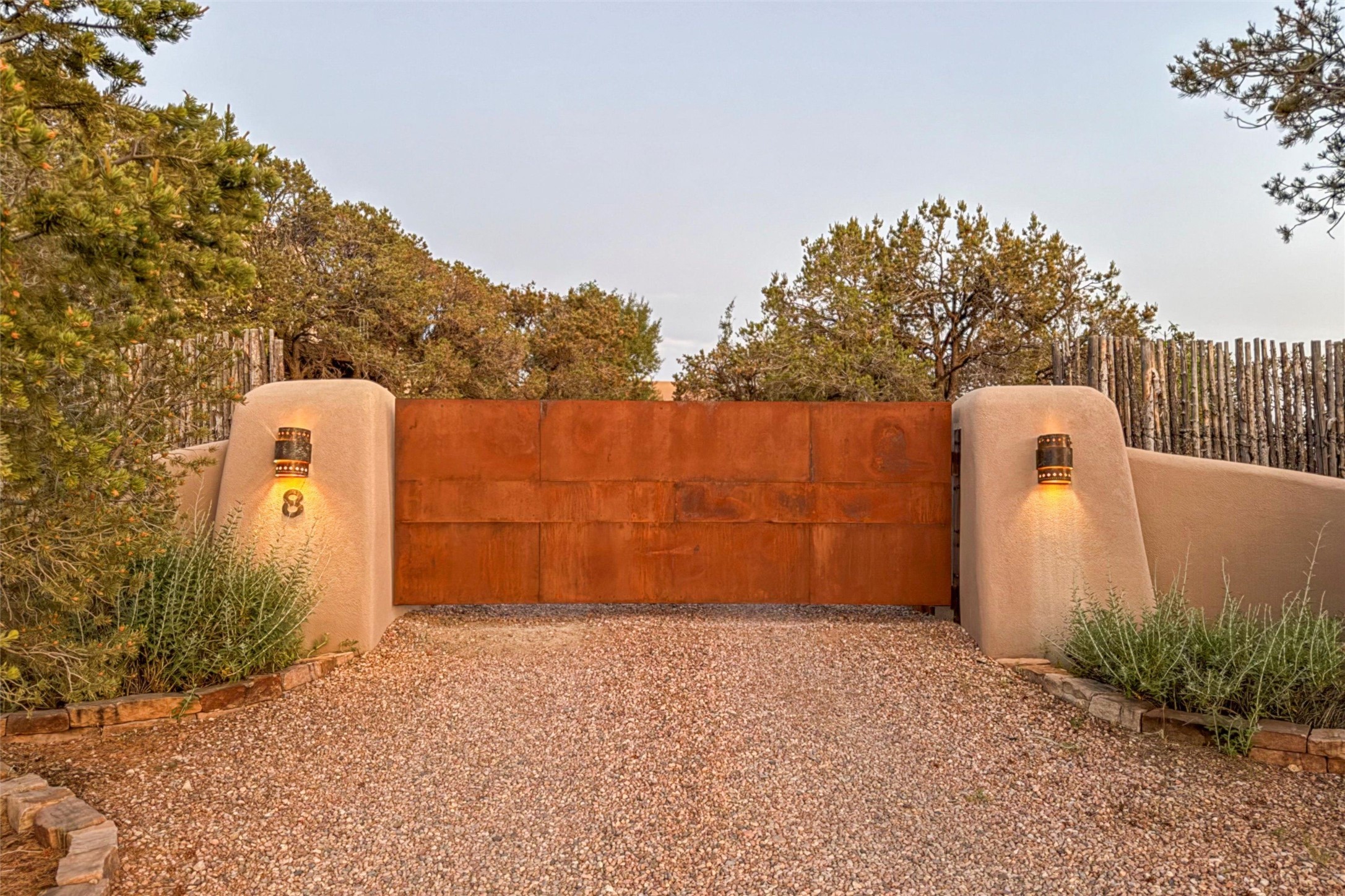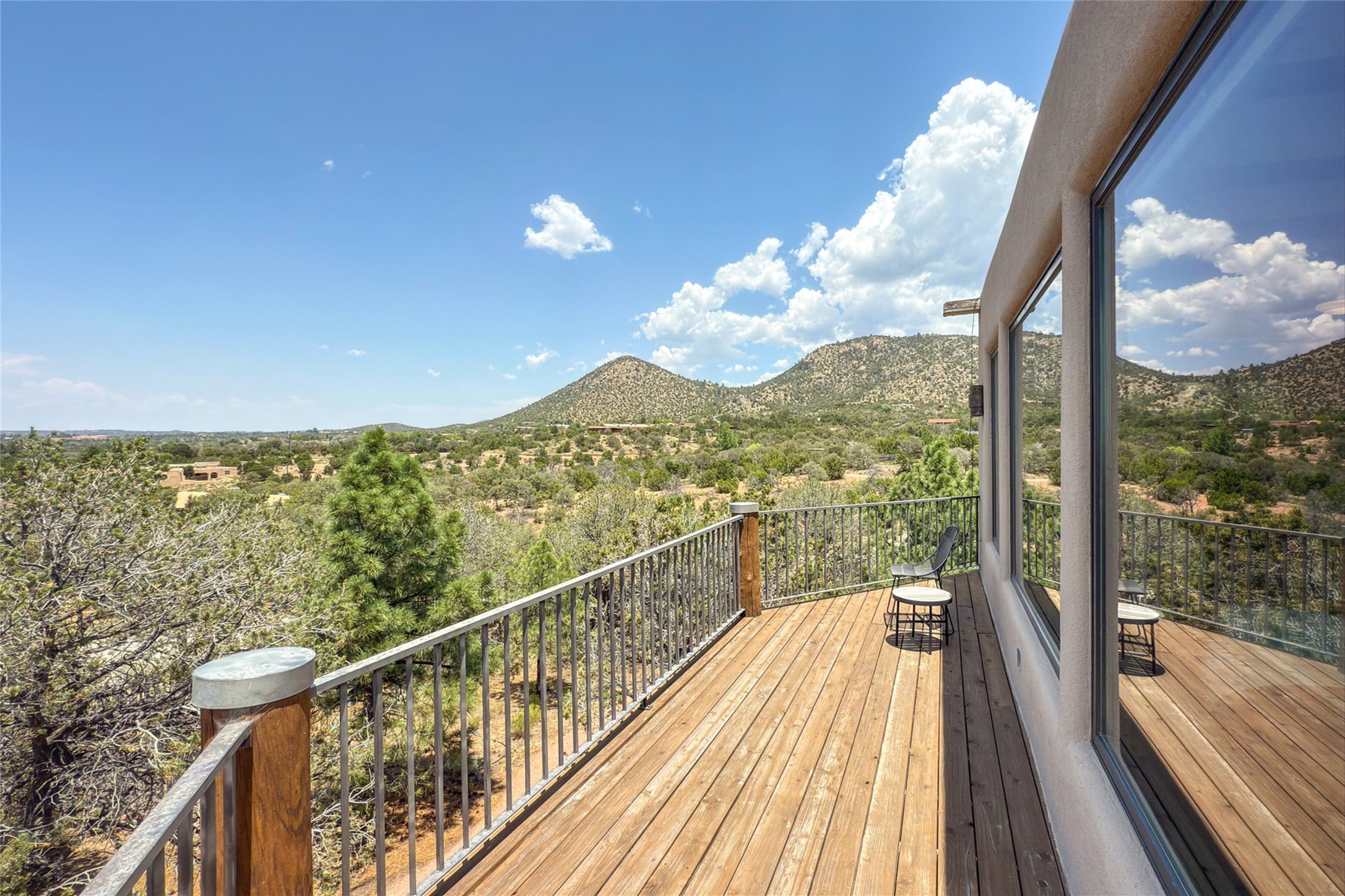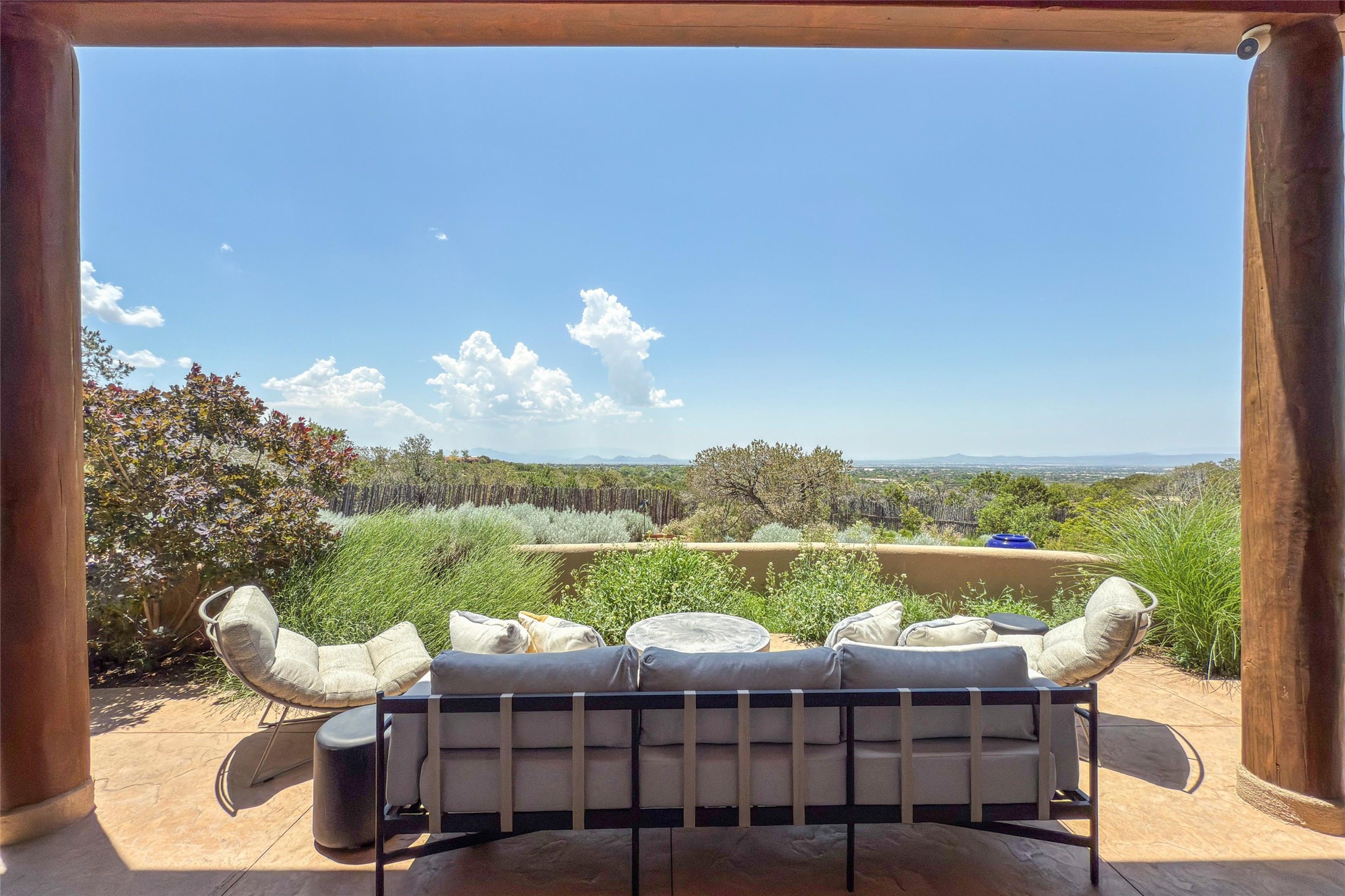Embrace a lifestyle of sophistication and creativity in this stunning Northern New Mexico Compound that offers dramatic views of Sun and Moon Mountain. Situated on 2.5 acres, this special residence invites you to revel in the beauty of the surrounding landscape, with mountain vistas and city lights visible from indoor windows and the expansive 2,500 sq. ft. covered portal. A private quarter-mile walking path winds through the property, offering a tranquil way to connect with the land and enjoy the scenery. Gather around the outdoor kiva fireplace to enjoy views of the enchanting New Mexican nights. The property includes a main residence with two spacious bedrooms, a detached bedroom with a full bath, and a one-bedroom casita with a living area, kitchen, and full bath. In addition, there is a 100-year-old adobe studio. Inside the main house, the large great room is highlighted by soaring vigas and a striking, stacked stone fireplace that serves as the focal point. Culinary enthusiasts will delight in the generous gourmet kitchen, equipped with a central island and top-tier appliances. Retreat to the owner's suite, featuring another stacked stone fireplace, a jacuzzi tub, and an infrared sauna with an open-air cold plunge pool. The outside space is complete with a cedar tub, outdoor shower, and fire pit. Convenience and comfort are enhanced with a whole house generator. Recent upgrades include a new boiler system, water softener, modernized electrical, a new pantry system, custom California Closets and more. Fully fenced yard with drip irrigation is enhanced by the recent planting of over 30 trees. Located minutes from the Historic Santa Fe Plaza.