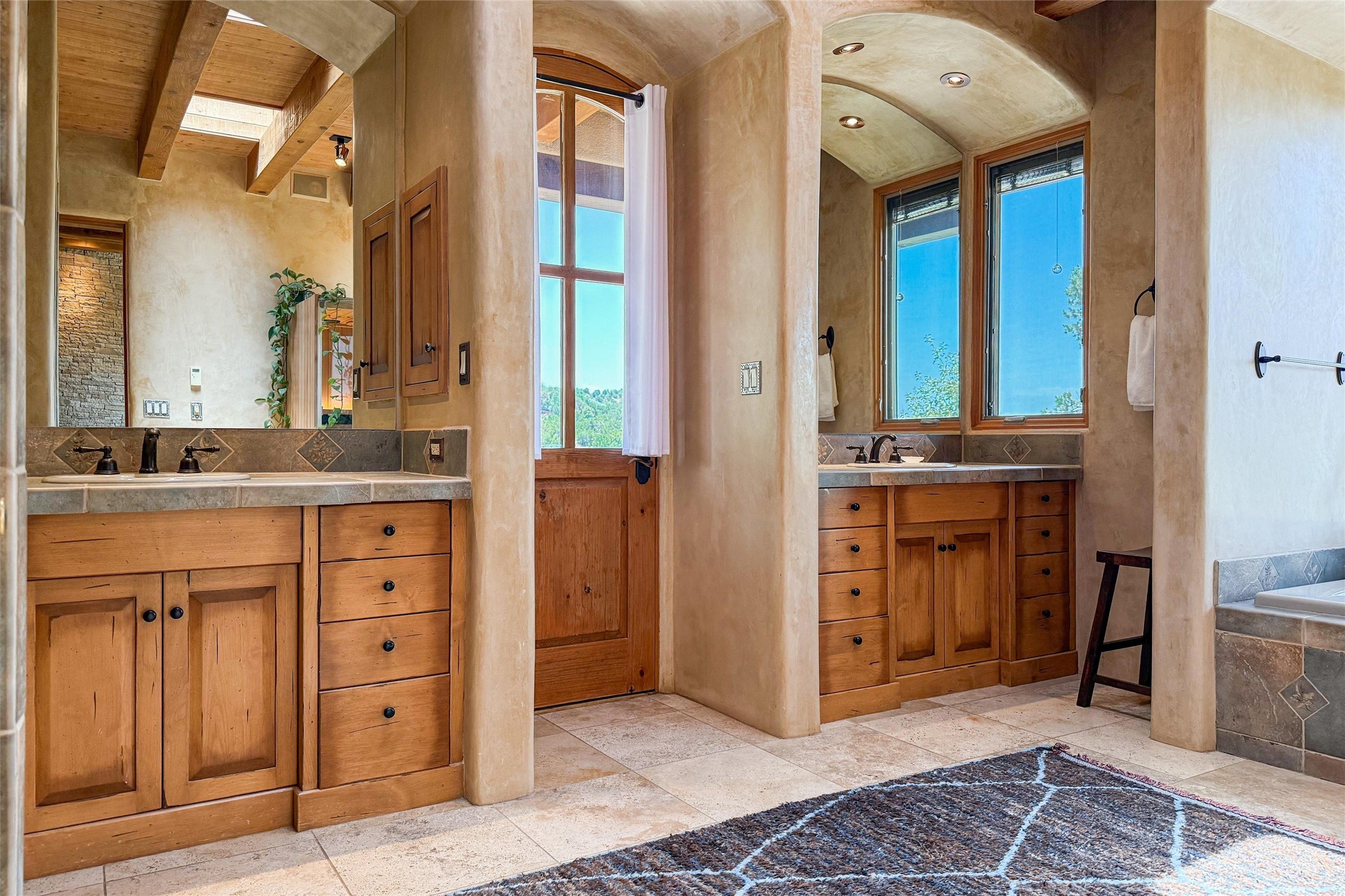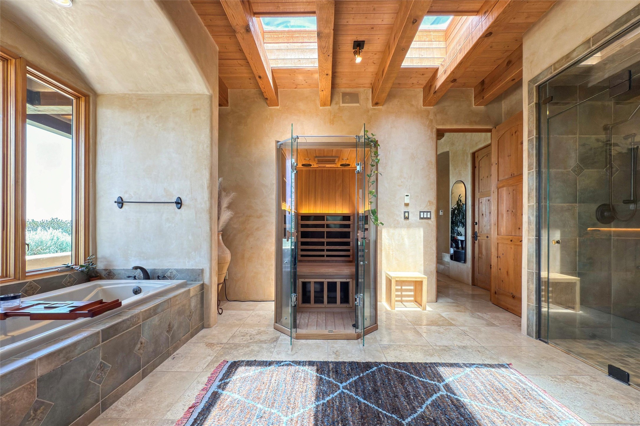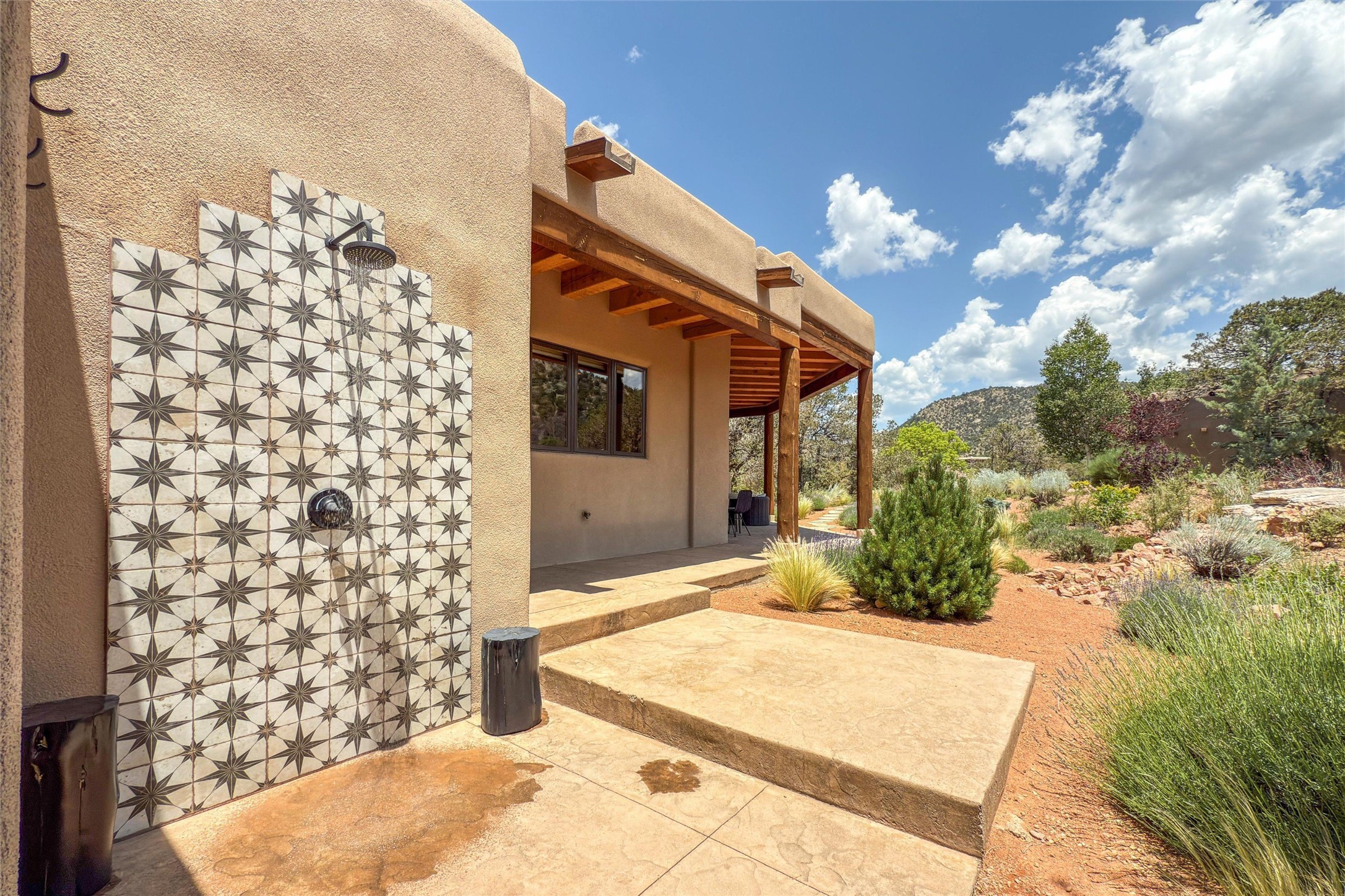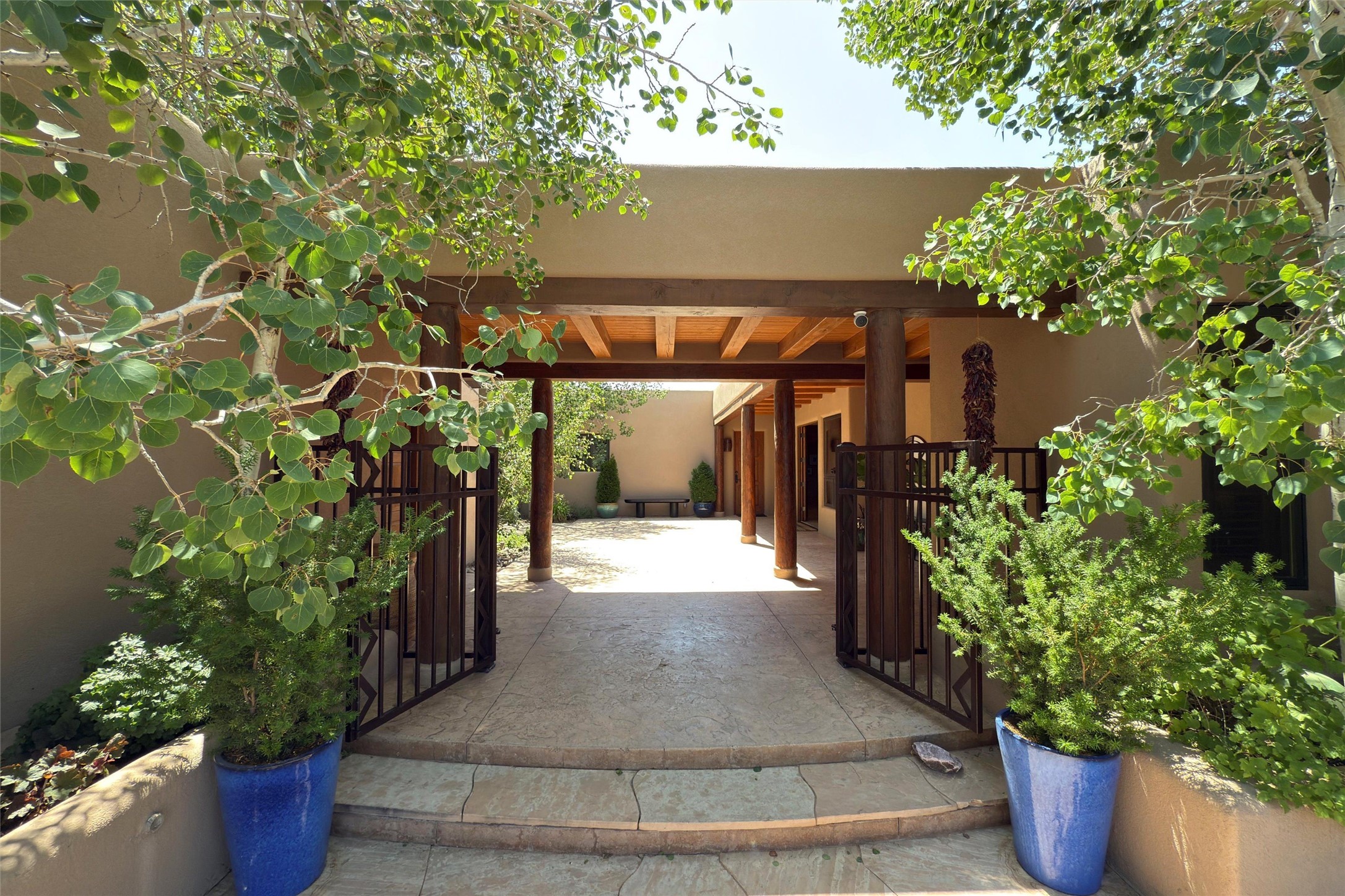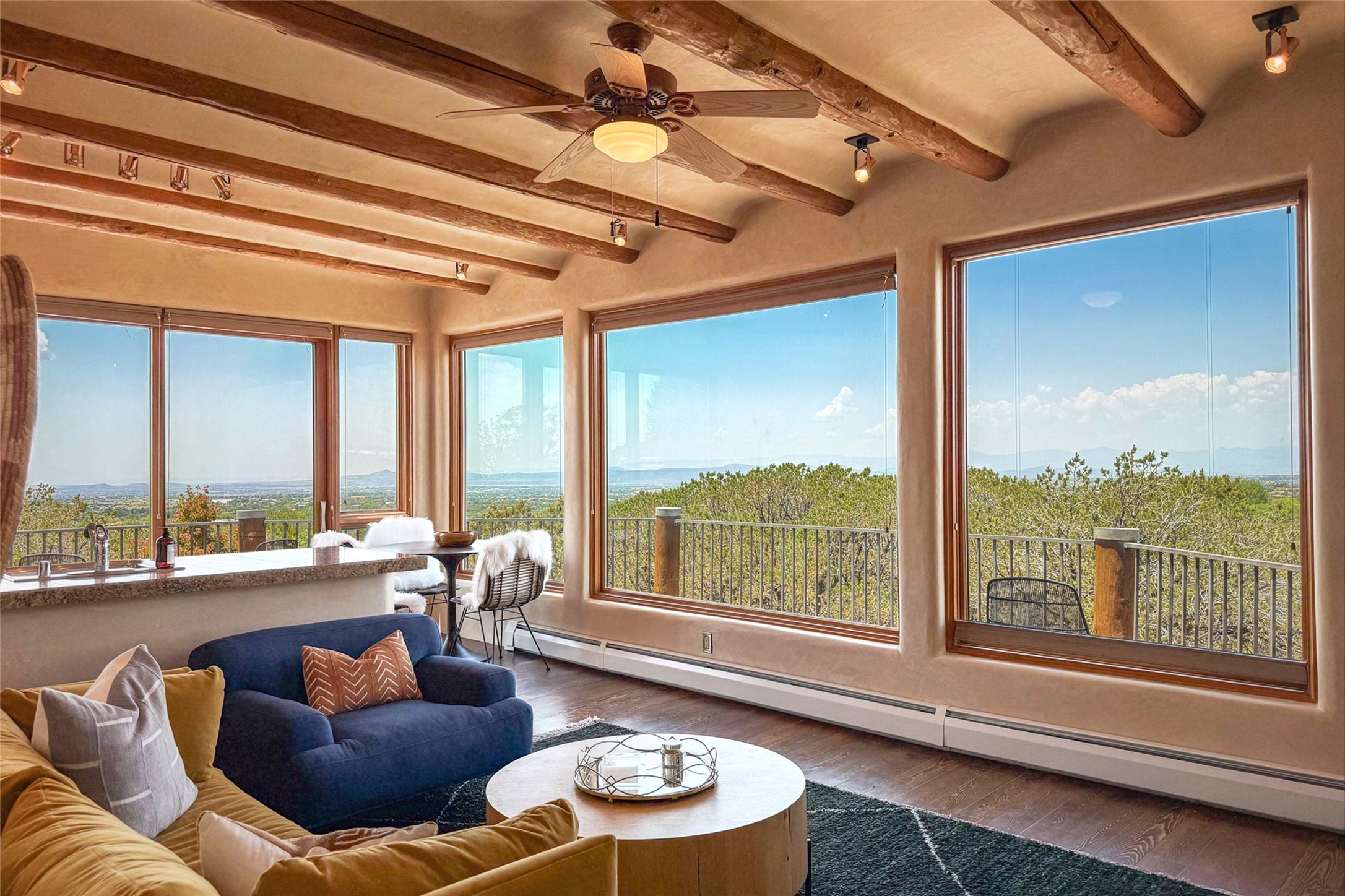 Embrace a lifestyle of sophistication and creativity in this stunning Northern New Mexico Compound that offers dramatic views of Sun and Moon Mountain. Situated on 2.5 acres, this special residence invites you to revel in the beauty of the surrounding landscape, with mountain vistas and city lights visible from indoor windows and the expansive 2,500 sq. ft. covered portal. A private quarter-mile walking path winds through the property, offering a tranquil way to connect with the land and enjoy the scenery. Gather around the outdoor kiva fireplace to enjoy views of the enchanting New Mexican nights. The property includes a main residence with two spacious bedrooms, a detached bedroom with a full bath, and a one-bedroom casita with a living area, kitchen, and full bath. In addition, there is a 100-year-old adobe studio. Inside the main house, the large great room is highlighted by soaring vigas and a striking, stacked stone fireplace that serves as the focal point. Culinary enthusiasts will delight in the generous gourmet kitchen, equipped with a central island and top-tier appliances. Retreat to the owner's suite, featuring another stacked stone fireplace, a jacuzzi tub, and an infrared sauna with an open-air cold plunge pool. The outside space is complete with a cedar tub, outdoor shower, and fire pit. Convenience and comfort are enhanced with a whole house generator. Recent upgrades include a new boiler system, water softener, modernized electrical, a new pantry system, custom California Closets and more. Fully fenced yard with drip irrigation is enhanced by the recent planting of over 30 trees. Located minutes from the Historic Santa Fe Plaza.