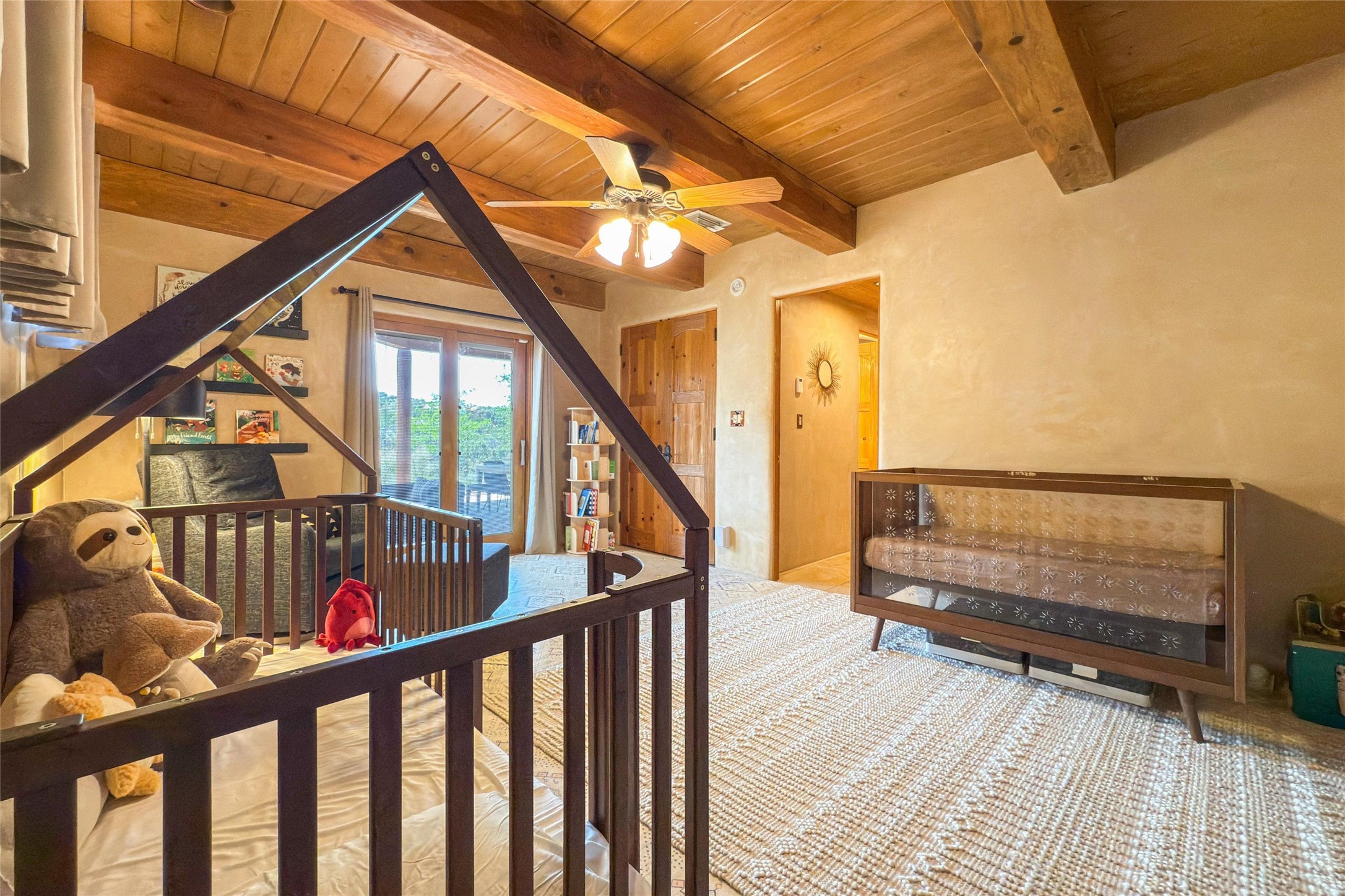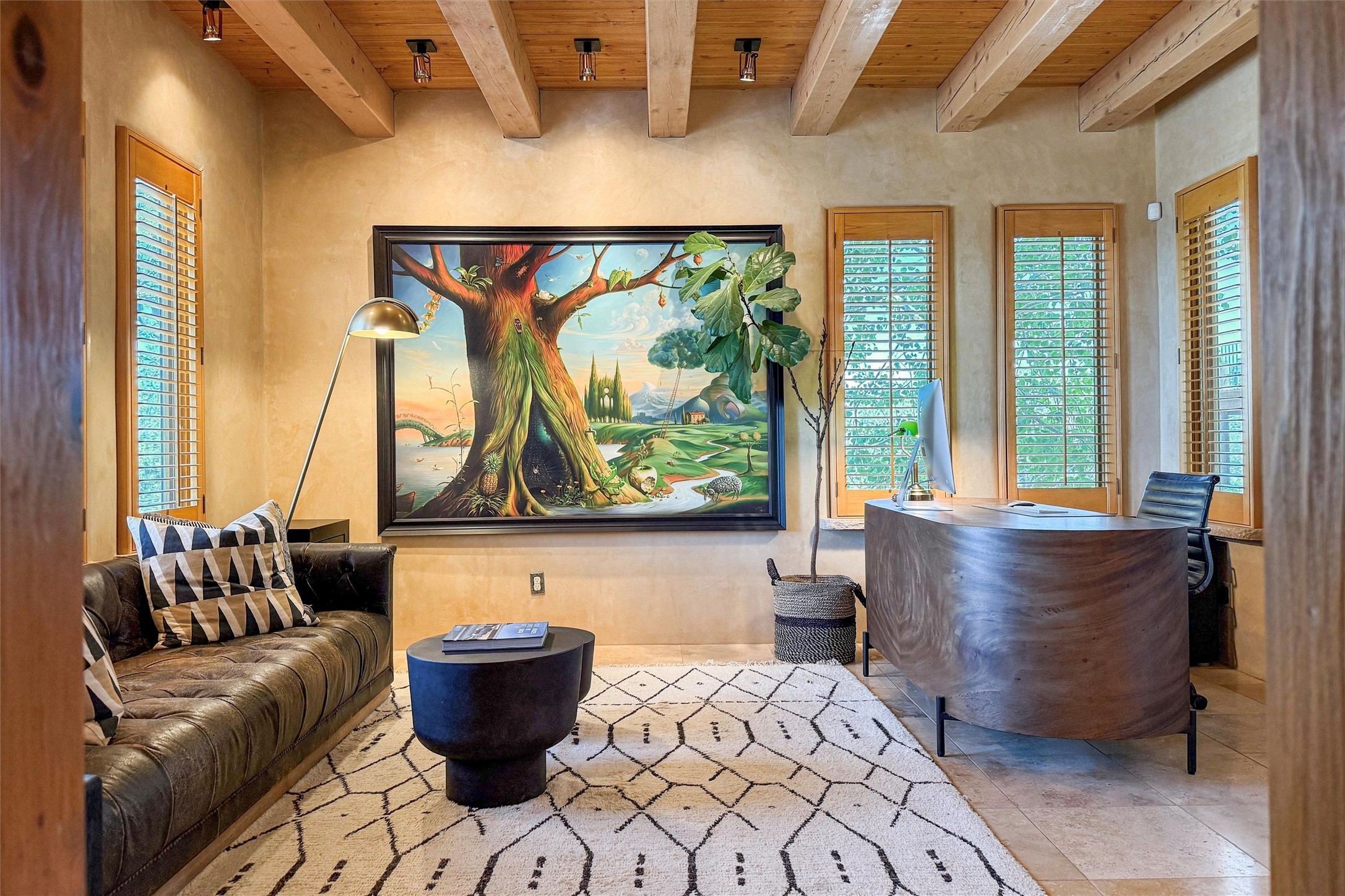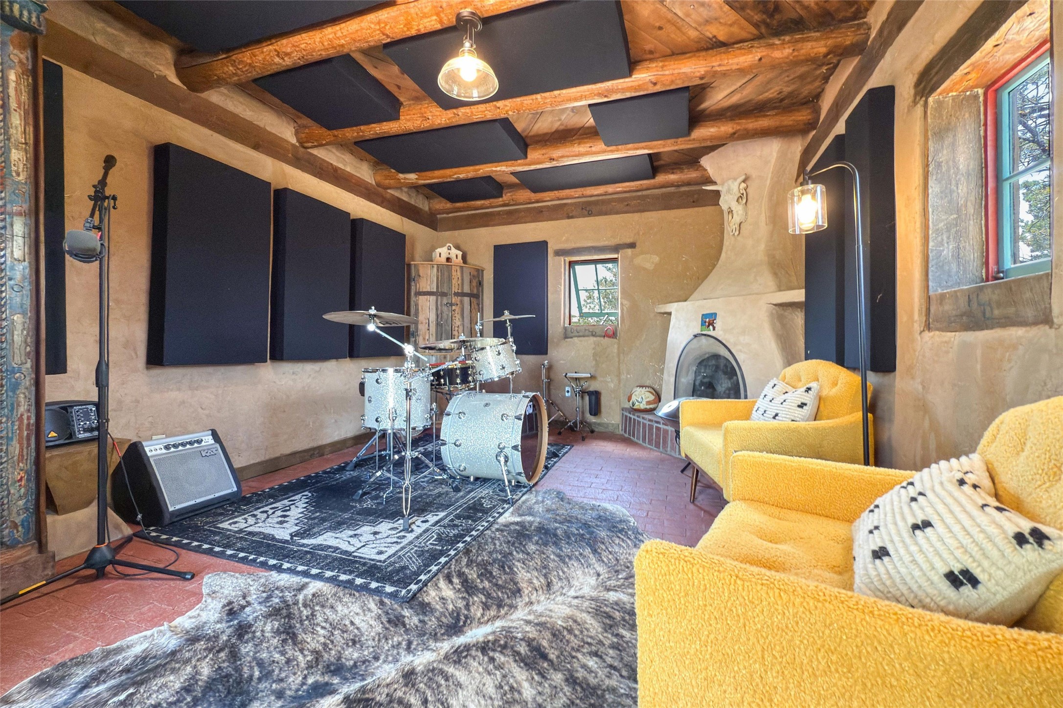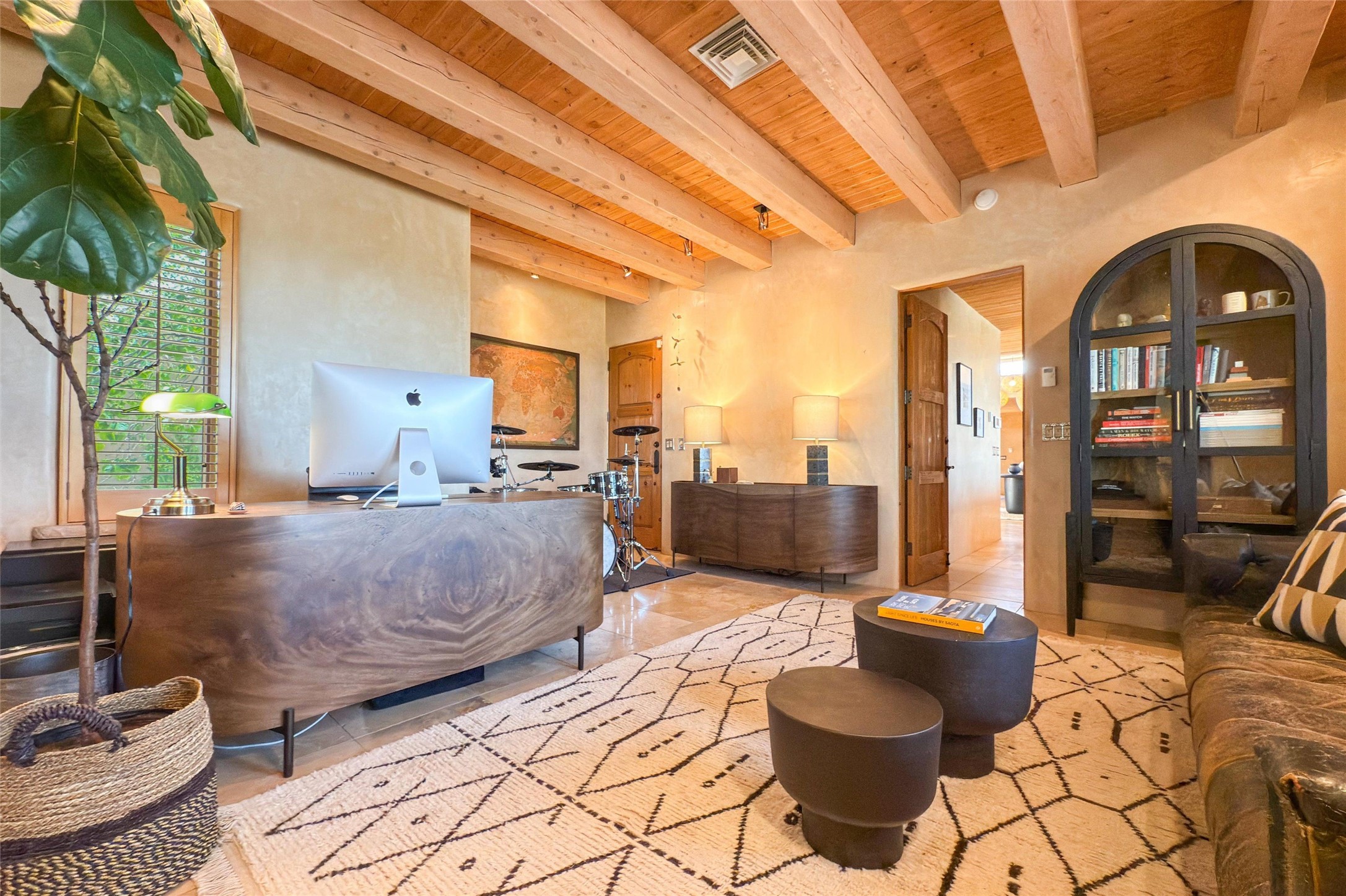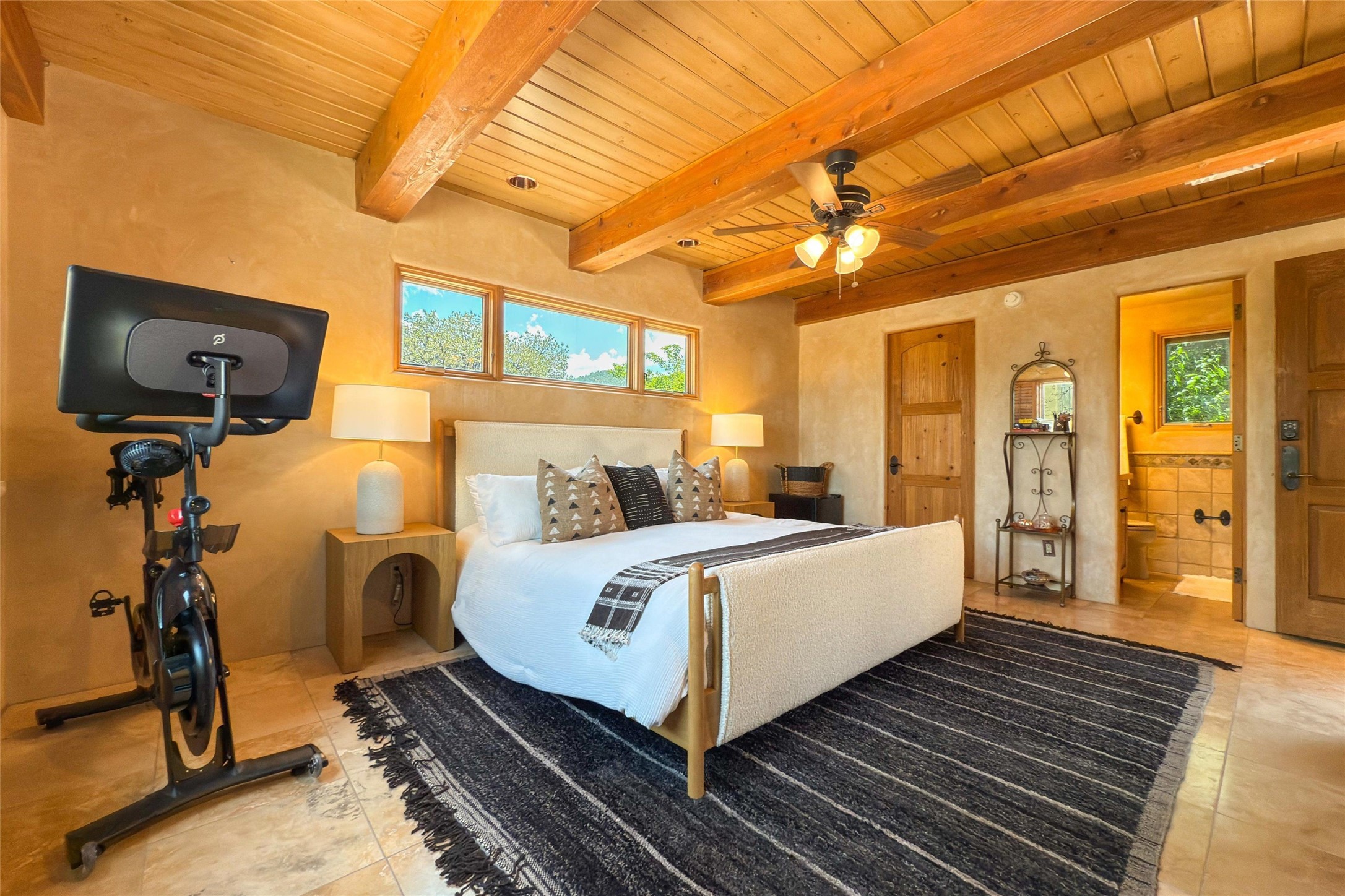 Embrace a lifestyle of sophistication and creativity in this stunning Northern New Mexico Compound that offers dramatic views of Sun and Moon Mountain. Situated on 2.5 acres, this special residence invites you to revel in the beauty of the surrounding landscape, with mountain vistas and city lights visible from indoor windows and the expansive 2,500 sq. ft. covered portal. A private quarter-mile walking path winds through the property, offering a tranquil way to connect with the land and enjoy the scenery. Gather around the outdoor kiva fireplace to enjoy views of the enchanting New Mexican nights. The property includes a main residence with two spacious bedrooms, a detached bedroom with a full bath, and a one-bedroom casita with a living area, kitchen, and full bath. In addition, there is a 100-year-old adobe studio. Inside the main house, the large great room is highlighted by soaring vigas and a striking, stacked stone fireplace that serves as the focal point. Culinary enthusiasts will delight in the generous gourmet kitchen, equipped with a central island and top-tier appliances. Retreat to the owner's suite, featuring another stacked stone fireplace, a jacuzzi tub, and an infrared sauna with an open-air cold plunge pool. The outside space is complete with a cedar tub, outdoor shower, and fire pit. Convenience and comfort are enhanced with a whole house generator. Recent upgrades include a new boiler system, water softener, modernized electrical, a new pantry system, custom California Closets and more. Fully fenced yard with drip irrigation is enhanced by the recent planting of over 30 trees. Located minutes from the Historic Santa Fe Plaza.