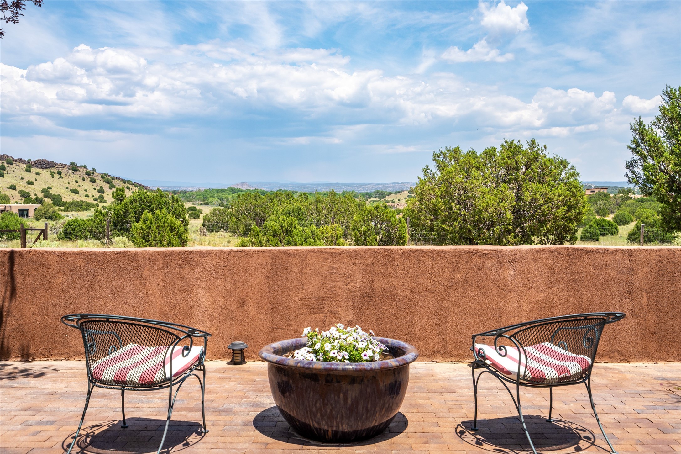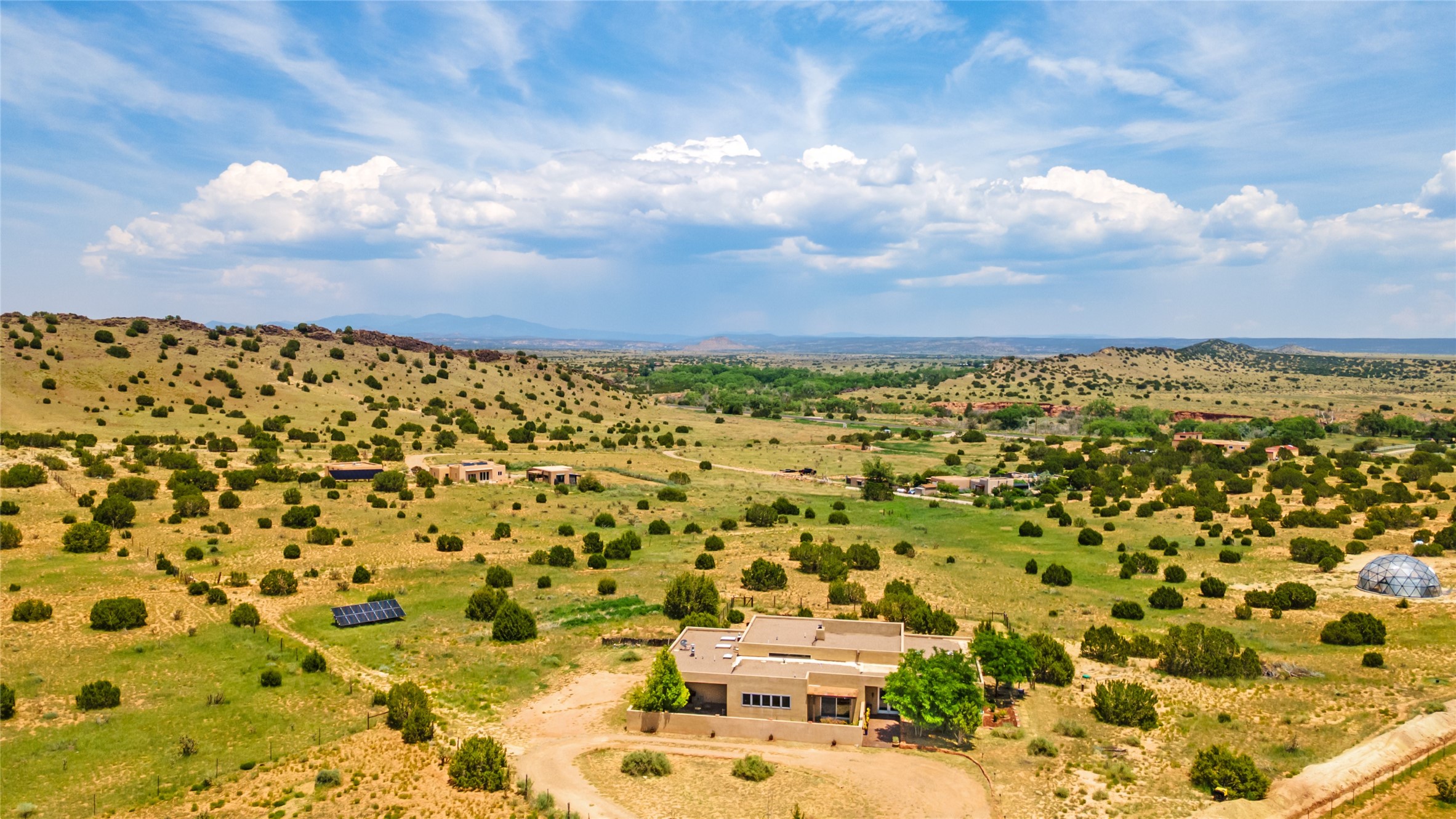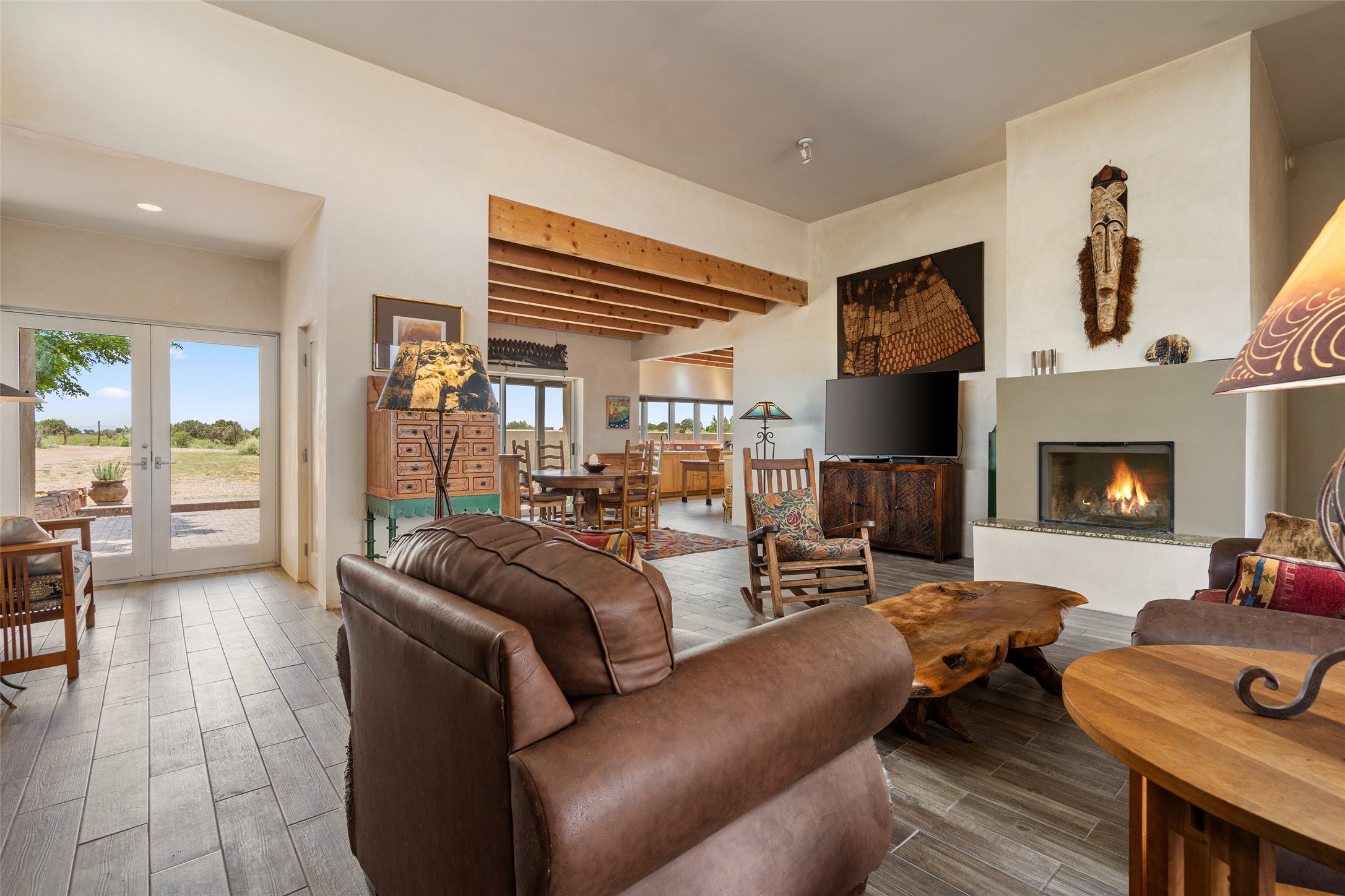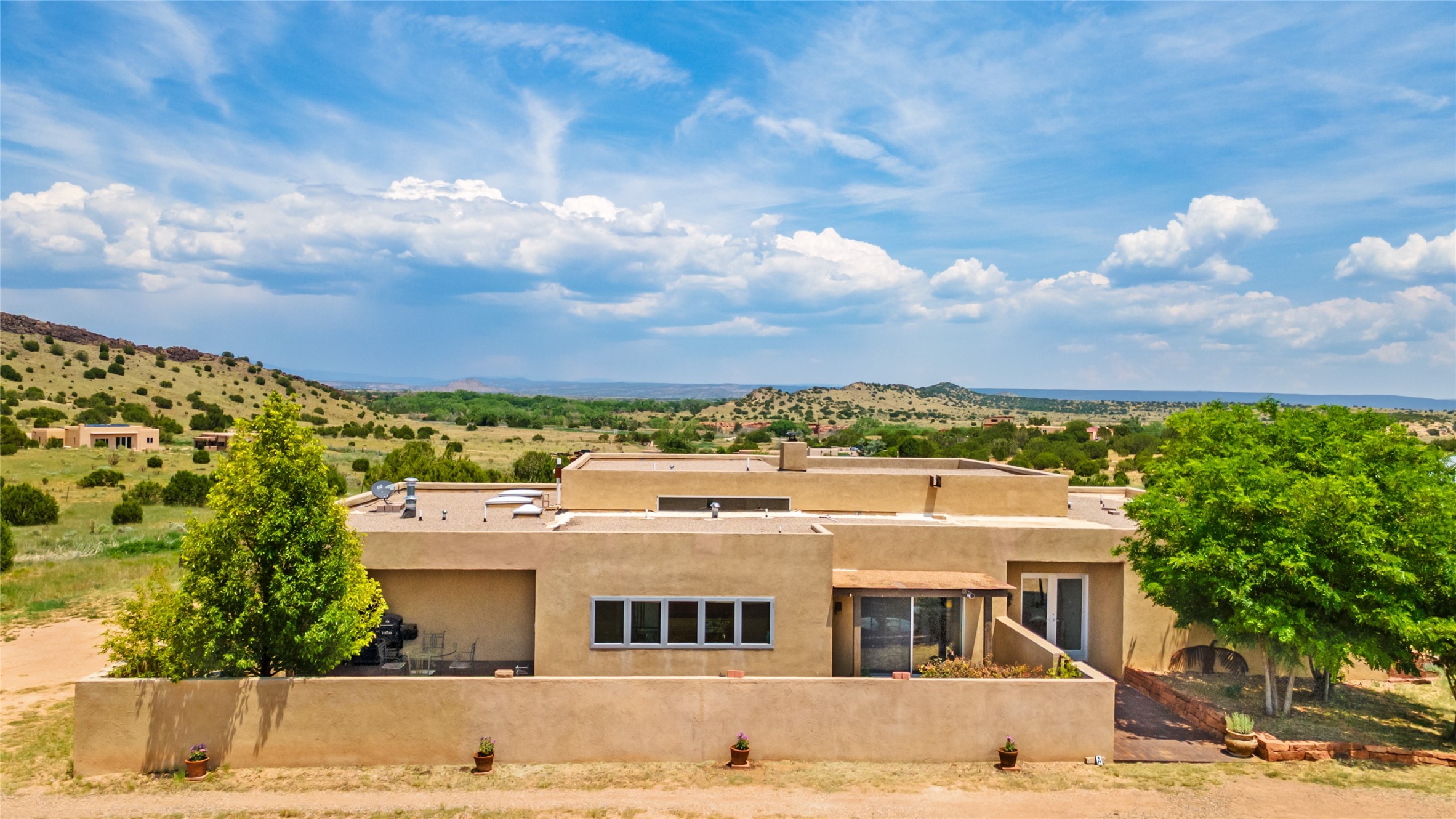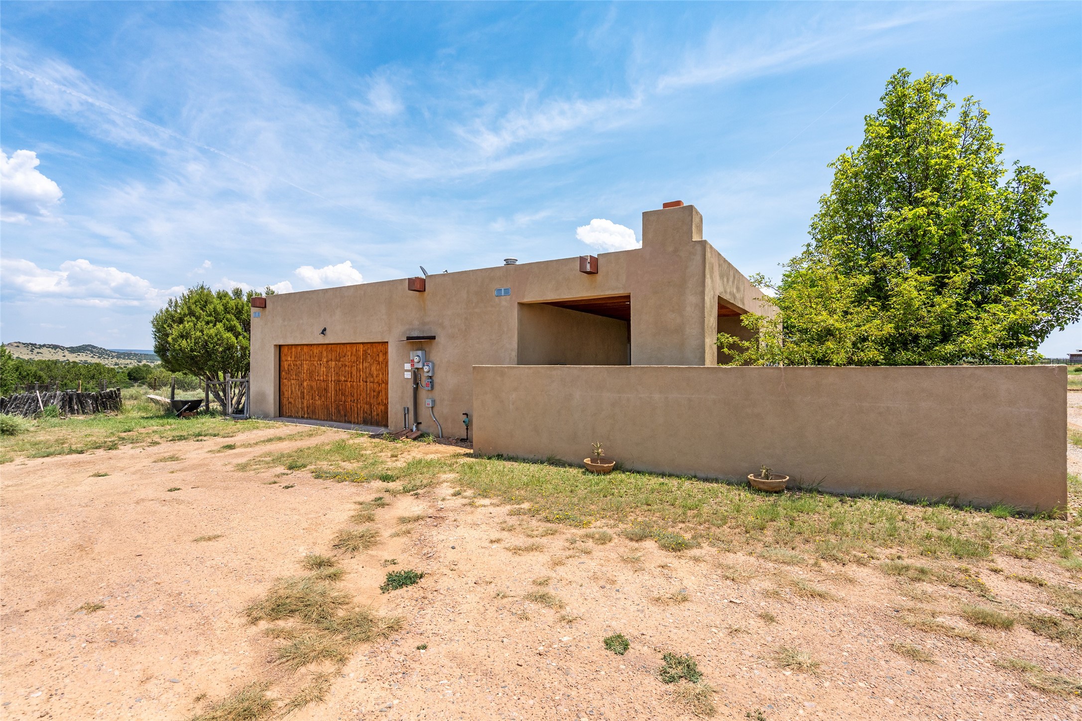 Is Galisteo calling you? Here is a contemporary styled 3 bed, 3 bath home, intelligently designed and well built by EJ Jennings, offering the best of Galisteo: beautiful natural surroundings, panoramic vistas, big skies, solitude and quiet, all a mere 30 minute drive from Santa Fe.Approach a private, walled garden space leading to a wide entryway to the home. The spacious living room glows with natural light and leads the eye to the knockout views, which set this home apart, of Hogback Ridge and the Galisteo Basin! The living room sets the tone for the substantive size and balance of the home's rooms. The open flow from living room to dining room and kitchen allows for both ease of entertainment and an intimate quality of life. Soak up sunsets and dine al fresco on the generous portal off the kitchen which features an outdoor built-in fireplace.The split floor plan offers privacy and serenity, with the primary bedroom suite separated from the two guest bedrooms. One guest bedroom includes an en suite full bath, the other, with gorgeous views, makes an excellent flex space for artists, remote workers and hobbyists. The sustainably minded will appreciate the solar array. With fine features including beamed ceilings in the dining area and kitchen, tile flooring throughout, fresh paint, and plentiful windows all with window treatments, this Galisteo home is ready to receive you!