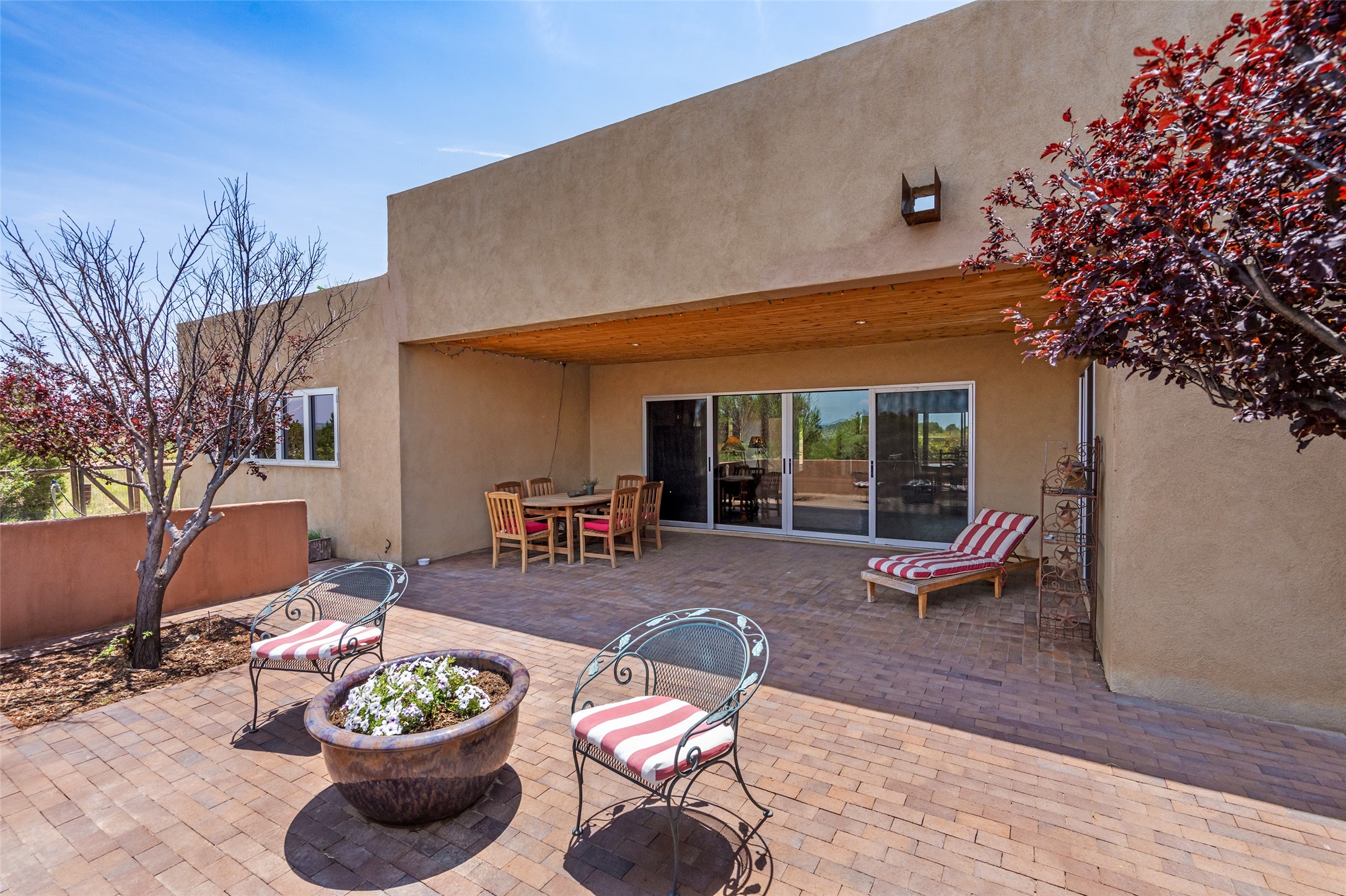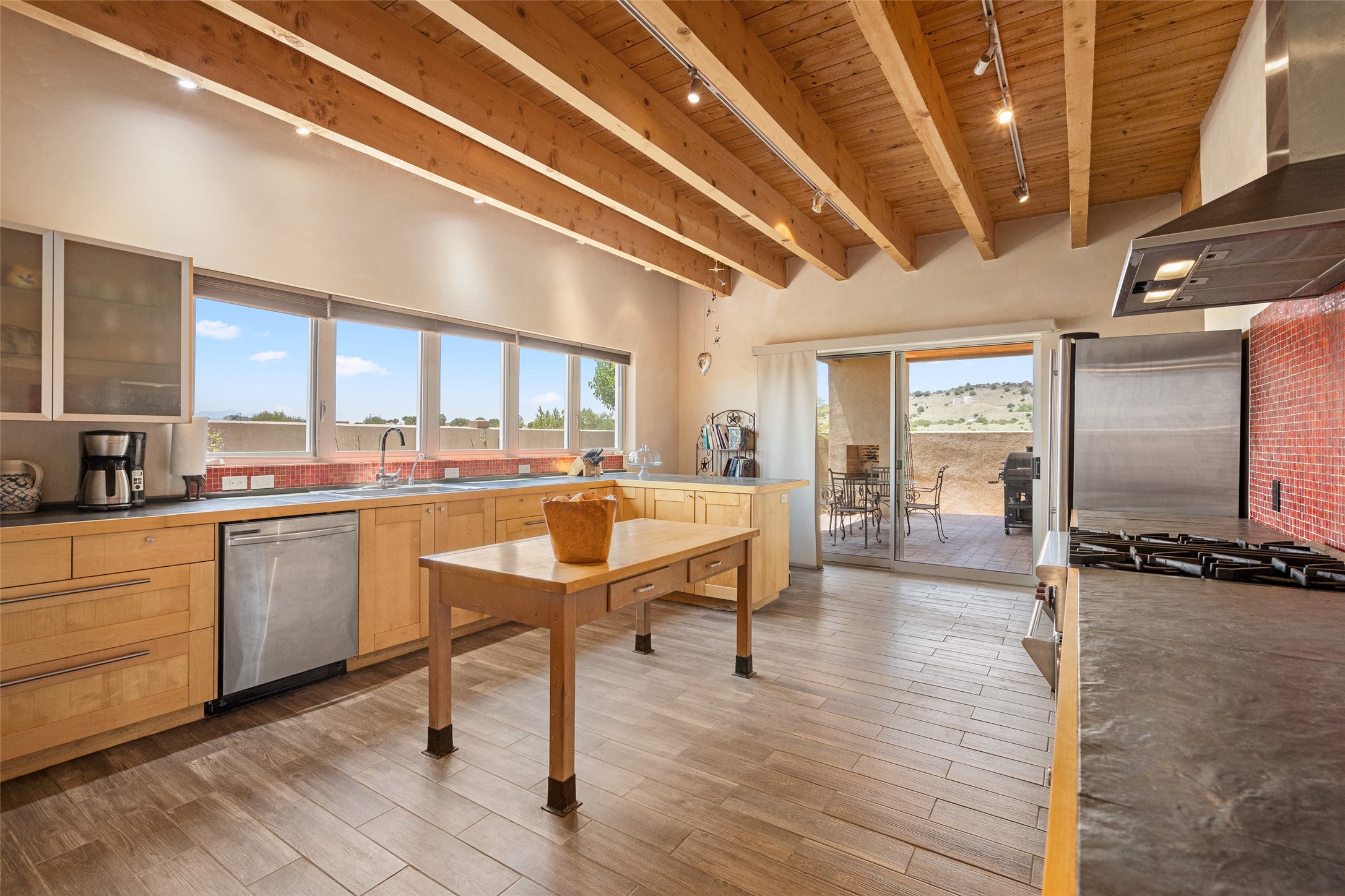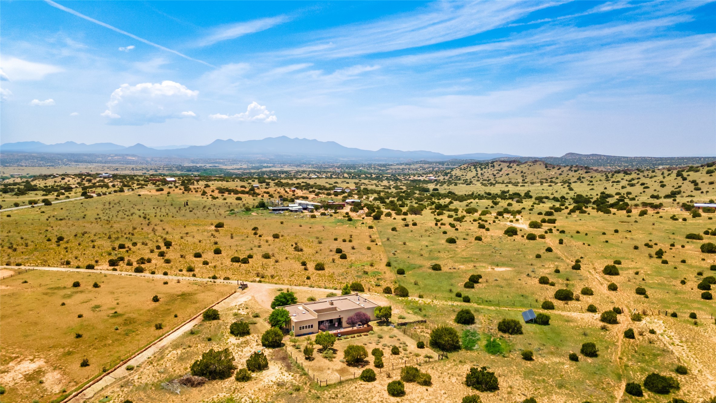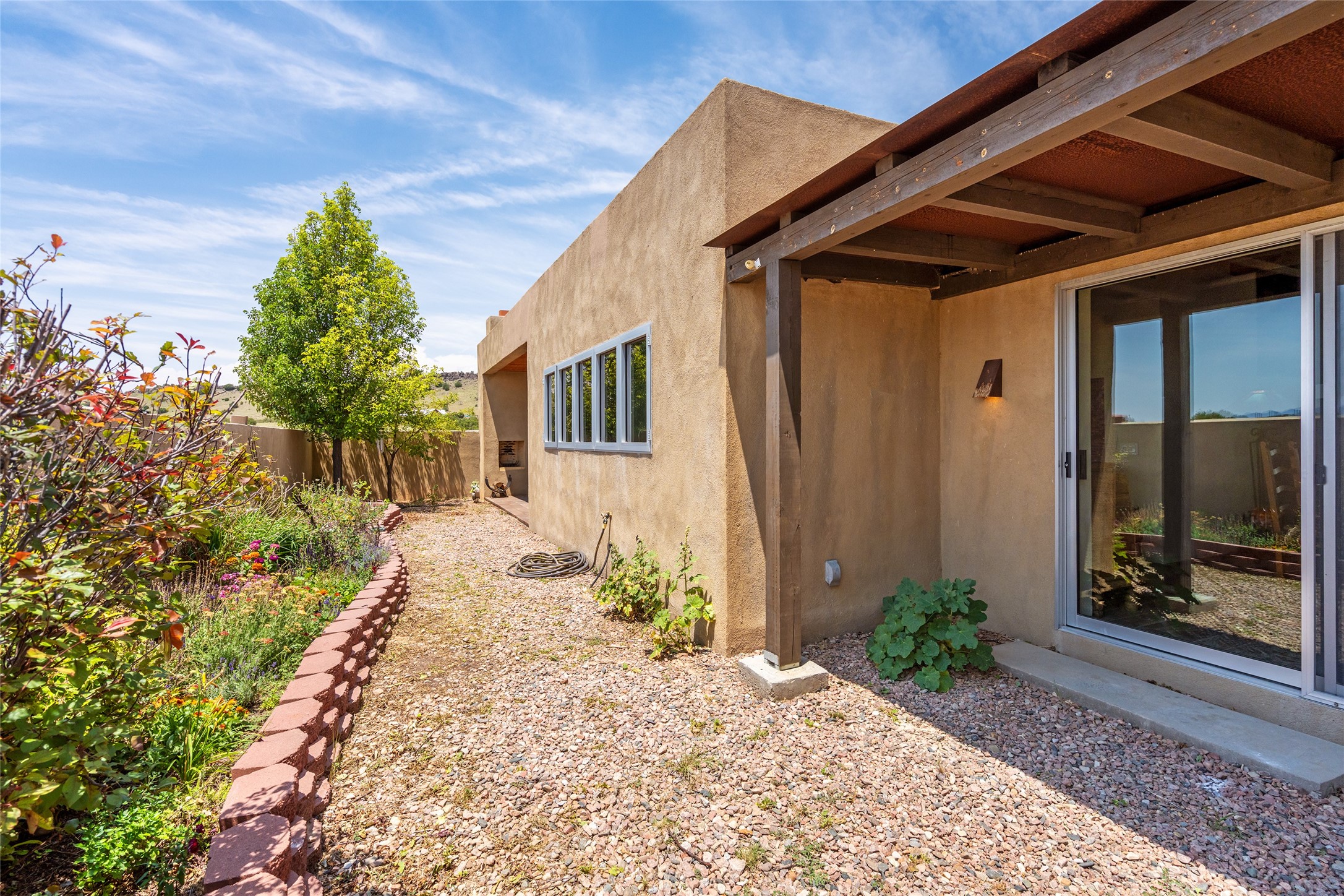 Is Galisteo calling you? Here is a contemporary styled 3 bed, 3 bath home, intelligently designed and well built by EJ Jennings, offering the best of Galisteo: beautiful natural surroundings, panoramic vistas, big skies, solitude and quiet, all a mere 30 minute drive from Santa Fe.Approach a private, walled garden space leading to a wide entryway to the home. The spacious living room glows with natural light and leads the eye to the knockout views, which set this home apart, of Hogback Ridge and the Galisteo Basin! The living room sets the tone for the substantive size and balance of the home's rooms. The open flow from living room to dining room and kitchen allows for both ease of entertainment and an intimate quality of life. Soak up sunsets and dine al fresco on the generous portal off the kitchen which features an outdoor built-in fireplace.The split floor plan offers privacy and serenity, with the primary bedroom suite separated from the two guest bedrooms. One guest bedroom includes an en suite full bath, the other, with gorgeous views, makes an excellent flex space for artists, remote workers and hobbyists. The sustainably minded will appreciate the solar array. With fine features including beamed ceilings in the dining area and kitchen, tile flooring throughout, fresh paint, and plentiful windows all with window treatments, this Galisteo home is ready to receive you!