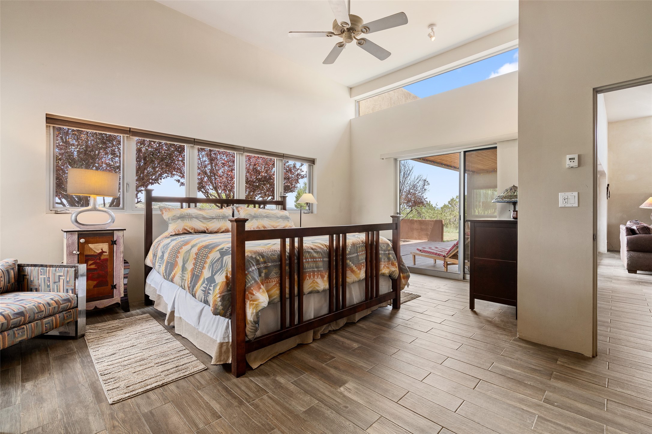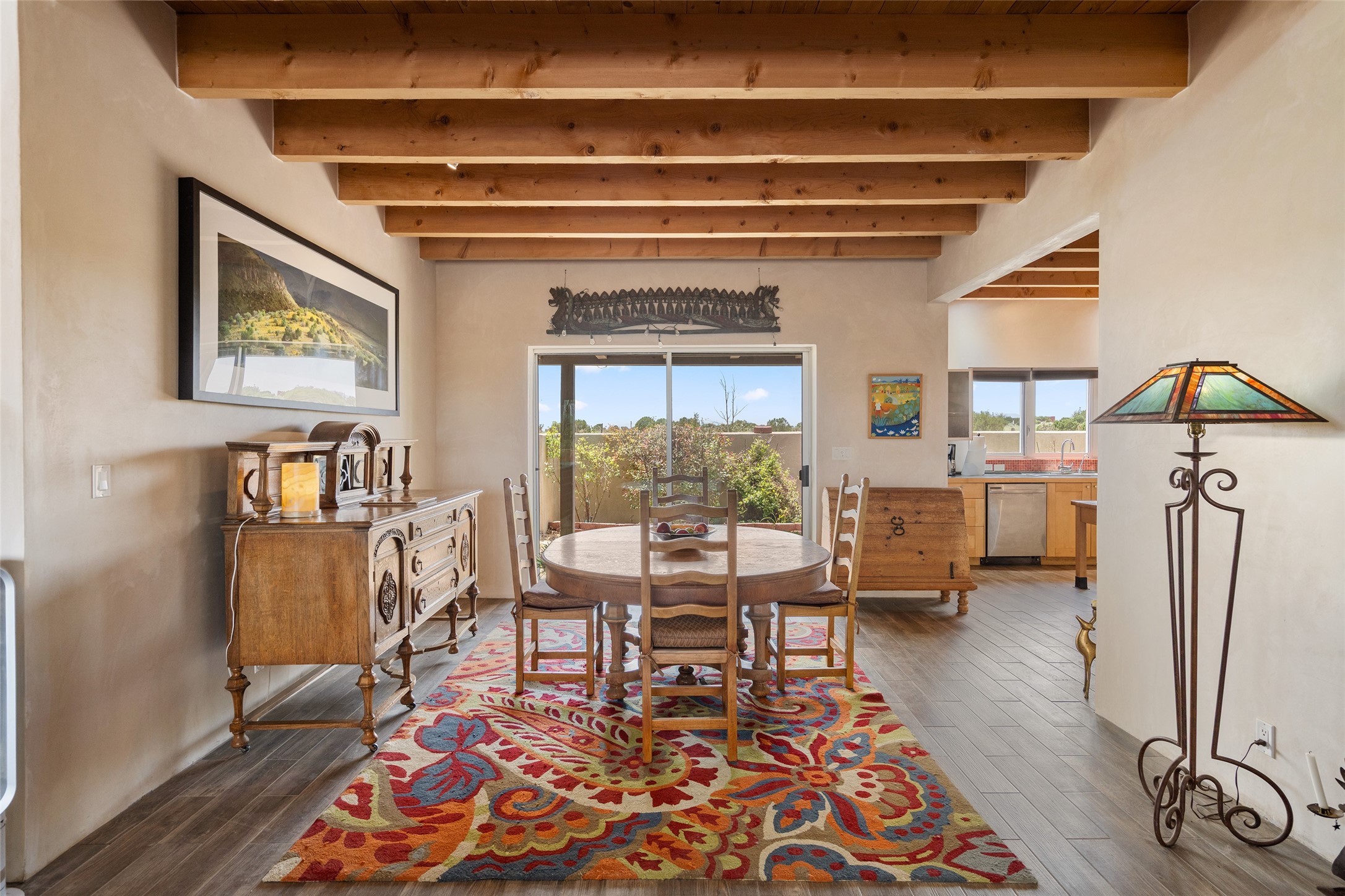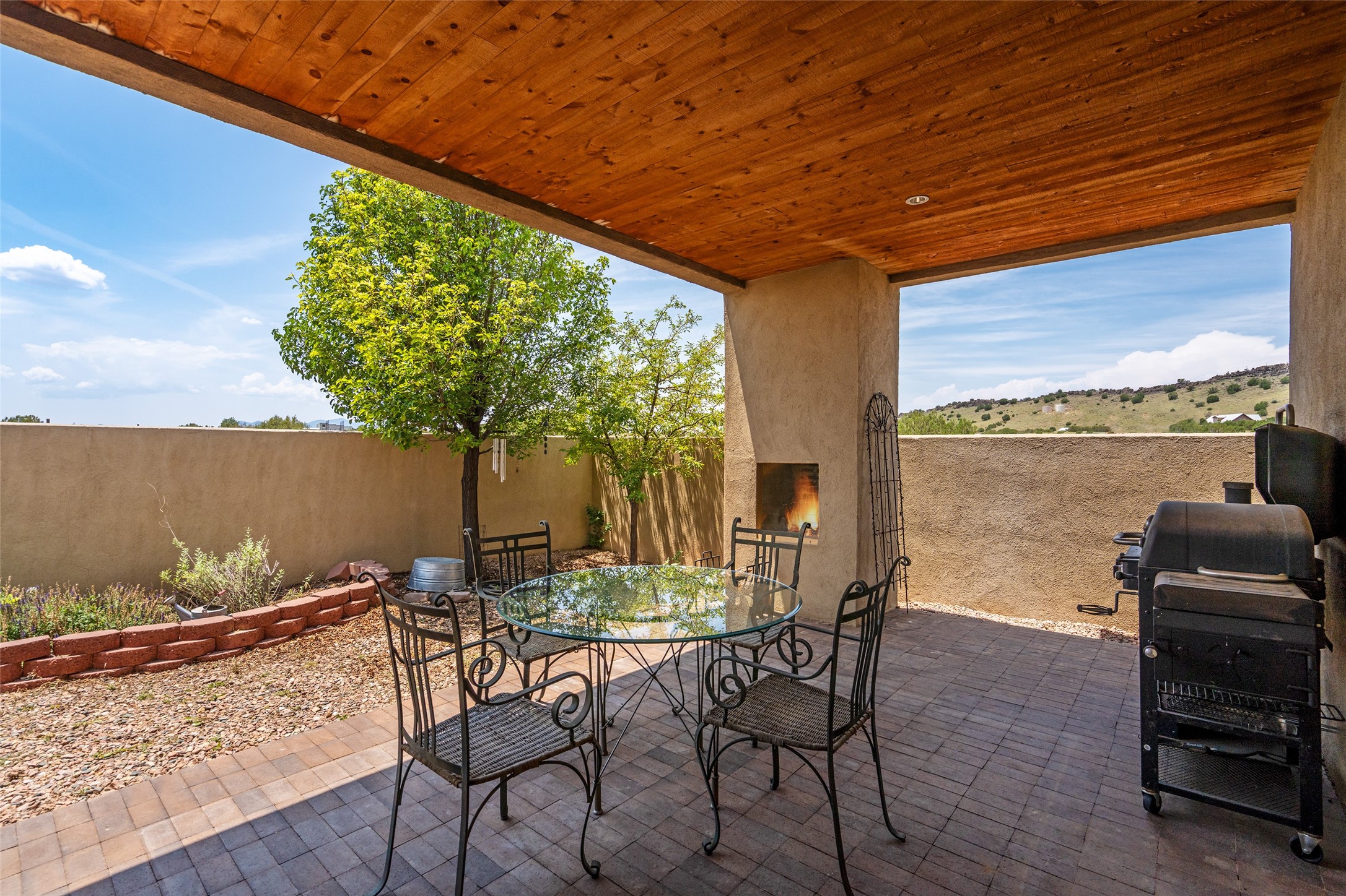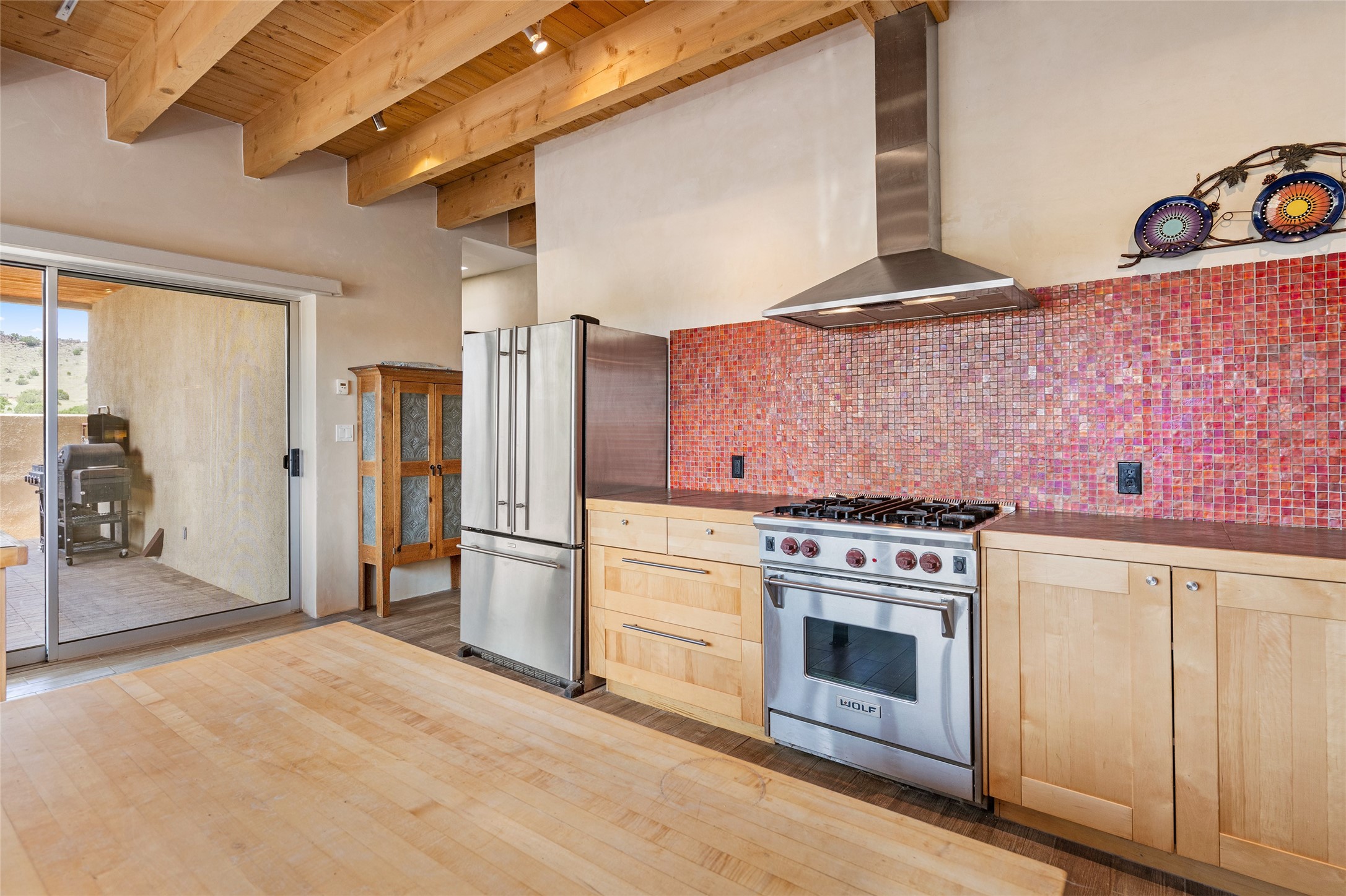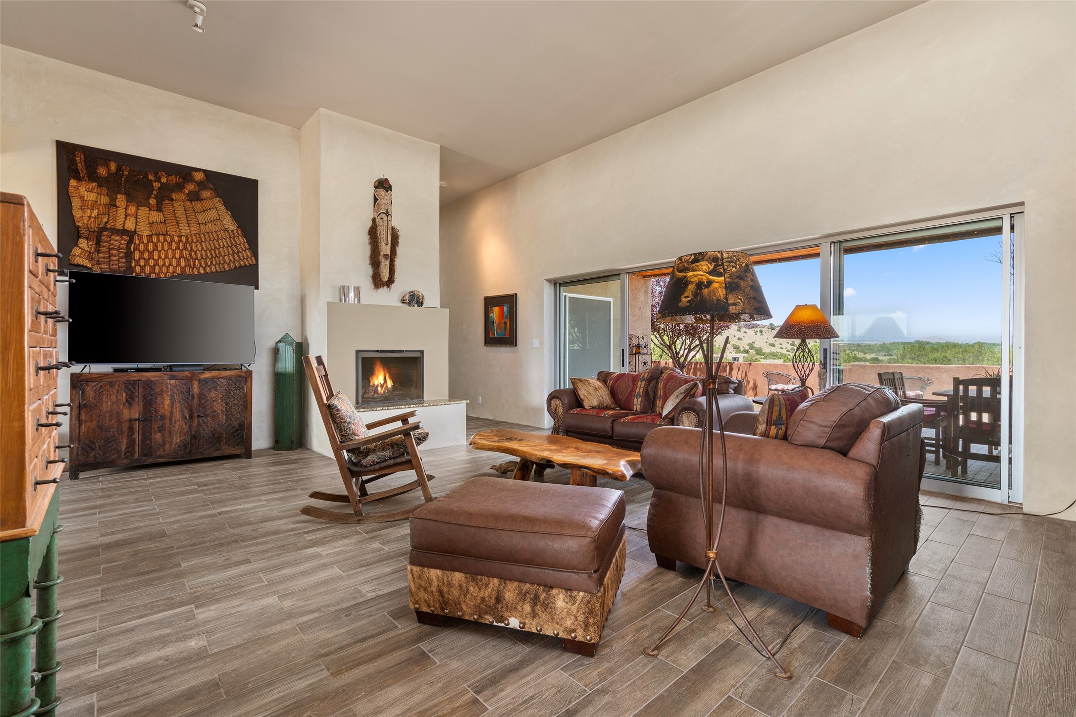 Is Galisteo calling you? Here is a contemporary styled 3 bed, 3 bath home, intelligently designed and well built by EJ Jennings, offering the best of Galisteo: beautiful natural surroundings, panoramic vistas, big skies, solitude and quiet, all a mere 30 minute drive from Santa Fe.Approach a private, walled garden space leading to a wide entryway to the home. The spacious living room glows with natural light and leads the eye to the knockout views, which set this home apart, of Hogback Ridge and the Galisteo Basin! The living room sets the tone for the substantive size and balance of the home's rooms. The open flow from living room to dining room and kitchen allows for both ease of entertainment and an intimate quality of life. Soak up sunsets and dine al fresco on the generous portal off the kitchen which features an outdoor built-in fireplace.The split floor plan offers privacy and serenity, with the primary bedroom suite separated from the two guest bedrooms. One guest bedroom includes an en suite full bath, the other, with gorgeous views, makes an excellent flex space for artists, remote workers and hobbyists. The sustainably minded will appreciate the solar array. With fine features including beamed ceilings in the dining area and kitchen, tile flooring throughout, fresh paint, and plentiful windows all with window treatments, this Galisteo home is ready to receive you!