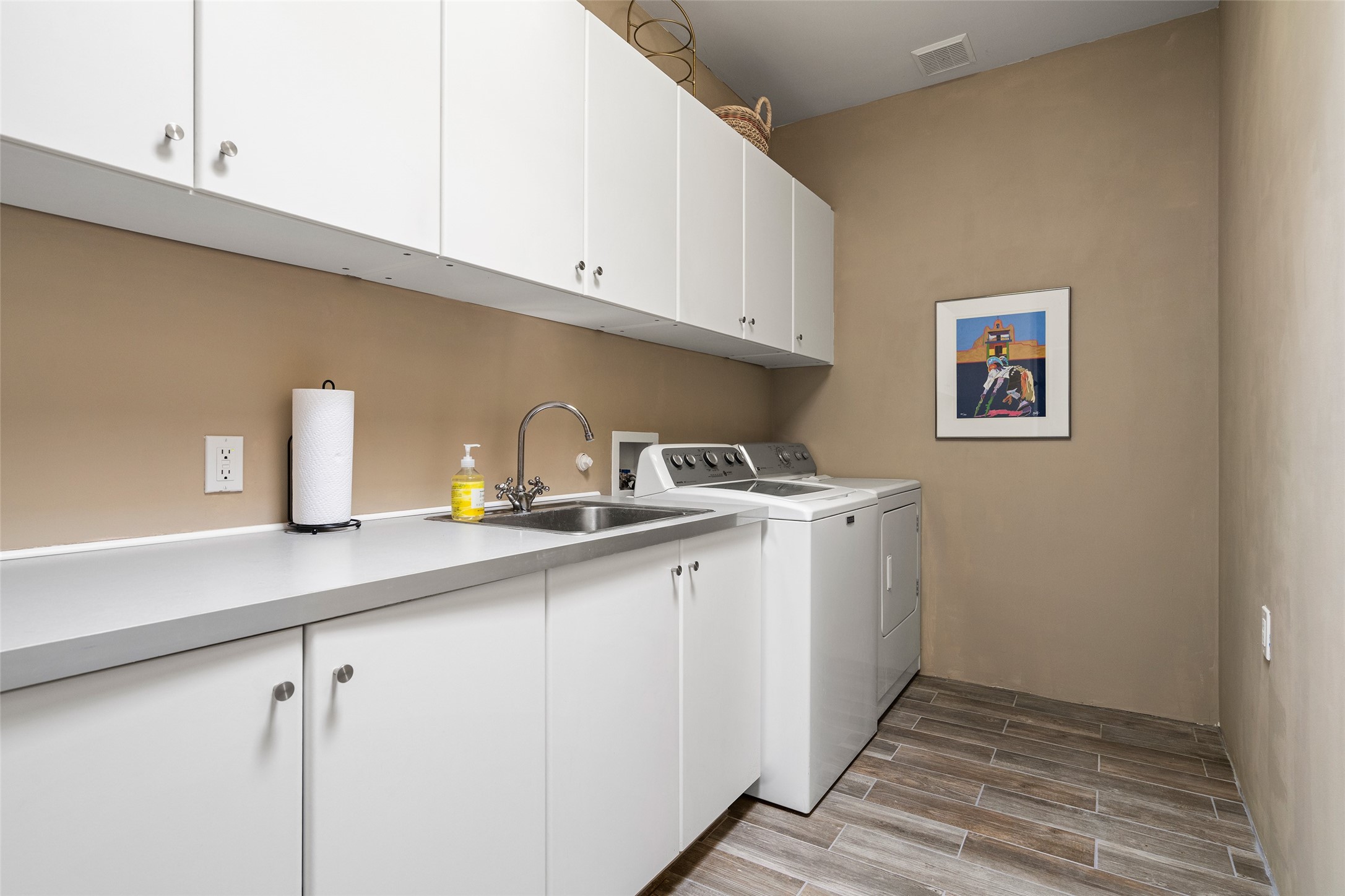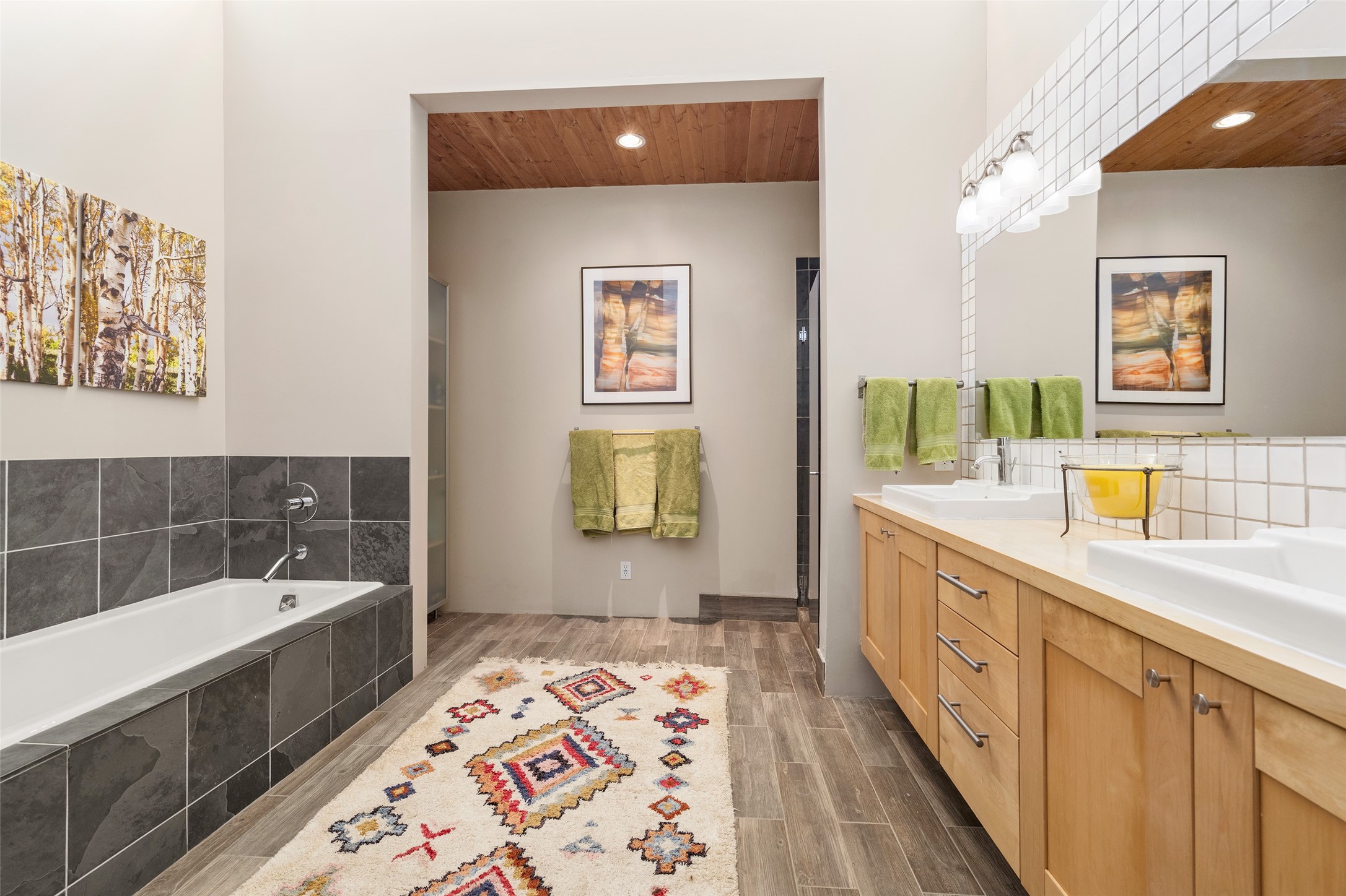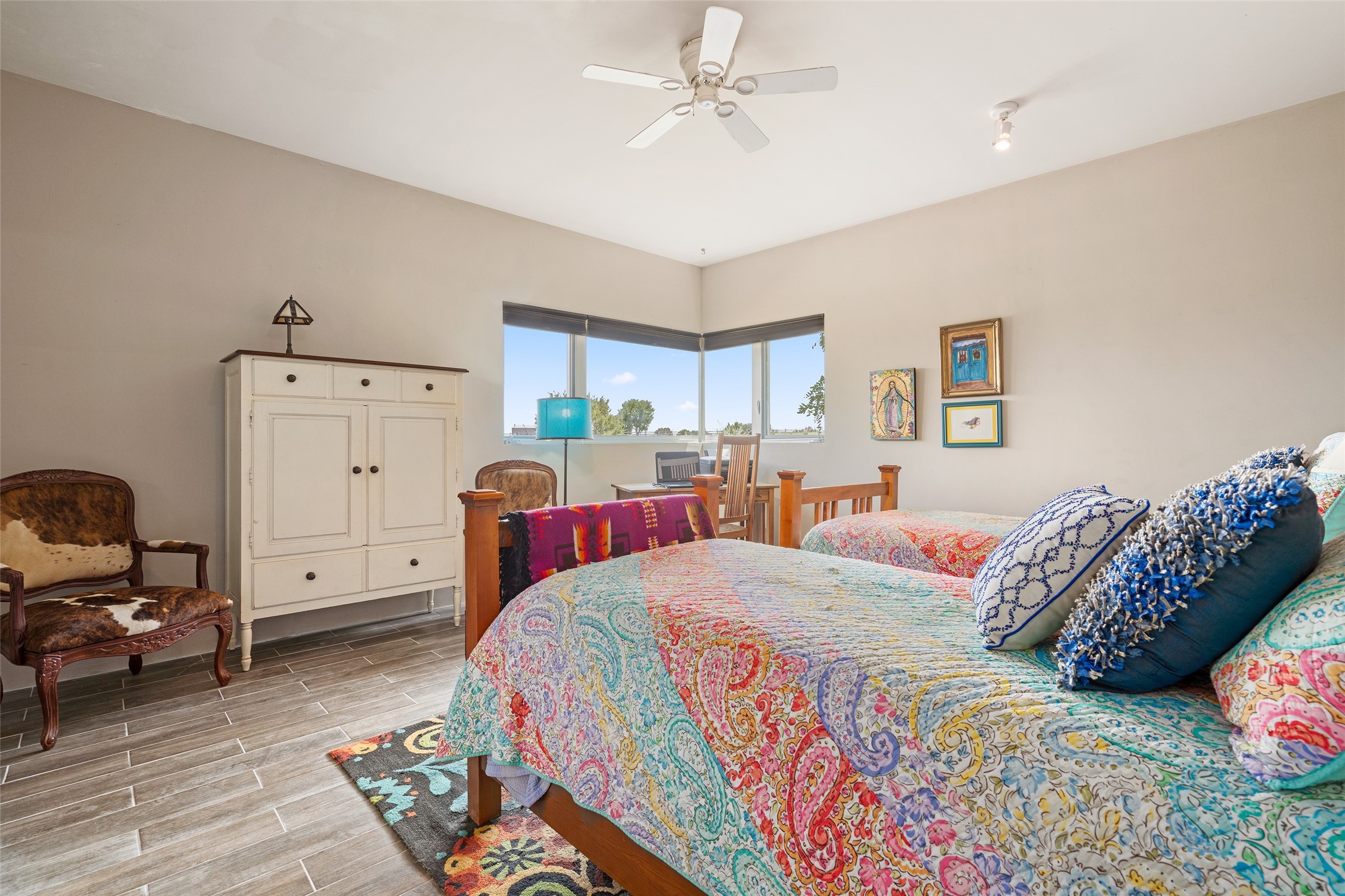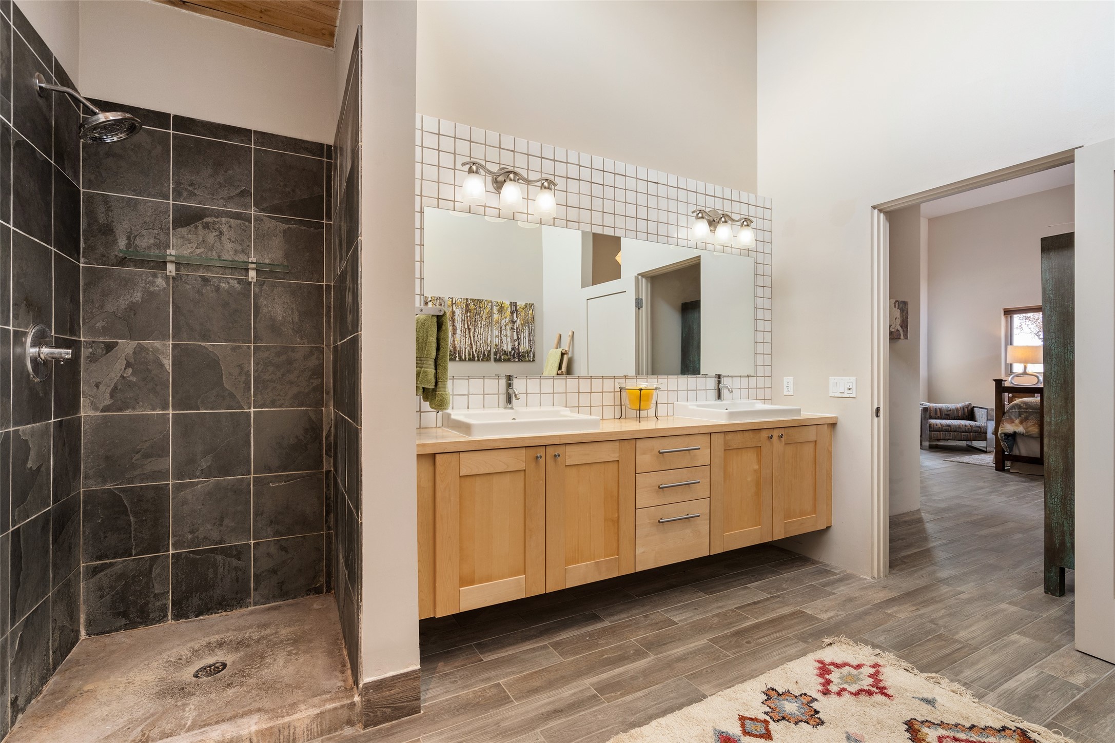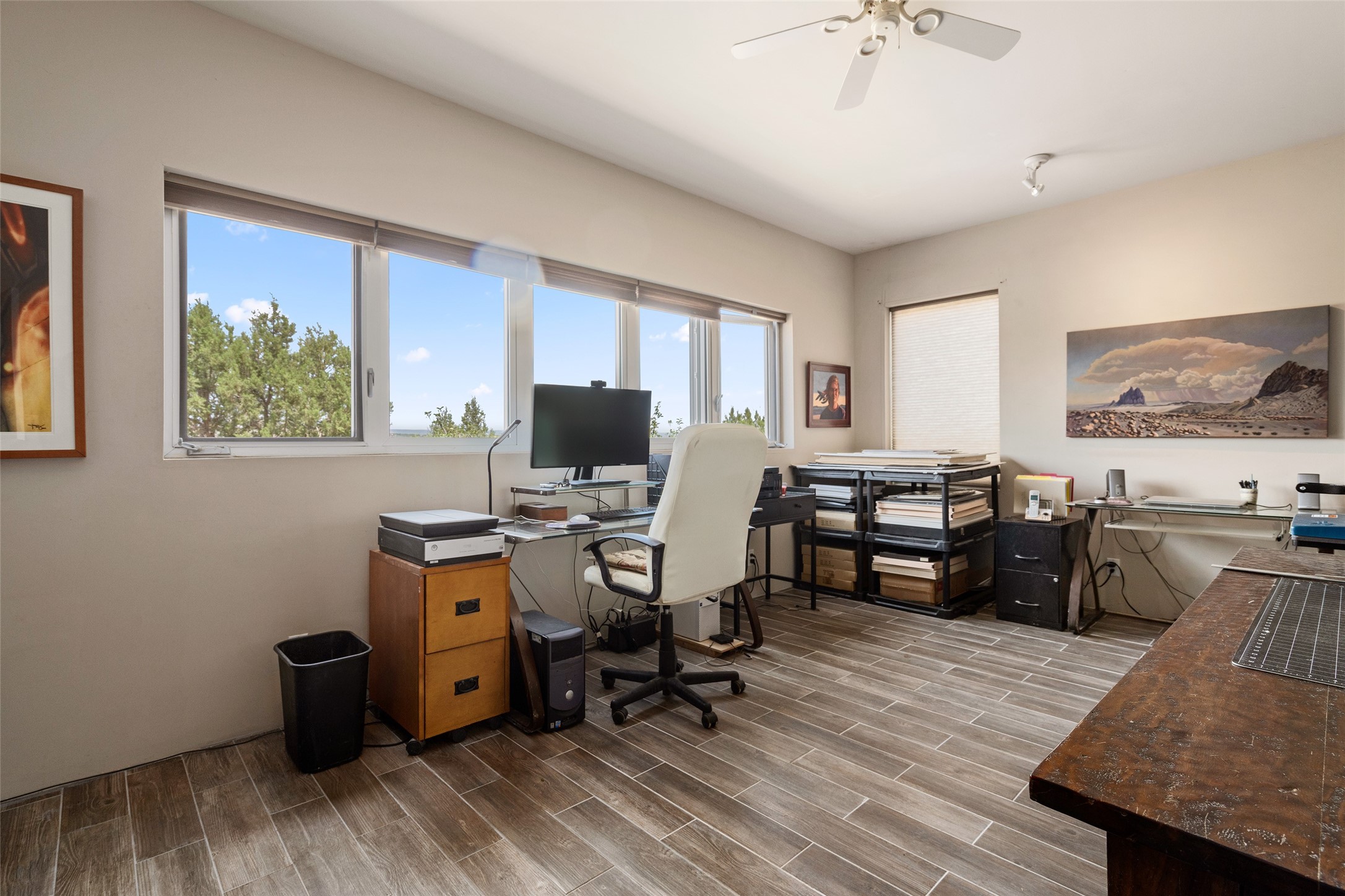 Is Galisteo calling you? Here is a contemporary styled 3 bed, 3 bath home, intelligently designed and well built by EJ Jennings, offering the best of Galisteo: beautiful natural surroundings, panoramic vistas, big skies, solitude and quiet, all a mere 30 minute drive from Santa Fe.Approach a private, walled garden space leading to a wide entryway to the home. The spacious living room glows with natural light and leads the eye to the knockout views, which set this home apart, of Hogback Ridge and the Galisteo Basin! The living room sets the tone for the substantive size and balance of the home's rooms. The open flow from living room to dining room and kitchen allows for both ease of entertainment and an intimate quality of life. Soak up sunsets and dine al fresco on the generous portal off the kitchen which features an outdoor built-in fireplace.The split floor plan offers privacy and serenity, with the primary bedroom suite separated from the two guest bedrooms. One guest bedroom includes an en suite full bath, the other, with gorgeous views, makes an excellent flex space for artists, remote workers and hobbyists. The sustainably minded will appreciate the solar array. With fine features including beamed ceilings in the dining area and kitchen, tile flooring throughout, fresh paint, and plentiful windows all with window treatments, this Galisteo home is ready to receive you!