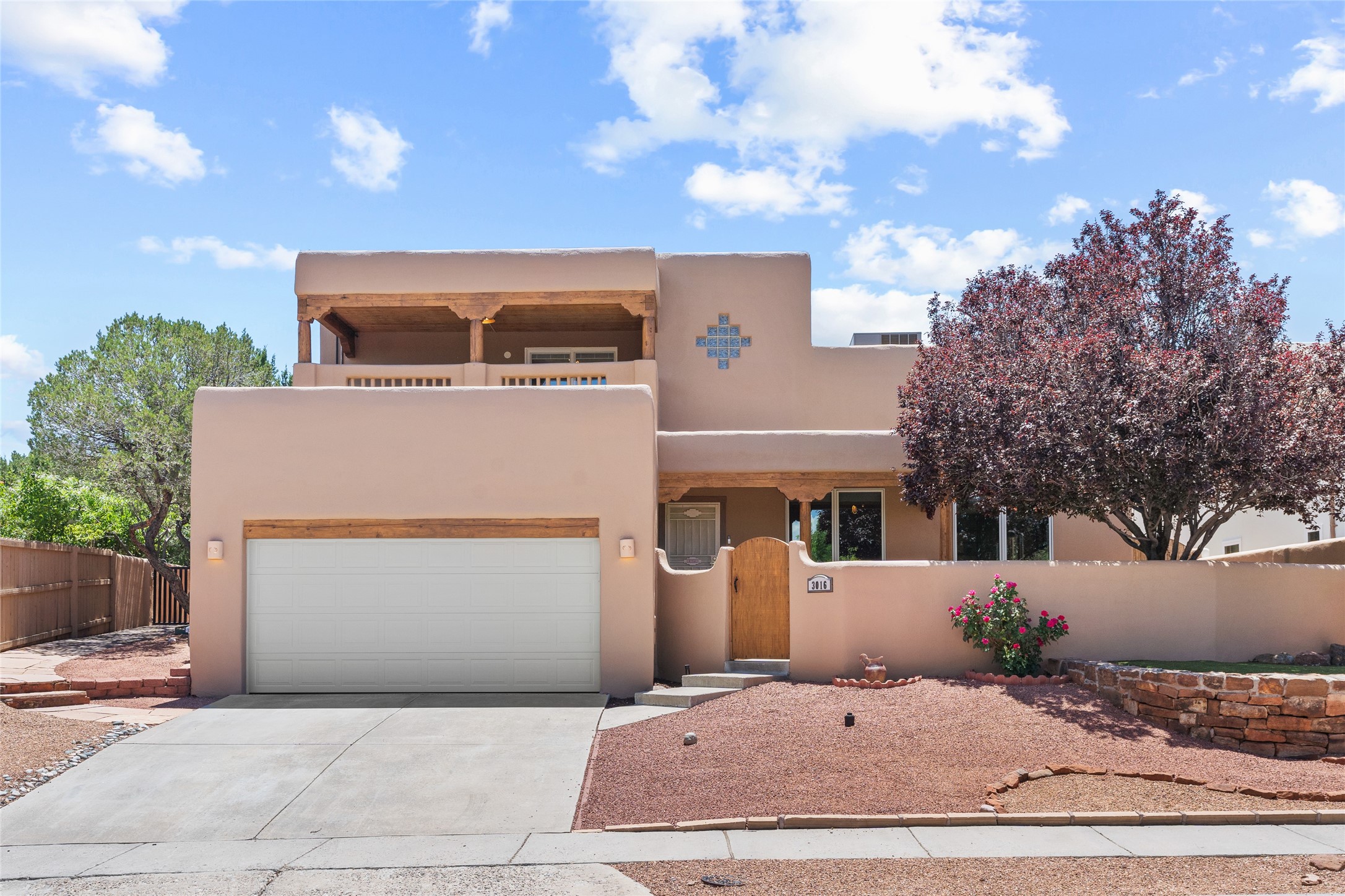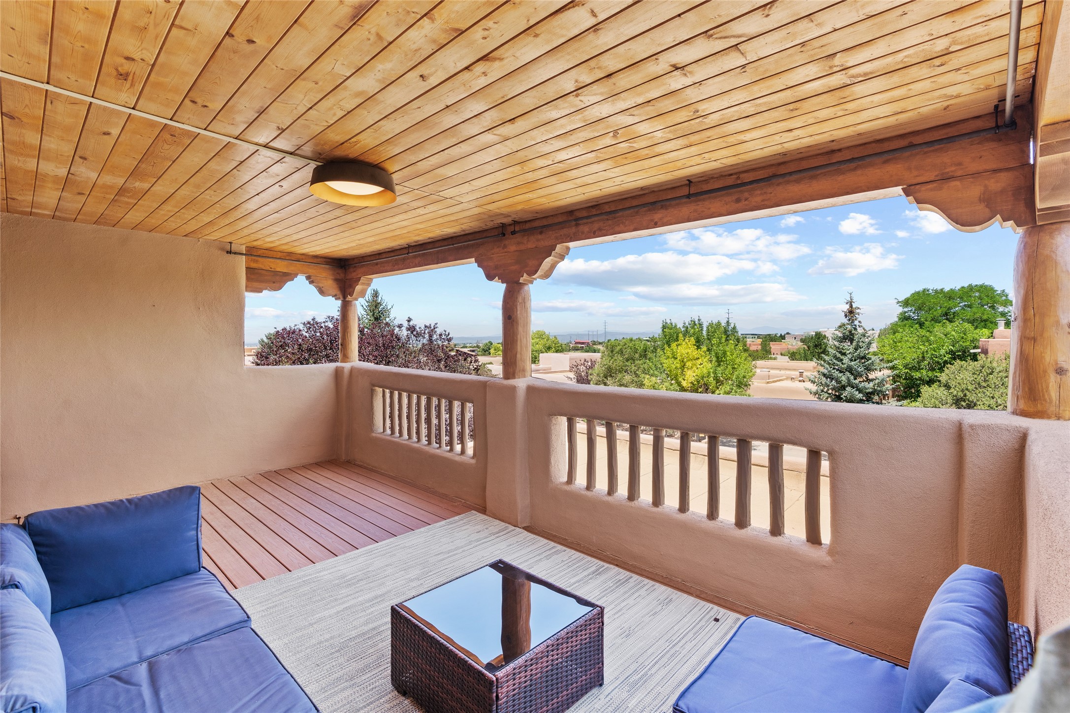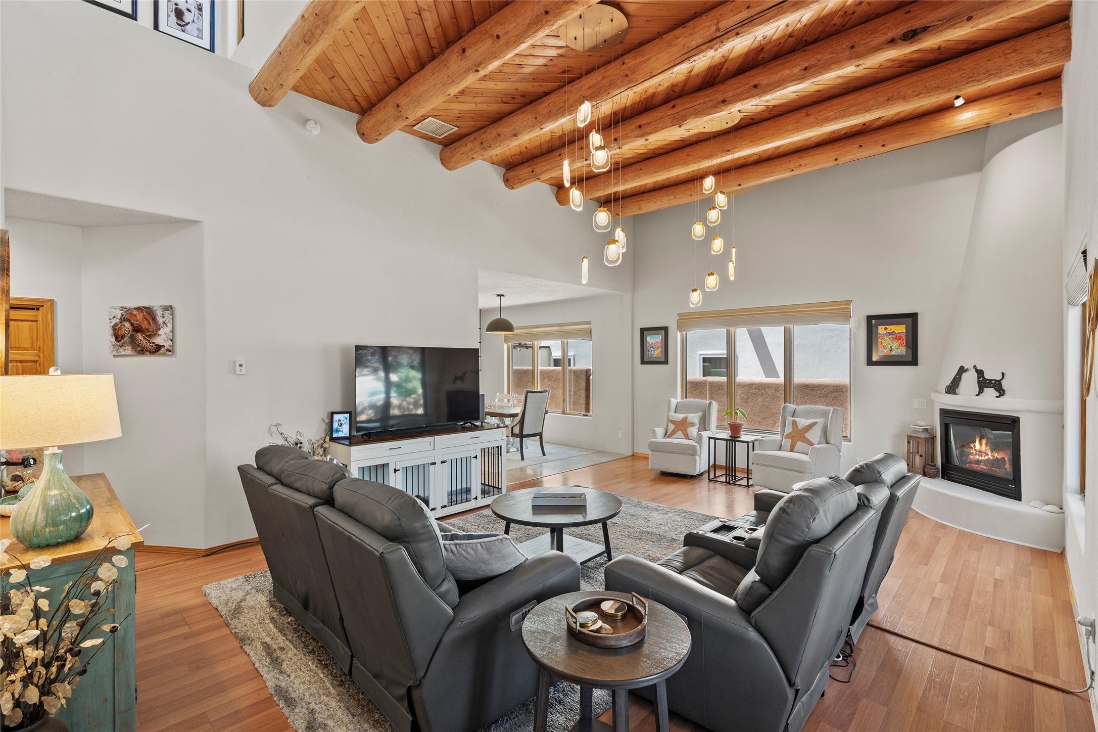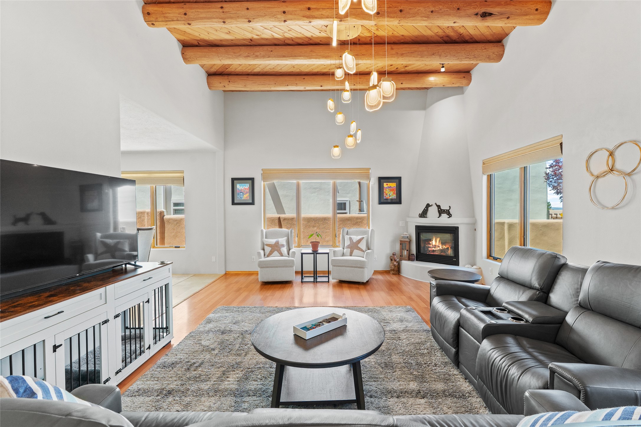 This extensively upgraded home in Pueblos del Sol--boasting over $200,000 in recent enhancements--is one of the finest in the neighborhood. The contemporary kitchen is a standout, featuring top-tier appliances including a new gas cooktop, a beverage refrigerator, sleek modern cabinetry, and a striking stone backsplash that adds a natural, organic touch.The living room impresses with 16-foot ceilings accented by vigas, a gas kiva fireplace, rich wood floors, and oversized windows that flood the space with natural light. All of the windows are newer Pella windows with remote-controlled blinds, providing both ease and comfort. Upstairs, the spacious primary suite offers a private retreat with a cozy sitting area and access to a balcony showcasing expansive sunrise and sunset views. The spa-like bath includes a designer vessel soaking tub, walk-in glass shower, heated towel rack and a generous walk-in closet custom-outfitted by California Closets.Two additional bedrooms are located on the main level, each thoughtfully designed with custom California closet systems. Outside, mature trees offer shade and privacy, and a raised platform invites stargazing or relaxing under the open sky.The oversized two-car garage is another highlight, with 12-foot ceilings, new epoxy flooring, and ceiling-mounted storage to maximize space. Set in a quiet, well-maintained community with its own trail system, this home offers quality, comfort, and convenience--just minutes from all that Santa Fe has to offer.