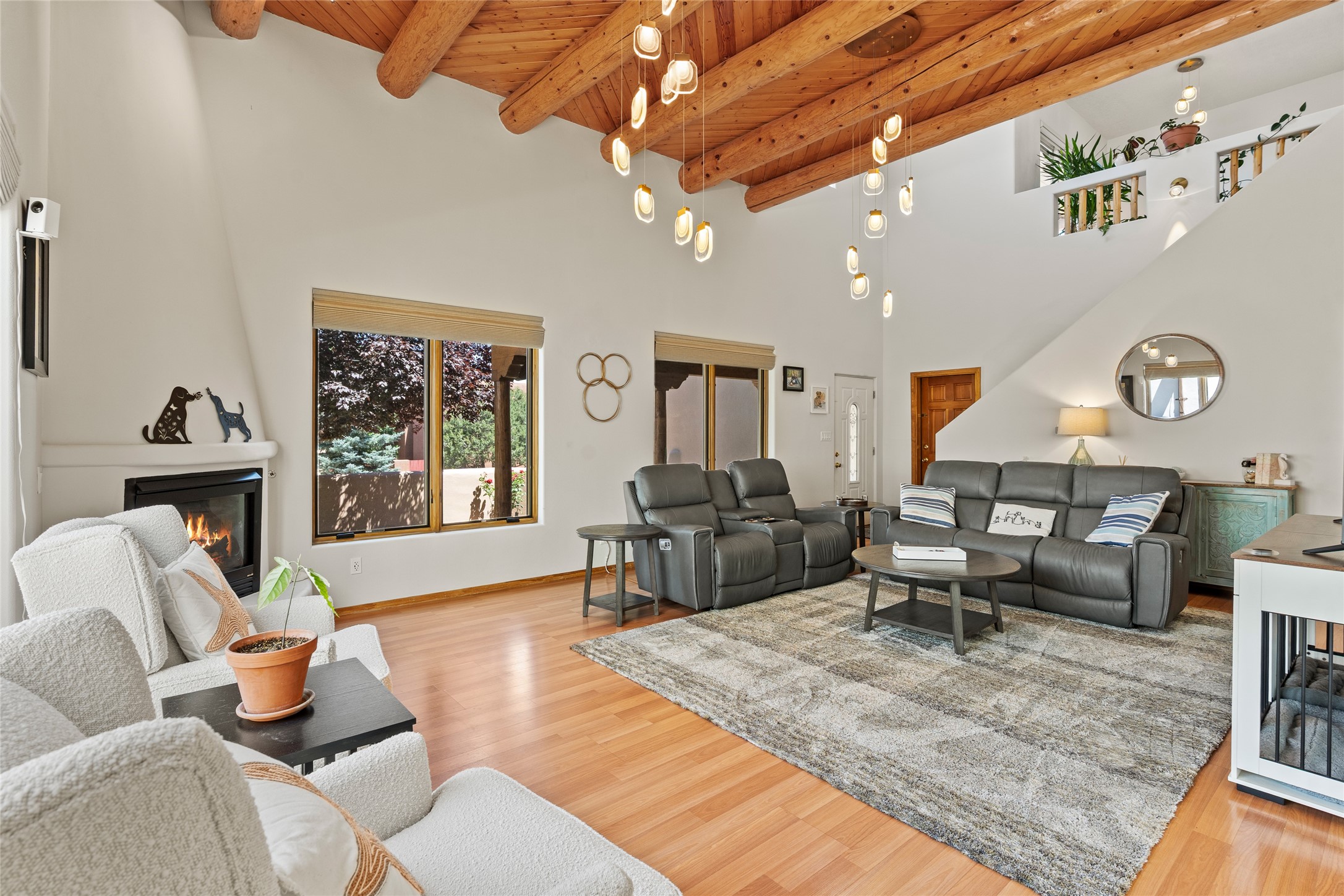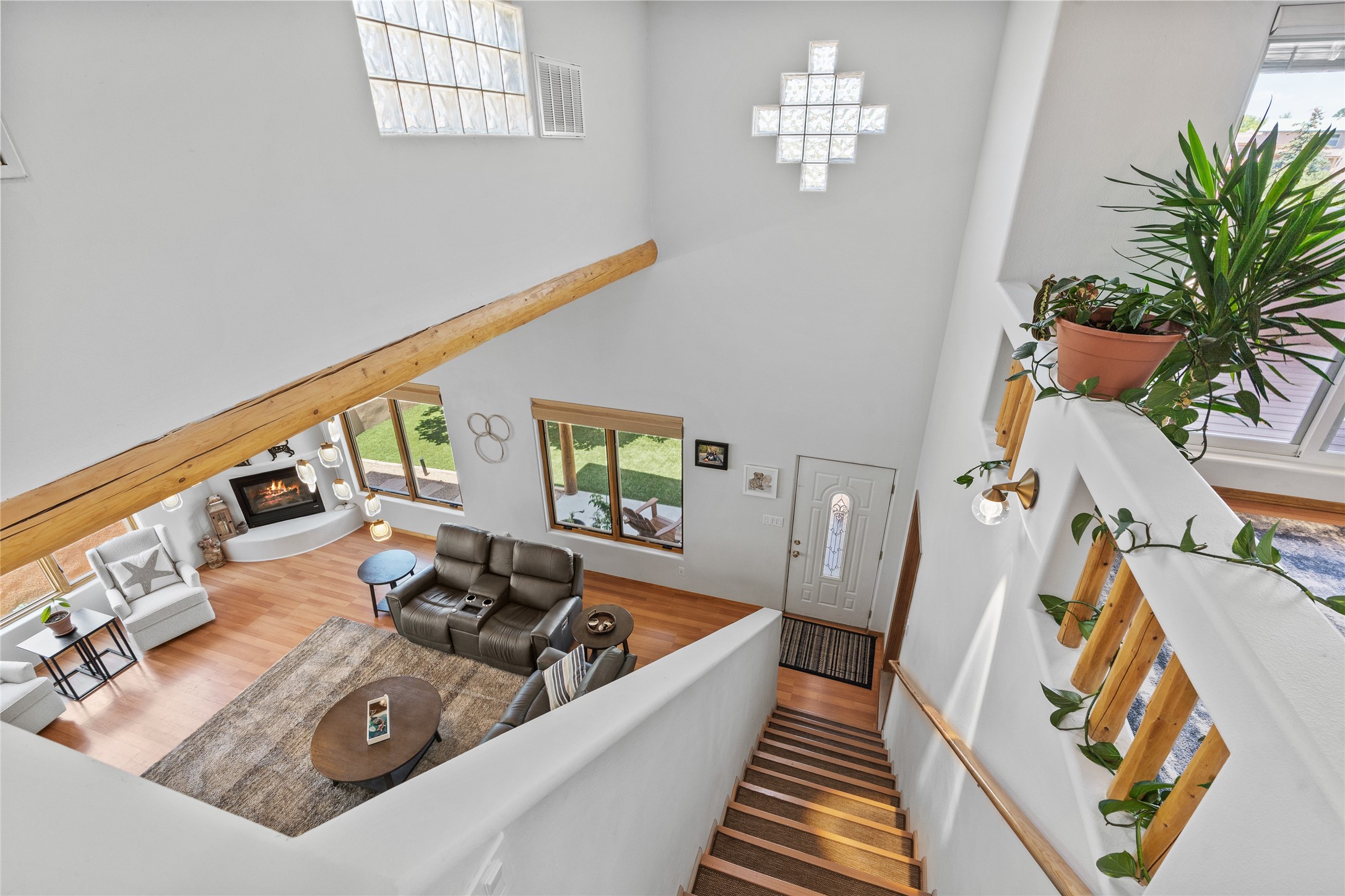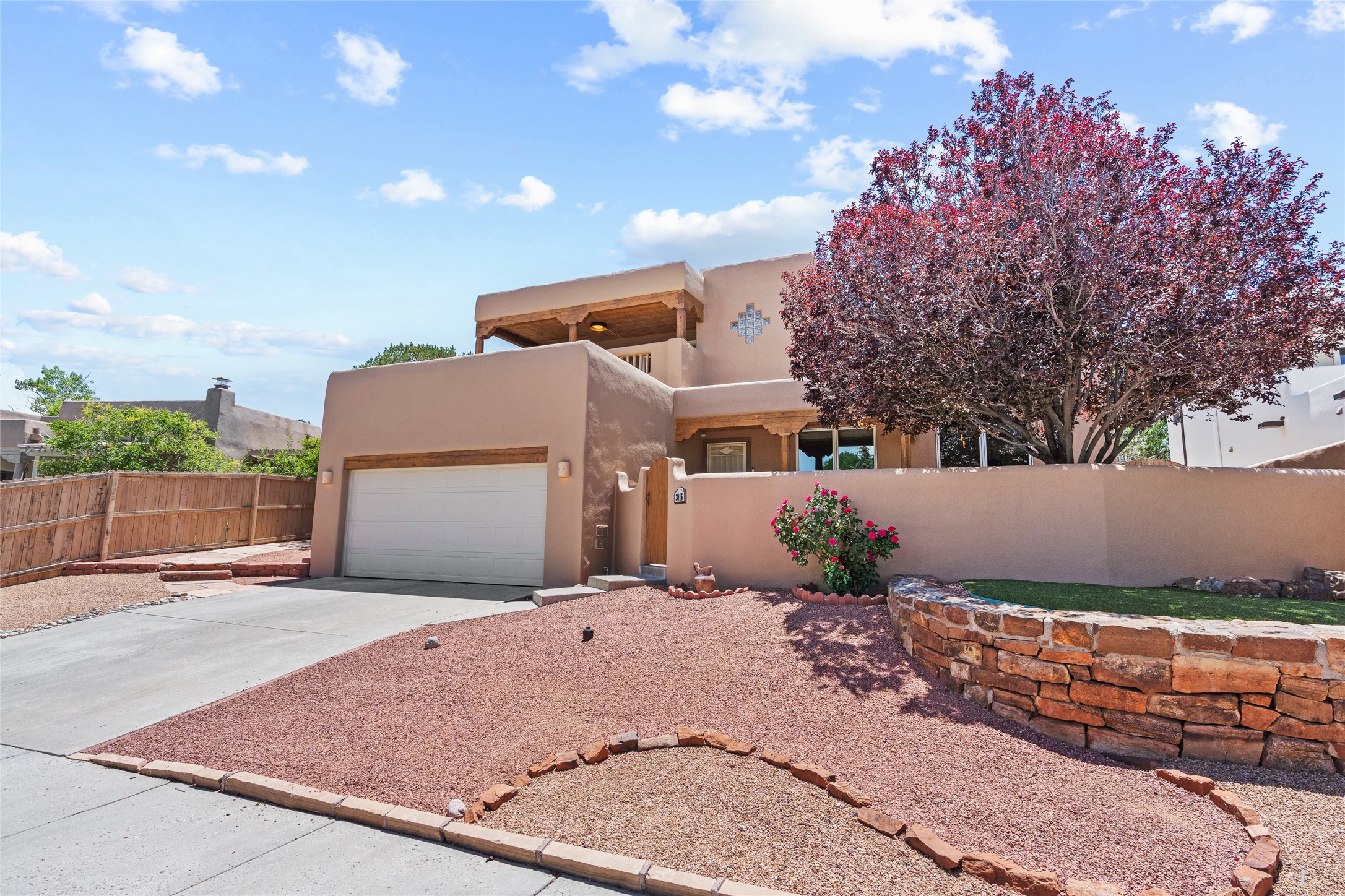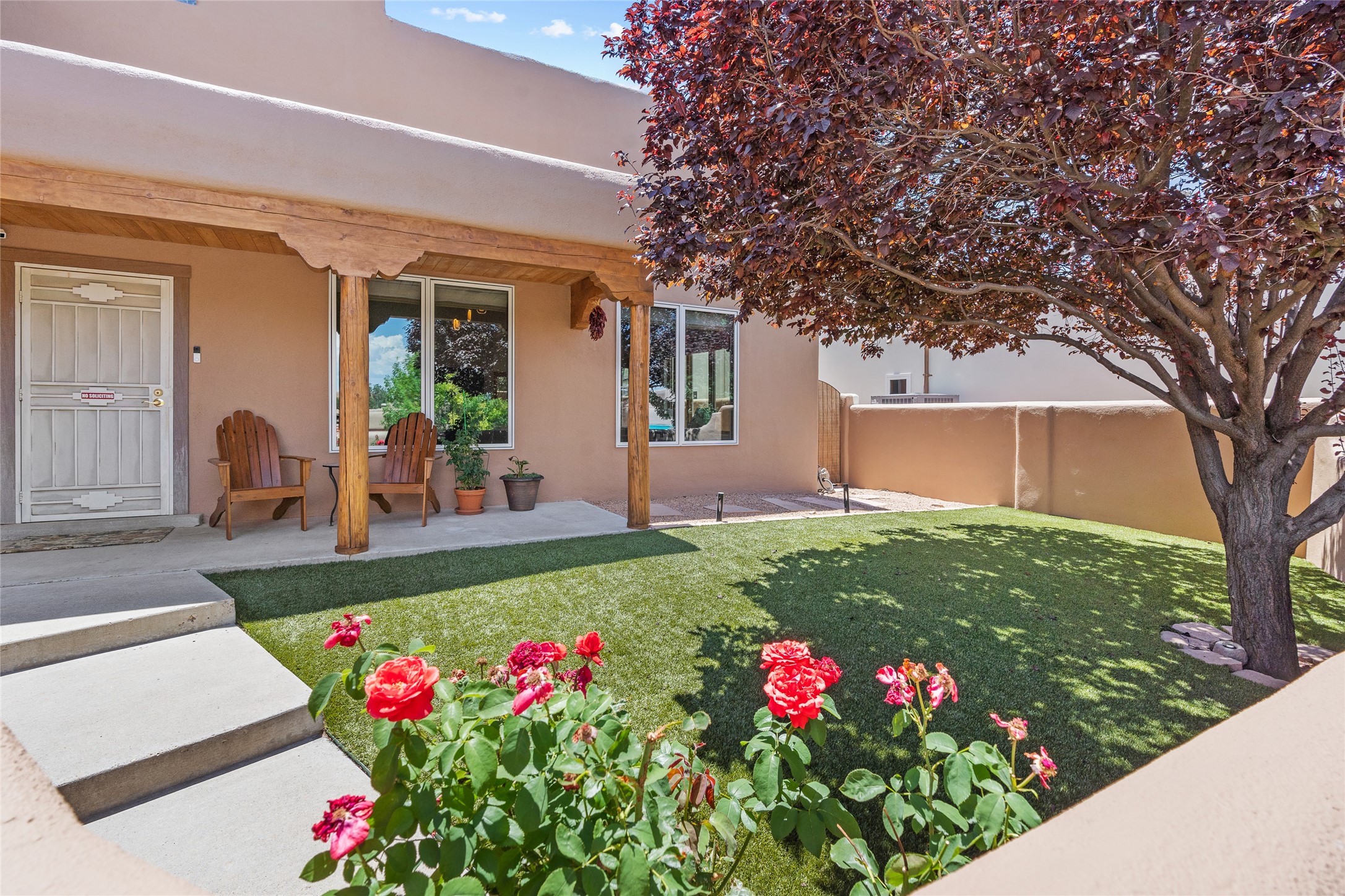 This extensively upgraded home in Pueblos del Sol--boasting over $200,000 in recent enhancements--is one of the finest in the neighborhood. The contemporary kitchen is a standout, featuring top-tier appliances including a new gas cooktop, a beverage refrigerator, sleek modern cabinetry, and a striking stone backsplash that adds a natural, organic touch.The living room impresses with 16-foot ceilings accented by vigas, a gas kiva fireplace, rich wood floors, and oversized windows that flood the space with natural light. All of the windows are newer Pella windows with remote-controlled blinds, providing both ease and comfort. Upstairs, the spacious primary suite offers a private retreat with a cozy sitting area and access to a balcony showcasing expansive sunrise and sunset views. The spa-like bath includes a designer vessel soaking tub, walk-in glass shower, heated towel rack and a generous walk-in closet custom-outfitted by California Closets.Two additional bedrooms are located on the main level, each thoughtfully designed with custom California closet systems. Outside, mature trees offer shade and privacy, and a raised platform invites stargazing or relaxing under the open sky.The oversized two-car garage is another highlight, with 12-foot ceilings, new epoxy flooring, and ceiling-mounted storage to maximize space. Set in a quiet, well-maintained community with its own trail system, this home offers quality, comfort, and convenience--just minutes from all that Santa Fe has to offer.