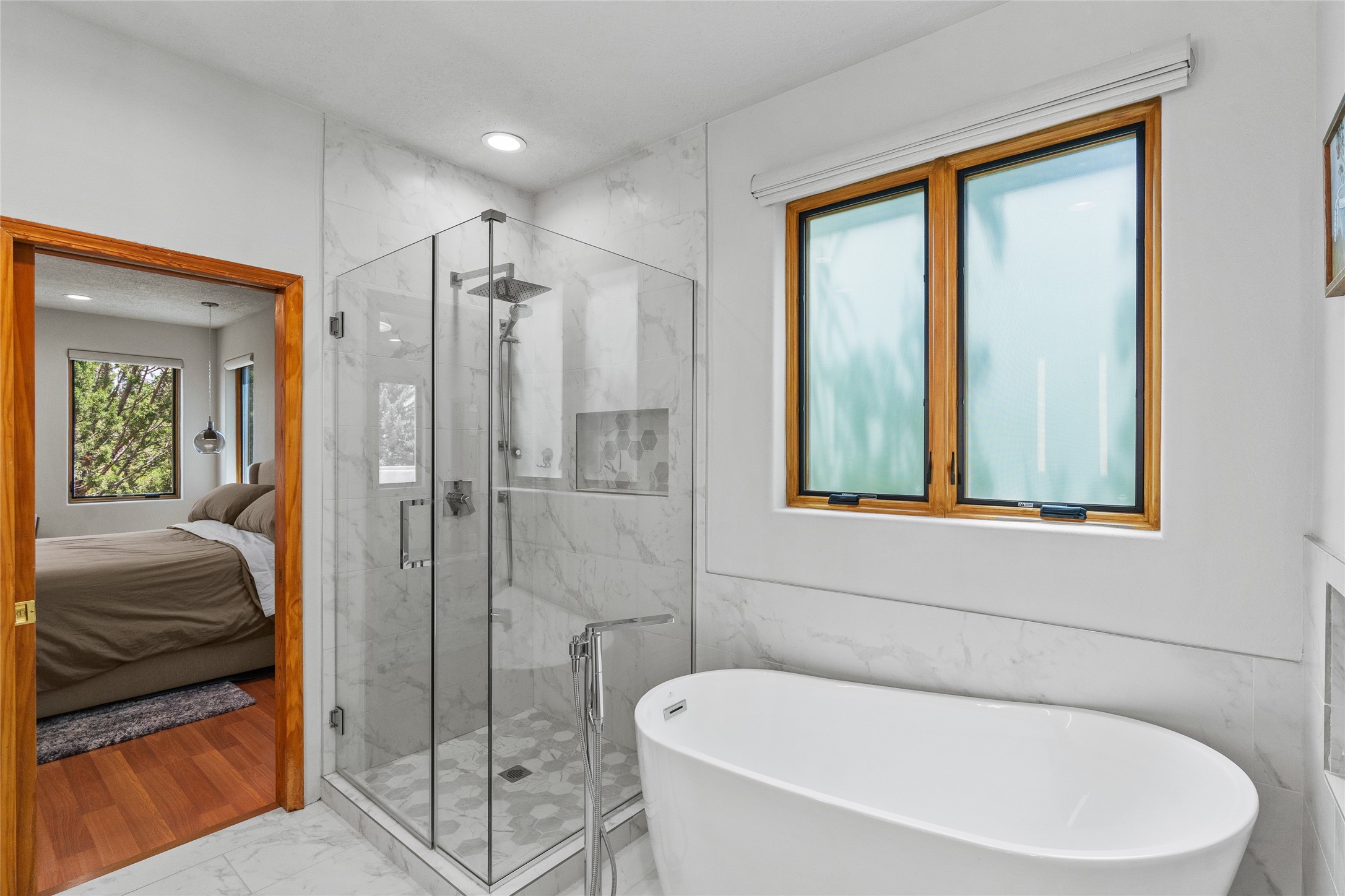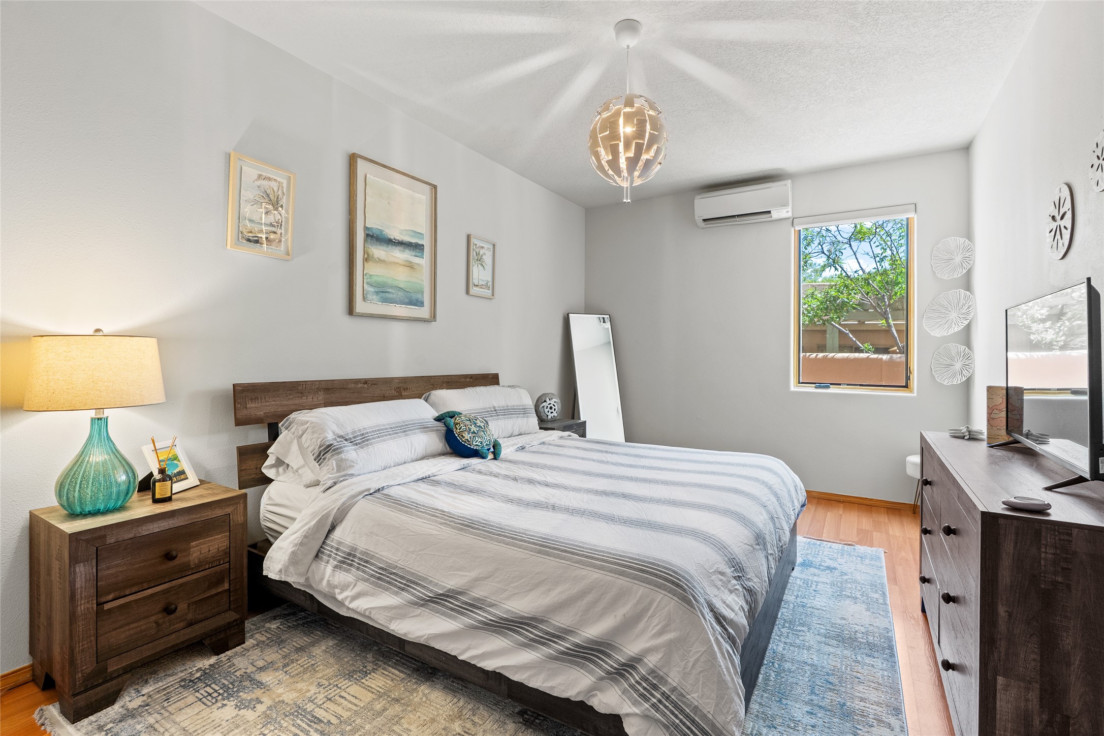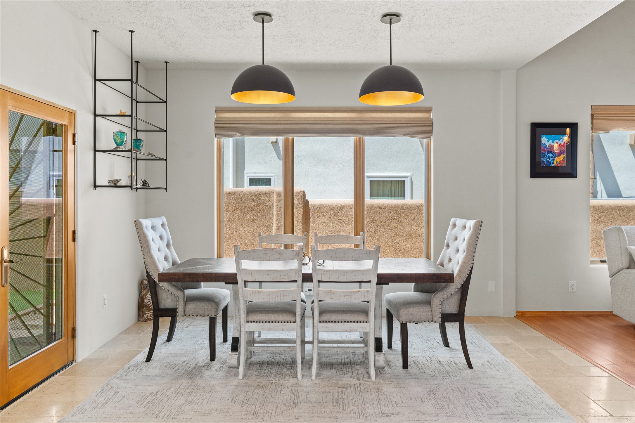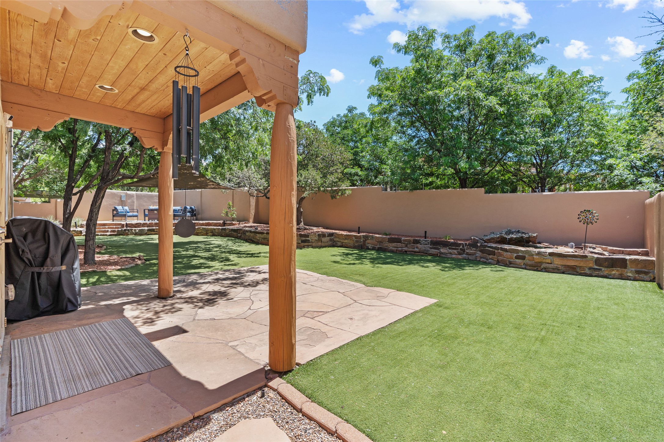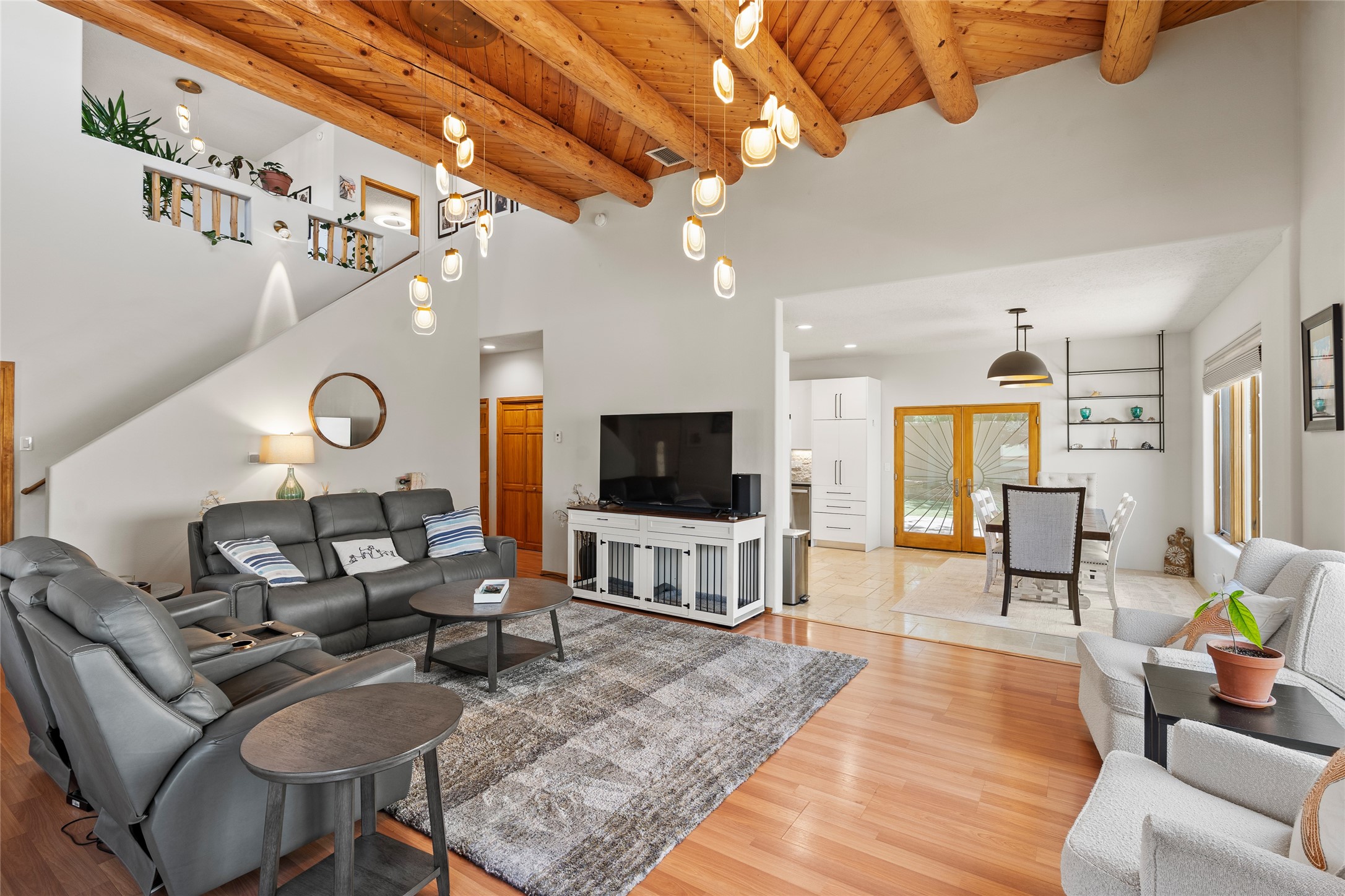 This extensively upgraded home in Pueblos del Sol--boasting over $200,000 in recent enhancements--is one of the finest in the neighborhood. The contemporary kitchen is a standout, featuring top-tier appliances including a new gas cooktop, a beverage refrigerator, sleek modern cabinetry, and a striking stone backsplash that adds a natural, organic touch.The living room impresses with 16-foot ceilings accented by vigas, a gas kiva fireplace, rich wood floors, and oversized windows that flood the space with natural light. All of the windows are newer Pella windows with remote-controlled blinds, providing both ease and comfort. Upstairs, the spacious primary suite offers a private retreat with a cozy sitting area and access to a balcony showcasing expansive sunrise and sunset views. The spa-like bath includes a designer vessel soaking tub, walk-in glass shower, heated towel rack and a generous walk-in closet custom-outfitted by California Closets.Two additional bedrooms are located on the main level, each thoughtfully designed with custom California closet systems. Outside, mature trees offer shade and privacy, and a raised platform invites stargazing or relaxing under the open sky.The oversized two-car garage is another highlight, with 12-foot ceilings, new epoxy flooring, and ceiling-mounted storage to maximize space. Set in a quiet, well-maintained community with its own trail system, this home offers quality, comfort, and convenience--just minutes from all that Santa Fe has to offer.
