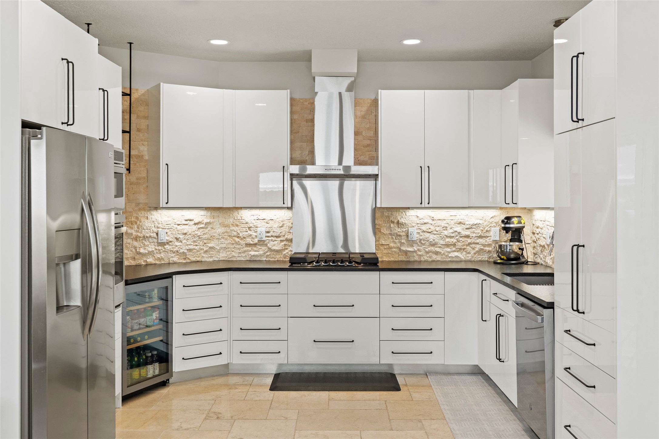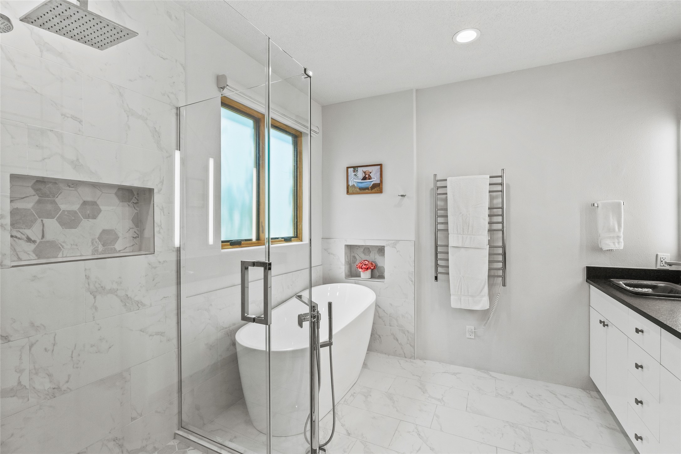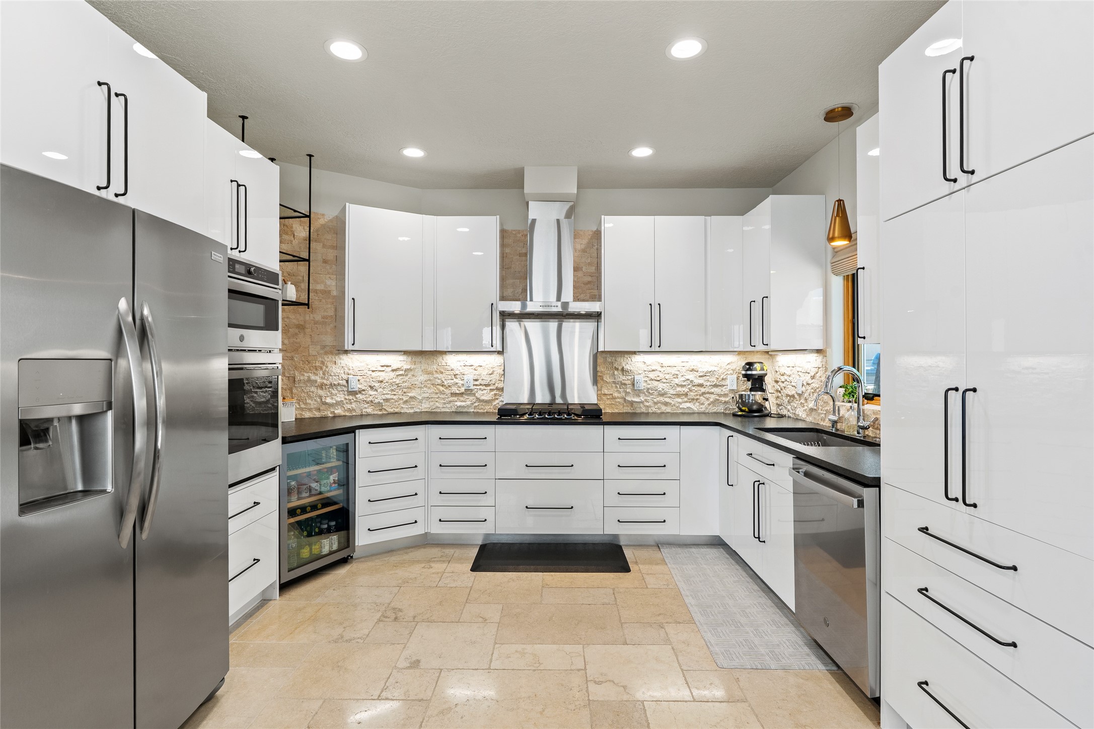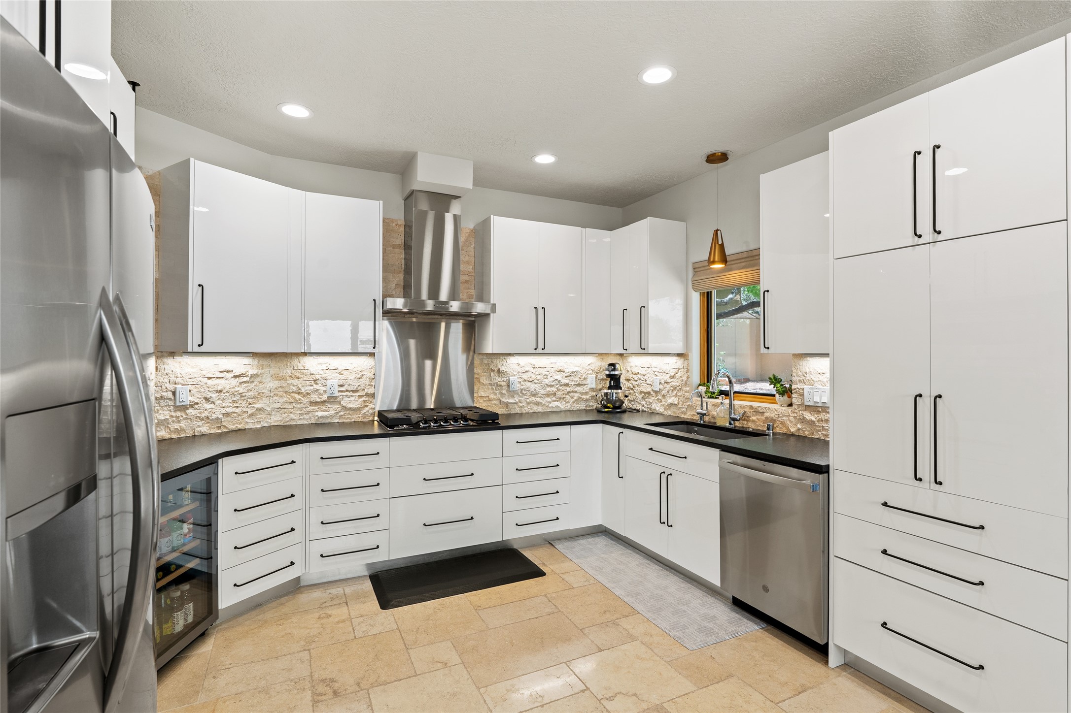 This extensively upgraded home in Pueblos del Sol--boasting over $200,000 in recent enhancements--is one of the finest in the neighborhood. The contemporary kitchen is a standout, featuring top-tier appliances including a new gas cooktop, a beverage refrigerator, sleek modern cabinetry, and a striking stone backsplash that adds a natural, organic touch.The living room impresses with 16-foot ceilings accented by vigas, a gas kiva fireplace, rich wood floors, and oversized windows that flood the space with natural light. All of the windows are newer Pella windows with remote-controlled blinds, providing both ease and comfort. Upstairs, the spacious primary suite offers a private retreat with a cozy sitting area and access to a balcony showcasing expansive sunrise and sunset views. The spa-like bath includes a designer vessel soaking tub, walk-in glass shower, heated towel rack and a generous walk-in closet custom-outfitted by California Closets.Two additional bedrooms are located on the main level, each thoughtfully designed with custom California closet systems. Outside, mature trees offer shade and privacy, and a raised platform invites stargazing or relaxing under the open sky.The oversized two-car garage is another highlight, with 12-foot ceilings, new epoxy flooring, and ceiling-mounted storage to maximize space. Set in a quiet, well-maintained community with its own trail system, this home offers quality, comfort, and convenience--just minutes from all that Santa Fe has to offer.