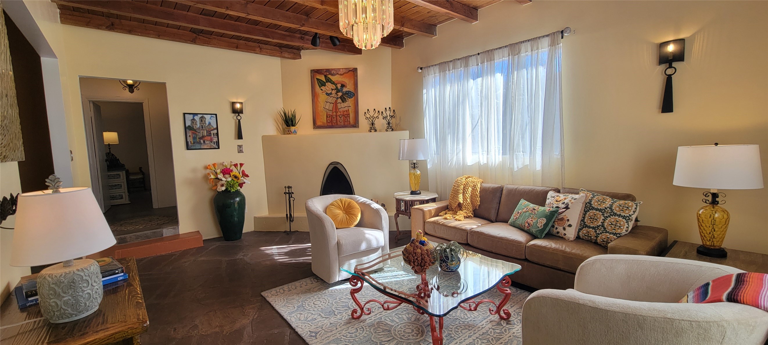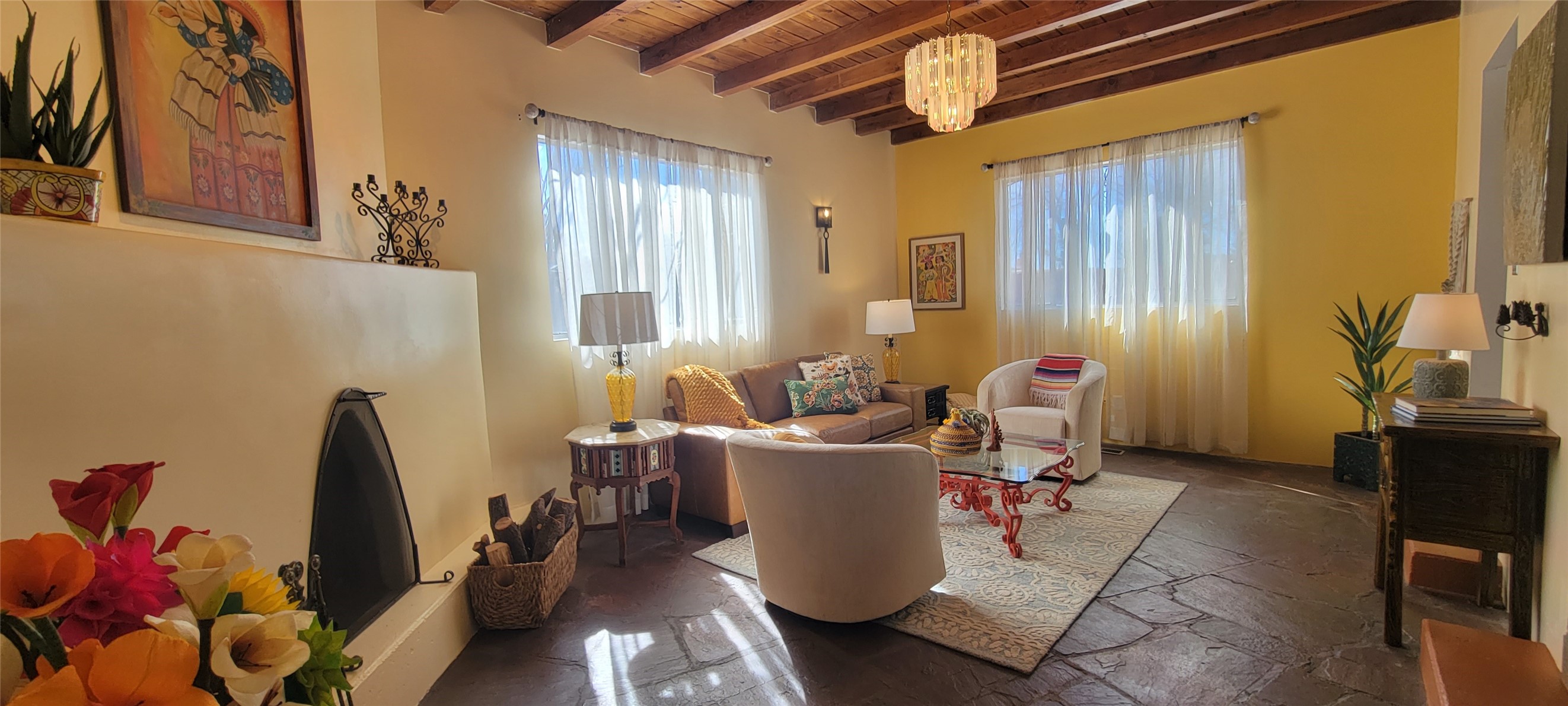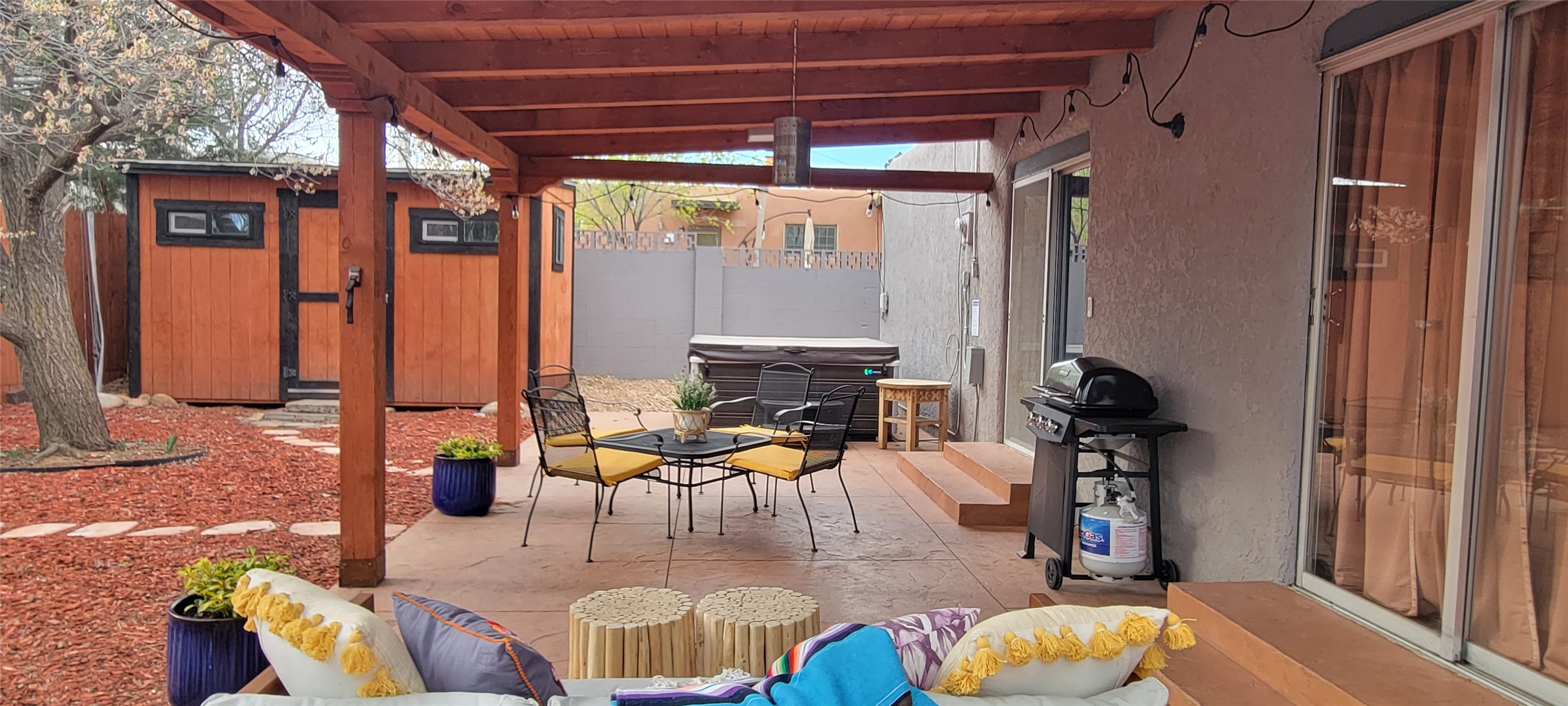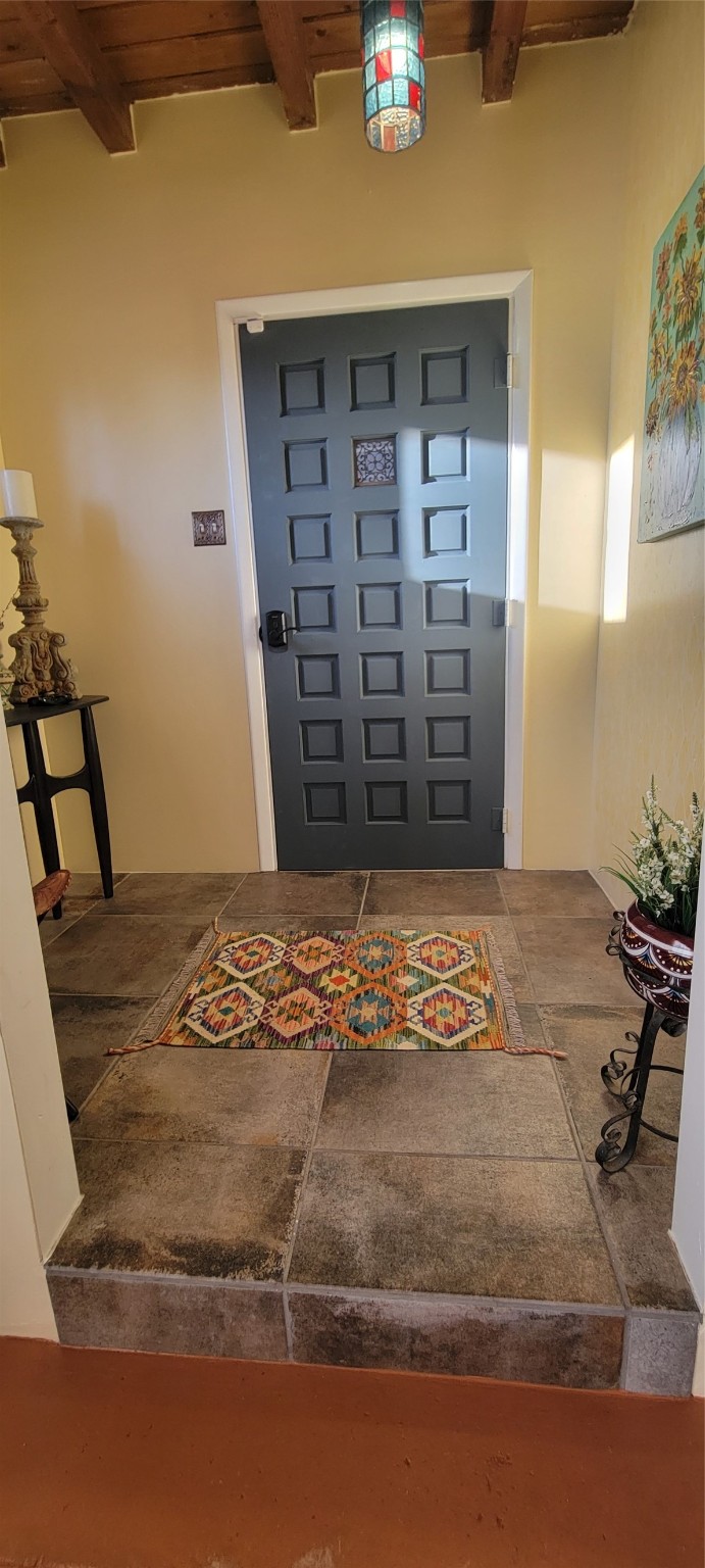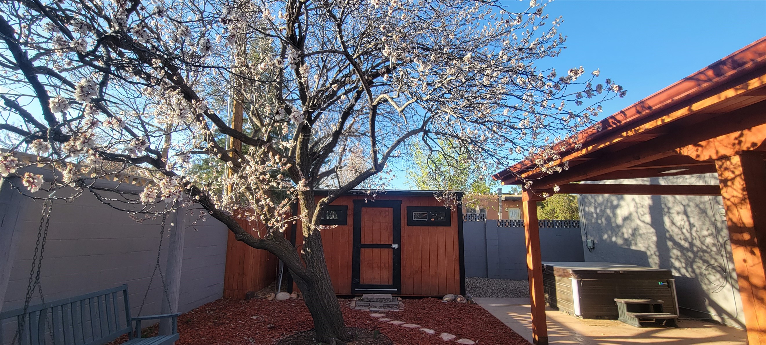 Santa Fe Style adorable classic pueblo! Bright airy sunny living room, original working kiva fireplace, amazing viga ceilings throughout provide warm, rustic ambiance. Well insulated quiet bedrooms w/ fabulous skylights. Owner's suite has private bath, tiled shower, walk-in closet. Gorgeous kitchen, stunning tile, granite counters, gas range, newer dishwasher & disposal. DR flows from Kitchen to LR for carefree entertaining. Charming hand-painted stenciled walls, unique lighting, Central HVAC system, new sinks/fixtures in both BAs. Murphy bed in 3rd BR, ideal as a multi-use flex room. Front & back courtyards ready for great conversation, morning coffee, or relax in the hot tub. Lots of extras: Wrought iron custom gates/fencing for front courtyard. Awesome covered back porch, attached carport for two cars, driveway space for two more cars, large insulated storage building has built in shelving & electricity. Hot tub, one year old cover. Beautiful apricot trees front & back, mature landscaping. Built in 1968 by Santa Fe builder Allen Stamm, Stamm's classic pueblo structures are synonymous with solid, well-built homes and are considered icons of the Santa Fe style in the Santa Fe market. Say you own a Stamm home, and you receive nods of approval from the locals. Lovingly named Casa de Flora, close to Frenchy's Park, only 2.8 miles from the Plaza, convenient to everything old & new in Santa Fe with a perfect location. Discover Santa Fe's culture, rich heritage & deep history through architecture, art, festivals, cuisine, performing arts and museums. The City Different feels like no other city in the World. A fascinating blend of Native American and Spanish cultures, all of it could be right on your doorstep! 2005 UNESCO Creative City Designation, 3rd largest art market in US, 250+ art galleries, 18 performing arts venues. Santa Fe is surrounded by 1.6 million acres of public land perfect for hiking, biking, camping, sightseeing. 300 sunny days a year! Owner GA Licensee.