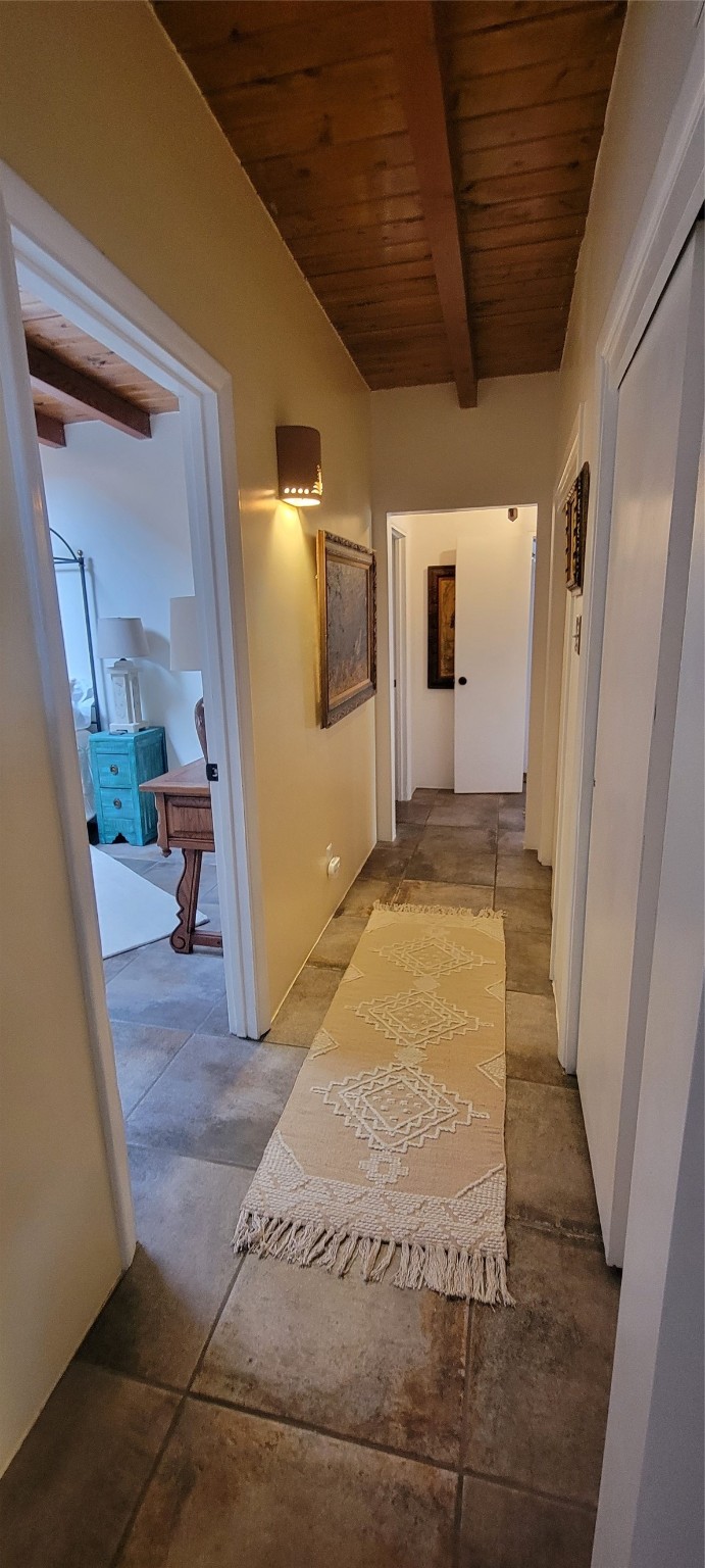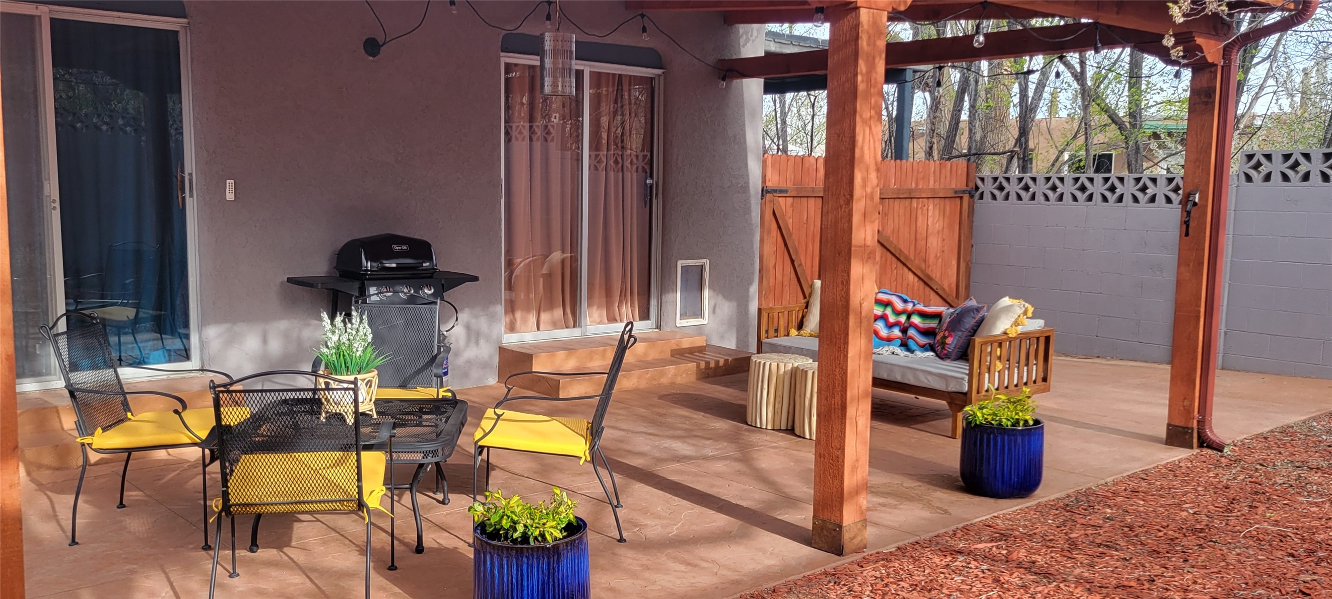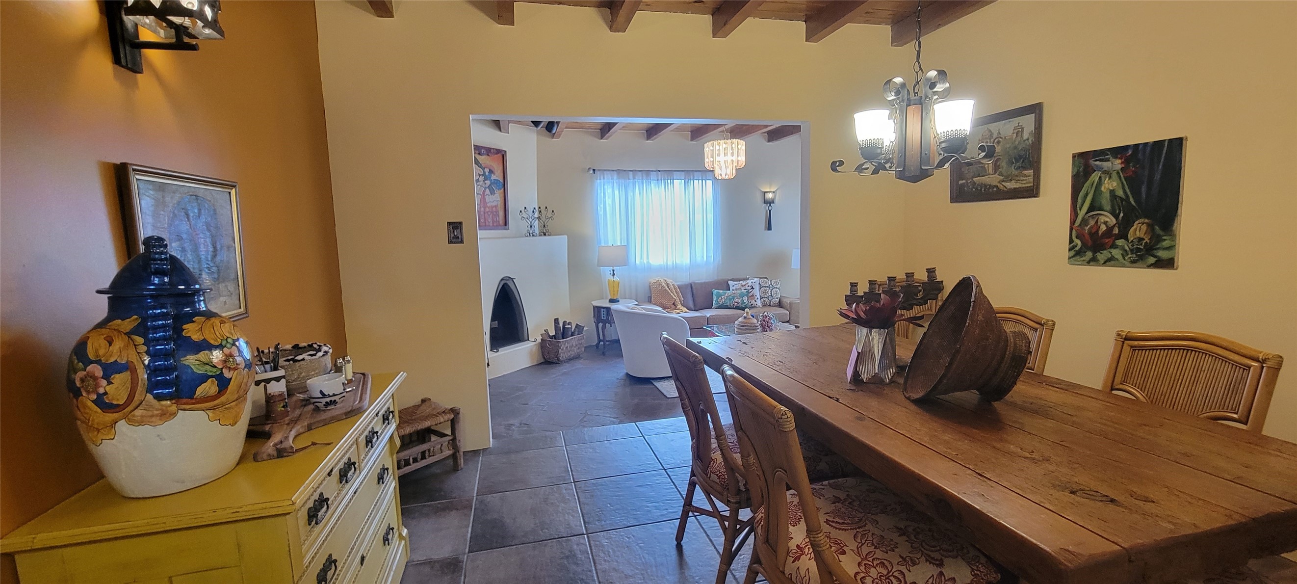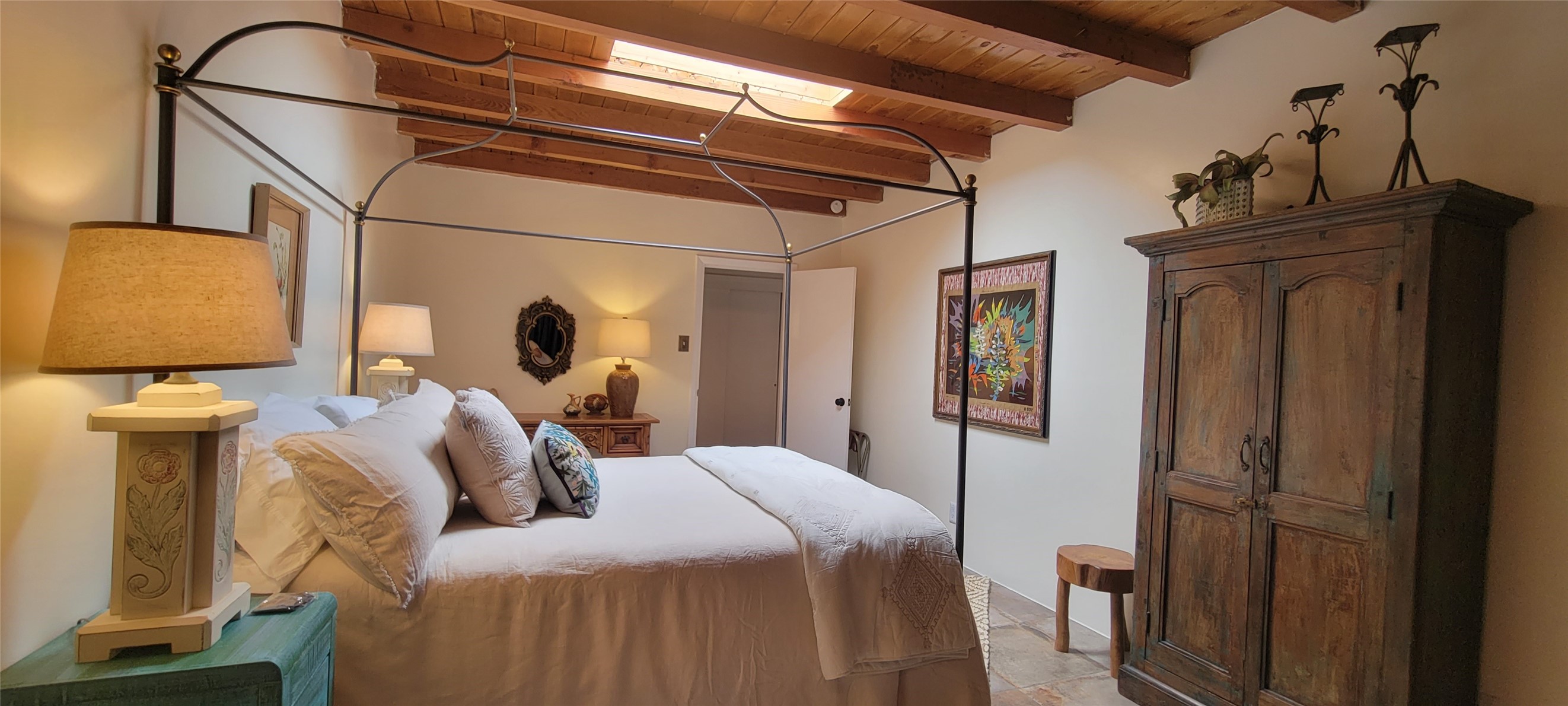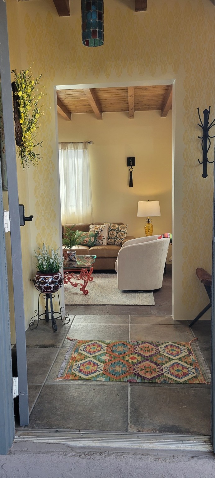 Santa Fe Style adorable classic pueblo! Bright airy sunny living room, original working kiva fireplace, amazing viga ceilings throughout provide warm, rustic ambiance. Well insulated quiet bedrooms w/ fabulous skylights. Owner's suite has private bath, tiled shower, walk-in closet. Gorgeous kitchen, stunning tile, granite counters, gas range, newer dishwasher & disposal. DR flows from Kitchen to LR for carefree entertaining. Charming hand-painted stenciled walls, unique lighting, Central HVAC system, new sinks/fixtures in both BAs. Murphy bed in 3rd BR, ideal as a multi-use flex room. Front & back courtyards ready for great conversation, morning coffee, or relax in the hot tub. Lots of extras: Wrought iron custom gates/fencing for front courtyard. Awesome covered back porch, attached carport for two cars, driveway space for two more cars, large insulated storage building has built in shelving & electricity. Hot tub, one year old cover. Beautiful apricot trees front & back, mature landscaping. Built in 1968 by Santa Fe builder Allen Stamm, Stamm's classic pueblo structures are synonymous with solid, well-built homes and are considered icons of the Santa Fe style in the Santa Fe market. Say you own a Stamm home, and you receive nods of approval from the locals. Lovingly named Casa de Flora, close to Frenchy's Park, only 2.8 miles from the Plaza, convenient to everything old & new in Santa Fe with a perfect location. Discover Santa Fe's culture, rich heritage & deep history through architecture, art, festivals, cuisine, performing arts and museums. The City Different feels like no other city in the World. A fascinating blend of Native American and Spanish cultures, all of it could be right on your doorstep! 2005 UNESCO Creative City Designation, 3rd largest art market in US, 250+ art galleries, 18 performing arts venues. Santa Fe is surrounded by 1.6 million acres of public land perfect for hiking, biking, camping, sightseeing. 300 sunny days a year! Owner GA Licensee.