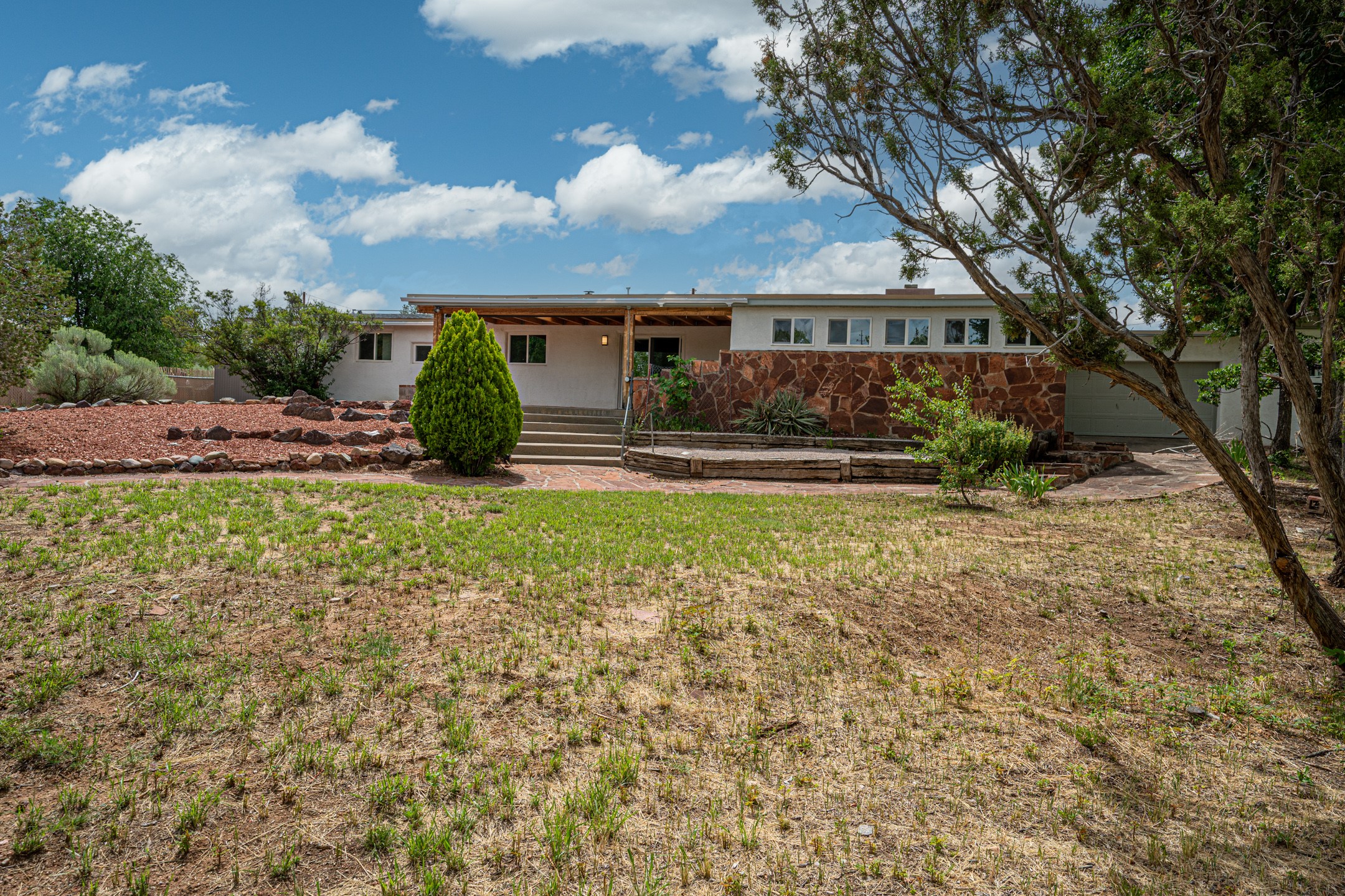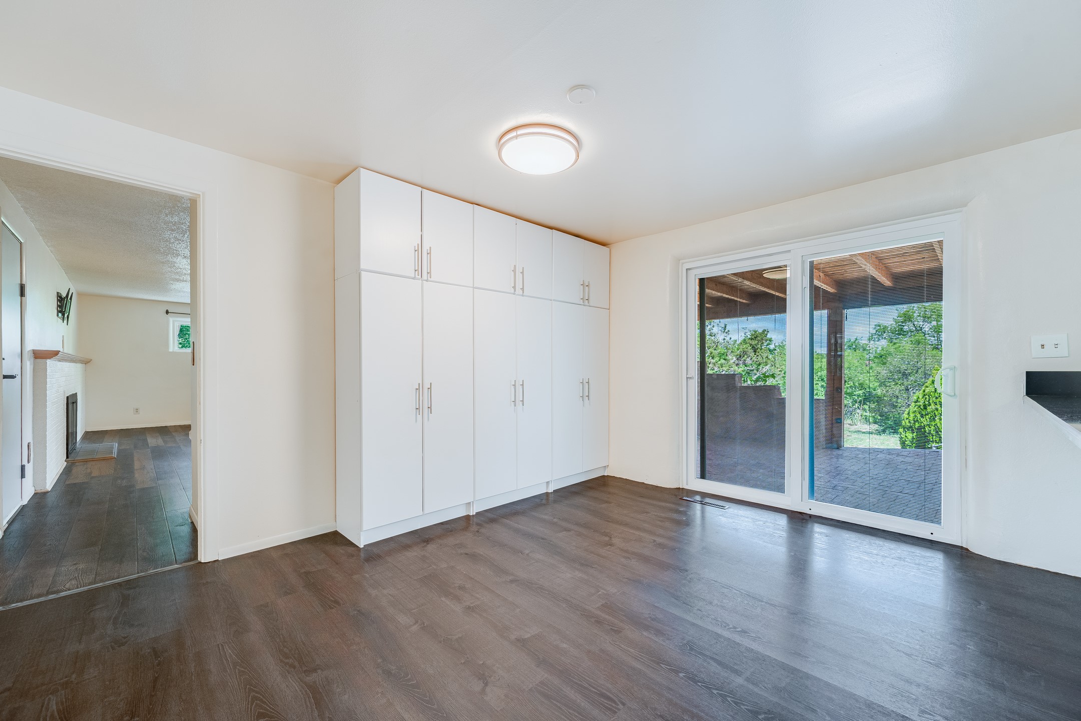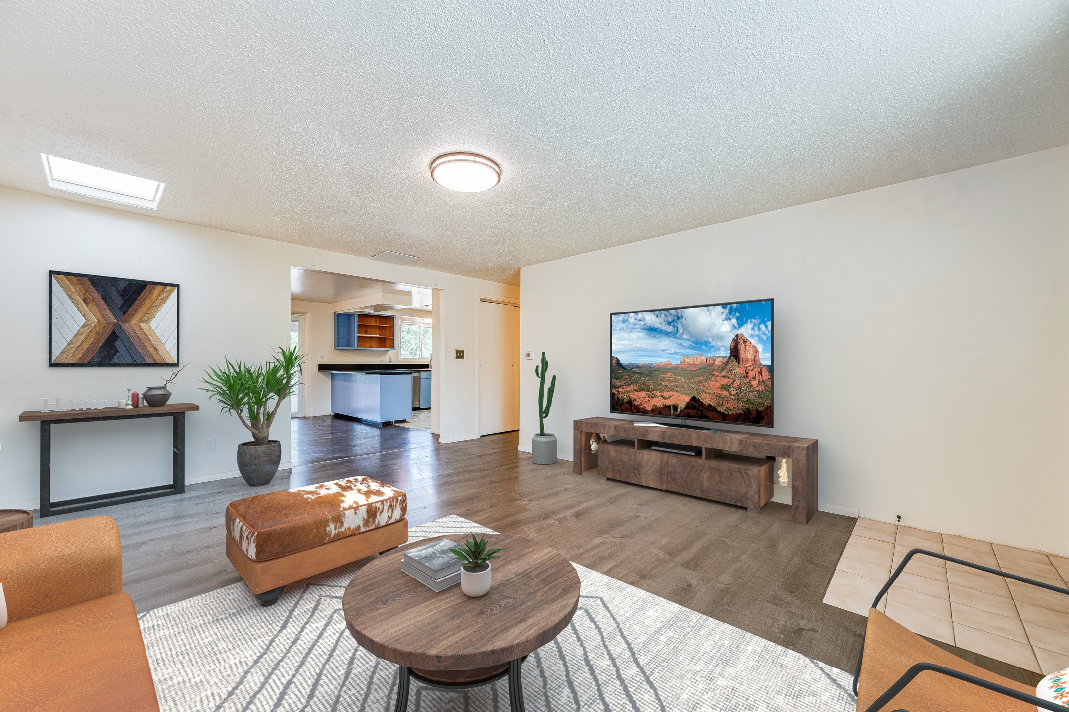 This inviting single level, ranch-style home is sited on nearly 3/4 of an acre in the heart of Santa Fe. The 1916 sqft floor plan features four-bedrooms, three-bathrooms, formal living, dining, den with wood-burning fireplace, and insulated sun room with hot tub. The extensive list of upgrades includes a refreshed kitchen with newer stainless steel appliances and countertops, new windows and flooring throughout, fresh paint, upgraded electrical, on-demand water heaters, and central A/C. Generous living spaces are enhanced by a large rear portal, accessible through sliding doors from the kitchen and French doors from the sunroom, where landscaped grounds create a natural oasis beneath the shade of mature trees. Need more to love? A 466 sqft studio provides added versatility for extended stays or creative use. This bonus space has high ceilings, a mini-split, and is plumbed for a kitchen. Complete with RV hookups in the third garage bay, this R-5 zoned property provides further development by a savvy and value-oriented buyer. Proximity to a neighborhood park and Santa Fe High School, the mid-town location is perfect for easy commutes. This move-in ready charmer of a property offers comfort, versatility, and space in spades.