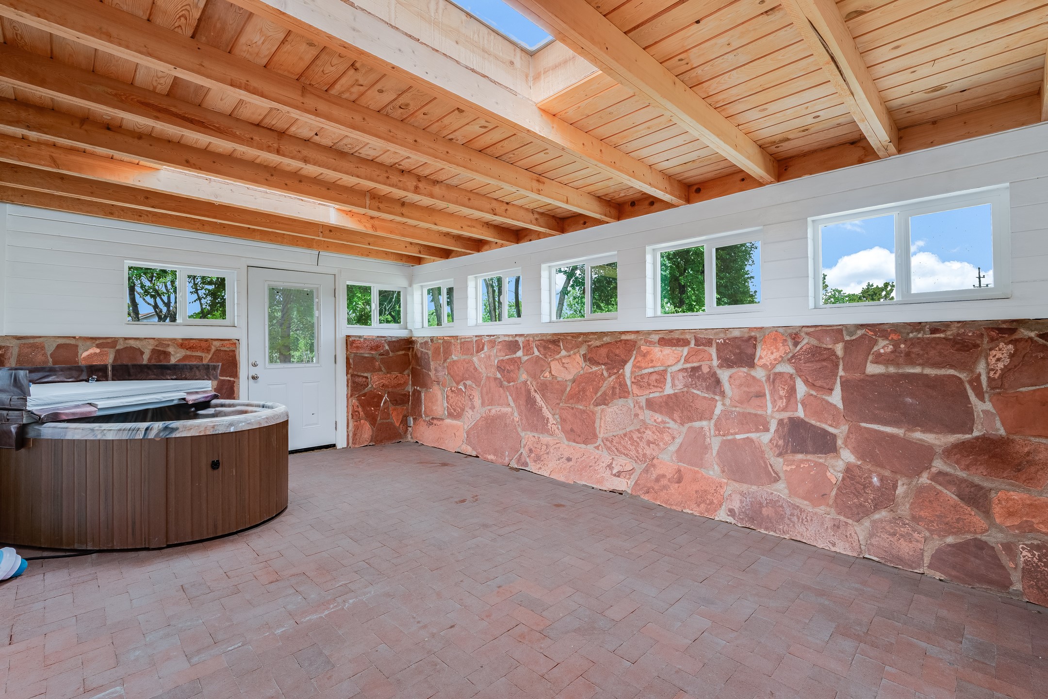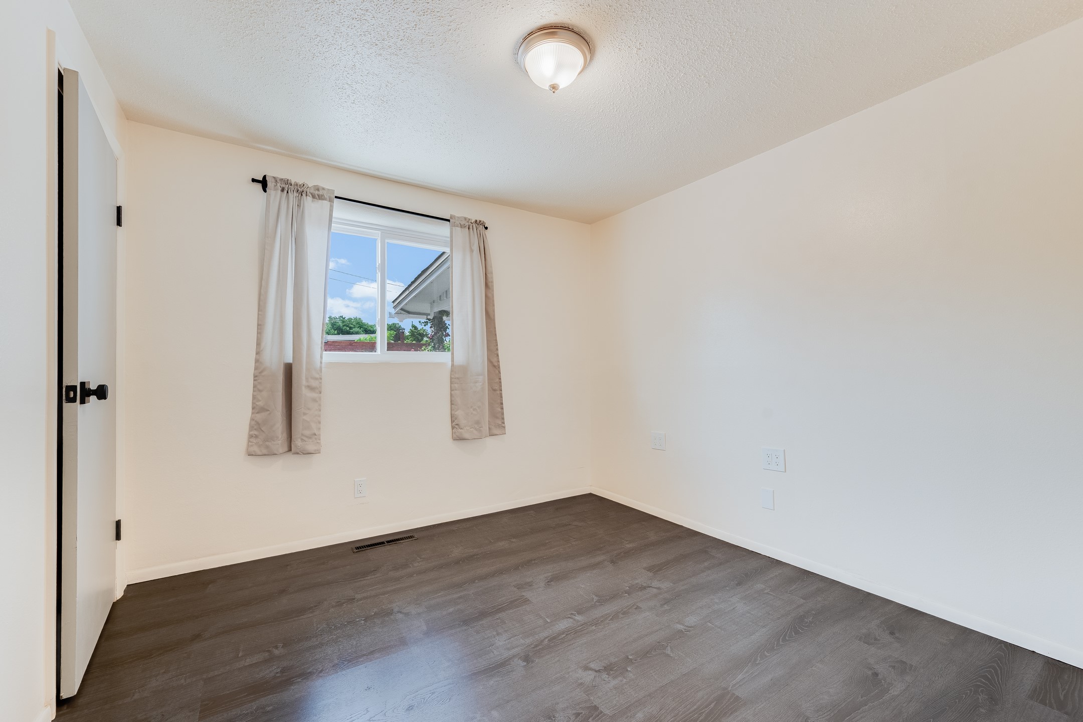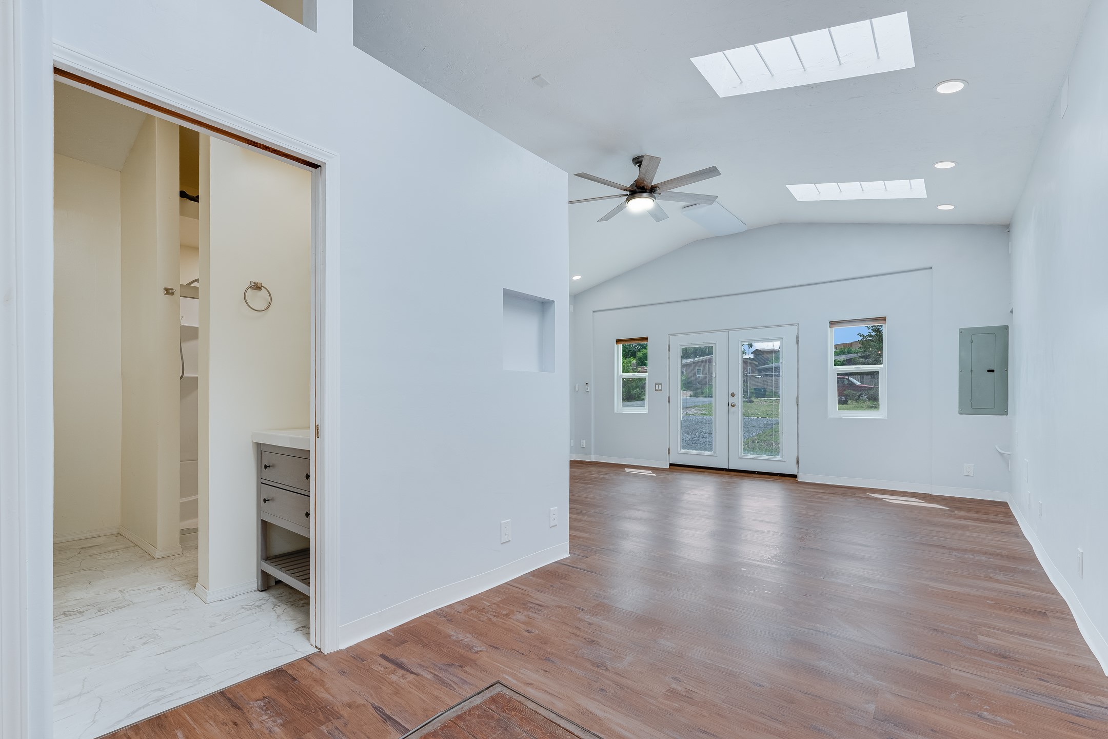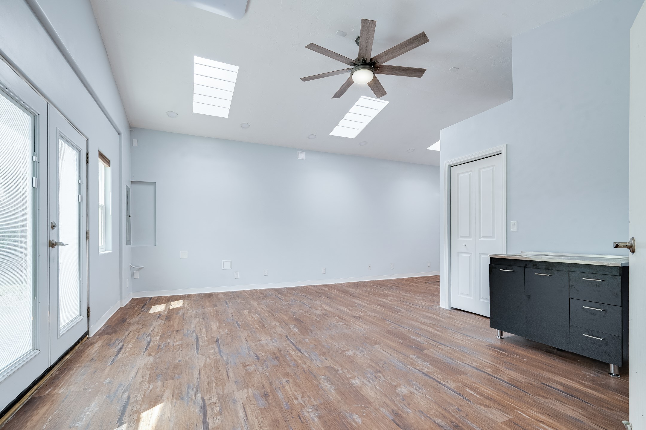 This inviting single level, ranch-style home is sited on nearly 3/4 of an acre in the heart of Santa Fe. The 1916 sqft floor plan features four-bedrooms, three-bathrooms, formal living, dining, den with wood-burning fireplace, and insulated sun room with hot tub. The extensive list of upgrades includes a refreshed kitchen with newer stainless steel appliances and countertops, new windows and flooring throughout, fresh paint, upgraded electrical, on-demand water heaters, and central A/C. Generous living spaces are enhanced by a large rear portal, accessible through sliding doors from the kitchen and French doors from the sunroom, where landscaped grounds create a natural oasis beneath the shade of mature trees. Need more to love? A 466 sqft studio provides added versatility for extended stays or creative use. This bonus space has high ceilings, a mini-split, and is plumbed for a kitchen. Complete with RV hookups in the third garage bay, this R-5 zoned property provides further development by a savvy and value-oriented buyer. Proximity to a neighborhood park and Santa Fe High School, the mid-town location is perfect for easy commutes. This move-in ready charmer of a property offers comfort, versatility, and space in spades.