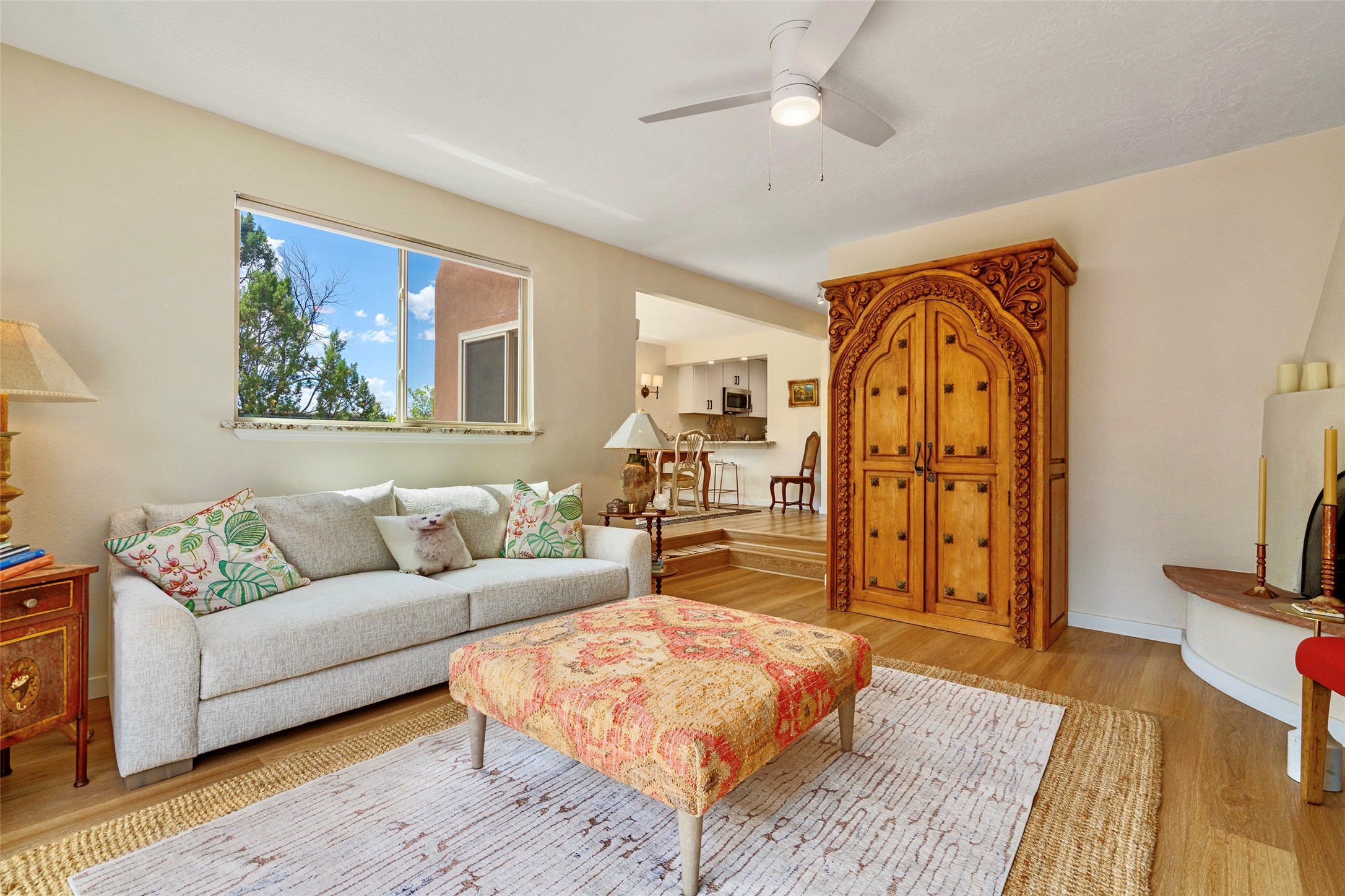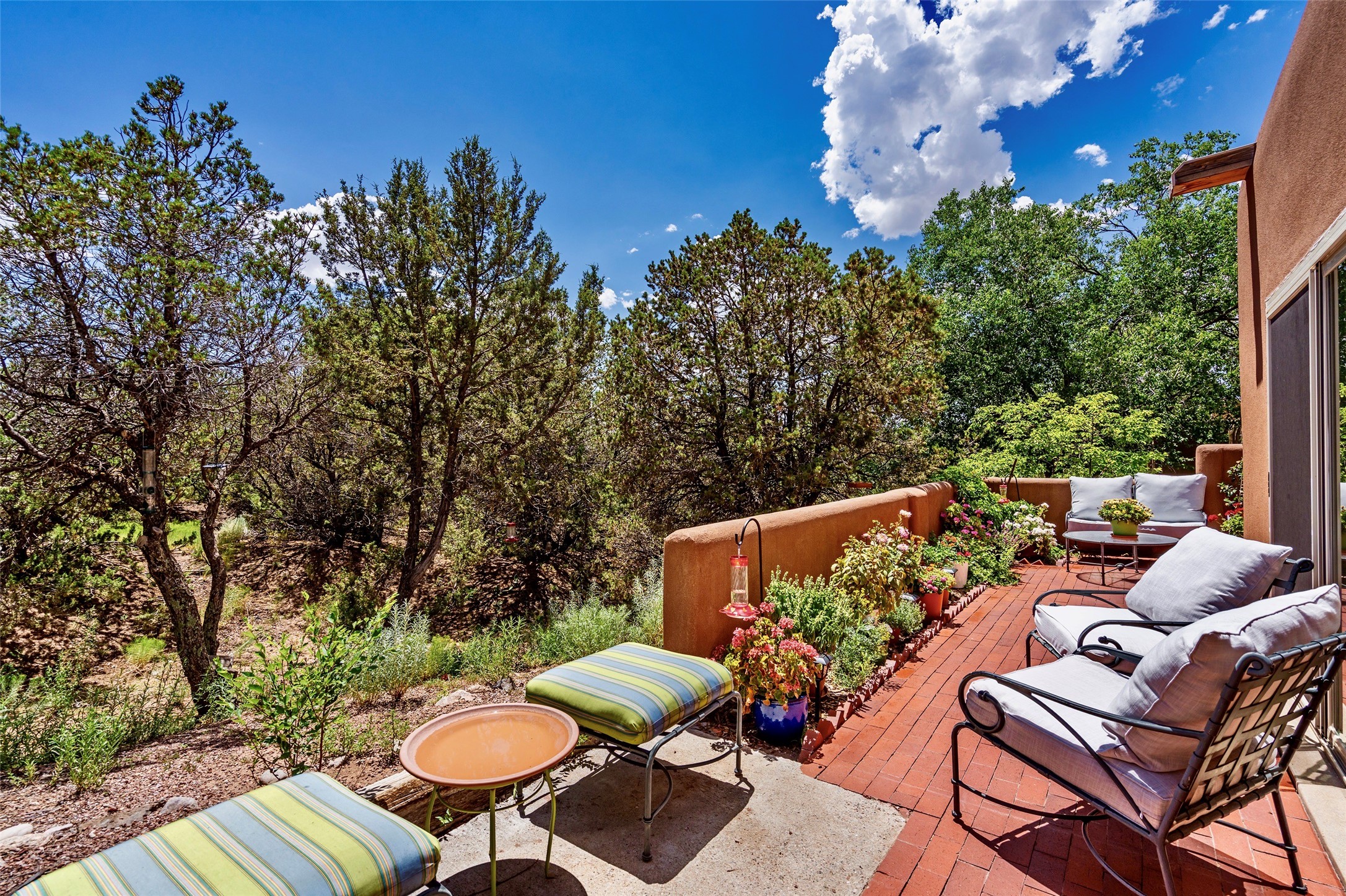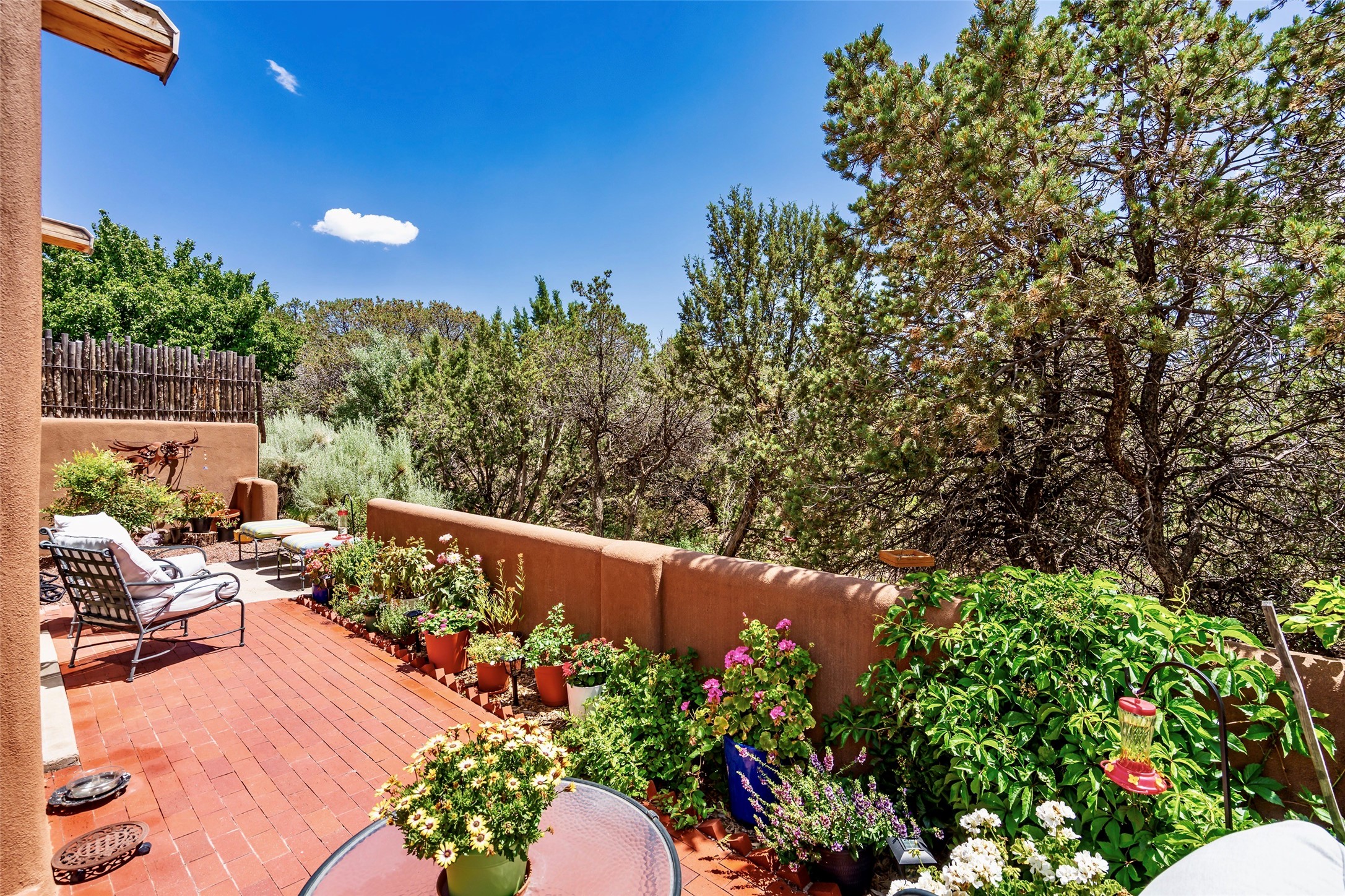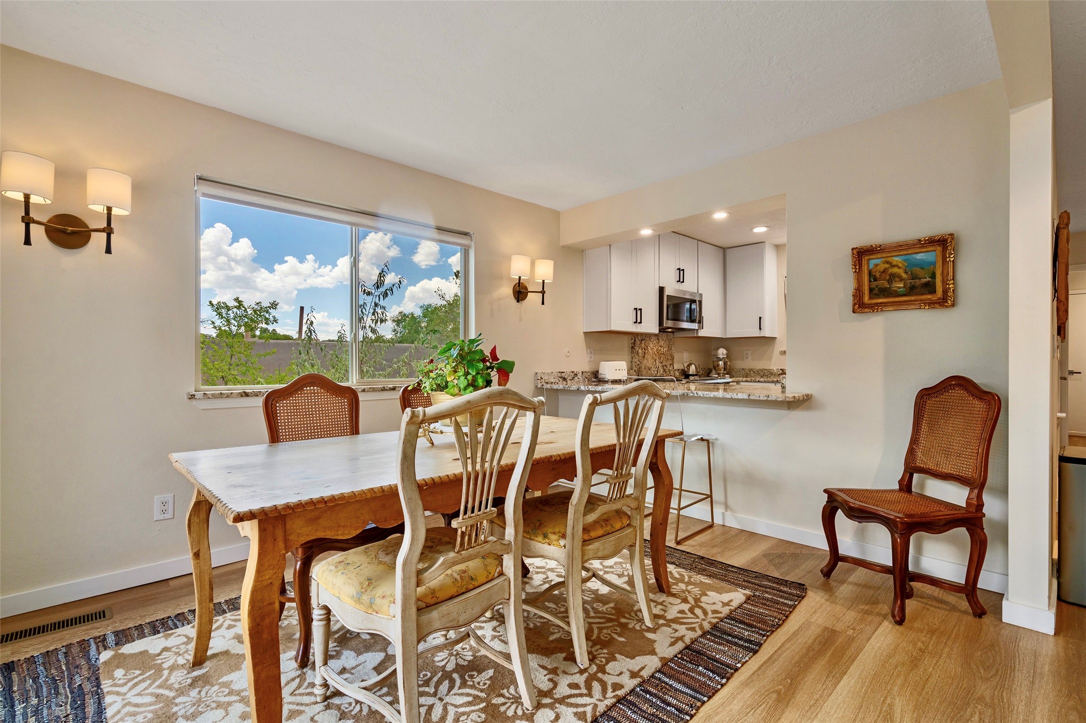 Wonderful, single level, free standing, city townhome just a stones throw to Marcy Park, tennis, pickleball and the Plaza with many downtown galleries and restaurants. One of few units in Valle Del Sol that backs up to green space, with many conifers surrounding the residence, creating a serene sense of place and privacy from the home and deck. Fabulous remodel just 2 years old. Newer roof, windows, kitchen, baths & HVAC and flooring! Nice open floor plan with great ambient light and views toward the Sandia Mountain Range. This townhome feels very much like a single family with great privacy, super location, all literally minutes from everything and no HOA. Excellent value. A must see!