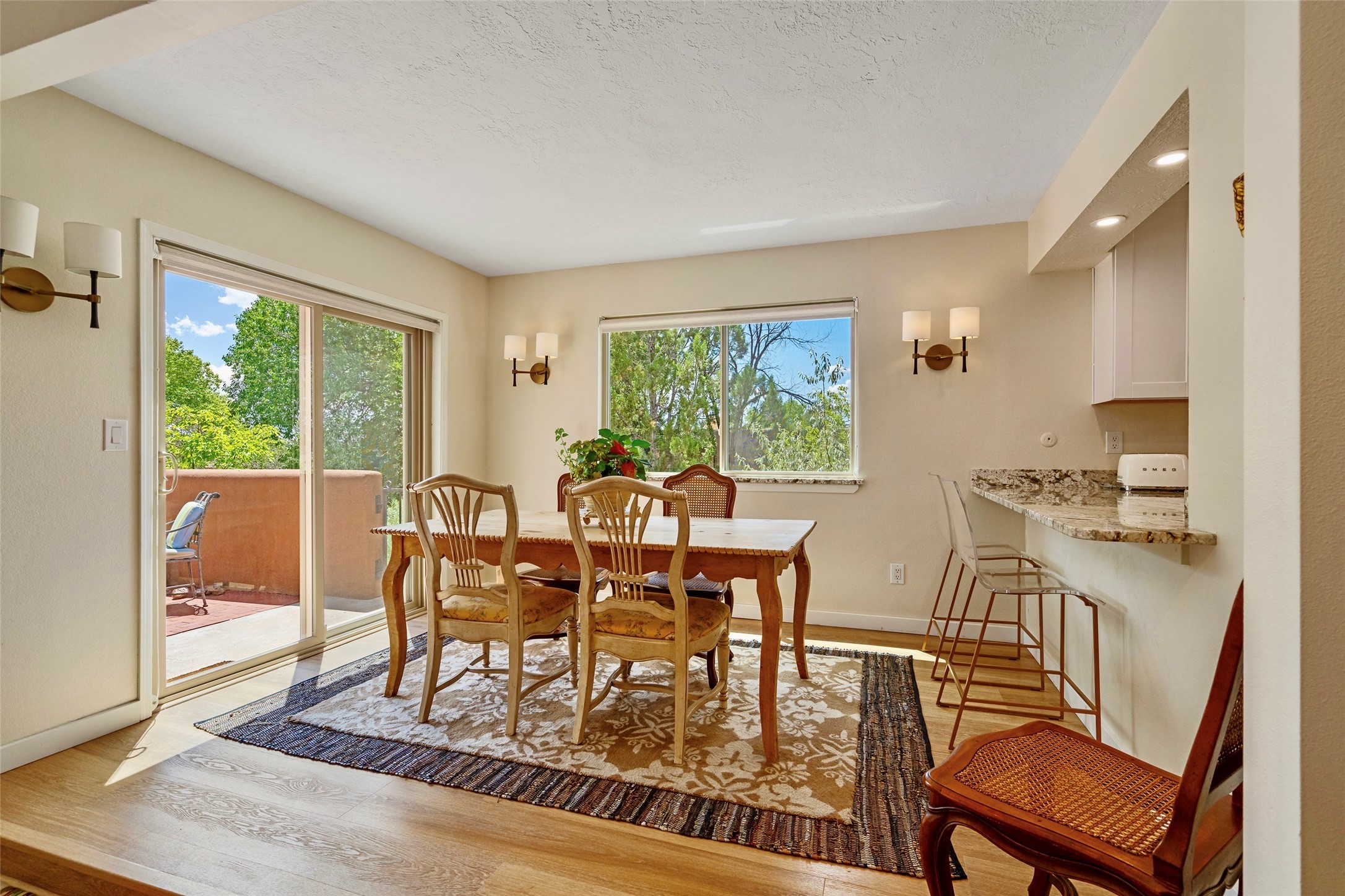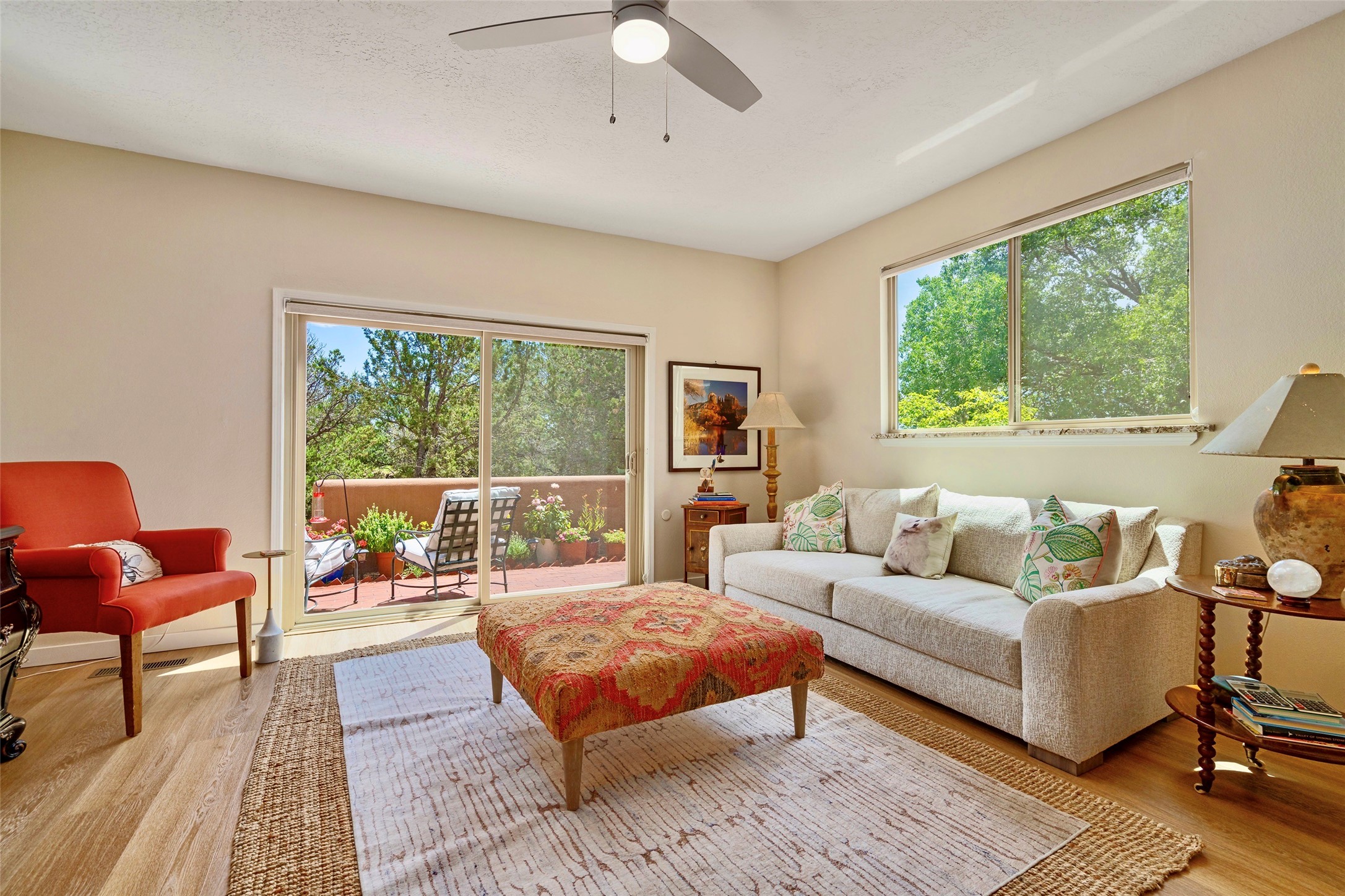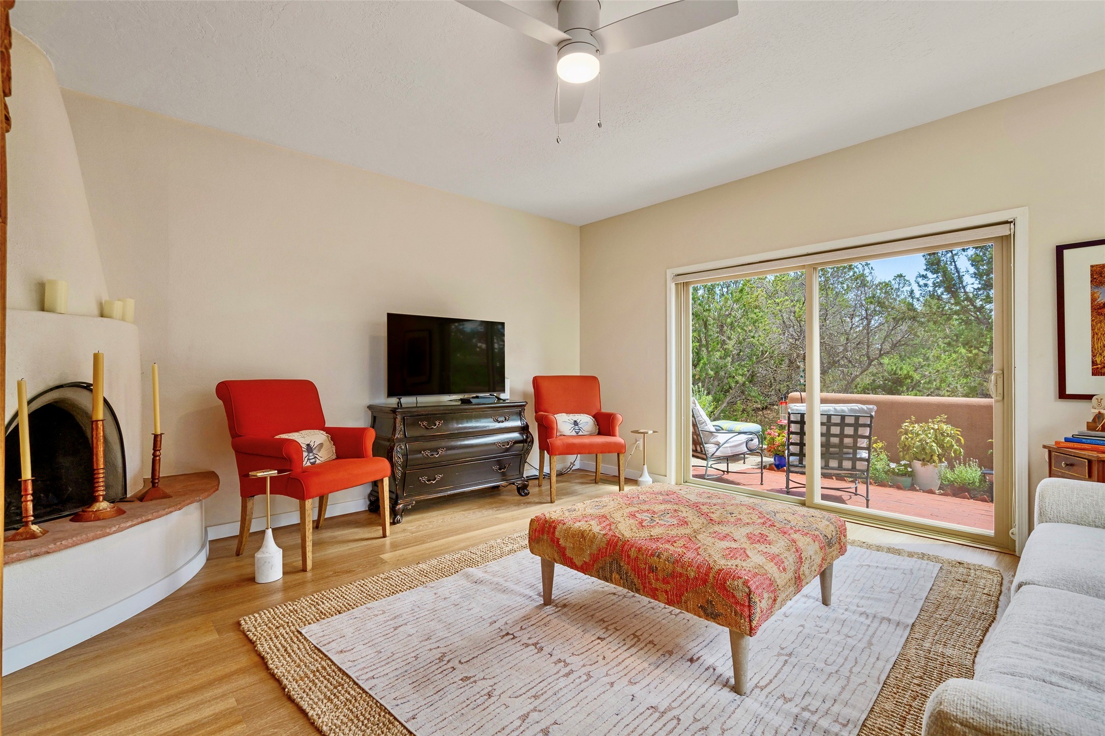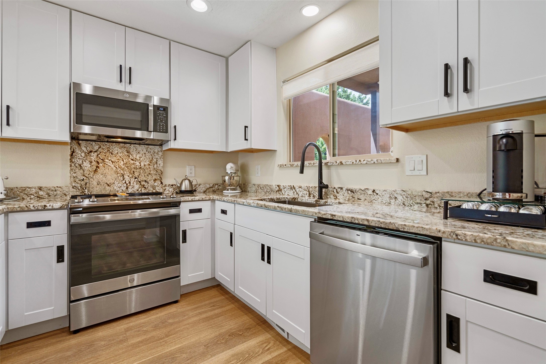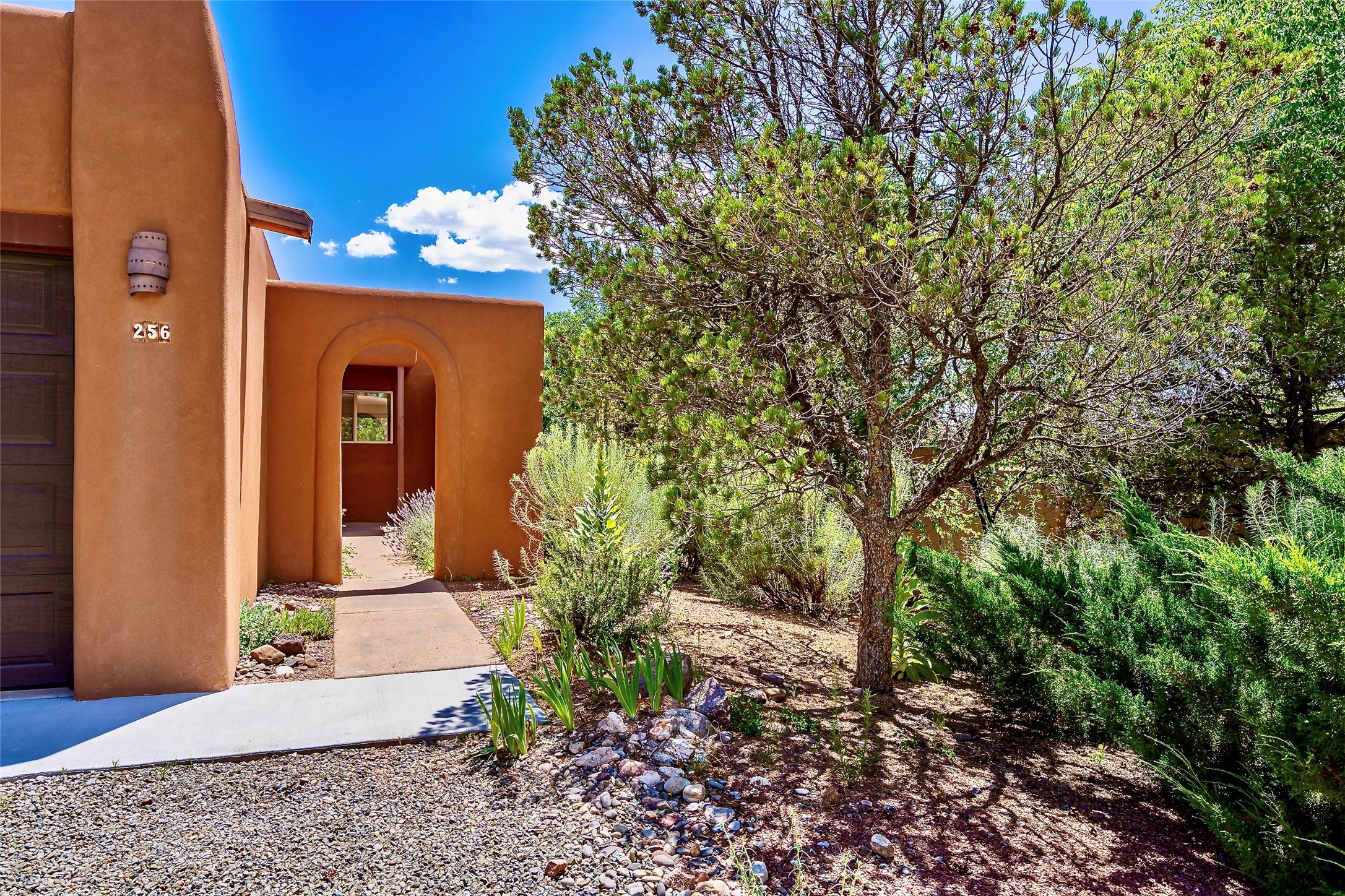 Wonderful, single level, free standing, city townhome just a stones throw to Marcy Park, tennis, pickleball and the Plaza with many downtown galleries and restaurants. One of few units in Valle Del Sol that backs up to green space, with many conifers surrounding the residence, creating a serene sense of place and privacy from the home and deck. Fabulous remodel just 2 years old. Newer roof, windows, kitchen, baths & HVAC and flooring! Nice open floor plan with great ambient light and views toward the Sandia Mountain Range. This townhome feels very much like a single family with great privacy, super location, all literally minutes from everything and no HOA. Excellent value. A must see!