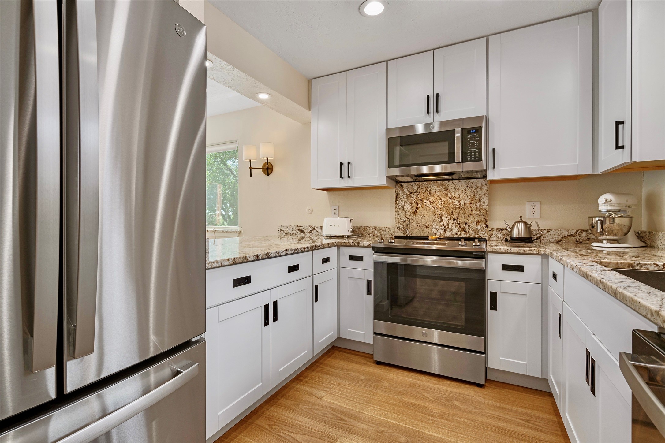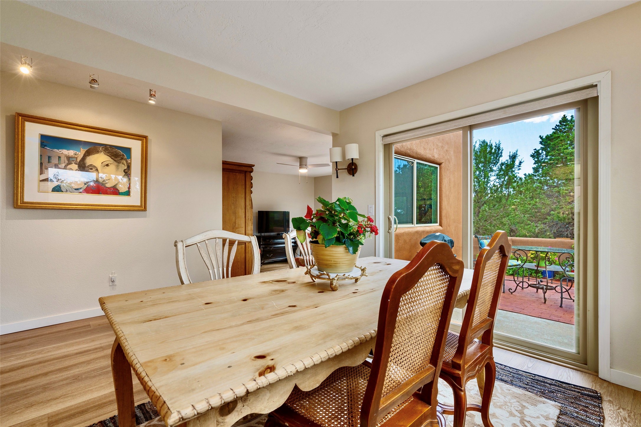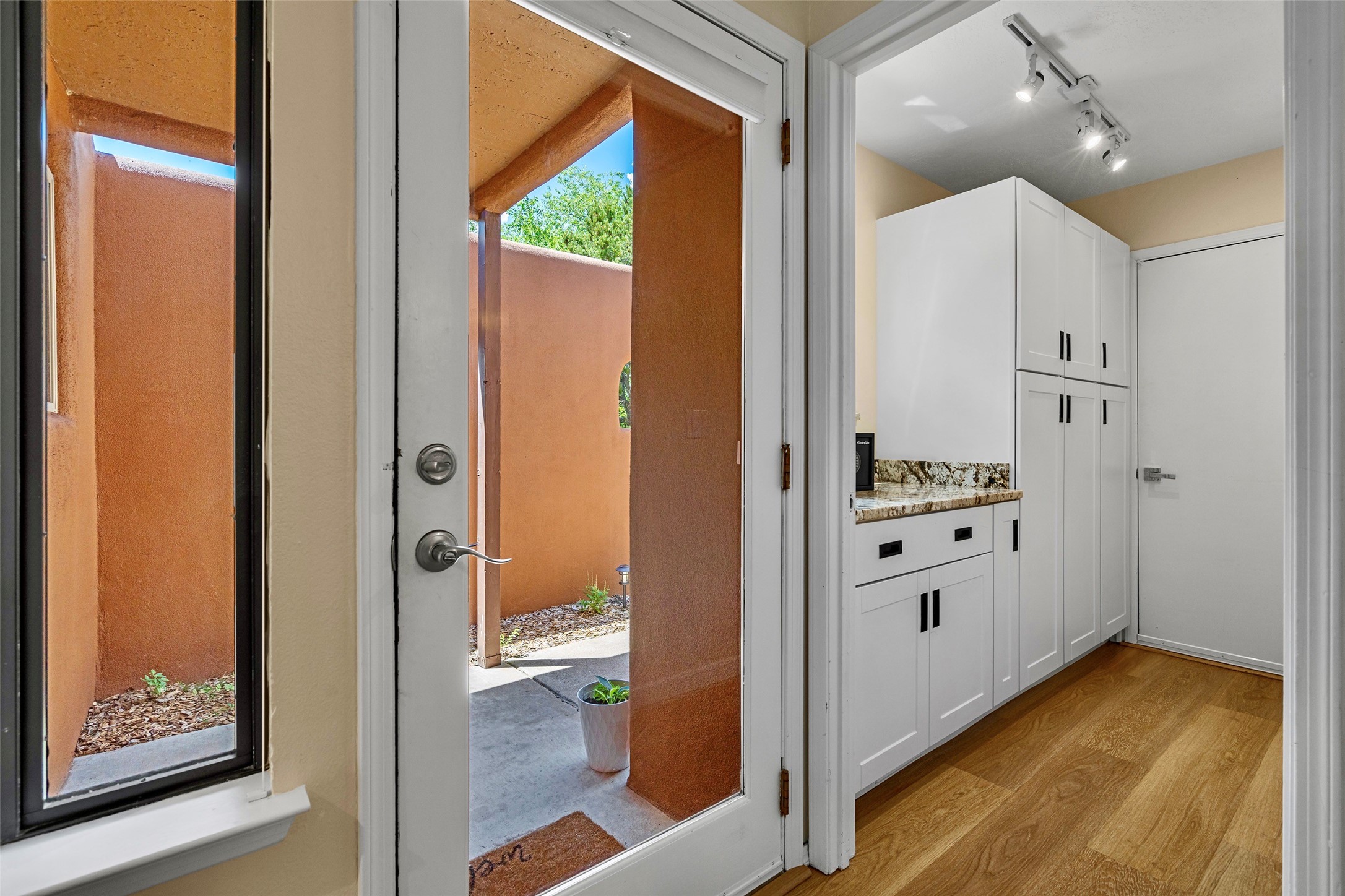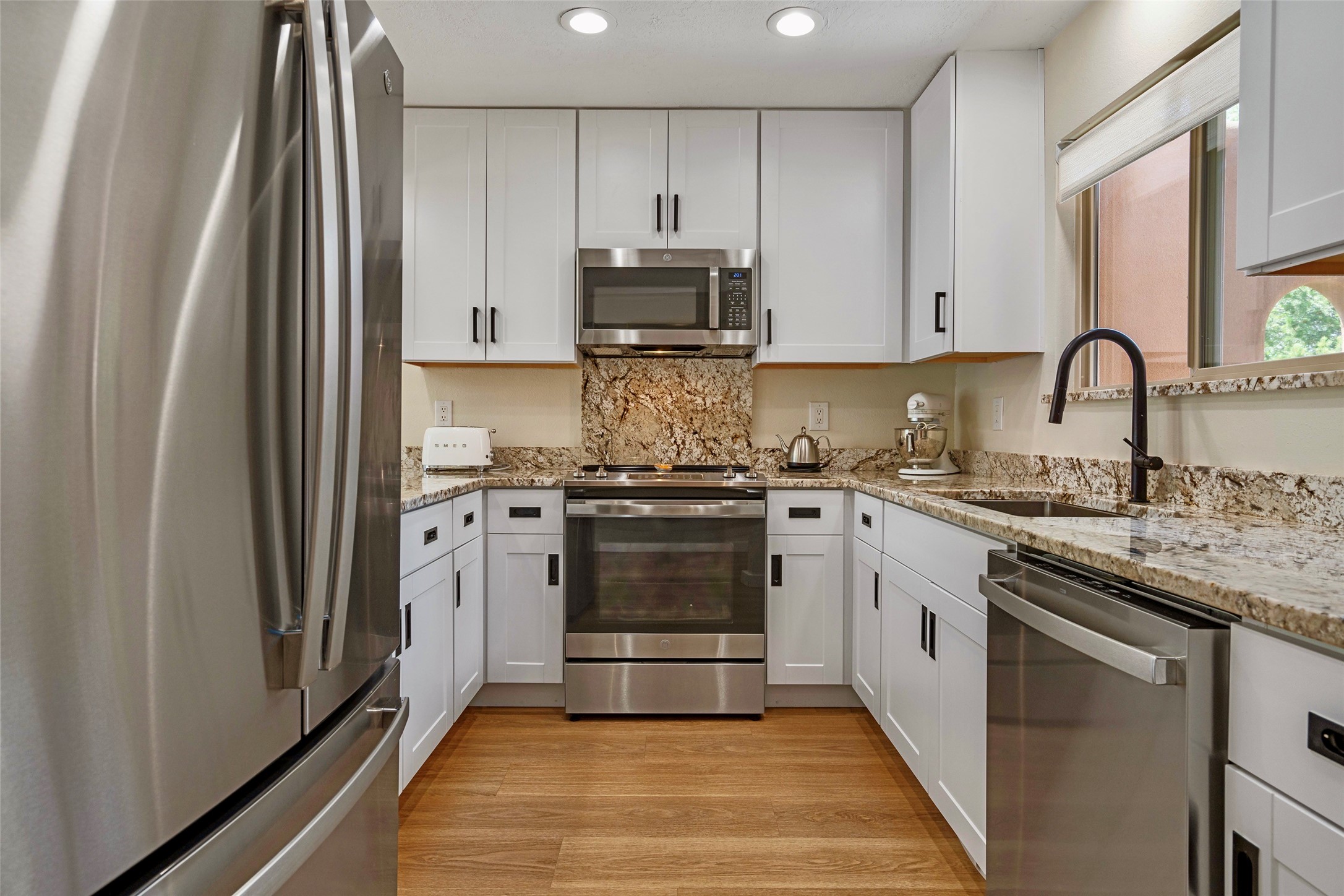 Wonderful, single level, free standing, city townhome just a stones throw to Marcy Park, tennis, pickleball and the Plaza with many downtown galleries and restaurants. One of few units in Valle Del Sol that backs up to green space, with many conifers surrounding the residence, creating a serene sense of place and privacy from the home and deck. Fabulous remodel just 2 years old. Newer roof, windows, kitchen, baths & HVAC and flooring! Nice open floor plan with great ambient light and views toward the Sandia Mountain Range. This townhome feels very much like a single family with great privacy, super location, all literally minutes from everything and no HOA. Excellent value. A must see!