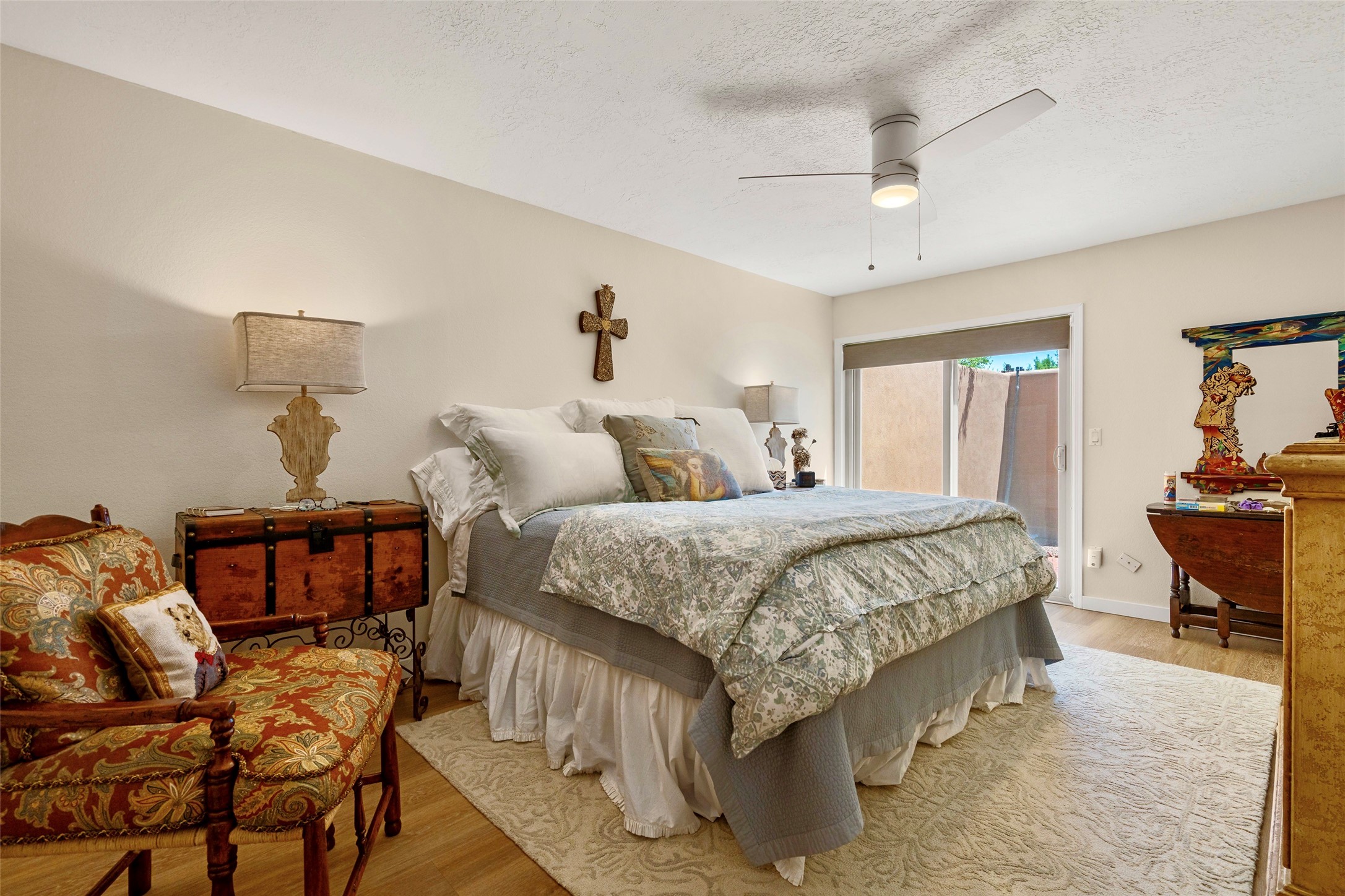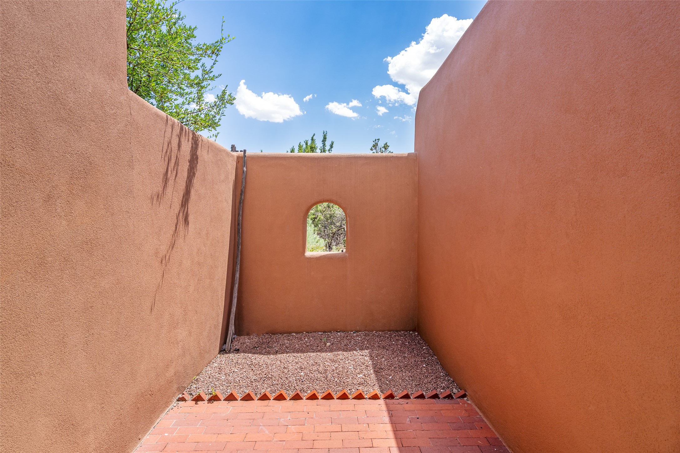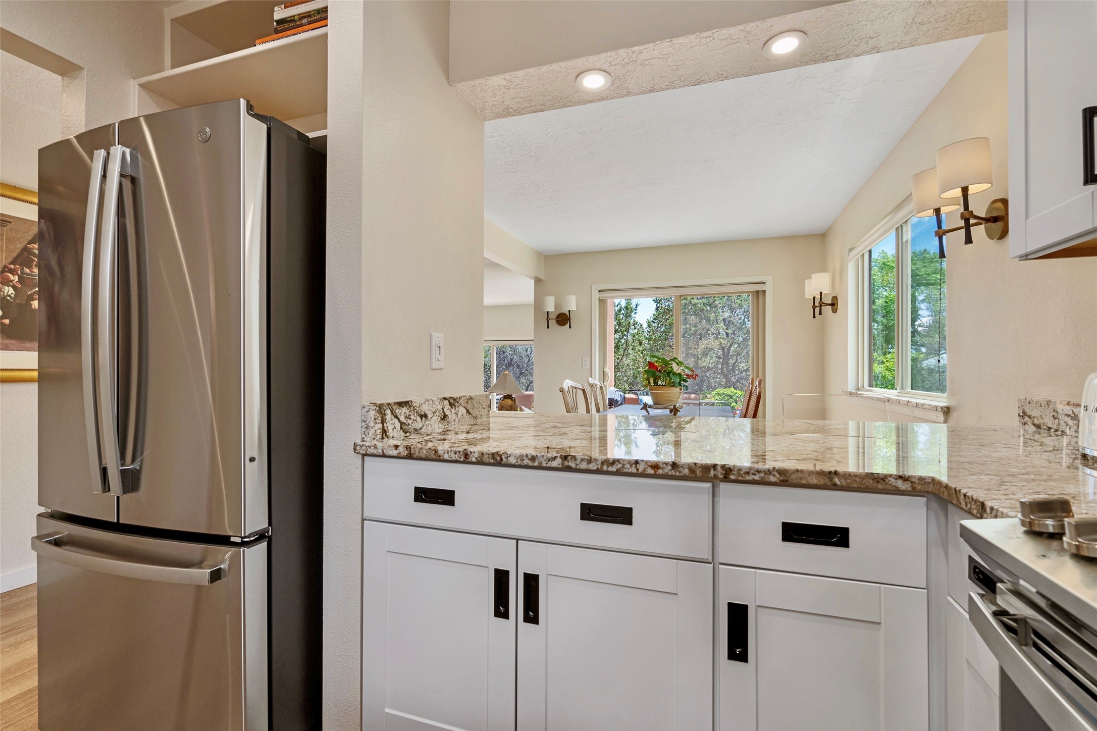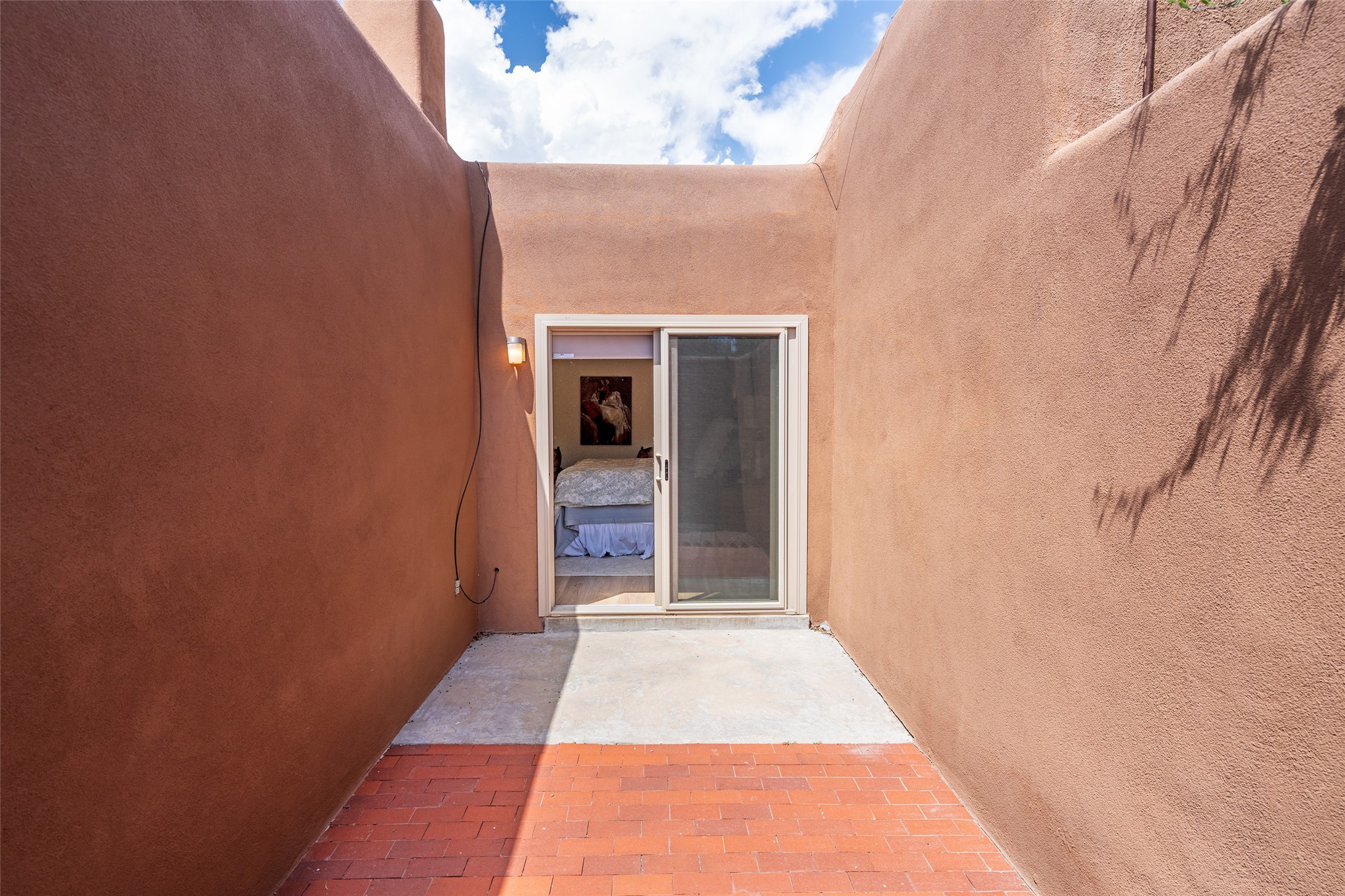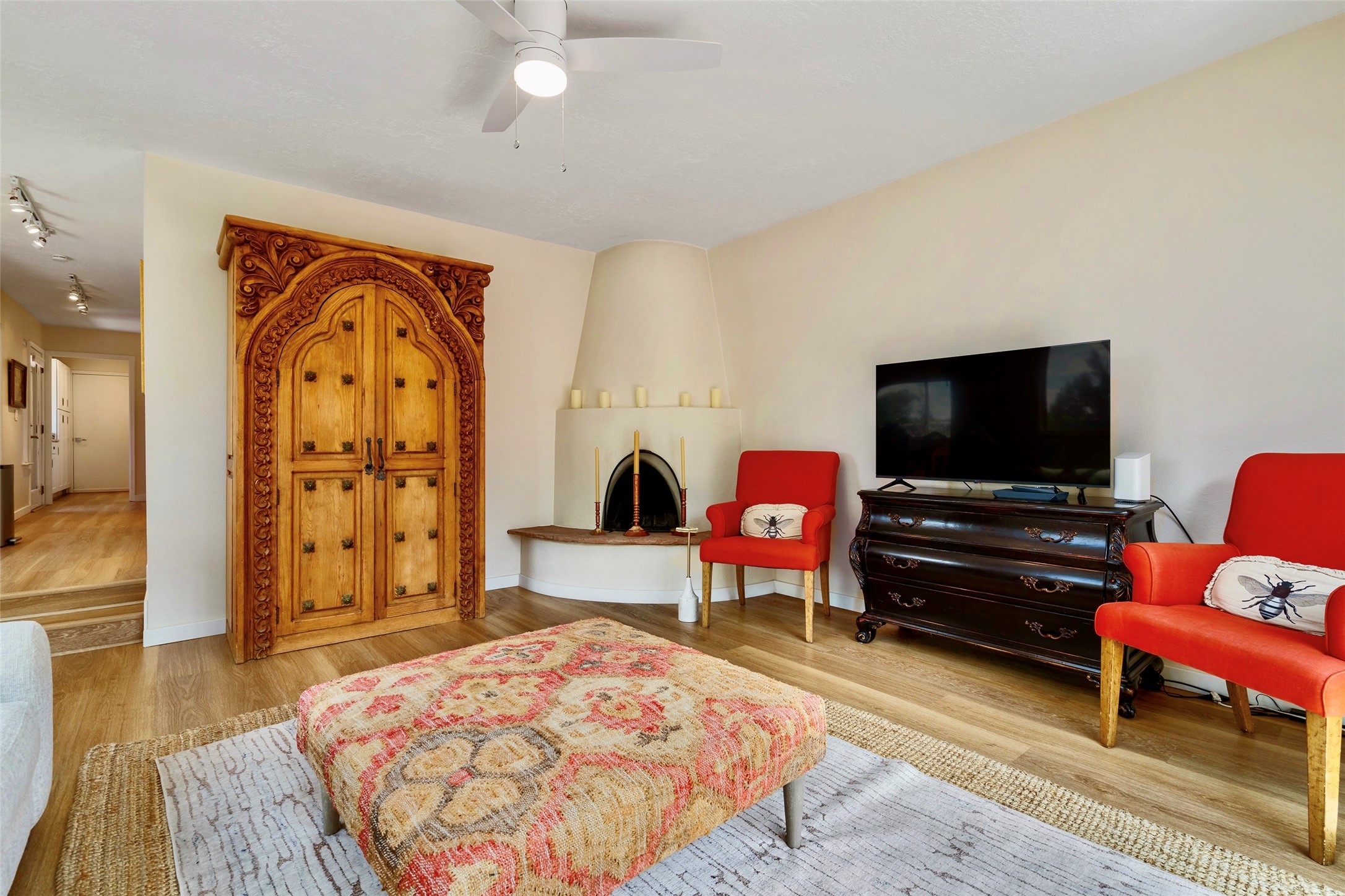 Wonderful, single level, free standing, city townhome just a stones throw to Marcy Park, tennis, pickleball and the Plaza with many downtown galleries and restaurants. One of few units in Valle Del Sol that backs up to green space, with many conifers surrounding the residence, creating a serene sense of place and privacy from the home and deck. Fabulous remodel just 2 years old. Newer roof, windows, kitchen, baths & HVAC and flooring! Nice open floor plan with great ambient light and views toward the Sandia Mountain Range. This townhome feels very much like a single family with great privacy, super location, all literally minutes from everything and no HOA. Excellent value. A must see!