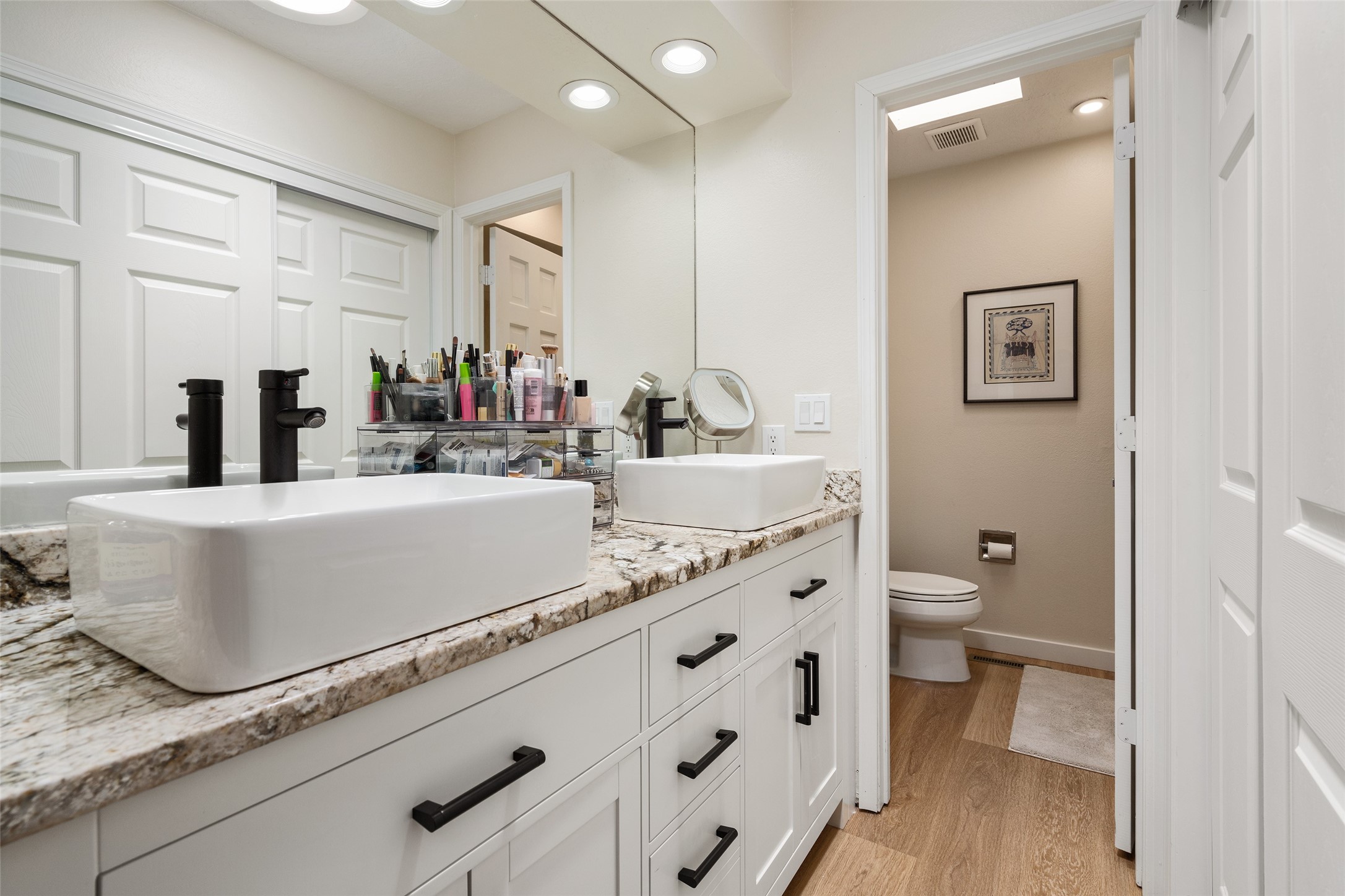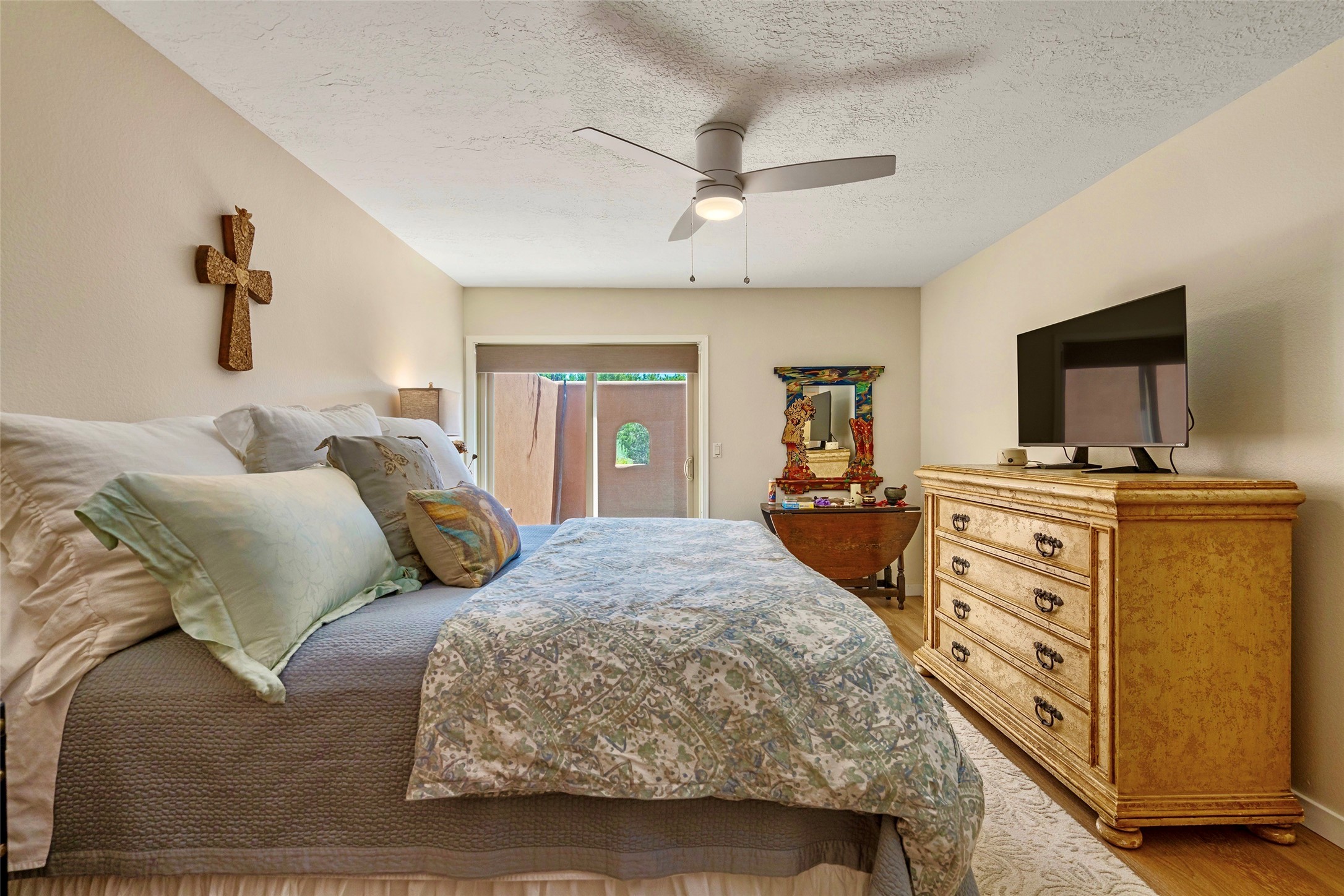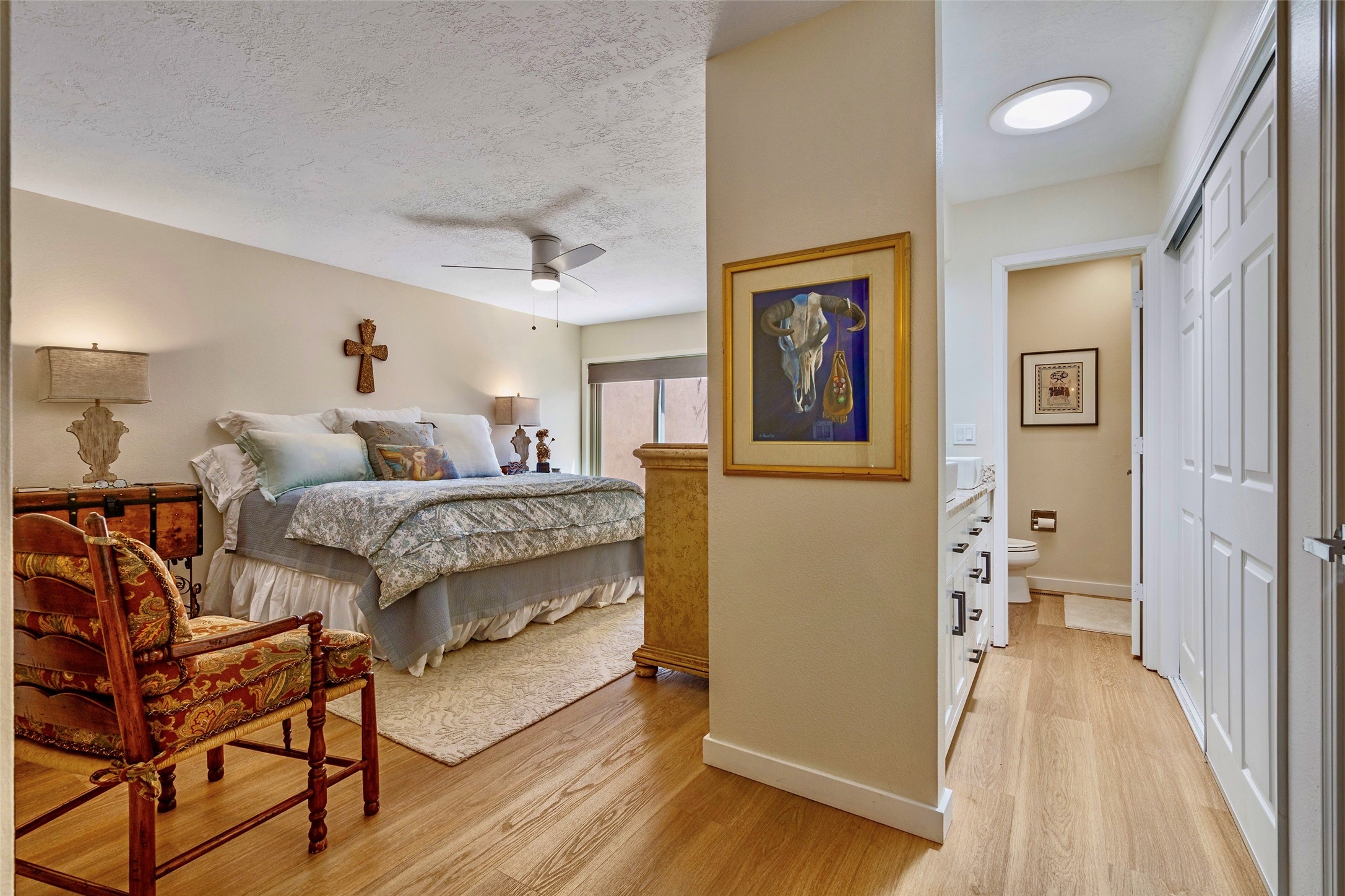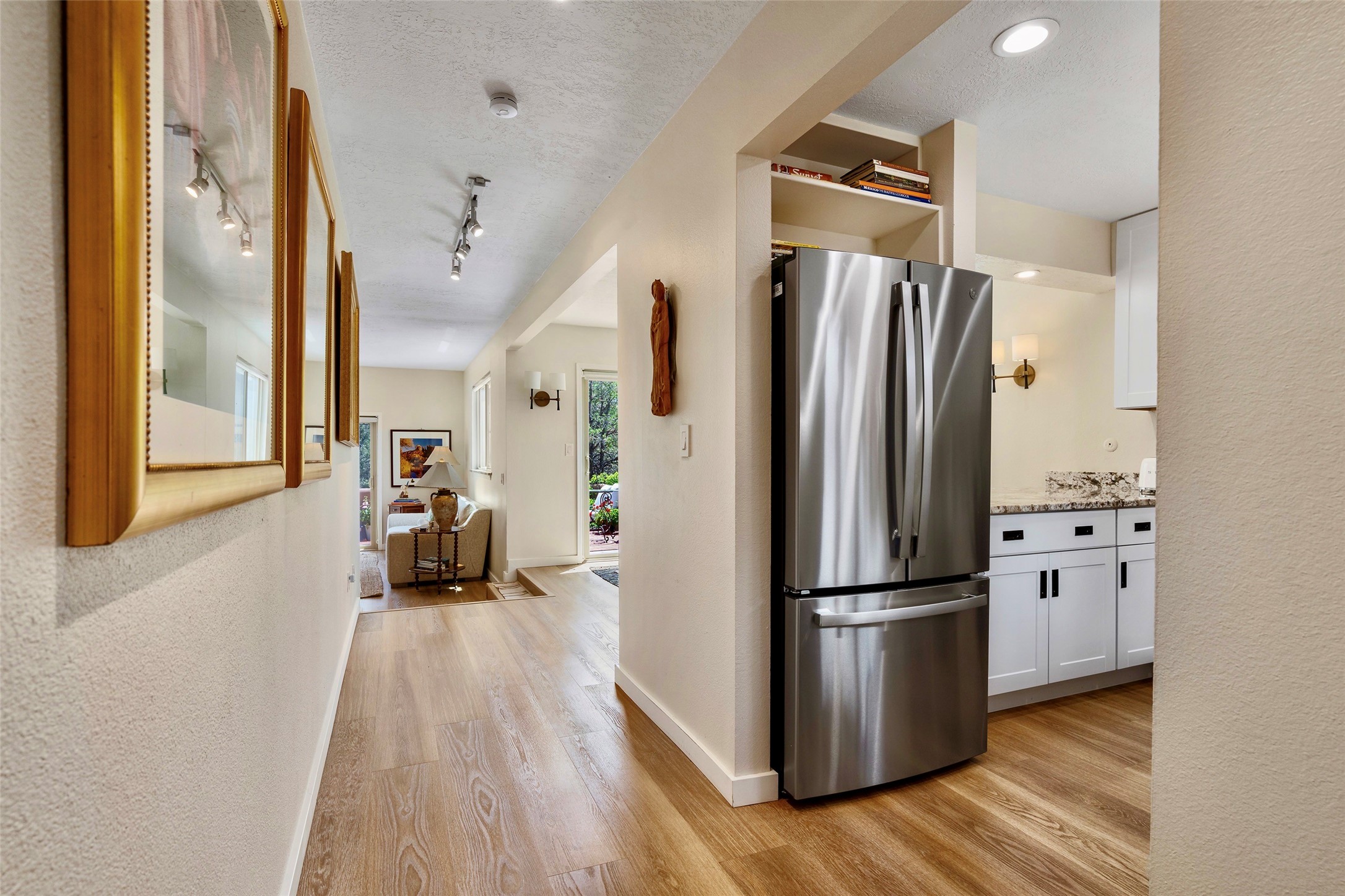 Wonderful, single level, free standing, city townhome just a stones throw to Marcy Park, tennis, pickleball and the Plaza with many downtown galleries and restaurants. One of few units in Valle Del Sol that backs up to green space, with many conifers surrounding the residence, creating a serene sense of place and privacy from the home and deck. Fabulous remodel just 2 years old. Newer roof, windows, kitchen, baths & HVAC and flooring! Nice open floor plan with great ambient light and views toward the Sandia Mountain Range. This townhome feels very much like a single family with great privacy, super location, all literally minutes from everything and no HOA. Excellent value. A must see!