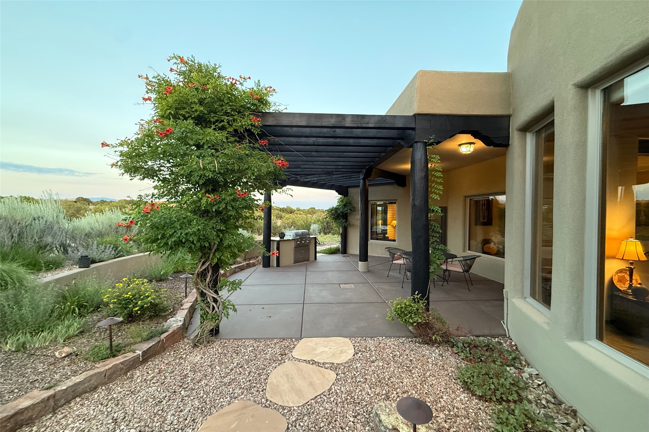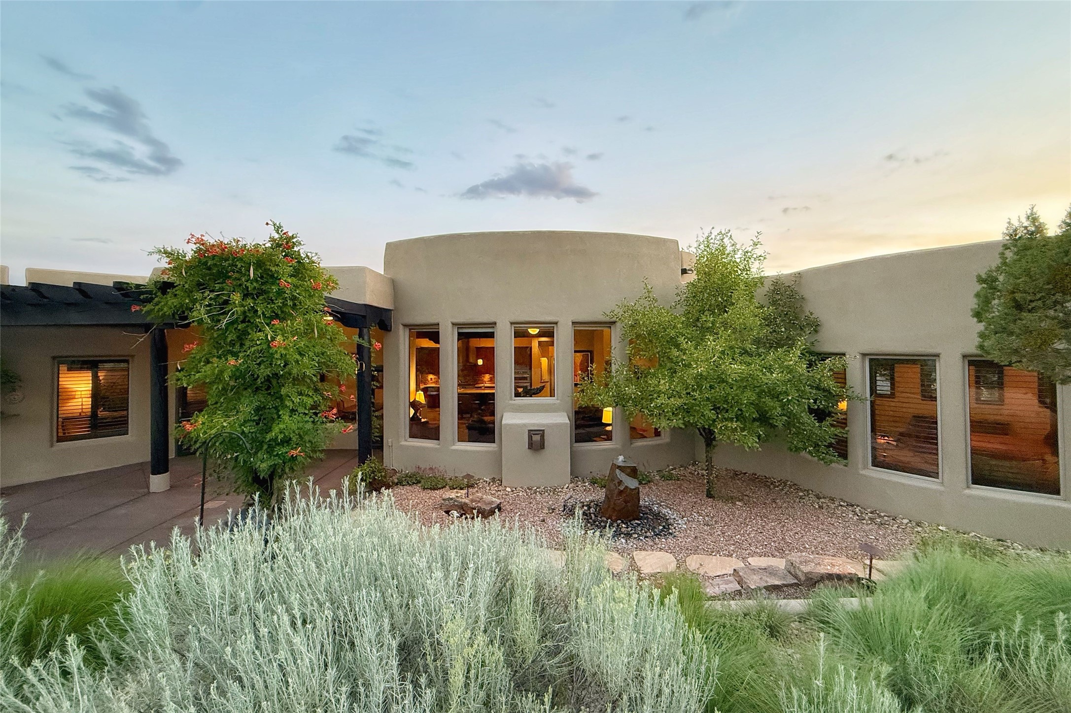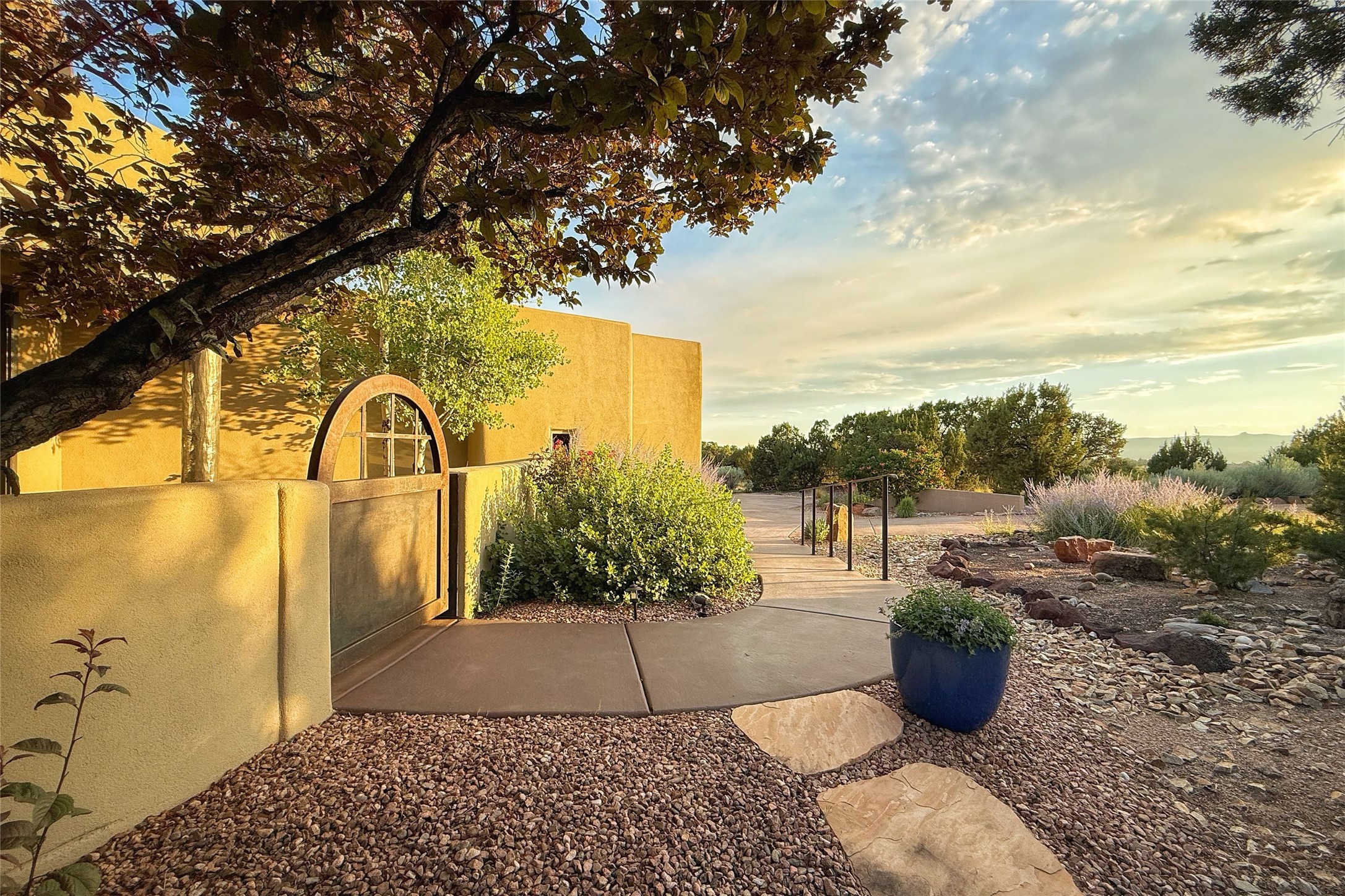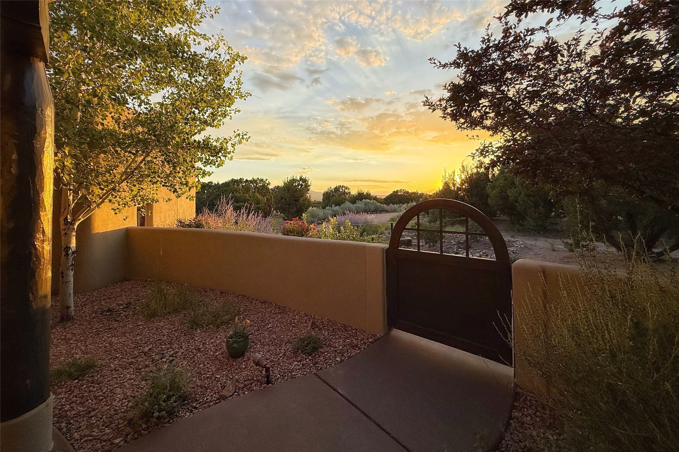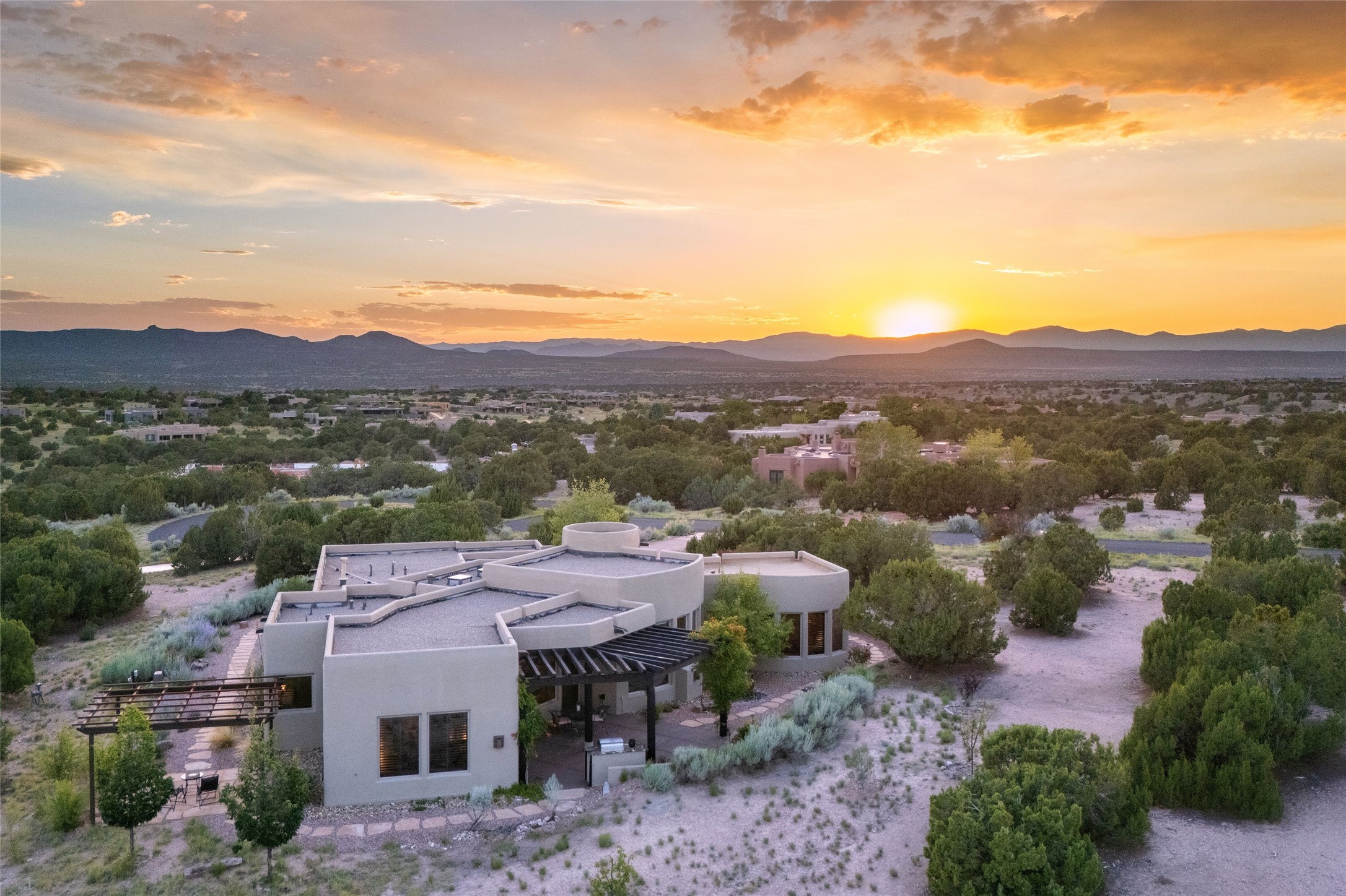 Peaceful elegance with sunset views. Welcome to a serene, custom-crafted sanctuary where timeless design meets contemporary comfort. Nestled in a quiet setting, this exceptional property offers stunning Sangre and Jemez mountain views, just minutes from the exclusive amenities of Las Campanas, including the Ranch Estates equestrian facilities. Every detail of this thoughtfully designed home reflects architectural elegance and ease of living. Distinctive arches, stained ceiling beams, and porcelain tile flooring create an inviting aesthetic. The curved hallways eliminate visible doorways in main areas, encouraging seamless, tranquil flow. The living room features an Anasazi stacked stone fireplace, expansive bay windows, and programmable remote-controlled shades. The chef's kitchen offers a large waterfall island, JennAir appliances, Fulgor range, custom cabinetry, and Anasazi stone backsplash--ideal for both daily use and stylish entertaining. A State-of-the-art sound studio capable of professional music production features hardwood flooring and was built using a sophisticated, advanced sound proofing wall spring system which effectively blocks noise and vibration transfer. The studio has a dedicated 20-amp panel, and mini split for comfort. This space would make an excellent media room for anyone! The spacious primary suite includes a gas kiva fireplace, large picture windows with Sangre views, portal access, and a spa-like bath with Caesarstone finishes, corner windows, and oversized shower. Two additional ensuite bedrooms--one with bay windows and one flex/guest space--offer comfort and versatility. Outdoor living includes a built-in grill, granite counters, water feature, and flagstone paths winding through native landscaping and a 4-cistern-fed irrigation system. Additional highlights include custom wood shutters on all windows, skylights throughout, stained doors/baseboards, new paint, and new tankless water heater. A rare blend of elegance, privacy, and ease.