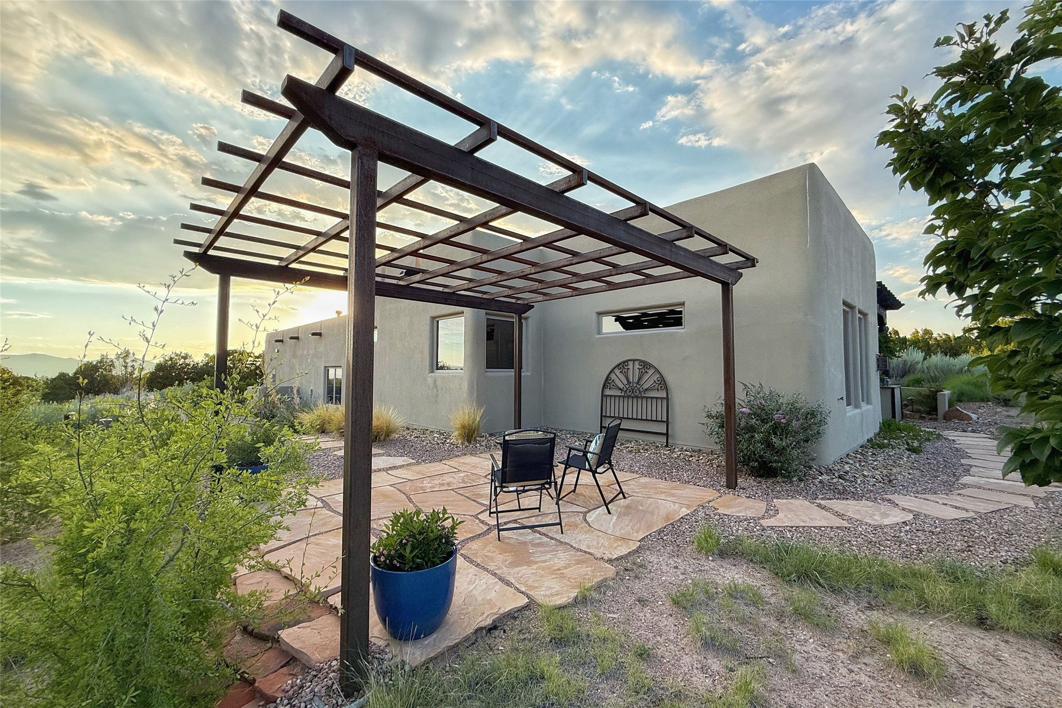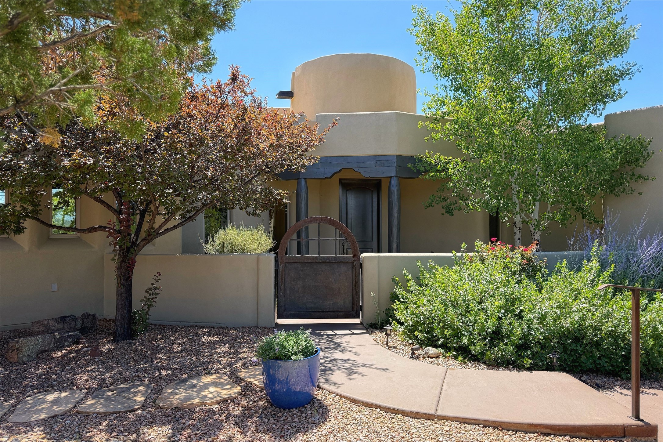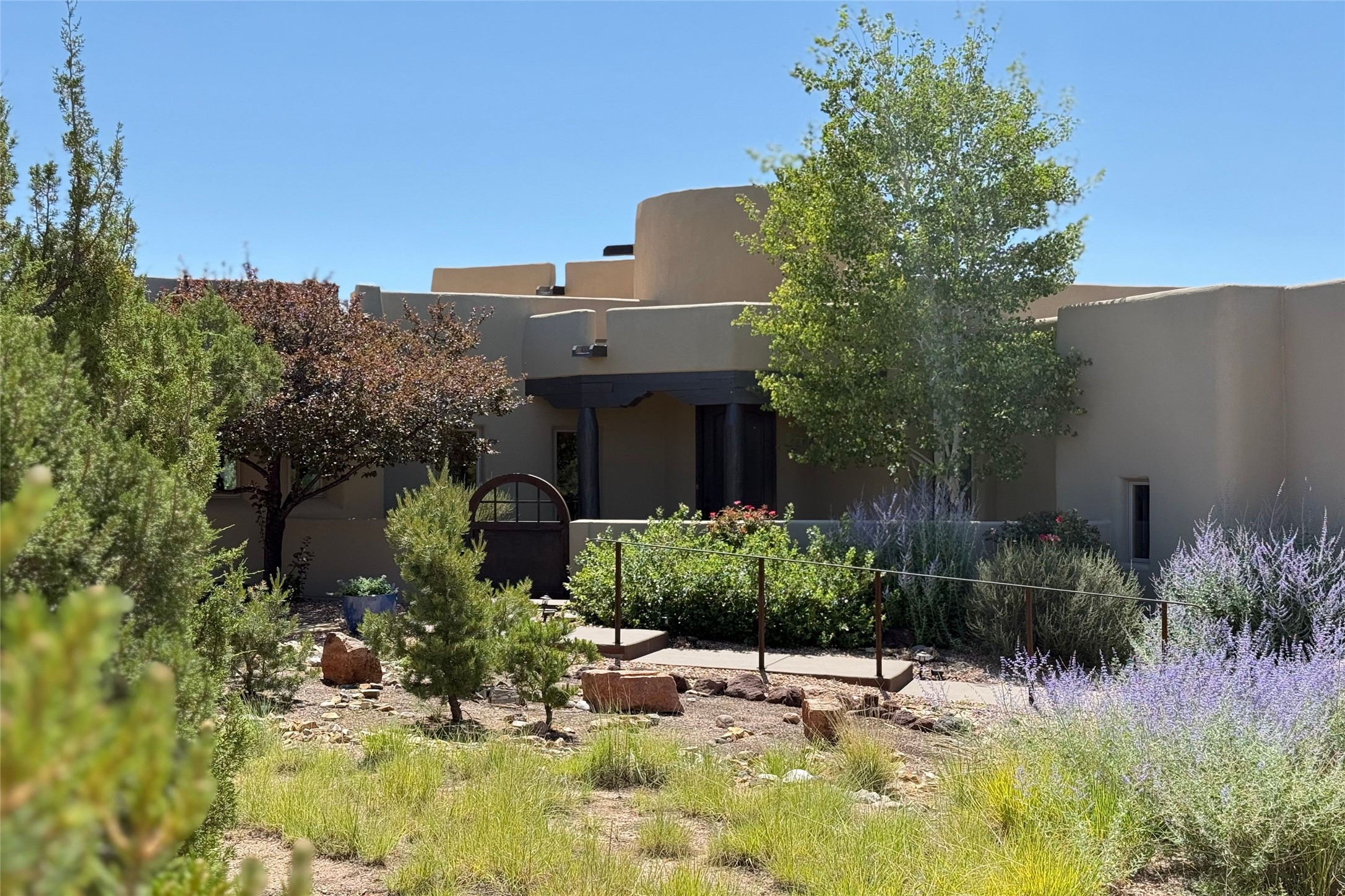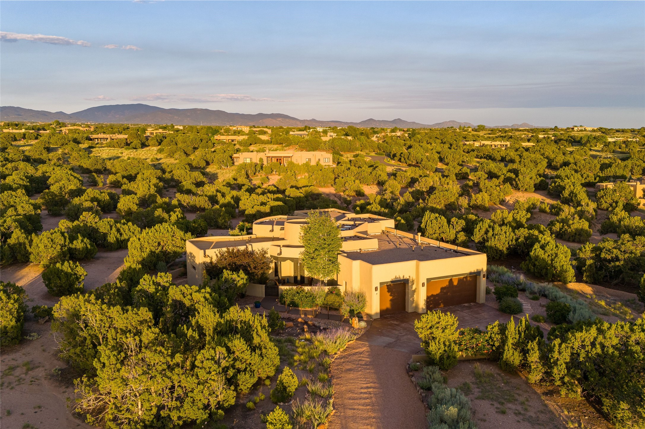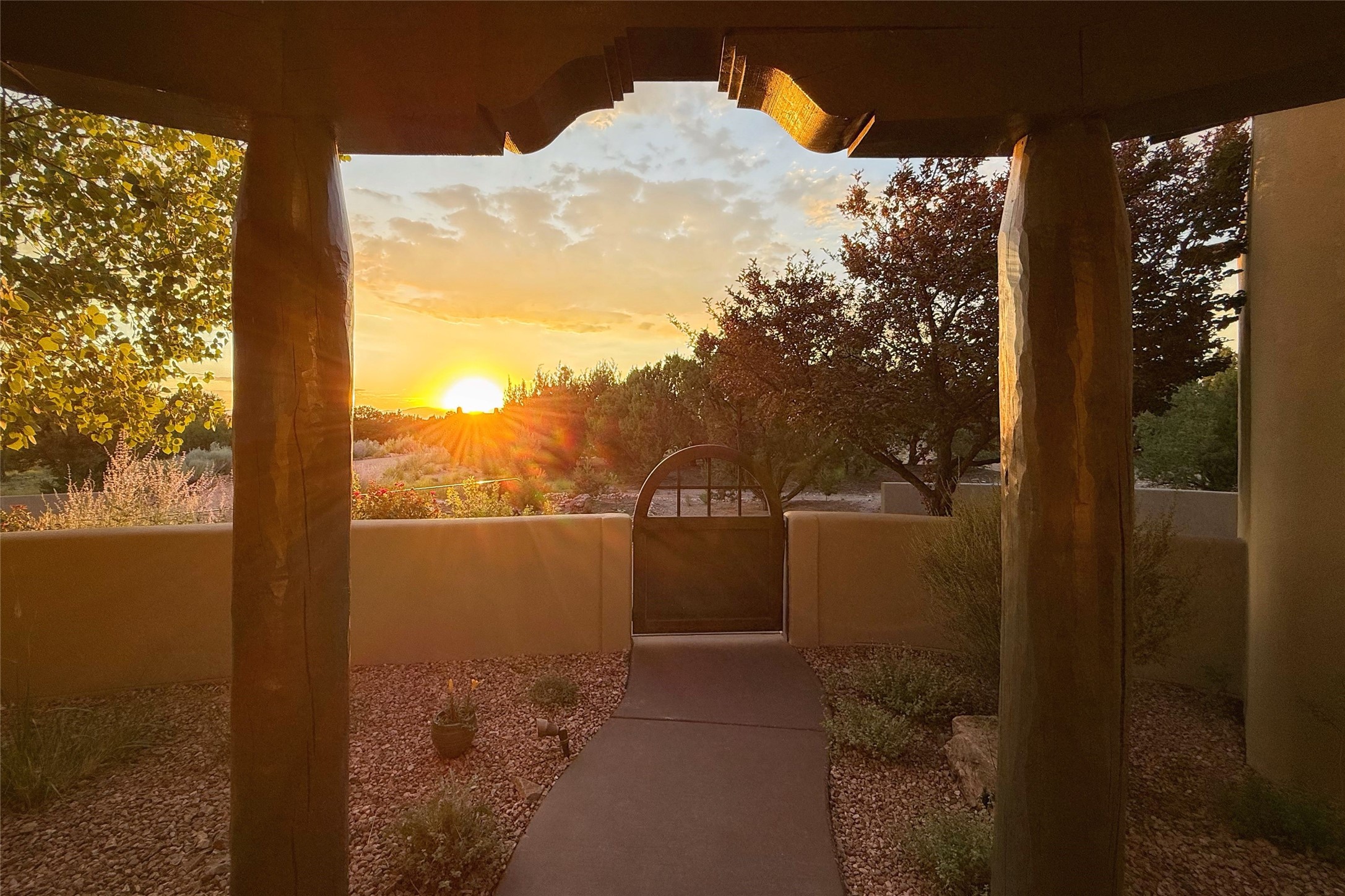 Peaceful elegance with sunset views. Welcome to a serene, custom-crafted sanctuary where timeless design meets contemporary comfort. Nestled in a quiet setting, this exceptional property offers stunning Sangre and Jemez mountain views, just minutes from the exclusive amenities of Las Campanas, including the Ranch Estates equestrian facilities. Every detail of this thoughtfully designed home reflects architectural elegance and ease of living. Distinctive arches, stained ceiling beams, and porcelain tile flooring create an inviting aesthetic. The curved hallways eliminate visible doorways in main areas, encouraging seamless, tranquil flow. The living room features an Anasazi stacked stone fireplace, expansive bay windows, and programmable remote-controlled shades. The chef's kitchen offers a large waterfall island, JennAir appliances, Fulgor range, custom cabinetry, and Anasazi stone backsplash--ideal for both daily use and stylish entertaining. A State-of-the-art sound studio capable of professional music production features hardwood flooring and was built using a sophisticated, advanced sound proofing wall spring system which effectively blocks noise and vibration transfer. The studio has a dedicated 20-amp panel, and mini split for comfort. This space would make an excellent media room for anyone! The spacious primary suite includes a gas kiva fireplace, large picture windows with Sangre views, portal access, and a spa-like bath with Caesarstone finishes, corner windows, and oversized shower. Two additional ensuite bedrooms--one with bay windows and one flex/guest space--offer comfort and versatility. Outdoor living includes a built-in grill, granite counters, water feature, and flagstone paths winding through native landscaping and a 4-cistern-fed irrigation system. Additional highlights include custom wood shutters on all windows, skylights throughout, stained doors/baseboards, new paint, and new tankless water heater. A rare blend of elegance, privacy, and ease.