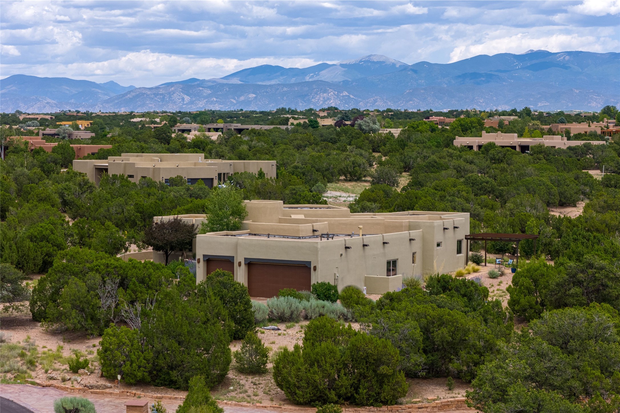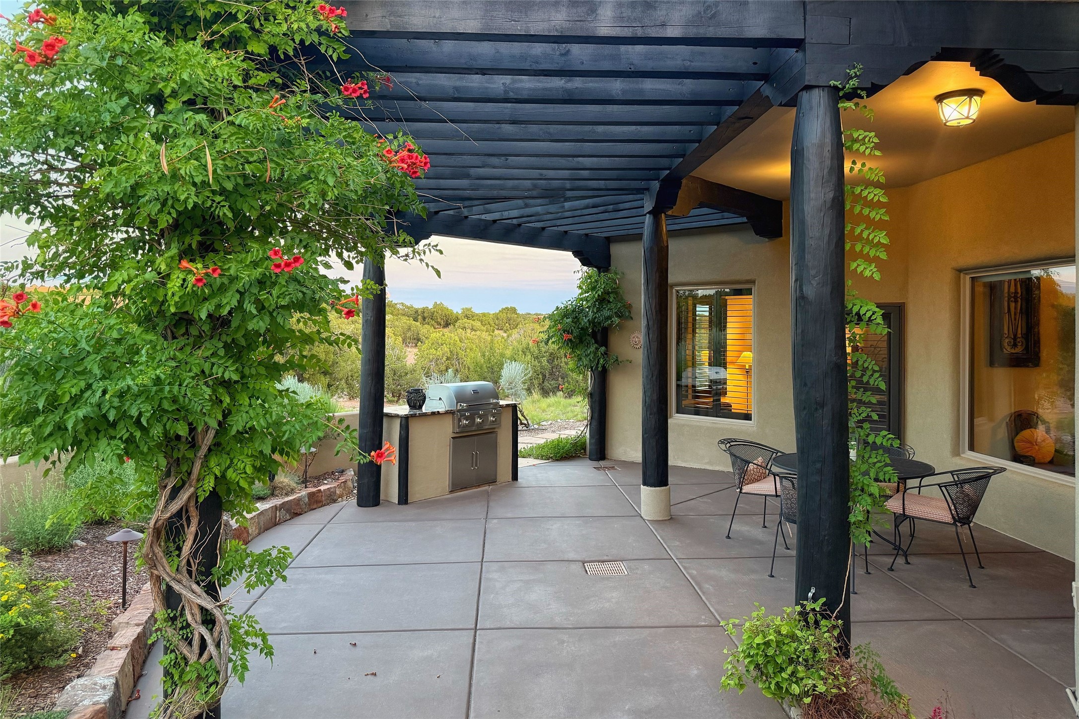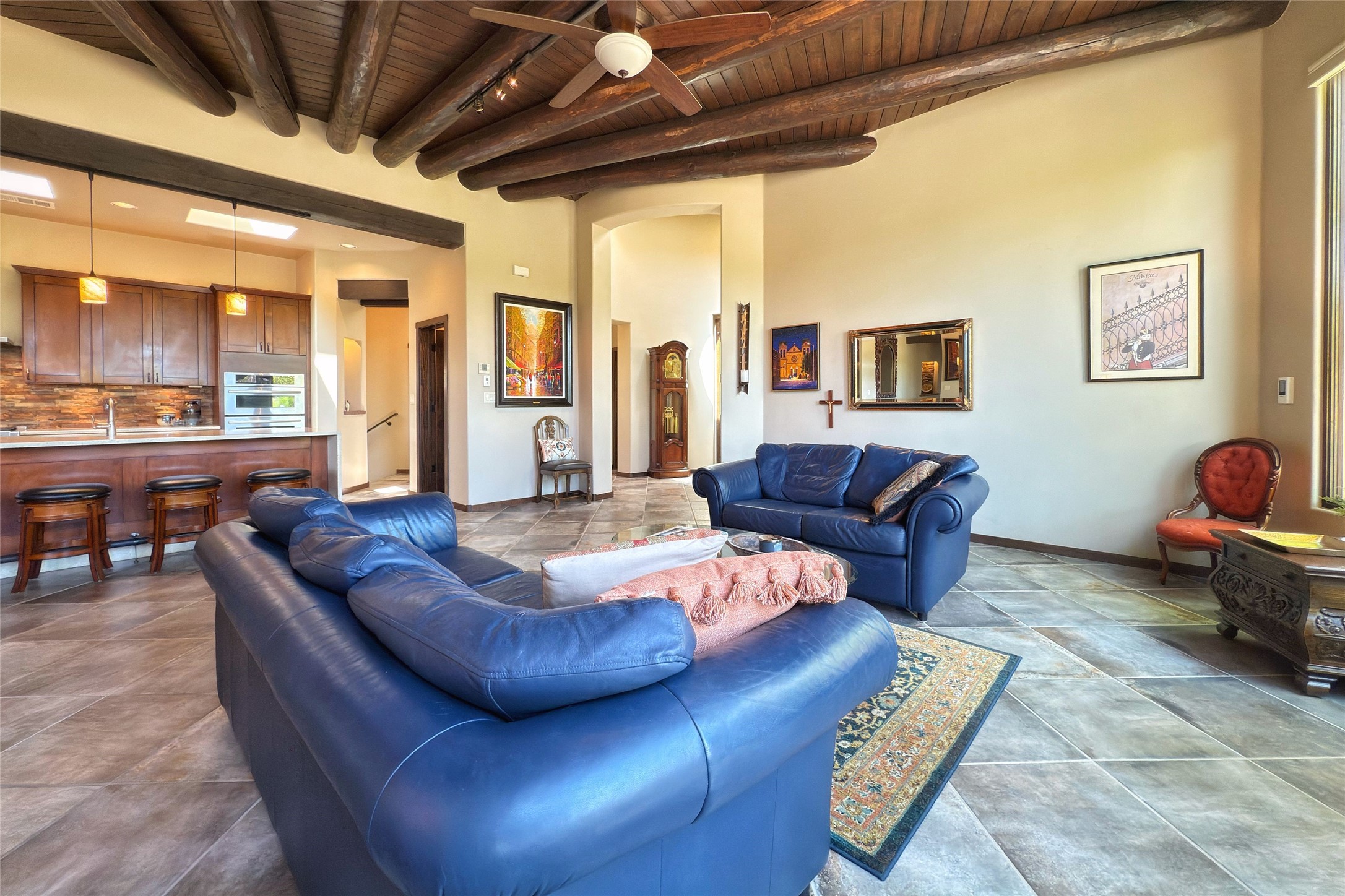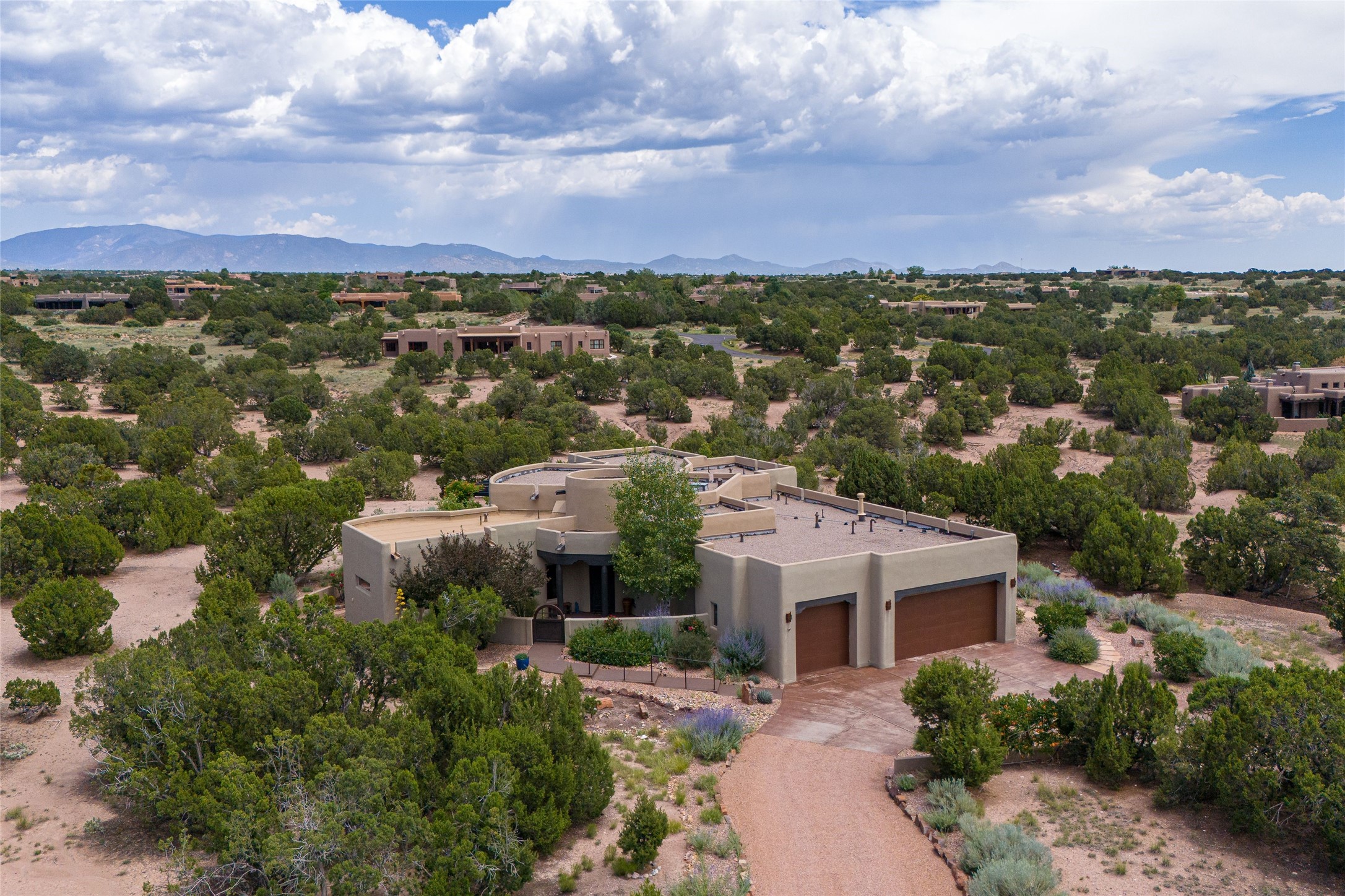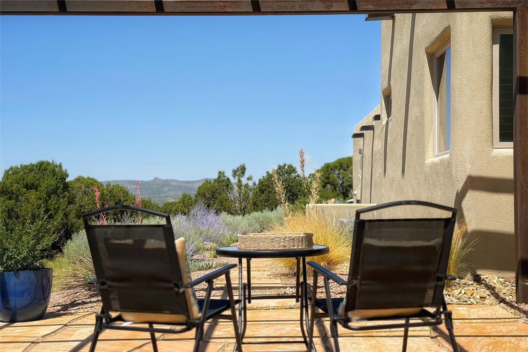 Peaceful elegance with sunset views. Welcome to a serene, custom-crafted sanctuary where timeless design meets contemporary comfort. Nestled in a quiet setting, this exceptional property offers stunning Sangre and Jemez mountain views, just minutes from the exclusive amenities of Las Campanas, including the Ranch Estates equestrian facilities. Every detail of this thoughtfully designed home reflects architectural elegance and ease of living. Distinctive arches, stained ceiling beams, and porcelain tile flooring create an inviting aesthetic. The curved hallways eliminate visible doorways in main areas, encouraging seamless, tranquil flow. The living room features an Anasazi stacked stone fireplace, expansive bay windows, and programmable remote-controlled shades. The chef's kitchen offers a large waterfall island, JennAir appliances, Fulgor range, custom cabinetry, and Anasazi stone backsplash--ideal for both daily use and stylish entertaining. A State-of-the-art sound studio capable of professional music production features hardwood flooring and was built using a sophisticated, advanced sound proofing wall spring system which effectively blocks noise and vibration transfer. The studio has a dedicated 20-amp panel, and mini split for comfort. This space would make an excellent media room for anyone! The spacious primary suite includes a gas kiva fireplace, large picture windows with Sangre views, portal access, and a spa-like bath with Caesarstone finishes, corner windows, and oversized shower. Two additional ensuite bedrooms--one with bay windows and one flex/guest space--offer comfort and versatility. Outdoor living includes a built-in grill, granite counters, water feature, and flagstone paths winding through native landscaping and a 4-cistern-fed irrigation system. Additional highlights include custom wood shutters on all windows, skylights throughout, stained doors/baseboards, new paint, and new tankless water heater. A rare blend of elegance, privacy, and ease.