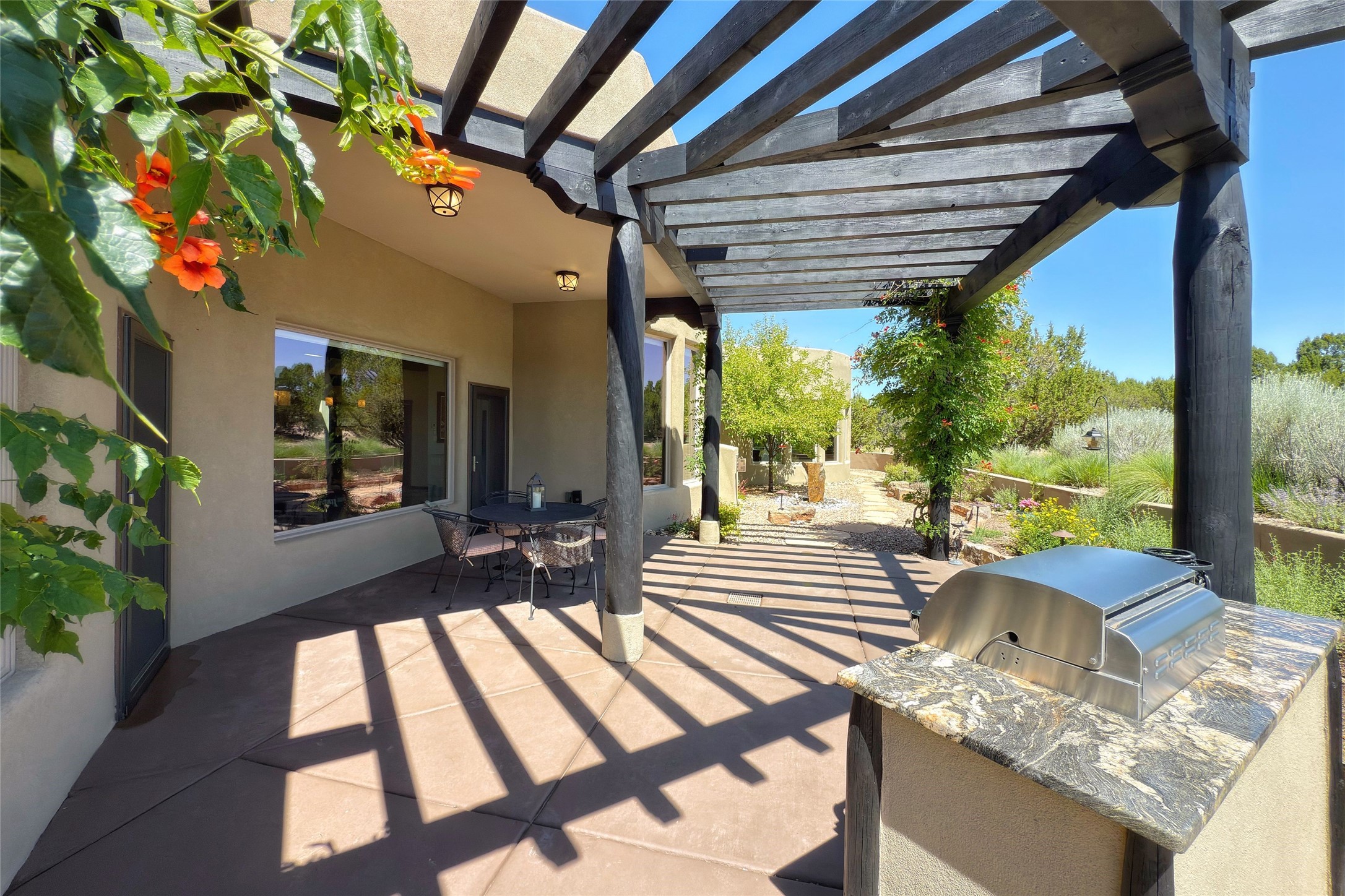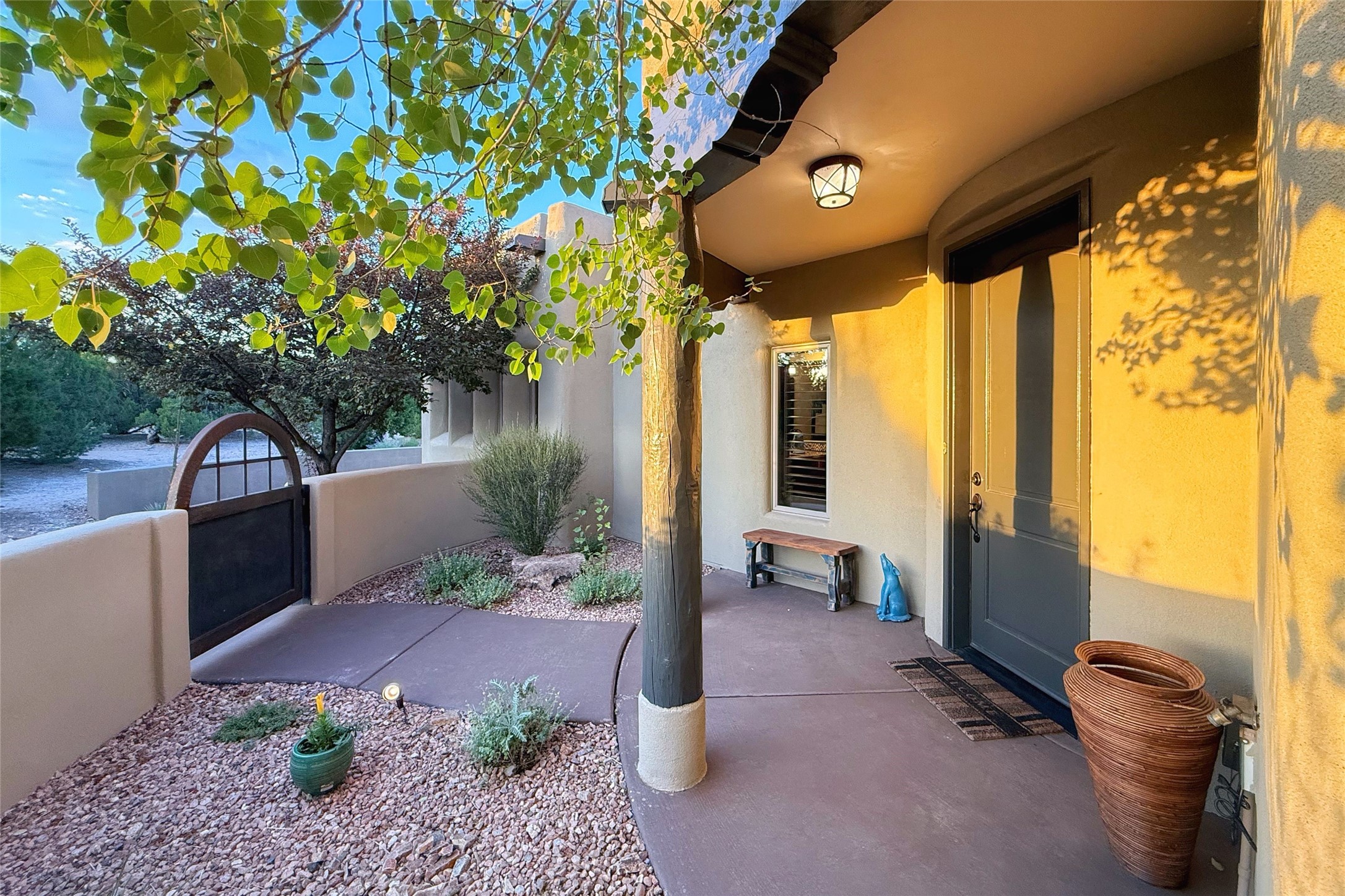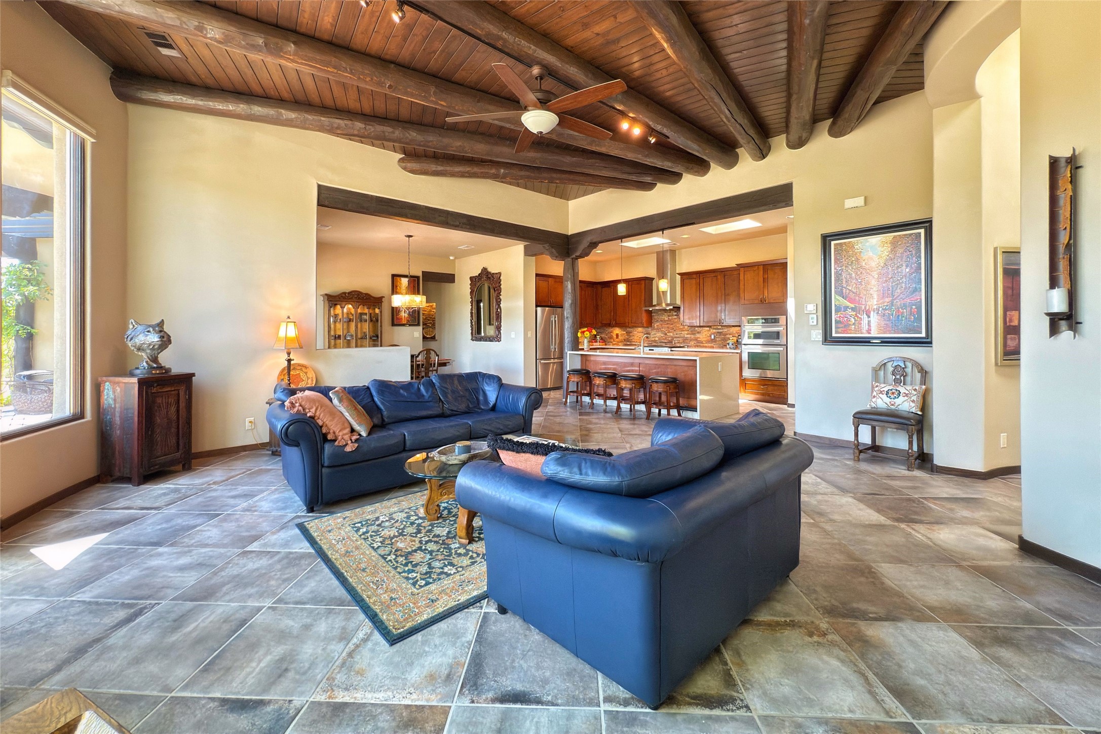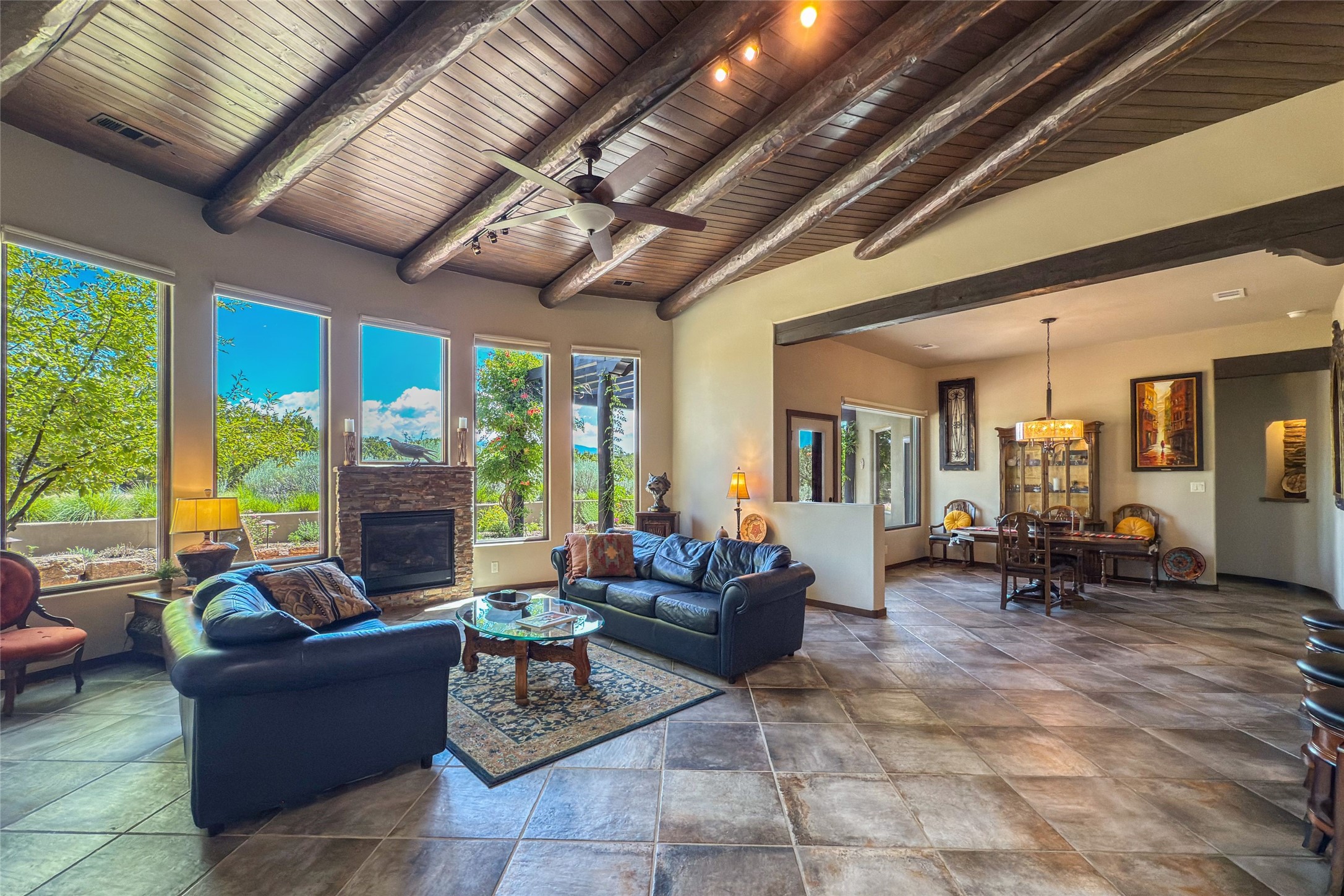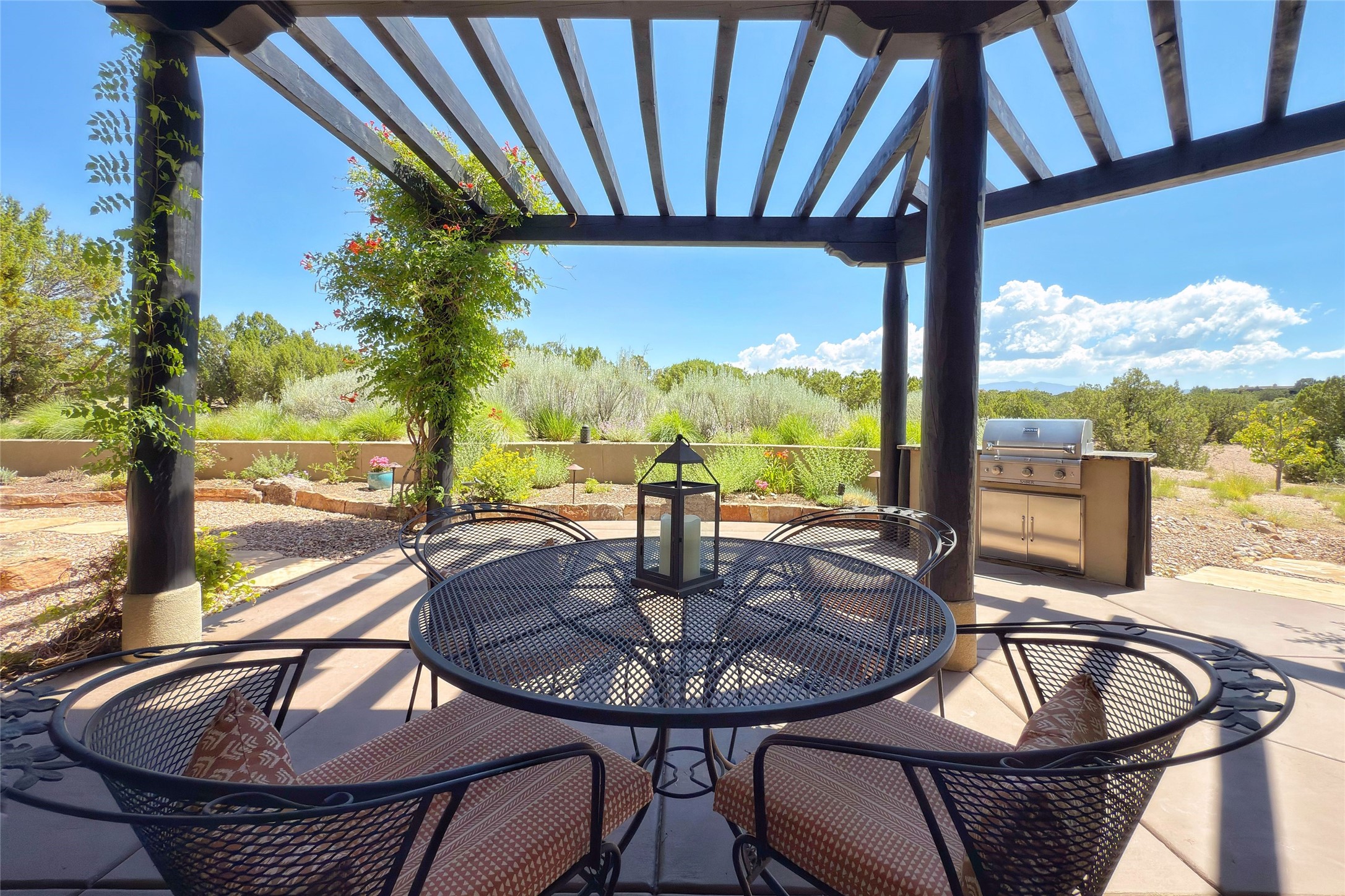 Peaceful elegance with sunset views. Welcome to a serene, custom-crafted sanctuary where timeless design meets contemporary comfort. Nestled in a quiet setting, this exceptional property offers stunning Sangre and Jemez mountain views, just minutes from the exclusive amenities of Las Campanas, including the Ranch Estates equestrian facilities. Every detail of this thoughtfully designed home reflects architectural elegance and ease of living. Distinctive arches, stained ceiling beams, and porcelain tile flooring create an inviting aesthetic. The curved hallways eliminate visible doorways in main areas, encouraging seamless, tranquil flow. The living room features an Anasazi stacked stone fireplace, expansive bay windows, and programmable remote-controlled shades. The chef's kitchen offers a large waterfall island, JennAir appliances, Fulgor range, custom cabinetry, and Anasazi stone backsplash--ideal for both daily use and stylish entertaining. A State-of-the-art sound studio capable of professional music production features hardwood flooring and was built using a sophisticated, advanced sound proofing wall spring system which effectively blocks noise and vibration transfer. The studio has a dedicated 20-amp panel, and mini split for comfort. This space would make an excellent media room for anyone! The spacious primary suite includes a gas kiva fireplace, large picture windows with Sangre views, portal access, and a spa-like bath with Caesarstone finishes, corner windows, and oversized shower. Two additional ensuite bedrooms--one with bay windows and one flex/guest space--offer comfort and versatility. Outdoor living includes a built-in grill, granite counters, water feature, and flagstone paths winding through native landscaping and a 4-cistern-fed irrigation system. Additional highlights include custom wood shutters on all windows, skylights throughout, stained doors/baseboards, new paint, and new tankless water heater. A rare blend of elegance, privacy, and ease.