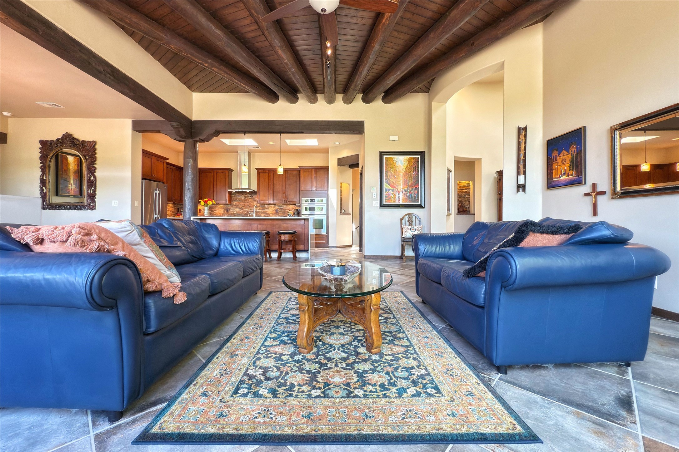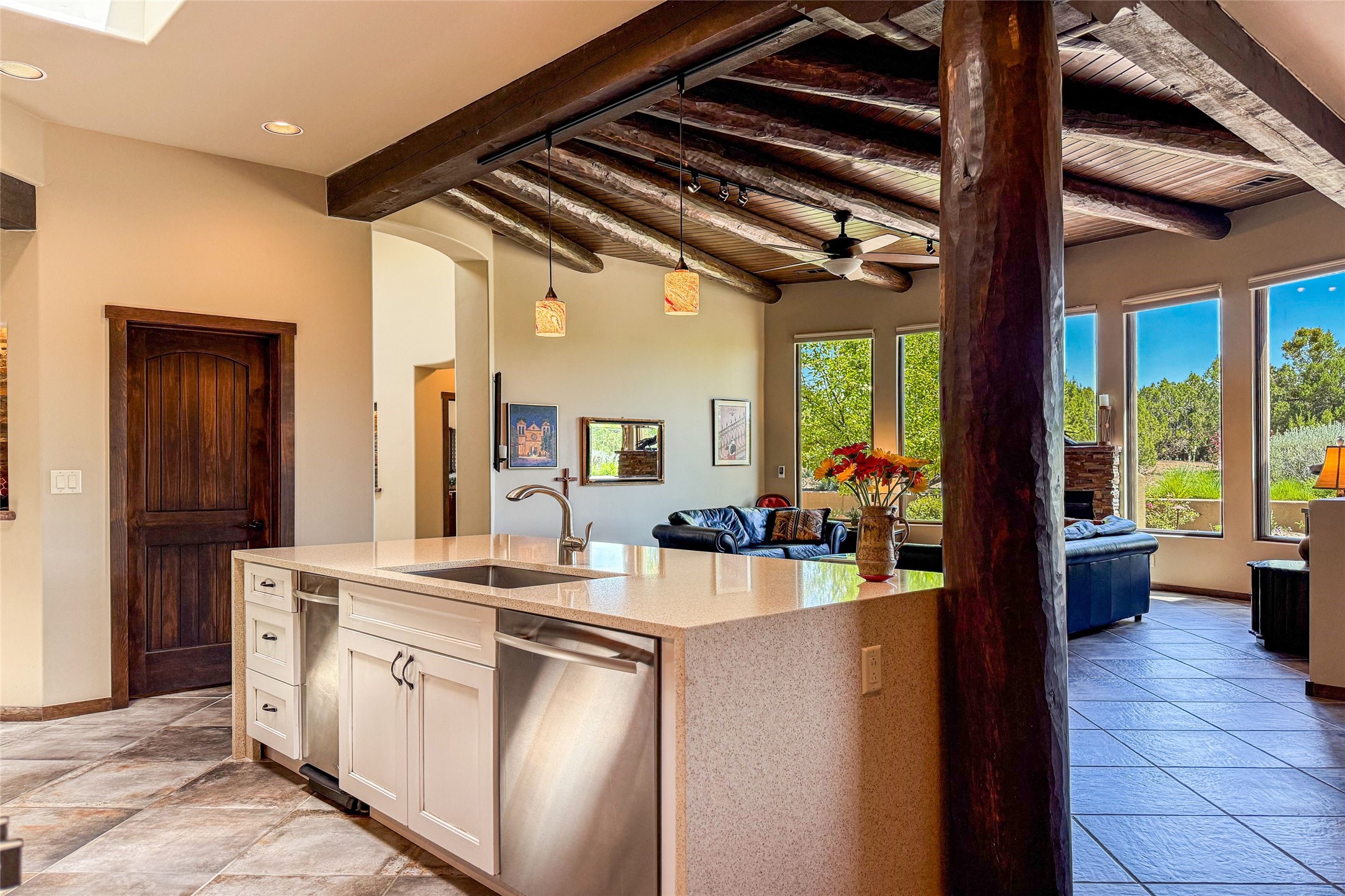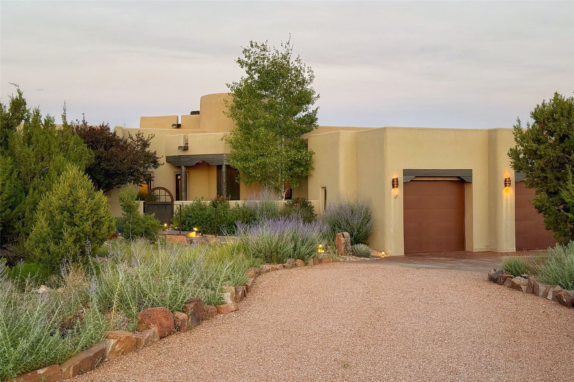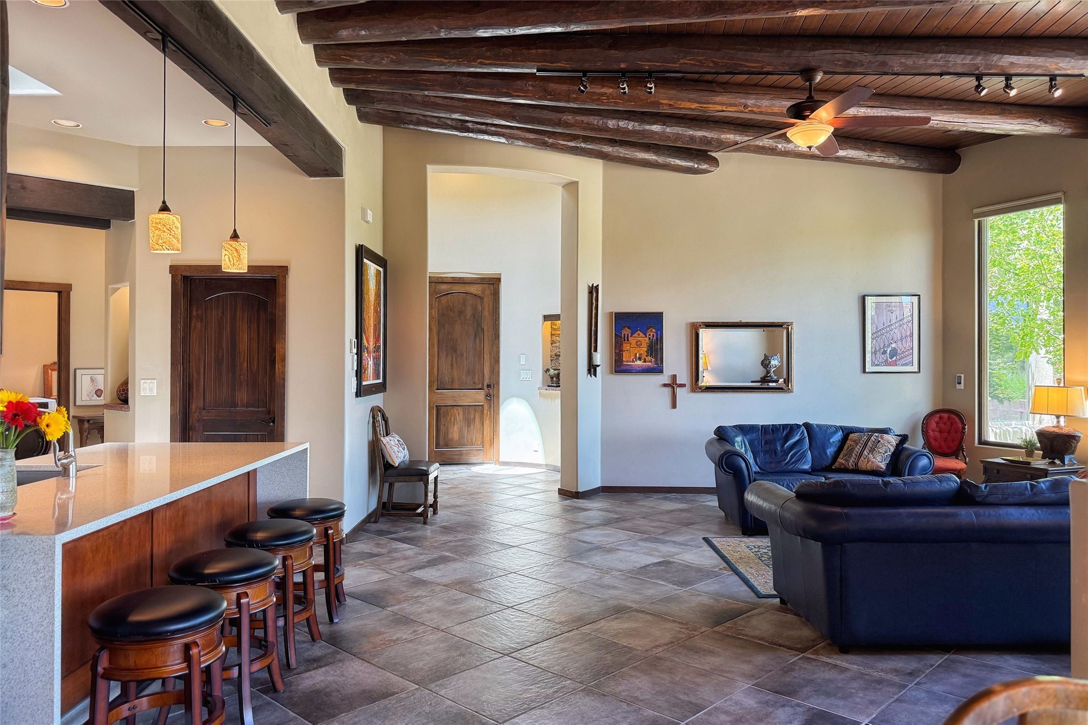 Peaceful elegance with sunset views. Welcome to a serene, custom-crafted sanctuary where timeless design meets contemporary comfort. Nestled in a quiet setting, this exceptional property offers stunning Sangre and Jemez mountain views, just minutes from the exclusive amenities of Las Campanas, including the Ranch Estates equestrian facilities. Every detail of this thoughtfully designed home reflects architectural elegance and ease of living. Distinctive arches, stained ceiling beams, and porcelain tile flooring create an inviting aesthetic. The curved hallways eliminate visible doorways in main areas, encouraging seamless, tranquil flow. The living room features an Anasazi stacked stone fireplace, expansive bay windows, and programmable remote-controlled shades. The chef's kitchen offers a large waterfall island, JennAir appliances, Fulgor range, custom cabinetry, and Anasazi stone backsplash--ideal for both daily use and stylish entertaining. A State-of-the-art sound studio capable of professional music production features hardwood flooring and was built using a sophisticated, advanced sound proofing wall spring system which effectively blocks noise and vibration transfer. The studio has a dedicated 20-amp panel, and mini split for comfort. This space would make an excellent media room for anyone! The spacious primary suite includes a gas kiva fireplace, large picture windows with Sangre views, portal access, and a spa-like bath with Caesarstone finishes, corner windows, and oversized shower. Two additional ensuite bedrooms--one with bay windows and one flex/guest space--offer comfort and versatility. Outdoor living includes a built-in grill, granite counters, water feature, and flagstone paths winding through native landscaping and a 4-cistern-fed irrigation system. Additional highlights include custom wood shutters on all windows, skylights throughout, stained doors/baseboards, new paint, and new tankless water heater. A rare blend of elegance, privacy, and ease.