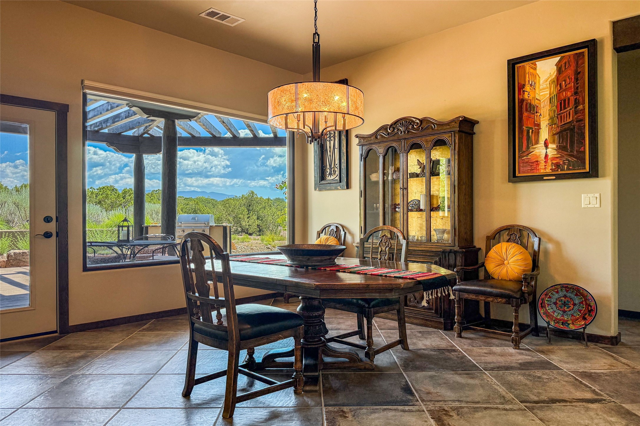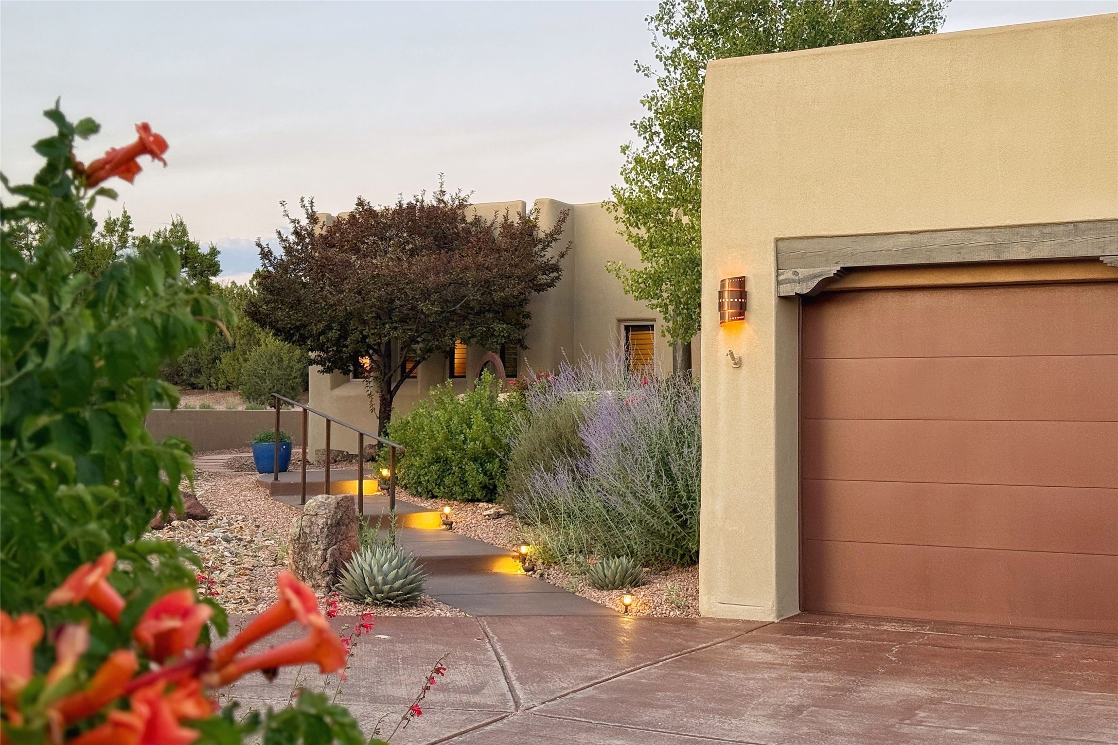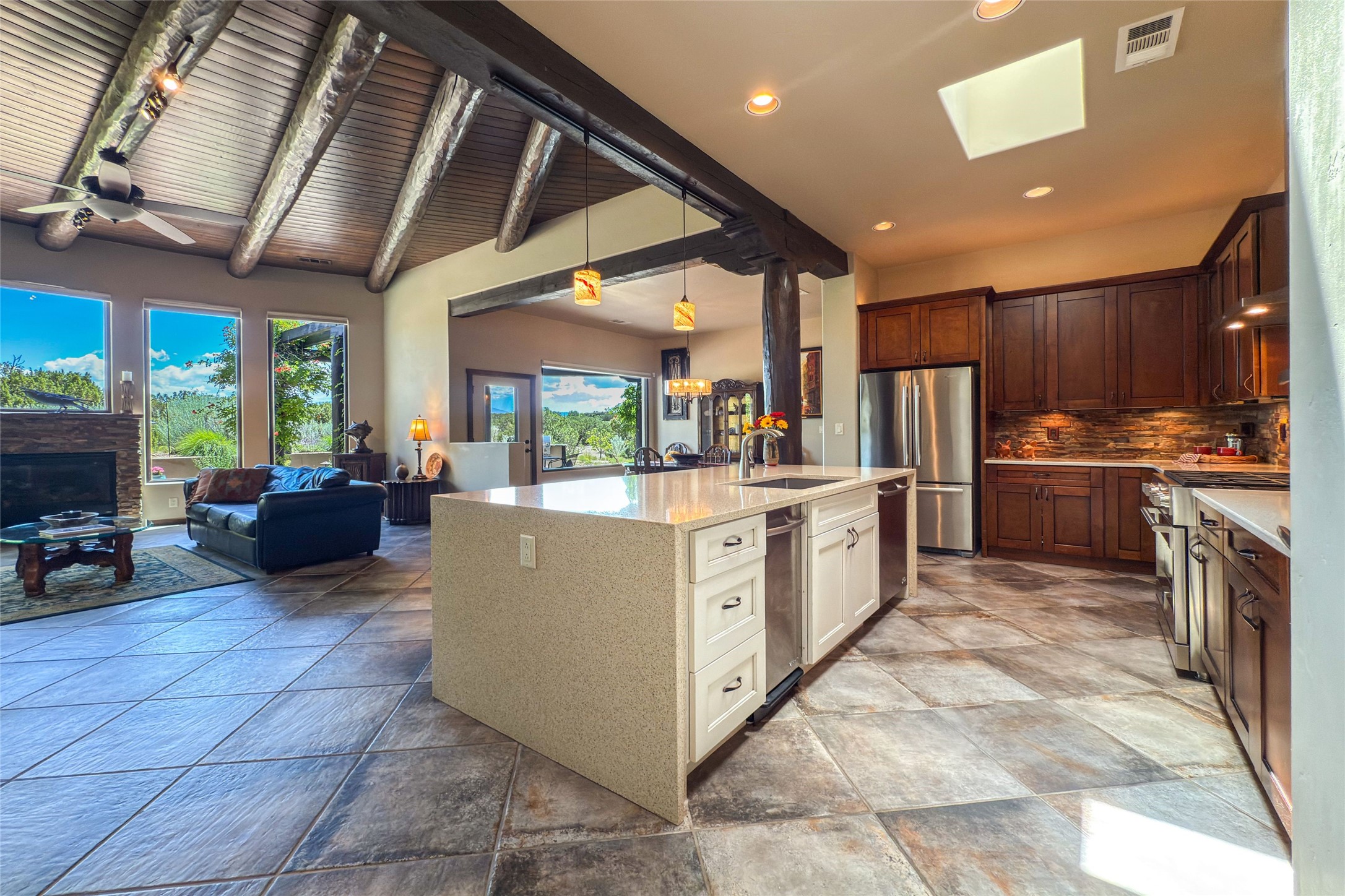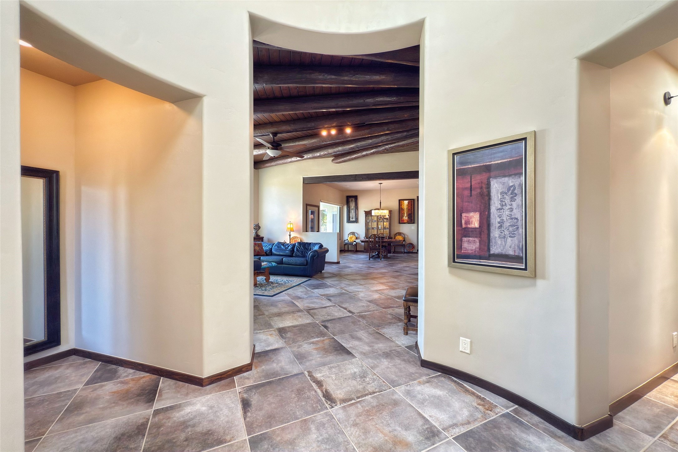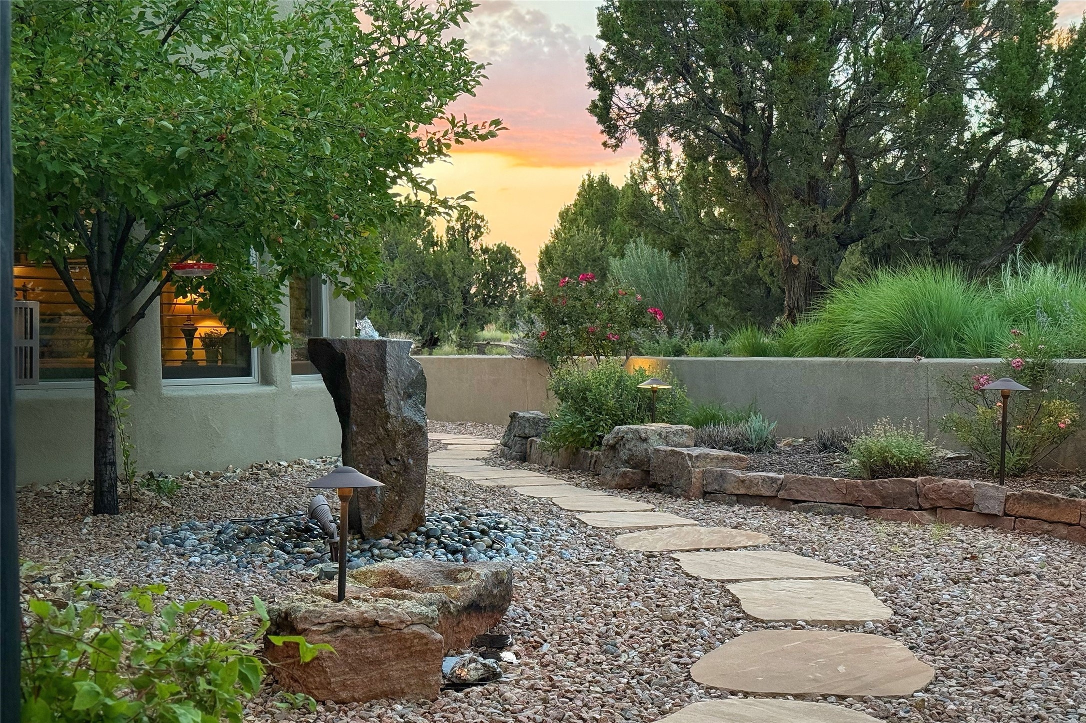 Peaceful elegance with sunset views. Welcome to a serene, custom-crafted sanctuary where timeless design meets contemporary comfort. Nestled in a quiet setting, this exceptional property offers stunning Sangre and Jemez mountain views, just minutes from the exclusive amenities of Las Campanas, including the Ranch Estates equestrian facilities. Every detail of this thoughtfully designed home reflects architectural elegance and ease of living. Distinctive arches, stained ceiling beams, and porcelain tile flooring create an inviting aesthetic. The curved hallways eliminate visible doorways in main areas, encouraging seamless, tranquil flow. The living room features an Anasazi stacked stone fireplace, expansive bay windows, and programmable remote-controlled shades. The chef's kitchen offers a large waterfall island, JennAir appliances, Fulgor range, custom cabinetry, and Anasazi stone backsplash--ideal for both daily use and stylish entertaining. A State-of-the-art sound studio capable of professional music production features hardwood flooring and was built using a sophisticated, advanced sound proofing wall spring system which effectively blocks noise and vibration transfer. The studio has a dedicated 20-amp panel, and mini split for comfort. This space would make an excellent media room for anyone! The spacious primary suite includes a gas kiva fireplace, large picture windows with Sangre views, portal access, and a spa-like bath with Caesarstone finishes, corner windows, and oversized shower. Two additional ensuite bedrooms--one with bay windows and one flex/guest space--offer comfort and versatility. Outdoor living includes a built-in grill, granite counters, water feature, and flagstone paths winding through native landscaping and a 4-cistern-fed irrigation system. Additional highlights include custom wood shutters on all windows, skylights throughout, stained doors/baseboards, new paint, and new tankless water heater. A rare blend of elegance, privacy, and ease.