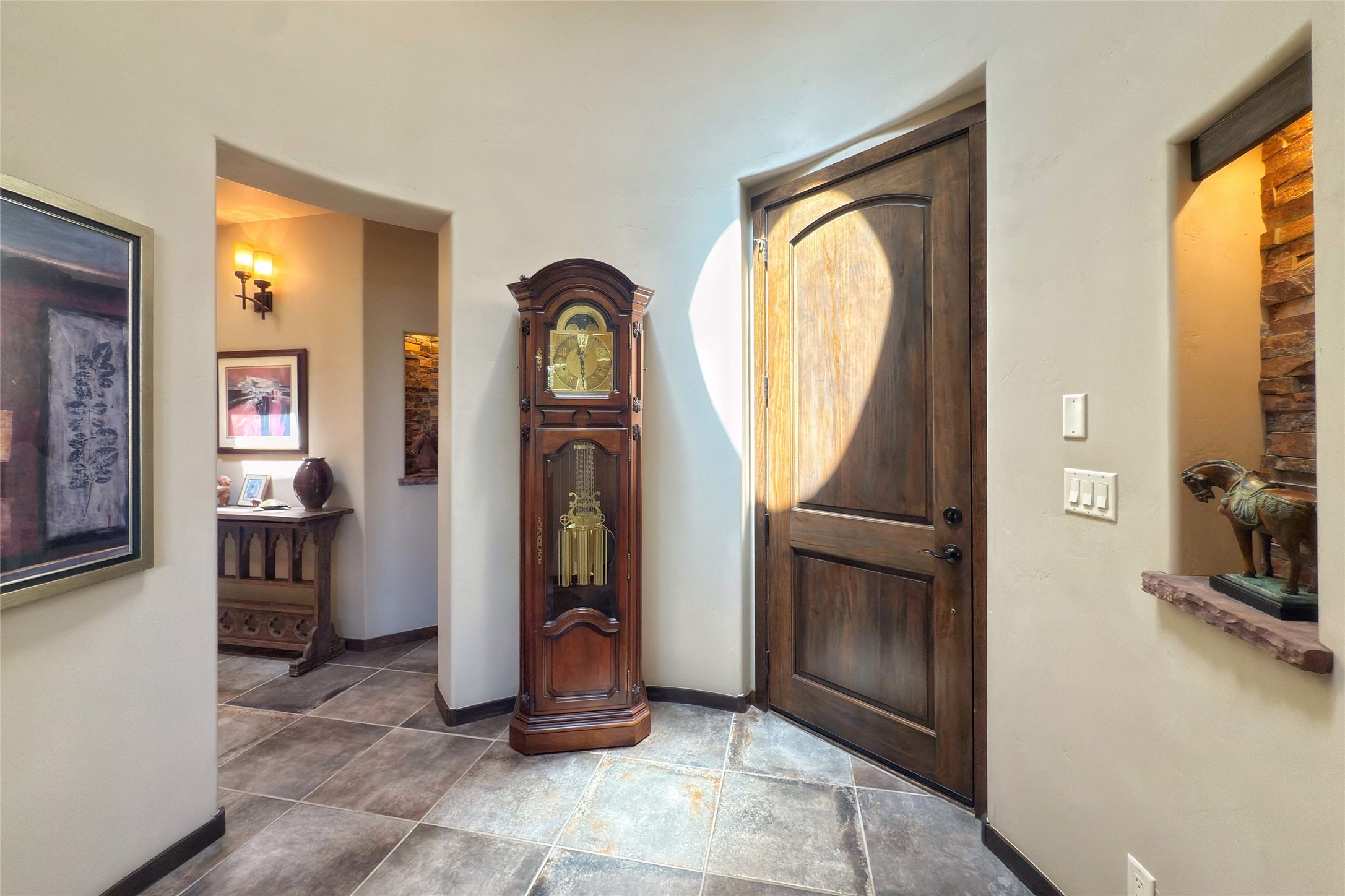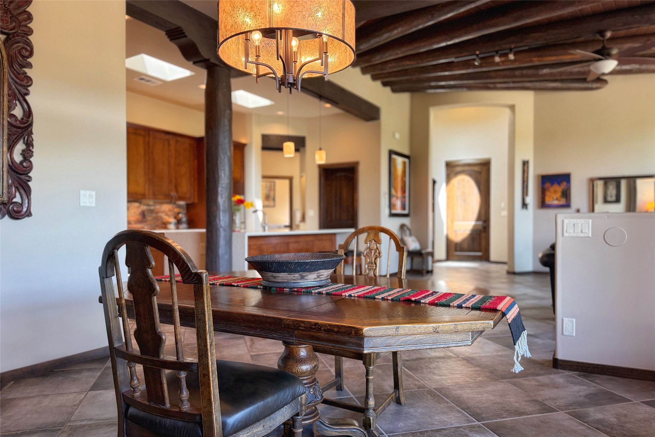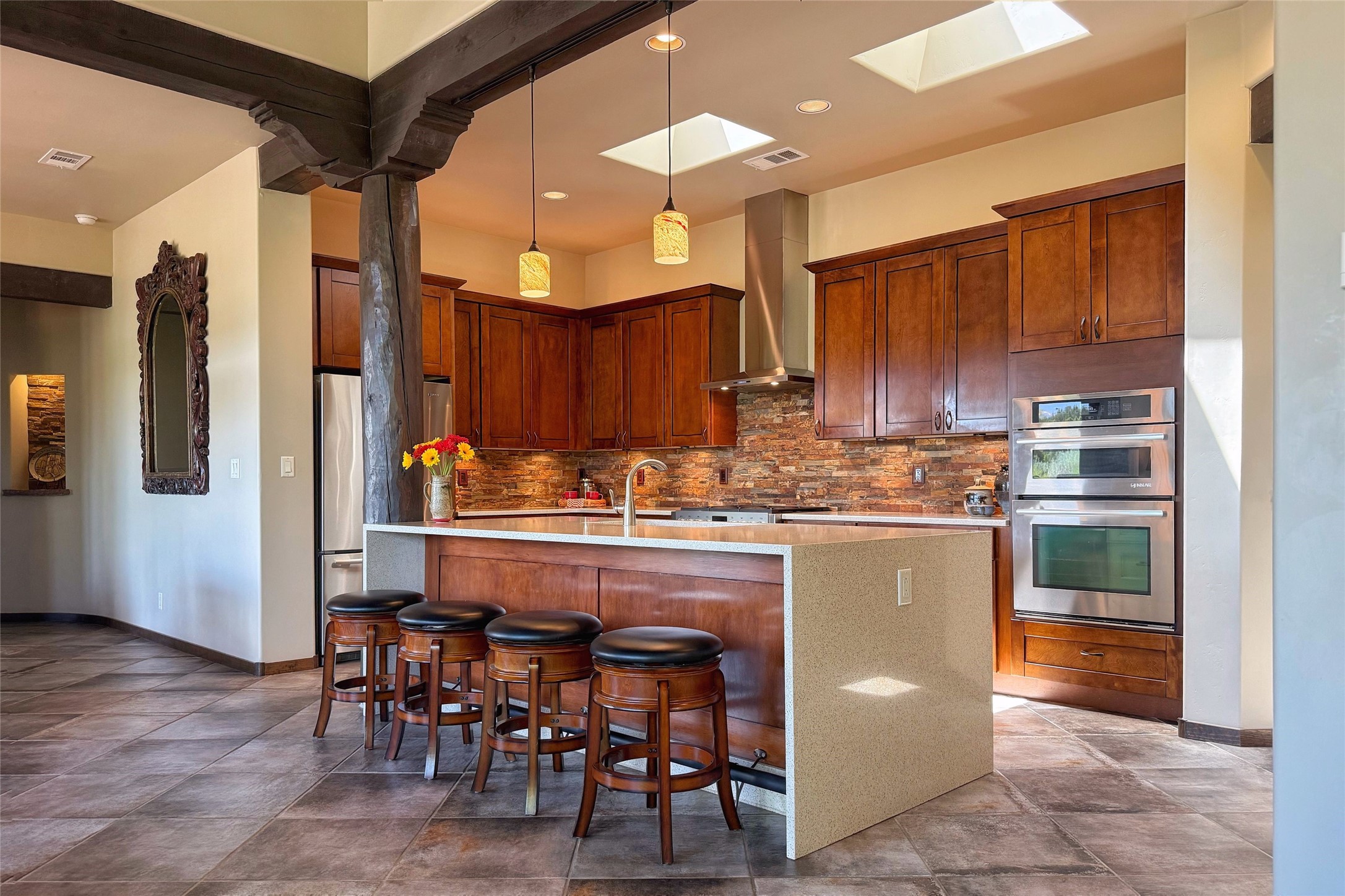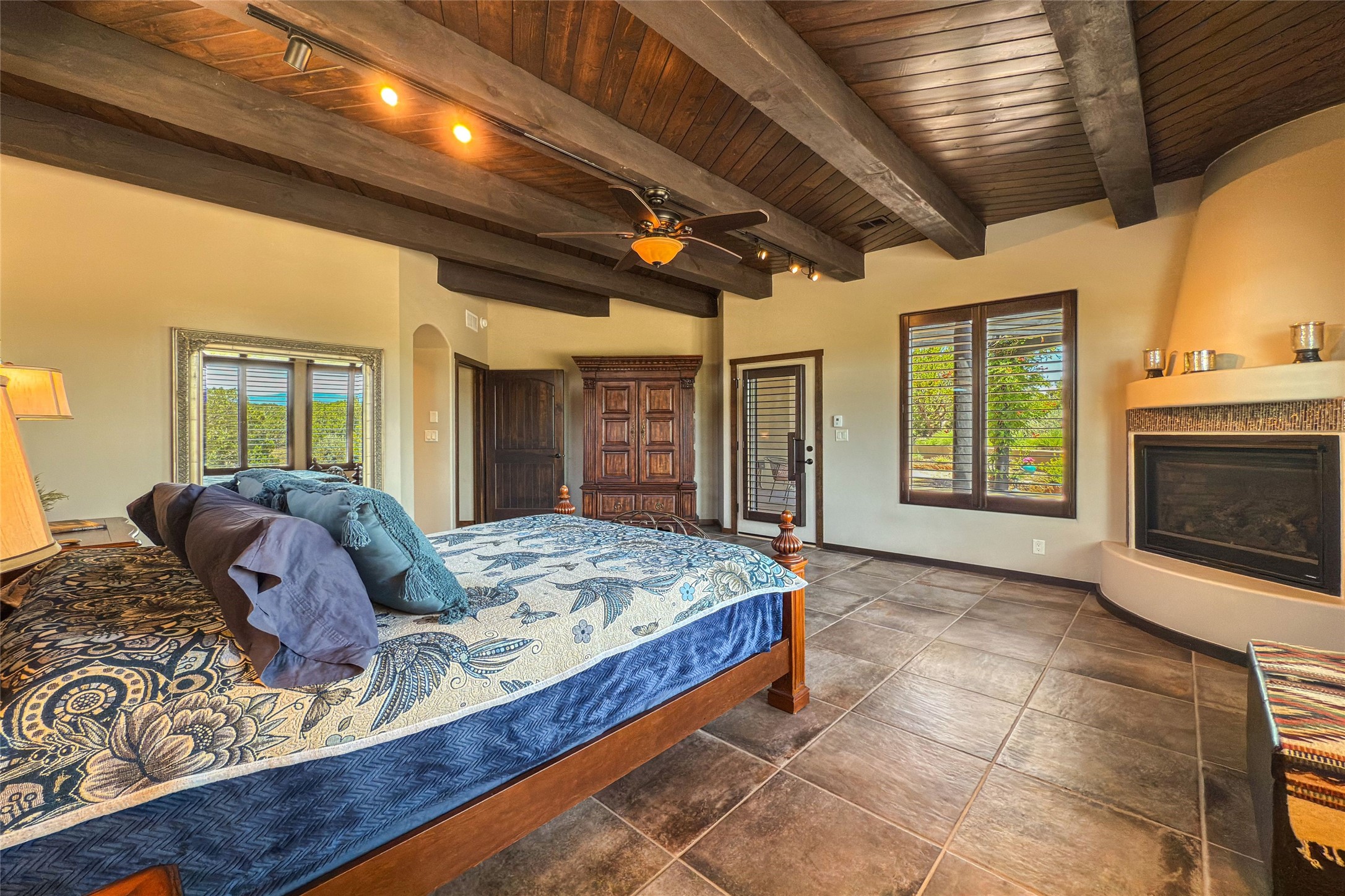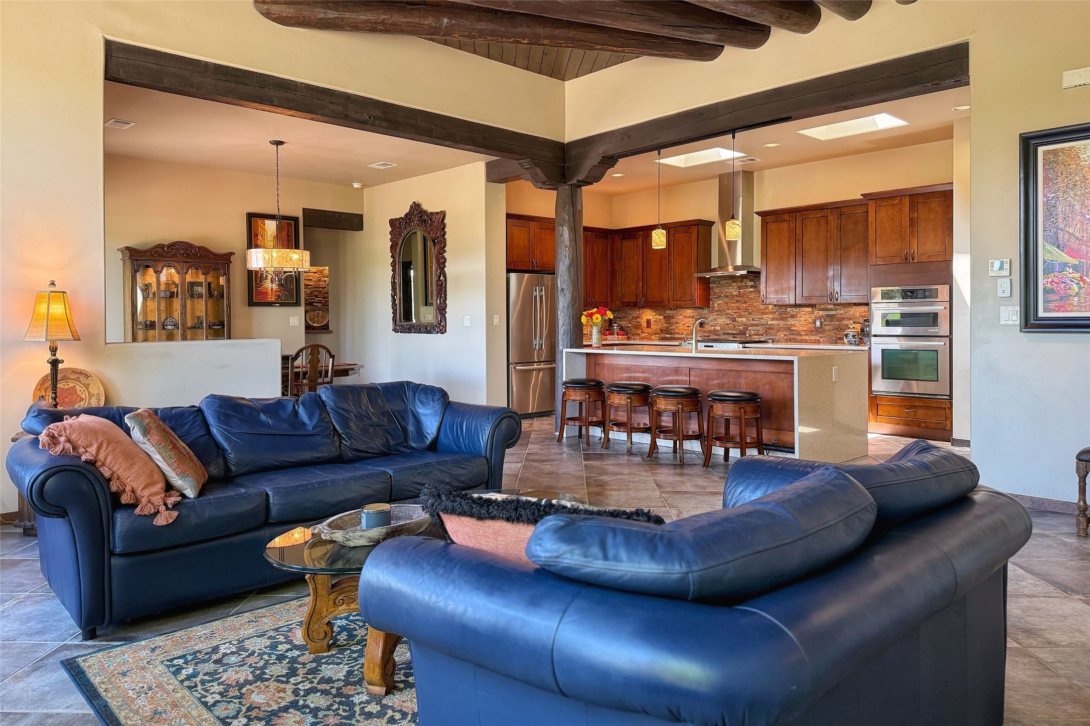 Peaceful elegance with sunset views. Welcome to a serene, custom-crafted sanctuary where timeless design meets contemporary comfort. Nestled in a quiet setting, this exceptional property offers stunning Sangre and Jemez mountain views, just minutes from the exclusive amenities of Las Campanas, including the Ranch Estates equestrian facilities. Every detail of this thoughtfully designed home reflects architectural elegance and ease of living. Distinctive arches, stained ceiling beams, and porcelain tile flooring create an inviting aesthetic. The curved hallways eliminate visible doorways in main areas, encouraging seamless, tranquil flow. The living room features an Anasazi stacked stone fireplace, expansive bay windows, and programmable remote-controlled shades. The chef's kitchen offers a large waterfall island, JennAir appliances, Fulgor range, custom cabinetry, and Anasazi stone backsplash--ideal for both daily use and stylish entertaining. A State-of-the-art sound studio capable of professional music production features hardwood flooring and was built using a sophisticated, advanced sound proofing wall spring system which effectively blocks noise and vibration transfer. The studio has a dedicated 20-amp panel, and mini split for comfort. This space would make an excellent media room for anyone! The spacious primary suite includes a gas kiva fireplace, large picture windows with Sangre views, portal access, and a spa-like bath with Caesarstone finishes, corner windows, and oversized shower. Two additional ensuite bedrooms--one with bay windows and one flex/guest space--offer comfort and versatility. Outdoor living includes a built-in grill, granite counters, water feature, and flagstone paths winding through native landscaping and a 4-cistern-fed irrigation system. Additional highlights include custom wood shutters on all windows, skylights throughout, stained doors/baseboards, new paint, and new tankless water heater. A rare blend of elegance, privacy, and ease.