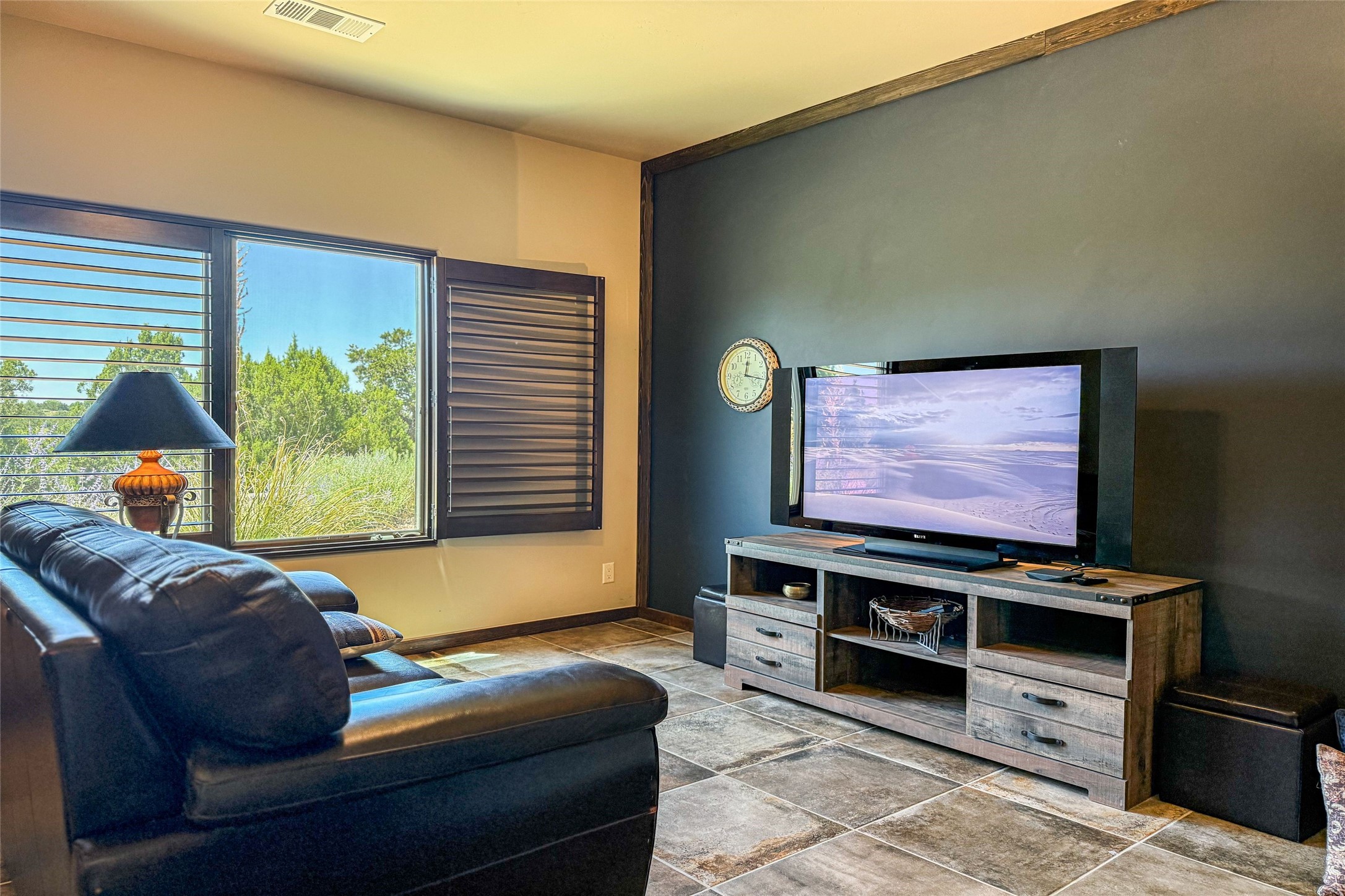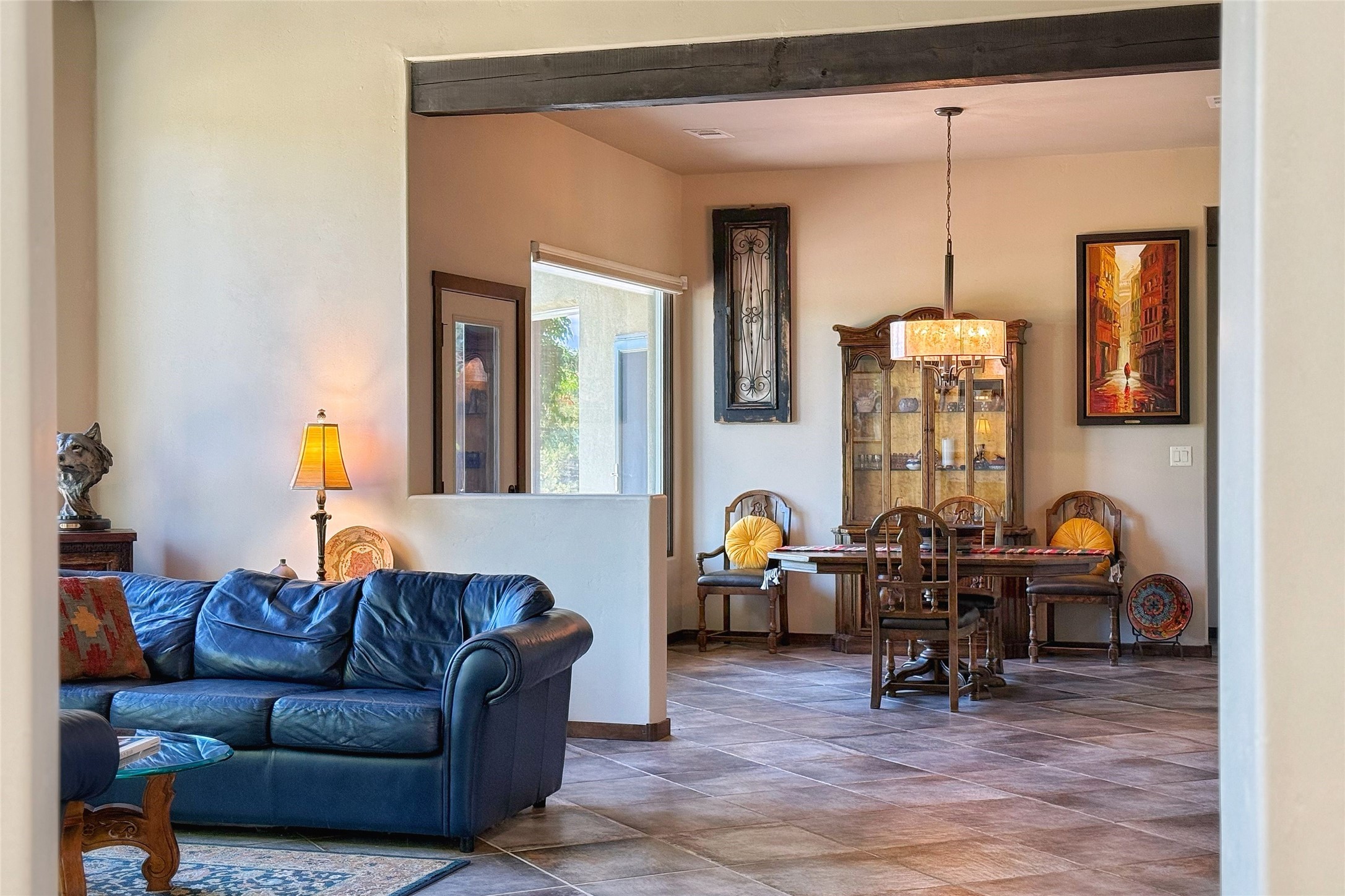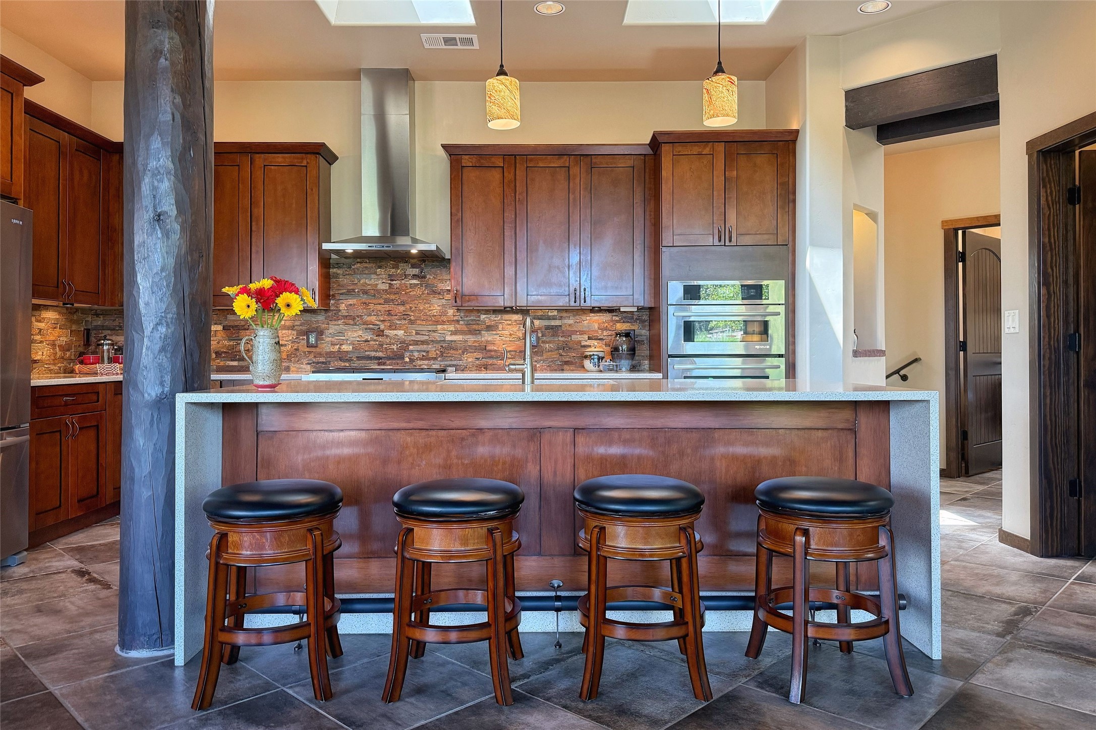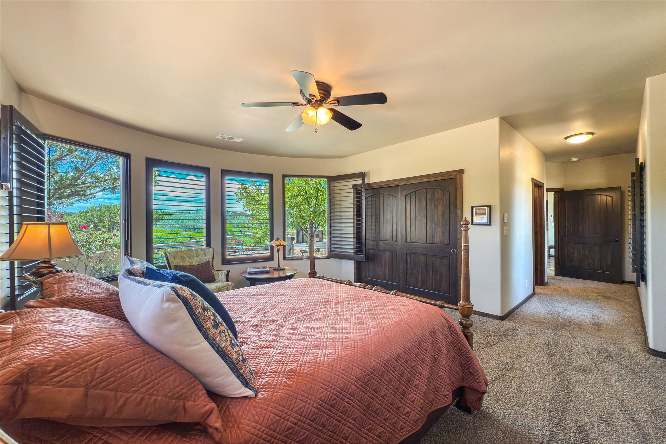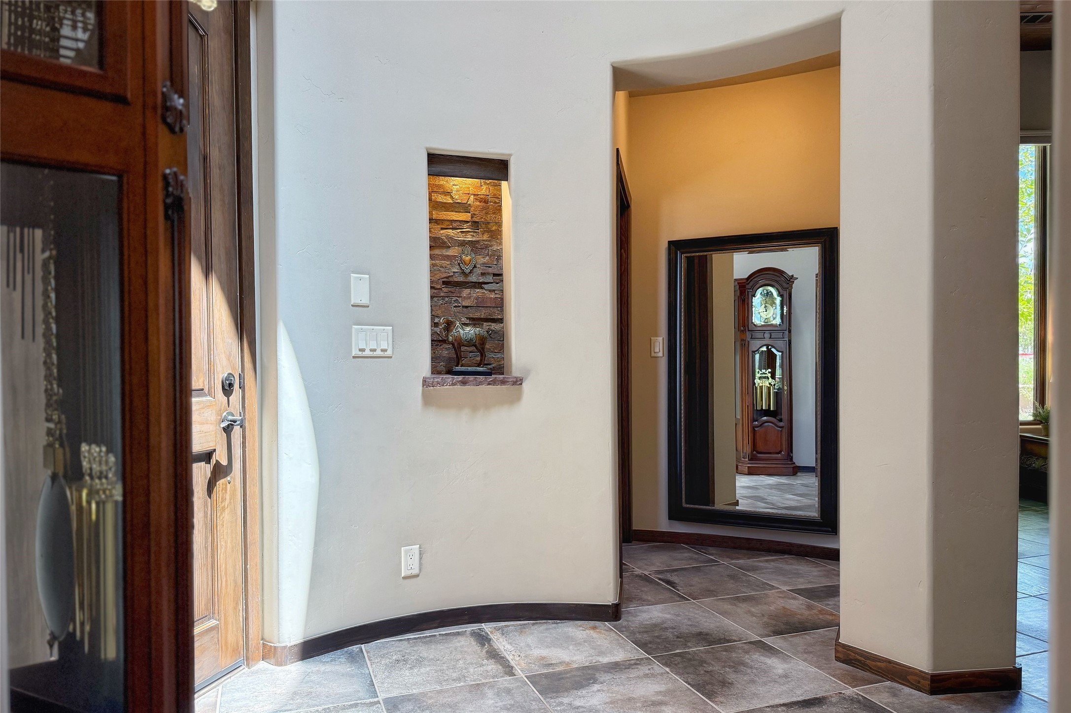 Peaceful elegance with sunset views. Welcome to a serene, custom-crafted sanctuary where timeless design meets contemporary comfort. Nestled in a quiet setting, this exceptional property offers stunning Sangre and Jemez mountain views, just minutes from the exclusive amenities of Las Campanas, including the Ranch Estates equestrian facilities. Every detail of this thoughtfully designed home reflects architectural elegance and ease of living. Distinctive arches, stained ceiling beams, and porcelain tile flooring create an inviting aesthetic. The curved hallways eliminate visible doorways in main areas, encouraging seamless, tranquil flow. The living room features an Anasazi stacked stone fireplace, expansive bay windows, and programmable remote-controlled shades. The chef's kitchen offers a large waterfall island, JennAir appliances, Fulgor range, custom cabinetry, and Anasazi stone backsplash--ideal for both daily use and stylish entertaining. A State-of-the-art sound studio capable of professional music production features hardwood flooring and was built using a sophisticated, advanced sound proofing wall spring system which effectively blocks noise and vibration transfer. The studio has a dedicated 20-amp panel, and mini split for comfort. This space would make an excellent media room for anyone! The spacious primary suite includes a gas kiva fireplace, large picture windows with Sangre views, portal access, and a spa-like bath with Caesarstone finishes, corner windows, and oversized shower. Two additional ensuite bedrooms--one with bay windows and one flex/guest space--offer comfort and versatility. Outdoor living includes a built-in grill, granite counters, water feature, and flagstone paths winding through native landscaping and a 4-cistern-fed irrigation system. Additional highlights include custom wood shutters on all windows, skylights throughout, stained doors/baseboards, new paint, and new tankless water heater. A rare blend of elegance, privacy, and ease.