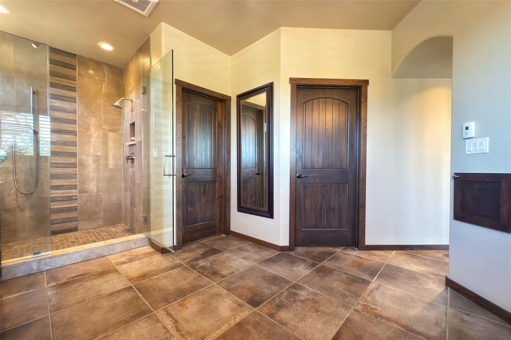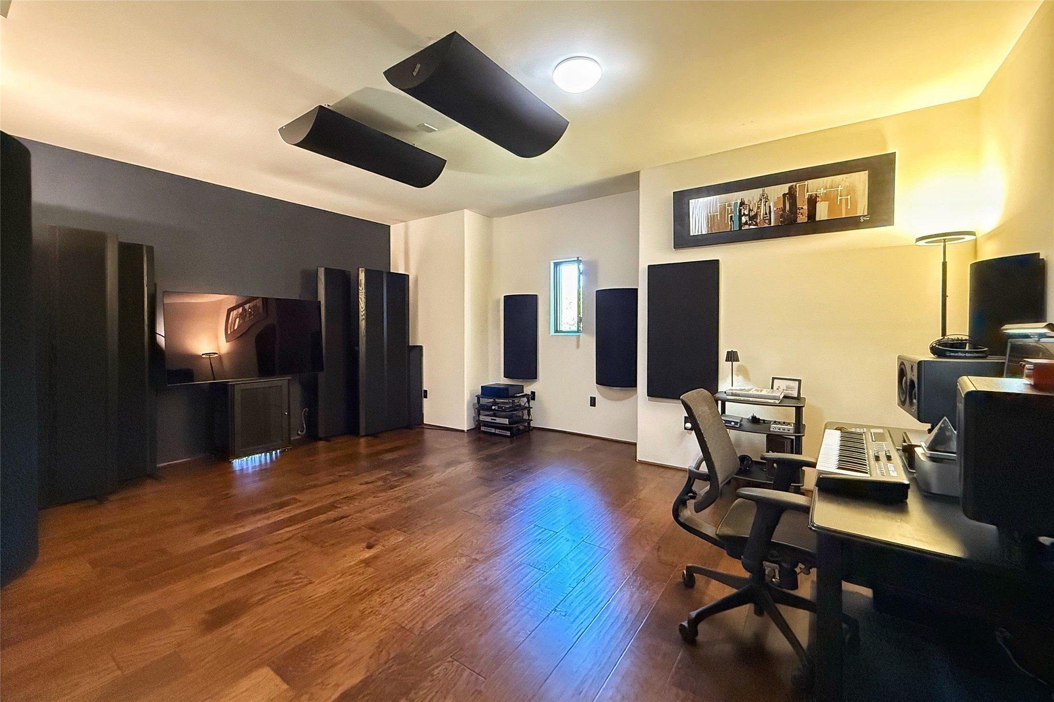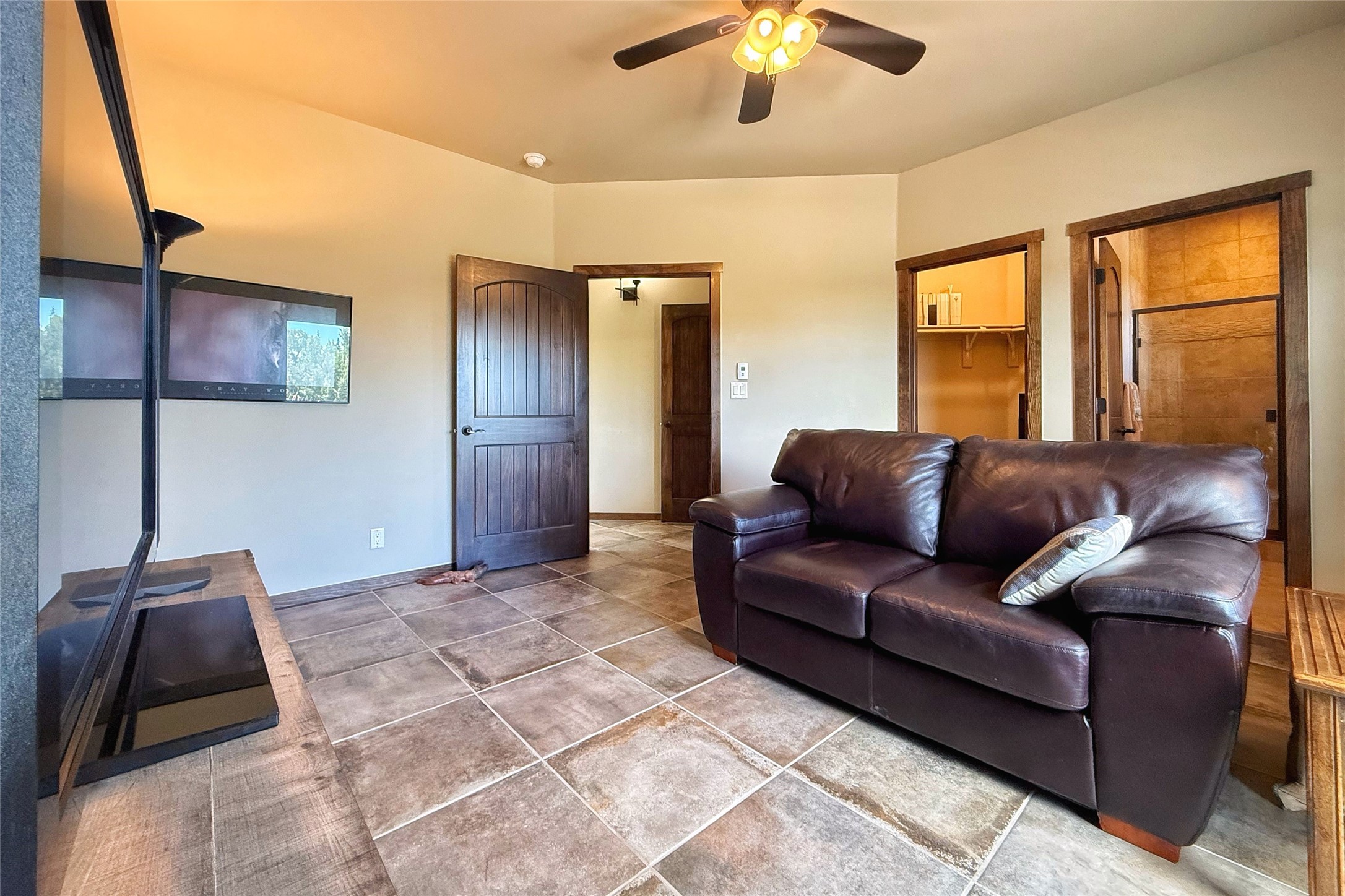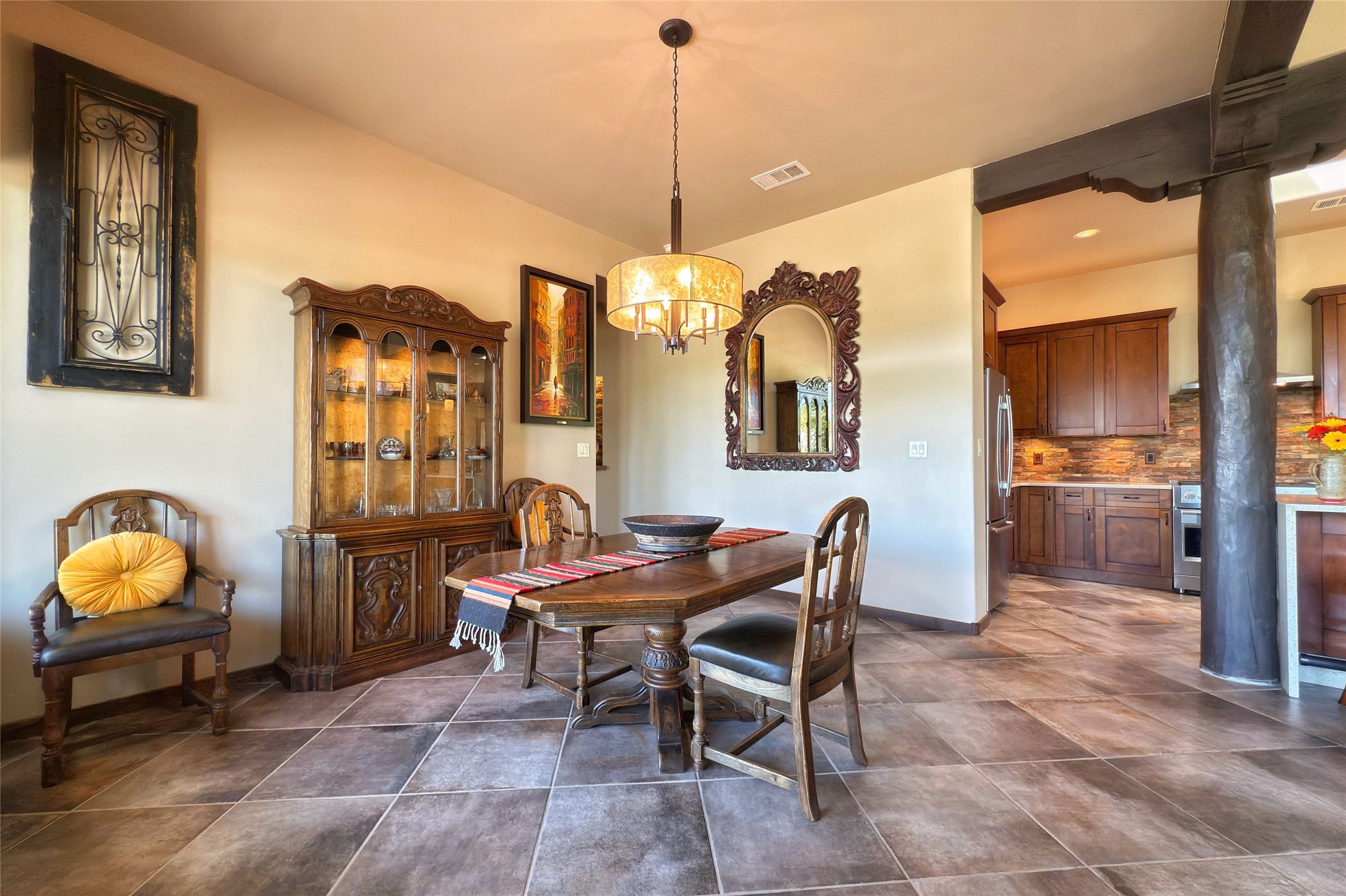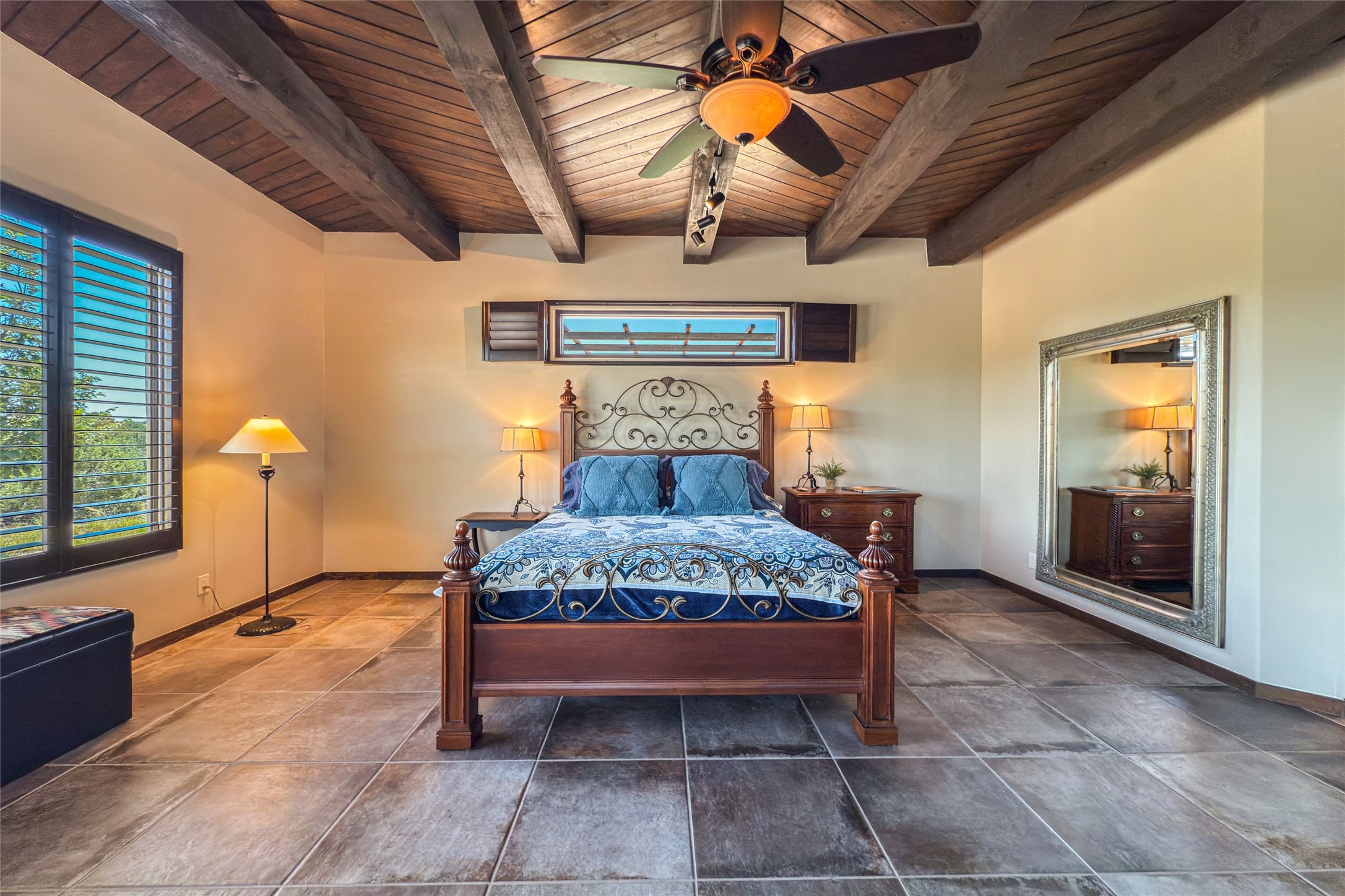 Peaceful elegance with sunset views. Welcome to a serene, custom-crafted sanctuary where timeless design meets contemporary comfort. Nestled in a quiet setting, this exceptional property offers stunning Sangre and Jemez mountain views, just minutes from the exclusive amenities of Las Campanas, including the Ranch Estates equestrian facilities. Every detail of this thoughtfully designed home reflects architectural elegance and ease of living. Distinctive arches, stained ceiling beams, and porcelain tile flooring create an inviting aesthetic. The curved hallways eliminate visible doorways in main areas, encouraging seamless, tranquil flow. The living room features an Anasazi stacked stone fireplace, expansive bay windows, and programmable remote-controlled shades. The chef's kitchen offers a large waterfall island, JennAir appliances, Fulgor range, custom cabinetry, and Anasazi stone backsplash--ideal for both daily use and stylish entertaining. A State-of-the-art sound studio capable of professional music production features hardwood flooring and was built using a sophisticated, advanced sound proofing wall spring system which effectively blocks noise and vibration transfer. The studio has a dedicated 20-amp panel, and mini split for comfort. This space would make an excellent media room for anyone! The spacious primary suite includes a gas kiva fireplace, large picture windows with Sangre views, portal access, and a spa-like bath with Caesarstone finishes, corner windows, and oversized shower. Two additional ensuite bedrooms--one with bay windows and one flex/guest space--offer comfort and versatility. Outdoor living includes a built-in grill, granite counters, water feature, and flagstone paths winding through native landscaping and a 4-cistern-fed irrigation system. Additional highlights include custom wood shutters on all windows, skylights throughout, stained doors/baseboards, new paint, and new tankless water heater. A rare blend of elegance, privacy, and ease.