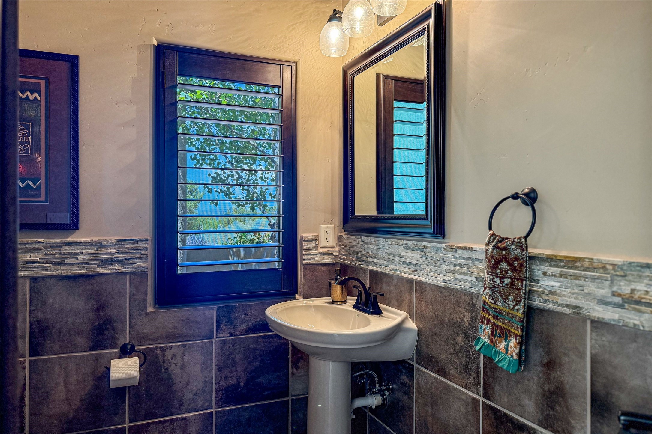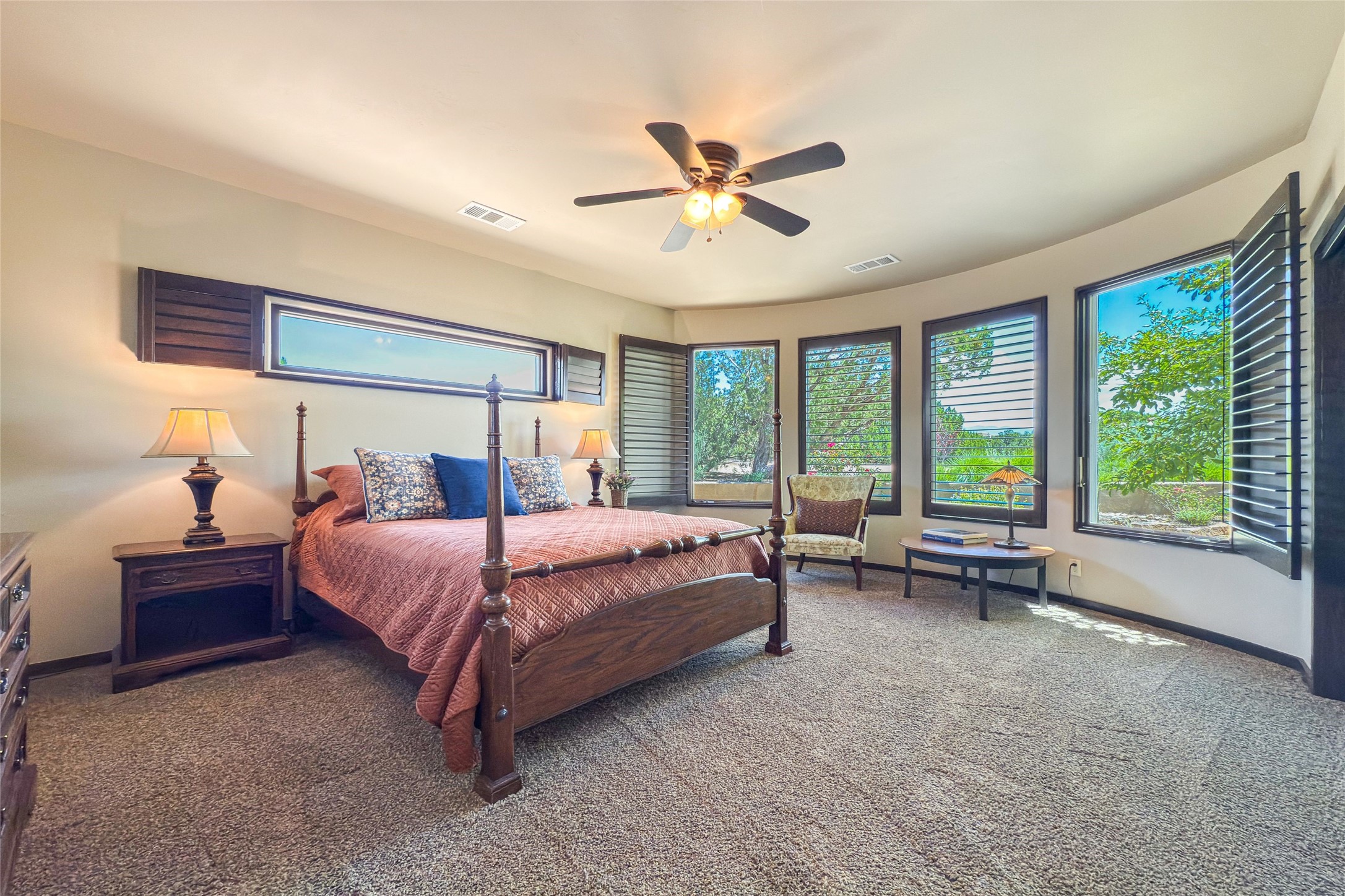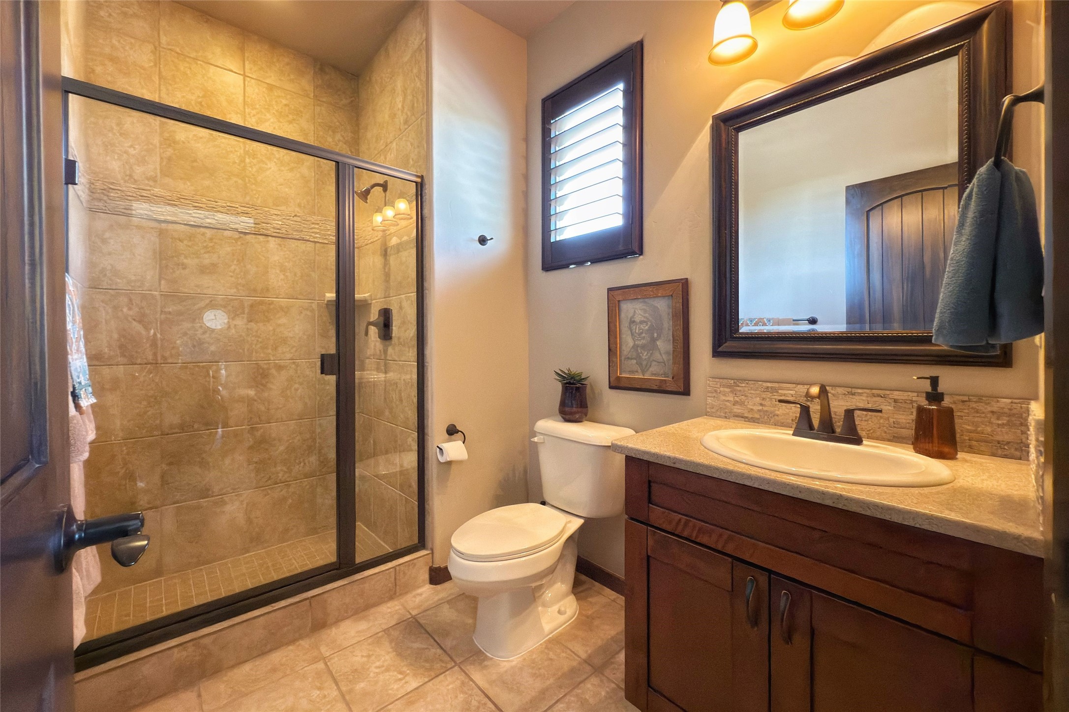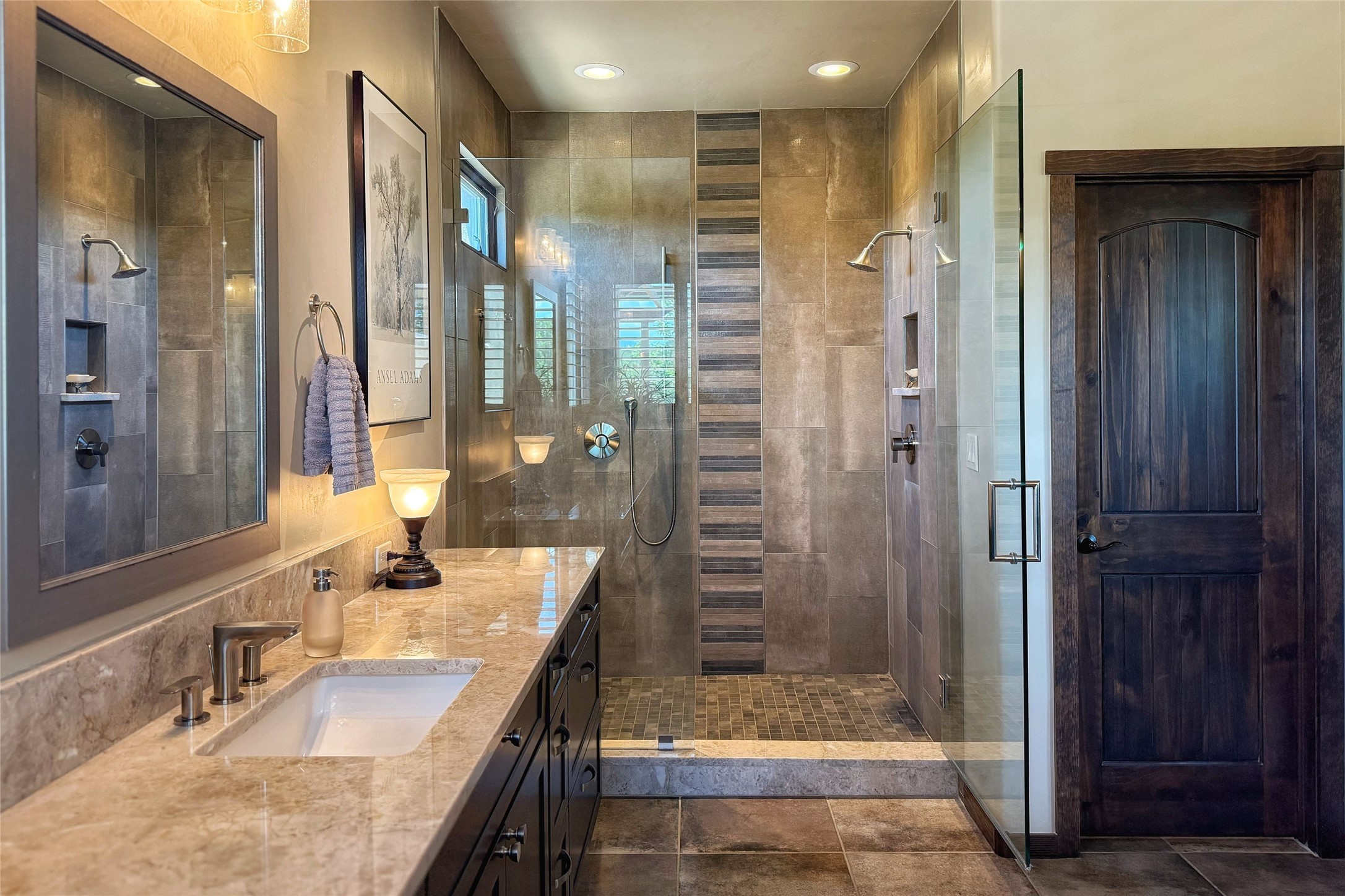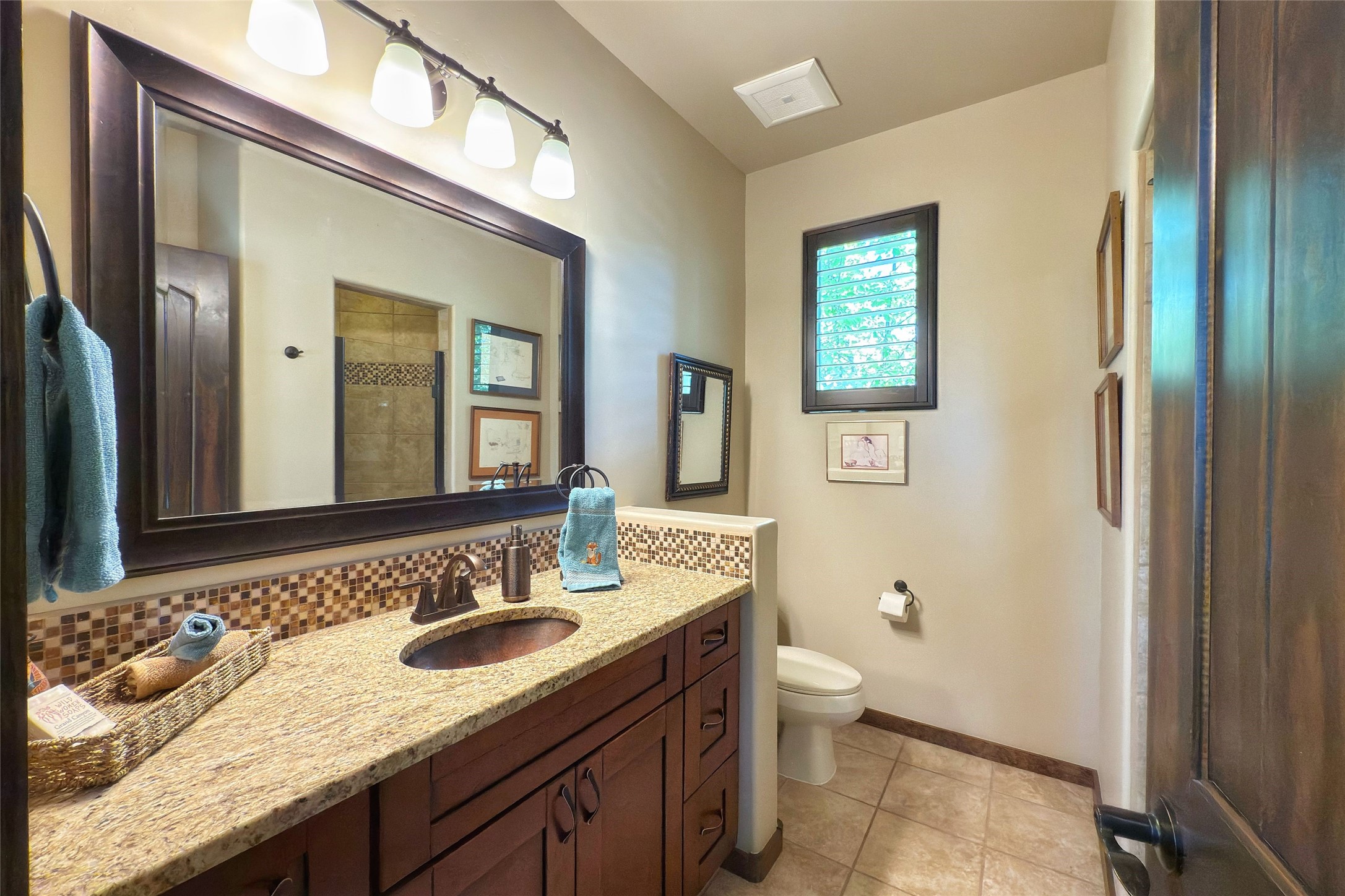 Peaceful elegance with sunset views. Welcome to a serene, custom-crafted sanctuary where timeless design meets contemporary comfort. Nestled in a quiet setting, this exceptional property offers stunning Sangre and Jemez mountain views, just minutes from the exclusive amenities of Las Campanas, including the Ranch Estates equestrian facilities. Every detail of this thoughtfully designed home reflects architectural elegance and ease of living. Distinctive arches, stained ceiling beams, and porcelain tile flooring create an inviting aesthetic. The curved hallways eliminate visible doorways in main areas, encouraging seamless, tranquil flow. The living room features an Anasazi stacked stone fireplace, expansive bay windows, and programmable remote-controlled shades. The chef's kitchen offers a large waterfall island, JennAir appliances, Fulgor range, custom cabinetry, and Anasazi stone backsplash--ideal for both daily use and stylish entertaining. A State-of-the-art sound studio capable of professional music production features hardwood flooring and was built using a sophisticated, advanced sound proofing wall spring system which effectively blocks noise and vibration transfer. The studio has a dedicated 20-amp panel, and mini split for comfort. This space would make an excellent media room for anyone! The spacious primary suite includes a gas kiva fireplace, large picture windows with Sangre views, portal access, and a spa-like bath with Caesarstone finishes, corner windows, and oversized shower. Two additional ensuite bedrooms--one with bay windows and one flex/guest space--offer comfort and versatility. Outdoor living includes a built-in grill, granite counters, water feature, and flagstone paths winding through native landscaping and a 4-cistern-fed irrigation system. Additional highlights include custom wood shutters on all windows, skylights throughout, stained doors/baseboards, new paint, and new tankless water heater. A rare blend of elegance, privacy, and ease.