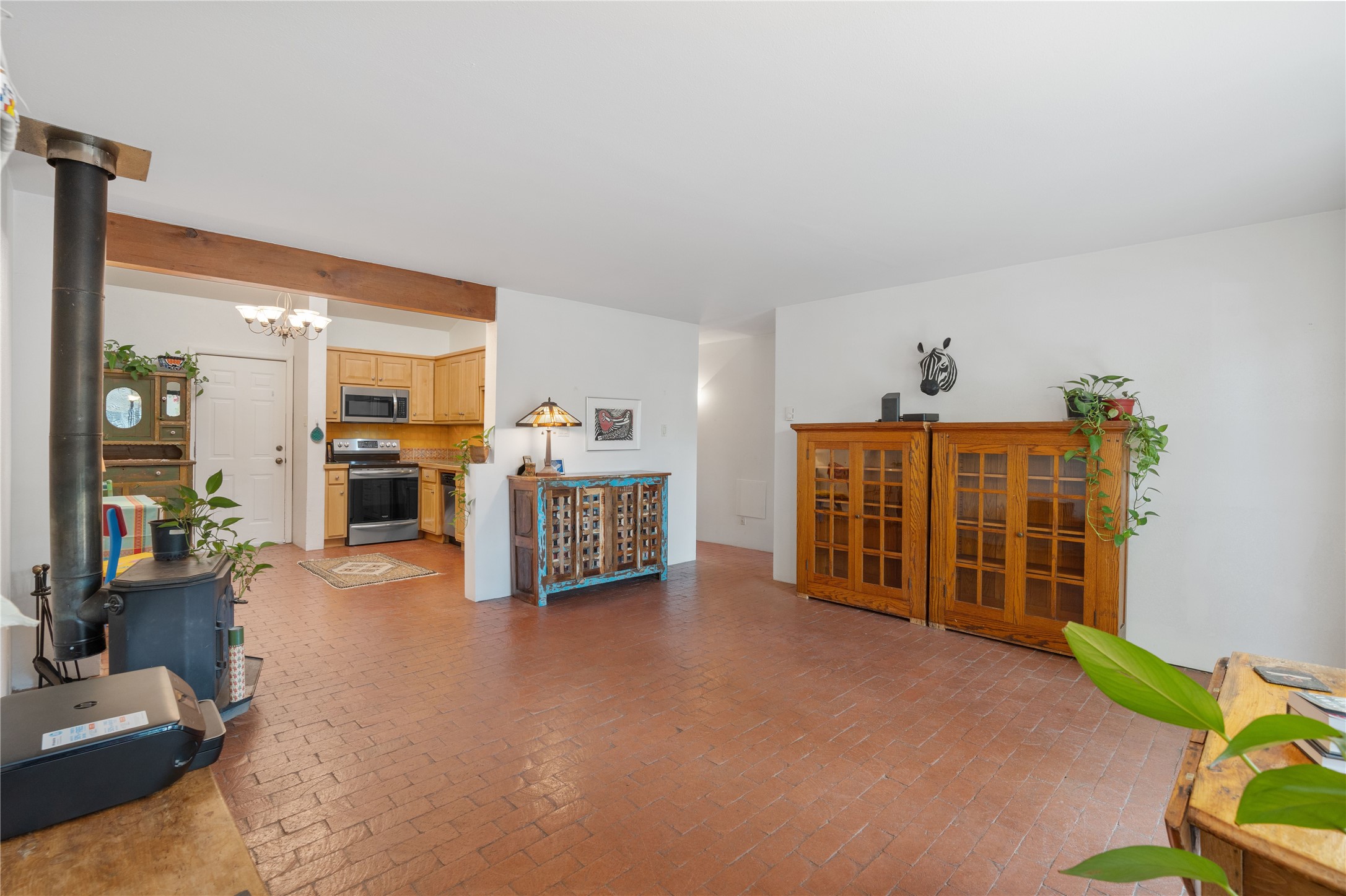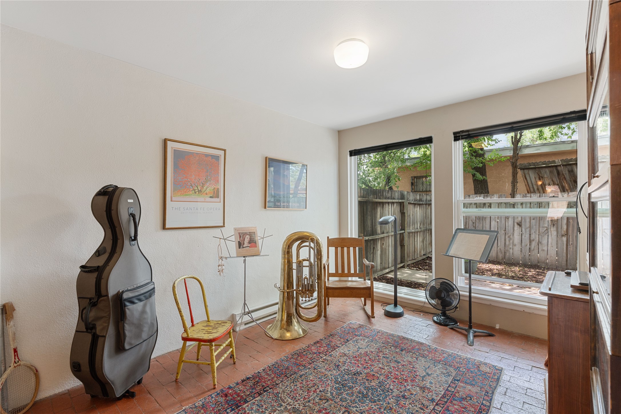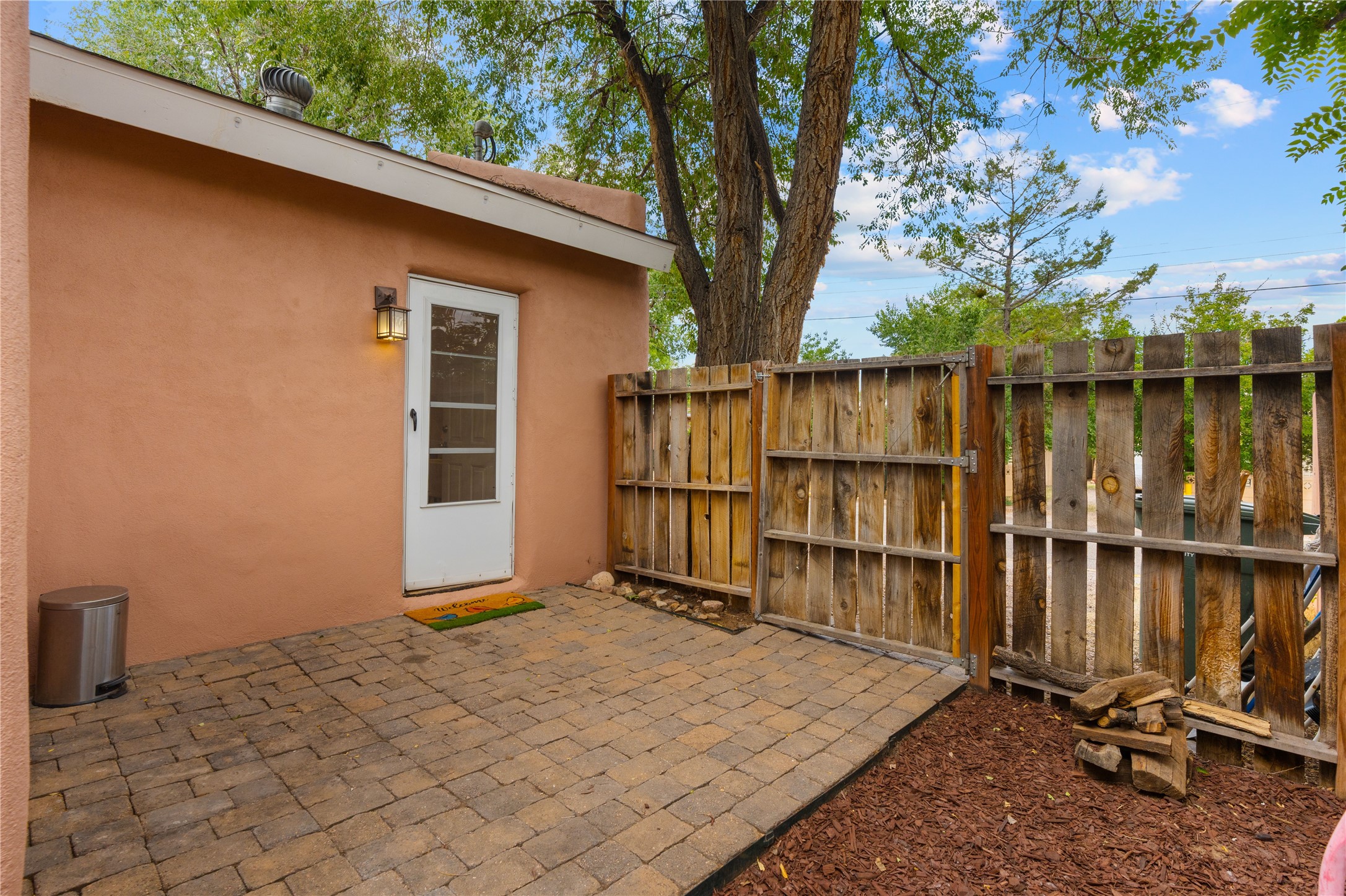 Tucked away on a quiet, tree-lined street, this two-bedroom, one-bath condo offers the perfect blend of privacy and convenience. Located just a short stroll from the vibrant downtown plaza, farmer's market, local galleries, restaurants, and boutique shopping, you'll enjoy the best of in-town living in a serene setting. One of only four units in a peaceful complex, this home features low HOA fees that include insurance and refuse service. Step inside to a warm, open concept living space with brick floors, passive solar design, and a cozy woodburning stove. The new double-pane windows provide natural light while ensuring year-round comfort. Recent upgrades include a new water heater, walk-in shower with safety bars, and a Eurepean-style washer/dryer combo. No steps. Two private patios shaded by mature trees offer ideal outdoor spaces for relaxing or entertaining. Additional perks include two dedicated off-street parking spots. Note: Enter the condo on Ambrosio Street and look for the Sotheby's sign. Please park on the street.