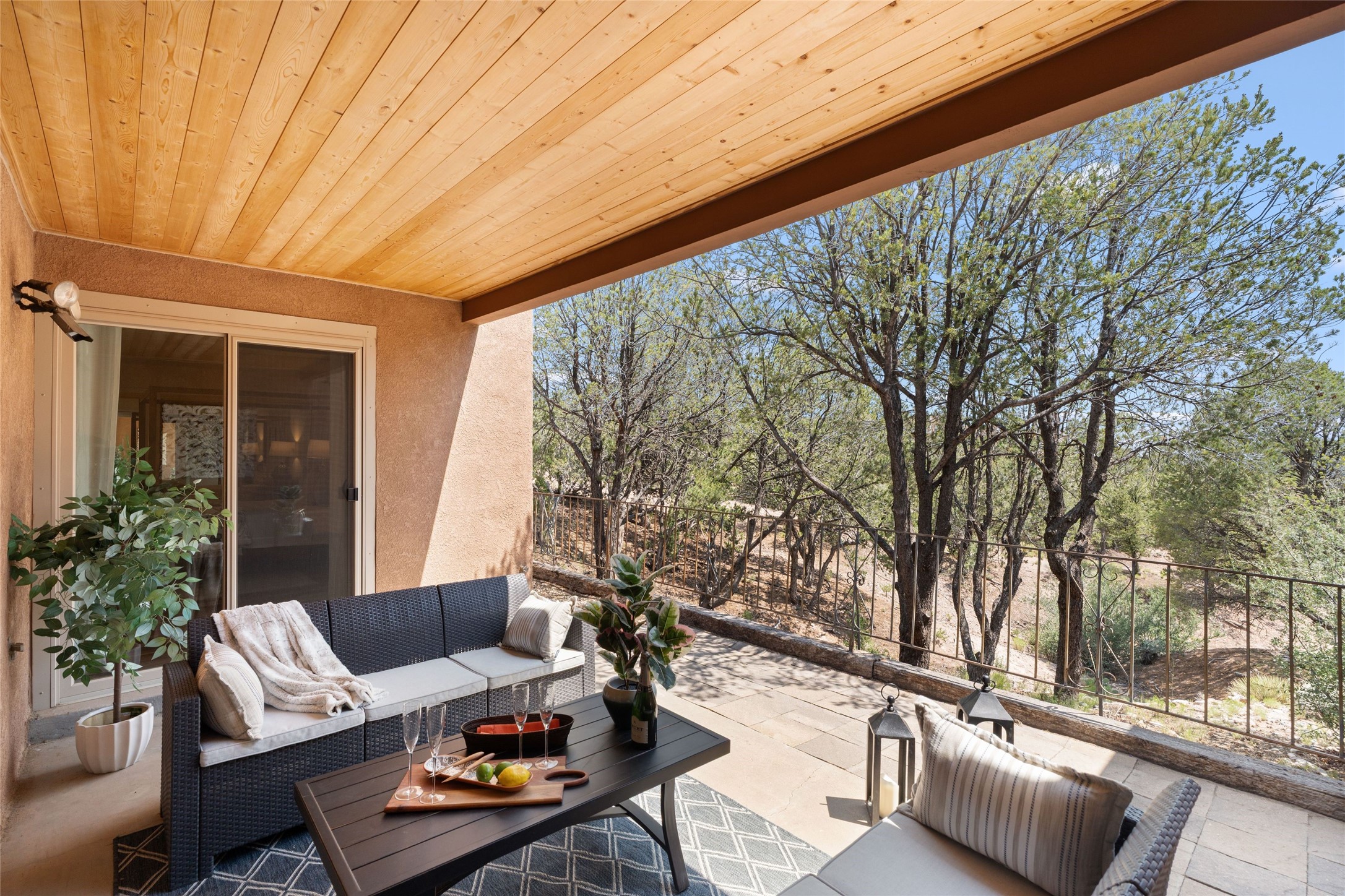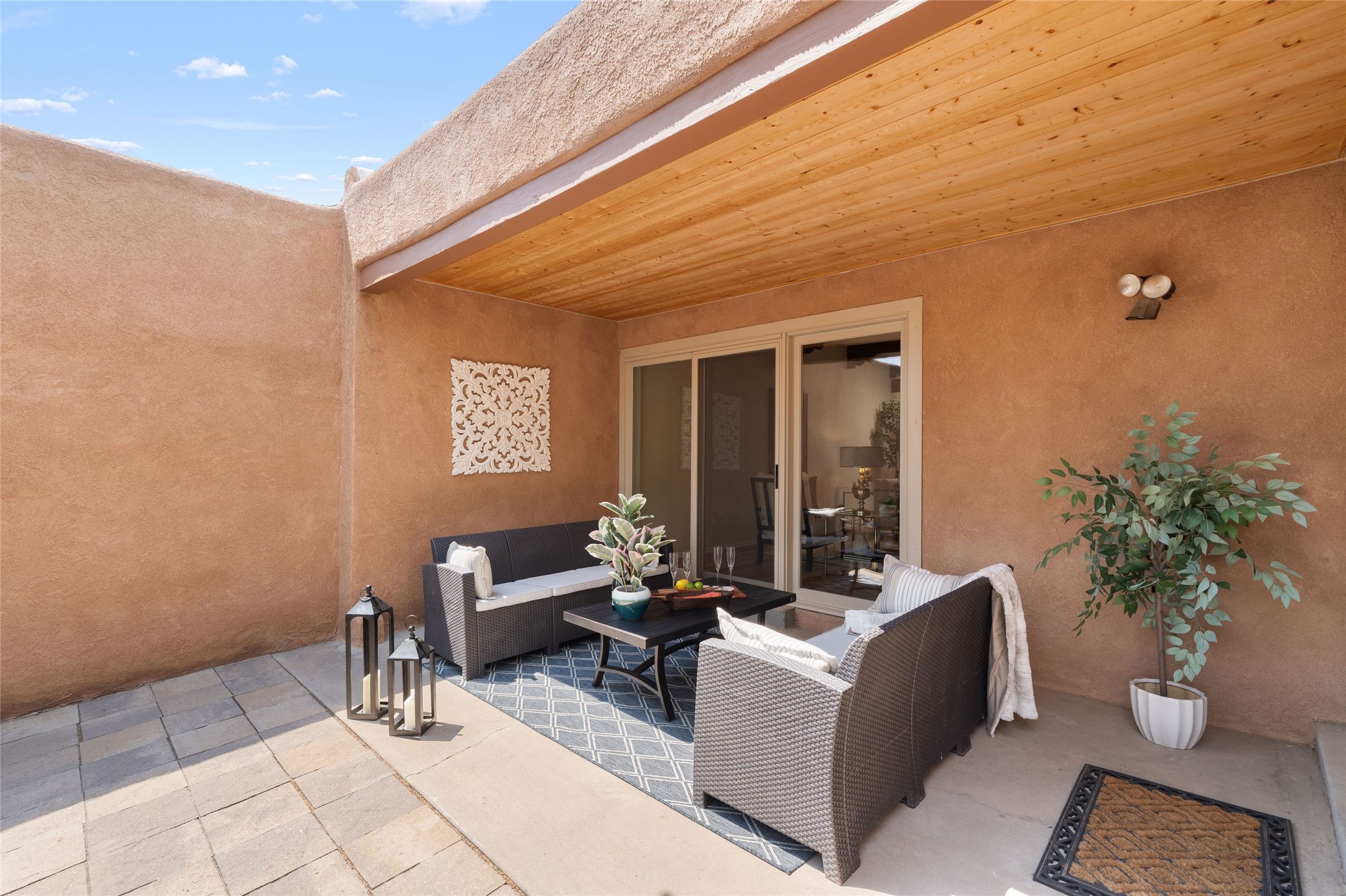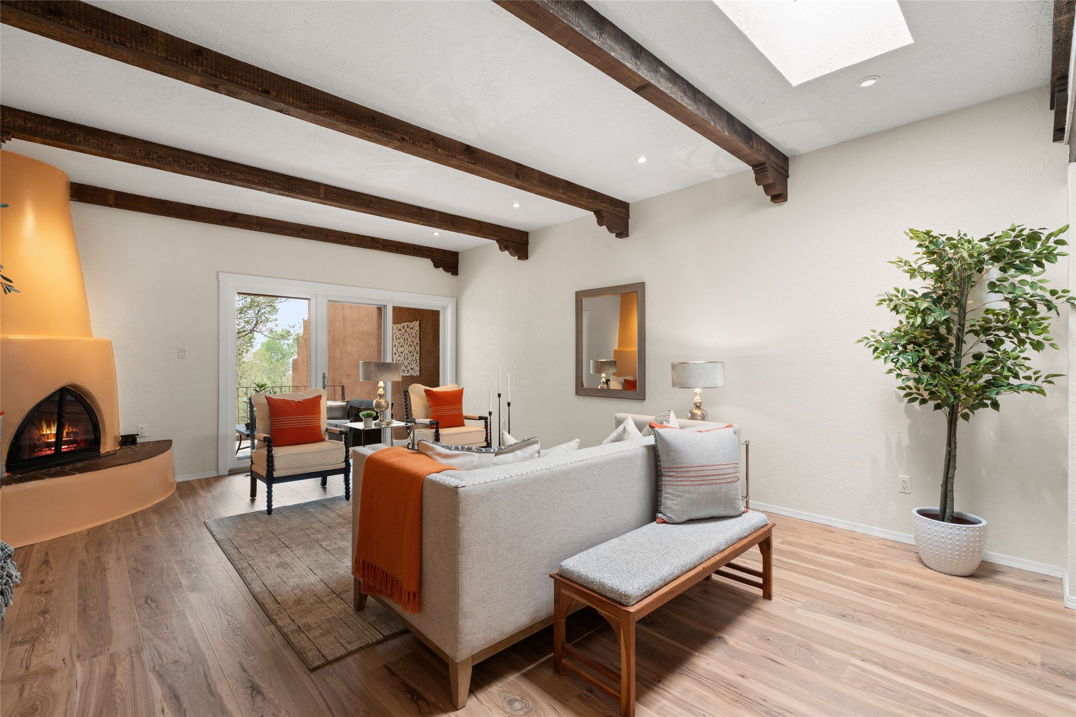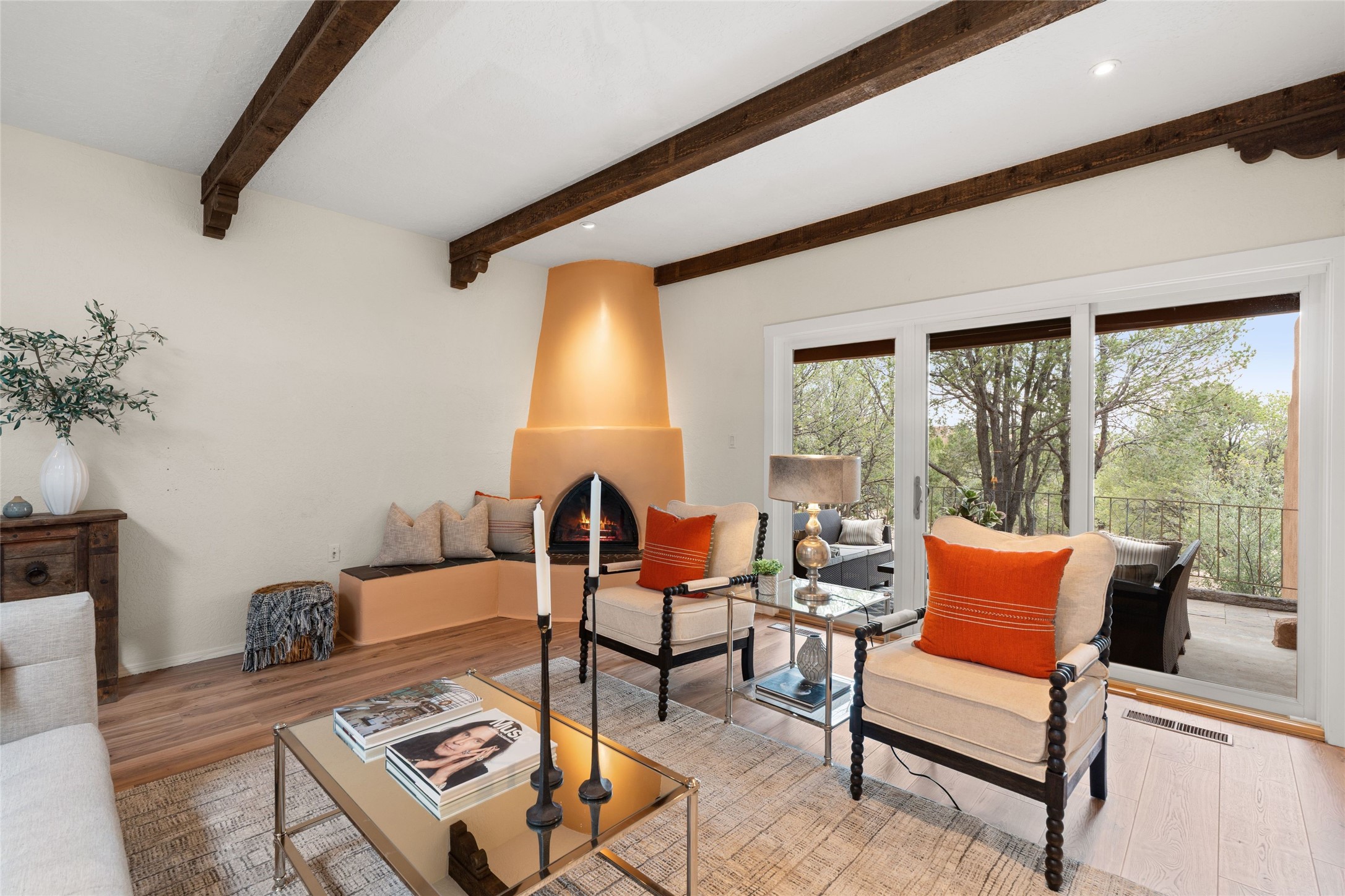Live the Loma Encantada lifestyle (Enchanted Hill) in this updated & private 2 Bedroom/ 2 Bathroom single-level townhome only minutes to the Plaza, galleries, restaurants, museums, hiking, skiing and new Ft. Marcy pickleball courts! Set in a serene & wooded cul-de-sac, you are tucked away surrounded by Pinon and Juniper trees. This home has an exceptional floor plan with a large Living and Dining, wood beams and corbels and a classic corner kiva fireplace. Walk directly outside from the Living Area to a lovely covered portal and deck area with wooded views and distant southern views of the Sandia Mountains. Adjacent to the entry is an updated Kitchen and breakfast area. The Primary Bedroom and 2nd bedroom are located down a hallway and both are generously sized with ample closets and space for additional lounge seating and/or a desk area. Also the Primary Bedroom allows direct access to the outside portal and deck for morning coffee or nighttime star gazing. Many recent upgrades have been made which include: New engineered wood flooring (no carpeting); new Entry porcelain flooring; new central A/C; a converted kiva fireplace to gas with a custom steel fire screen door, lighting upgrades; Plus there is still one-year left on a membrane roof warranty. Last but not least, this home boasts an oversized 2-car garage with storage closets which is a hard-to-find amenity this close to downtown. Take advantage of this great opportunity to live the sweet Santa Fe lifestyle and call it your new home.