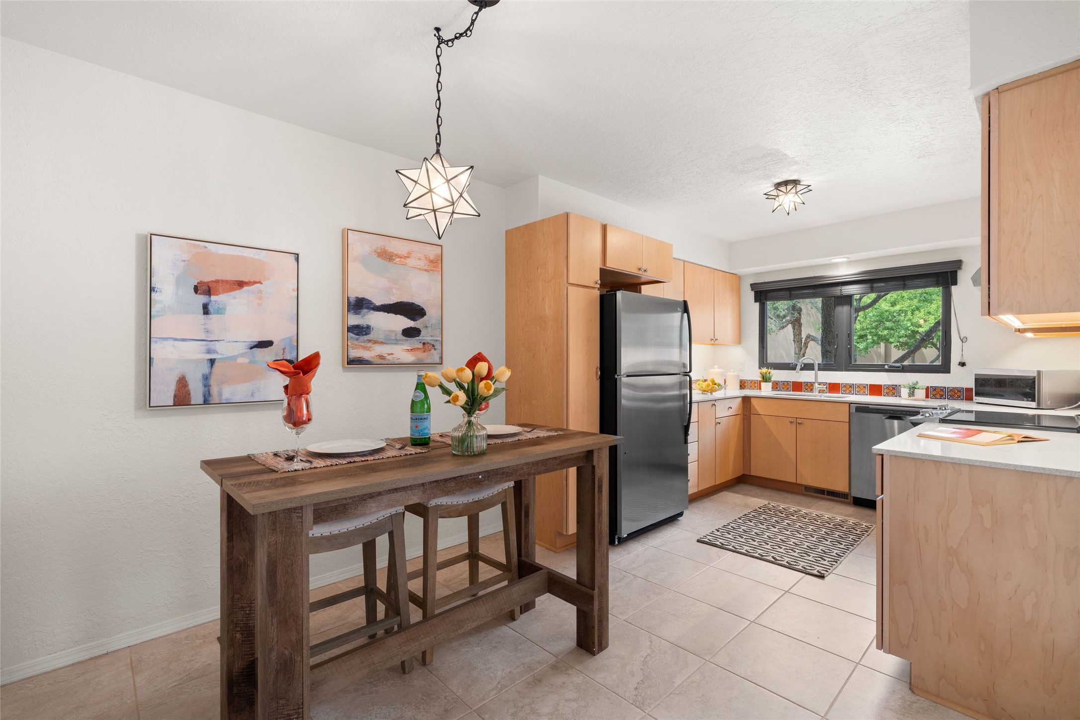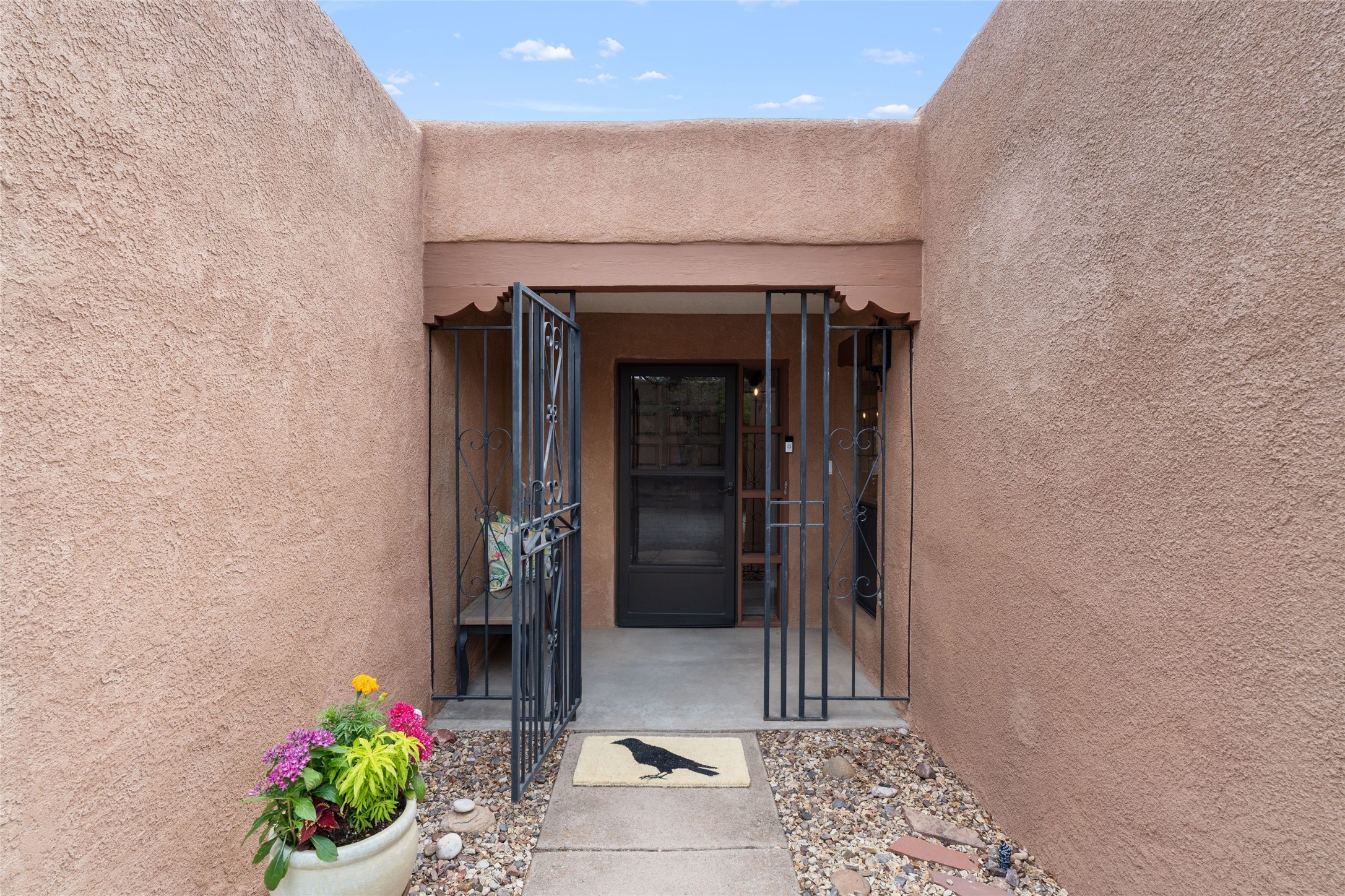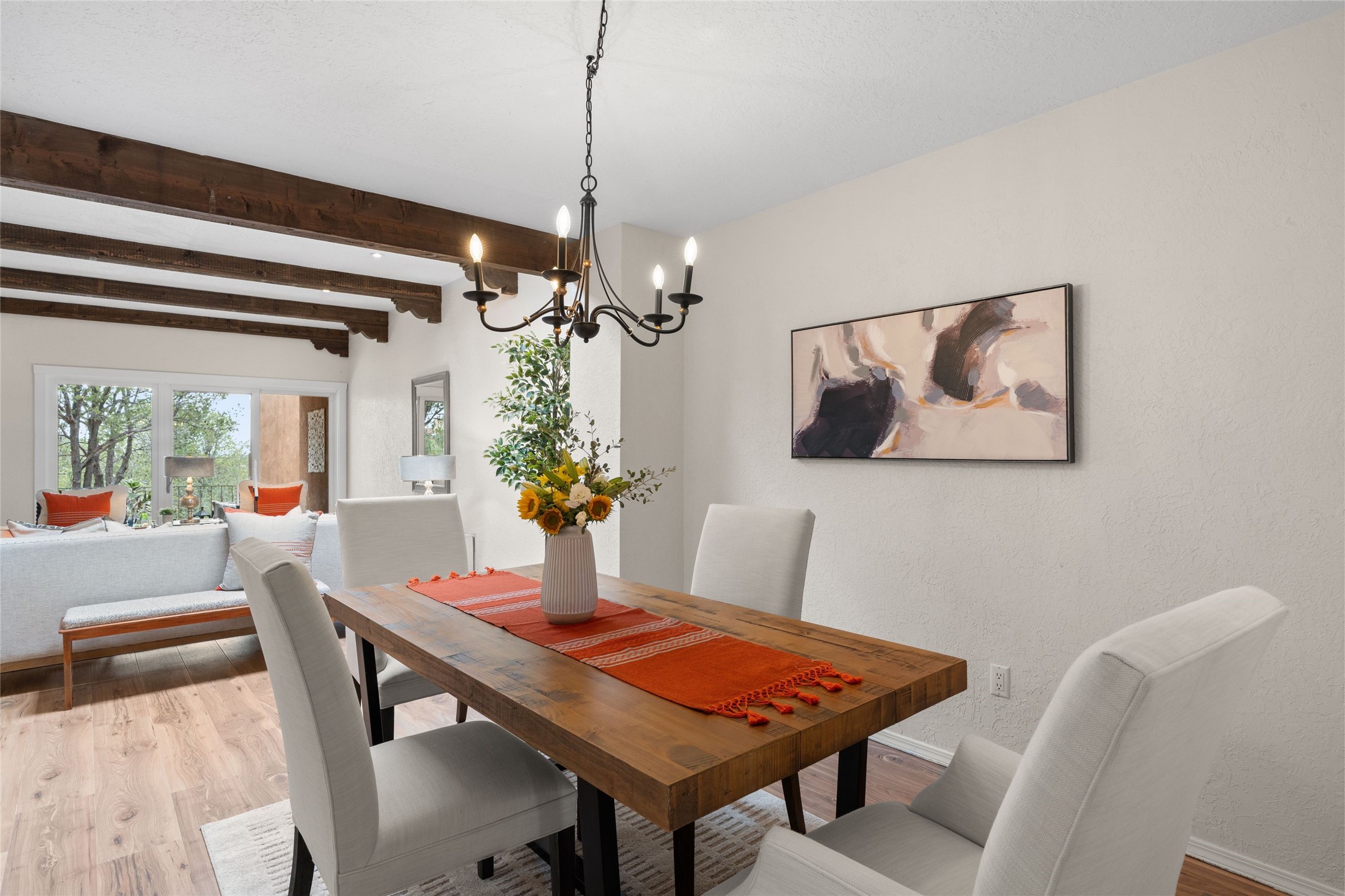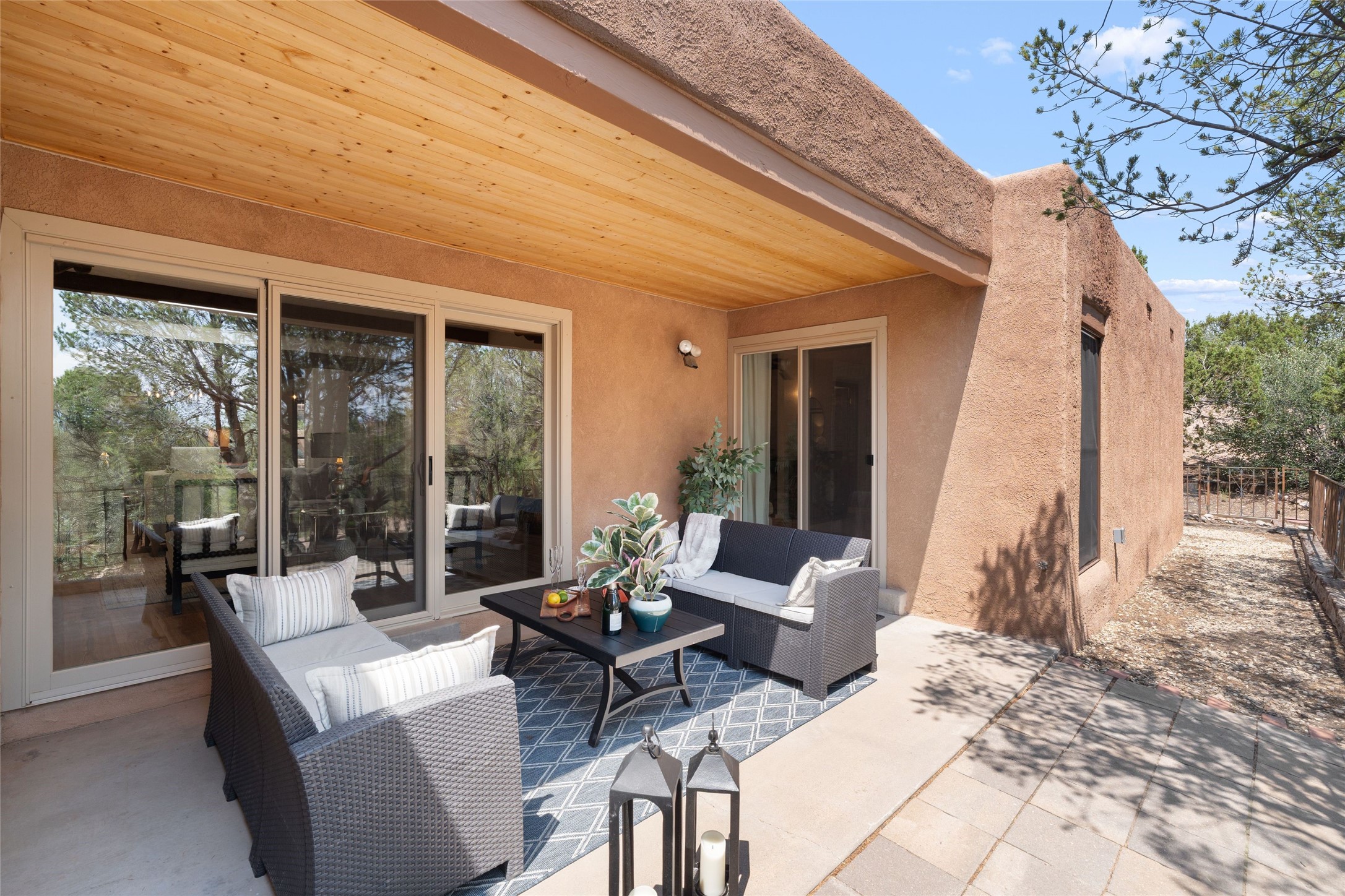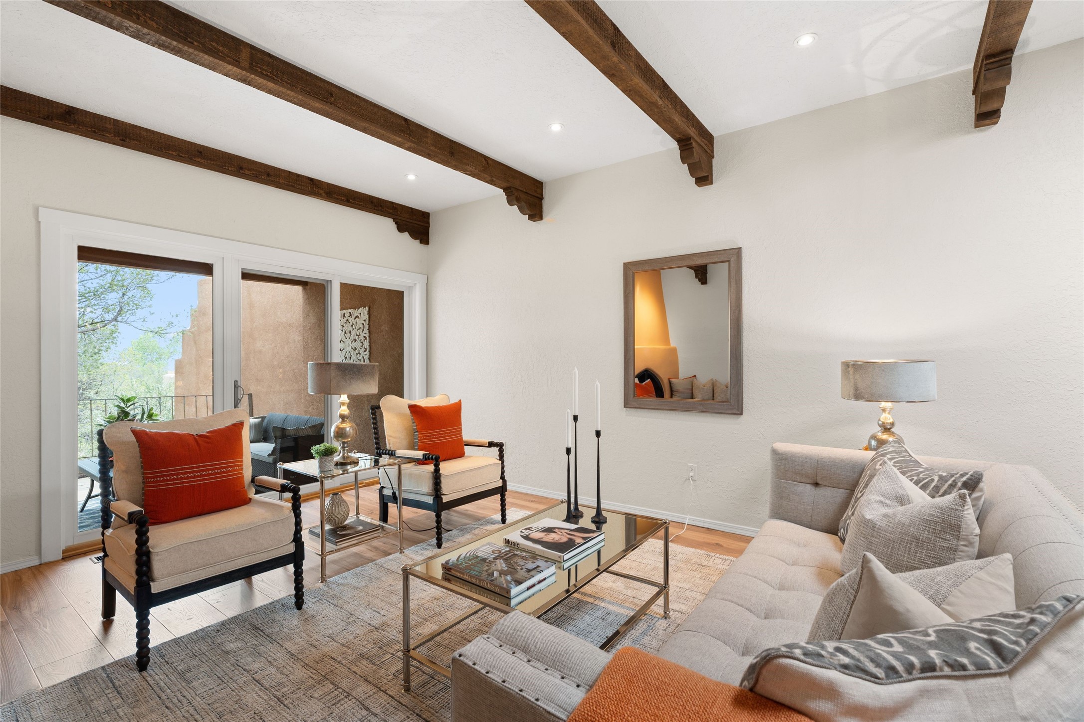Live the Loma Encantada lifestyle (Enchanted Hill) in this updated & private 2 Bedroom/ 2 Bathroom single-level townhome only minutes to the Plaza, galleries, restaurants, museums, hiking, skiing and new Ft. Marcy pickleball courts! Set in a serene & wooded cul-de-sac, you are tucked away surrounded by Pinon and Juniper trees. This home has an exceptional floor plan with a large Living and Dining, wood beams and corbels and a classic corner kiva fireplace. Walk directly outside from the Living Area to a lovely covered portal and deck area with wooded views and distant southern views of the Sandia Mountains. Adjacent to the entry is an updated Kitchen and breakfast area. The Primary Bedroom and 2nd bedroom are located down a hallway and both are generously sized with ample closets and space for additional lounge seating and/or a desk area. Also the Primary Bedroom allows direct access to the outside portal and deck for morning coffee or nighttime star gazing. Many recent upgrades have been made which include: New engineered wood flooring (no carpeting); new Entry porcelain flooring; new central A/C; a converted kiva fireplace to gas with a custom steel fire screen door, lighting upgrades; Plus there is still one-year left on a membrane roof warranty. Last but not least, this home boasts an oversized 2-car garage with storage closets which is a hard-to-find amenity this close to downtown. Take advantage of this great opportunity to live the sweet Santa Fe lifestyle and call it your new home.