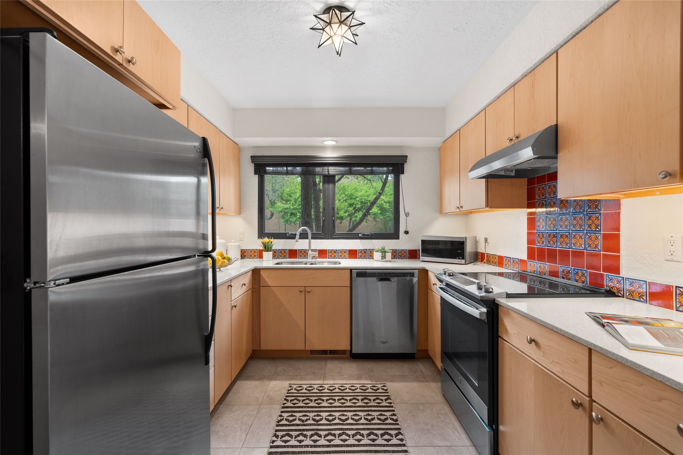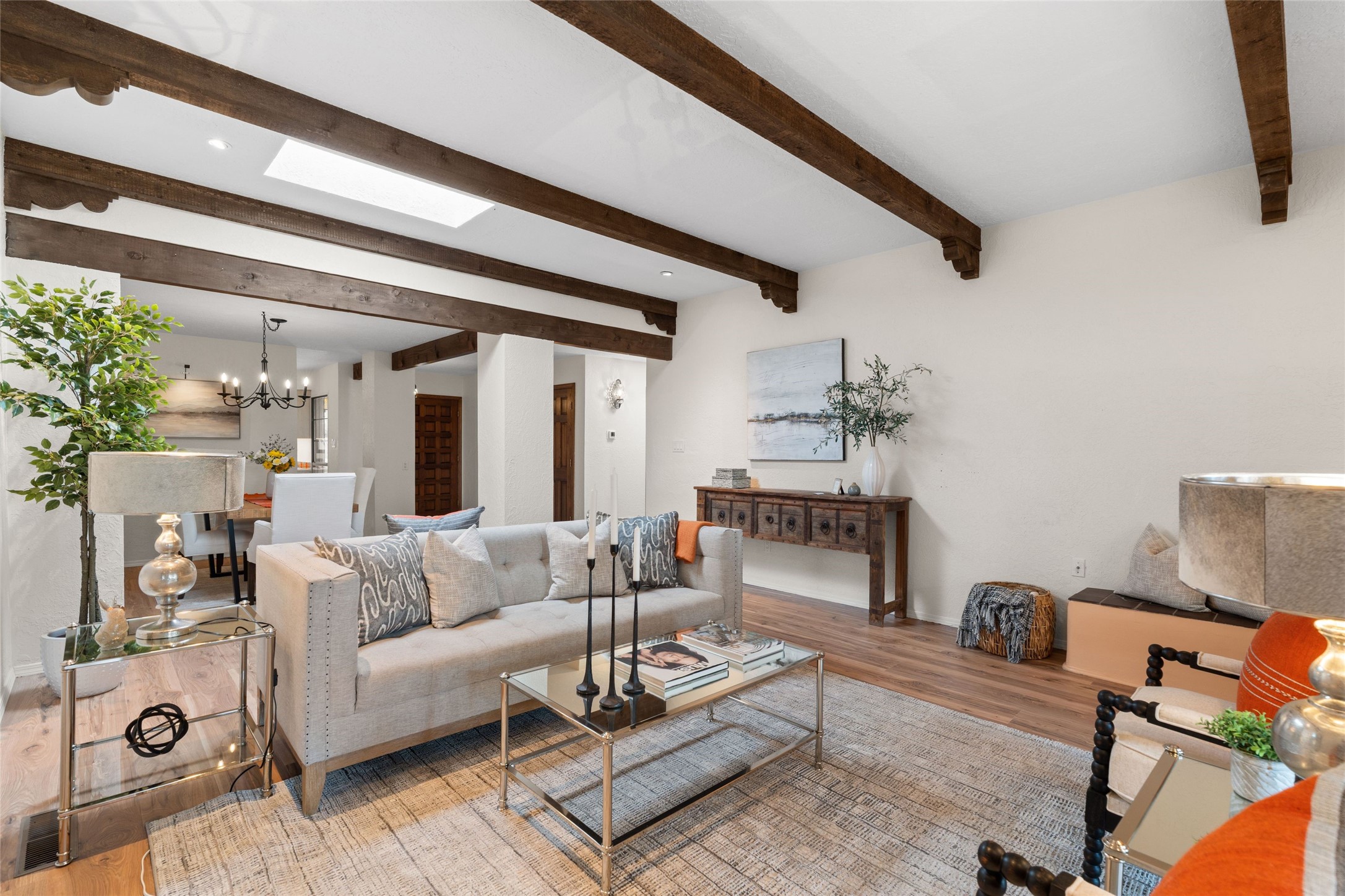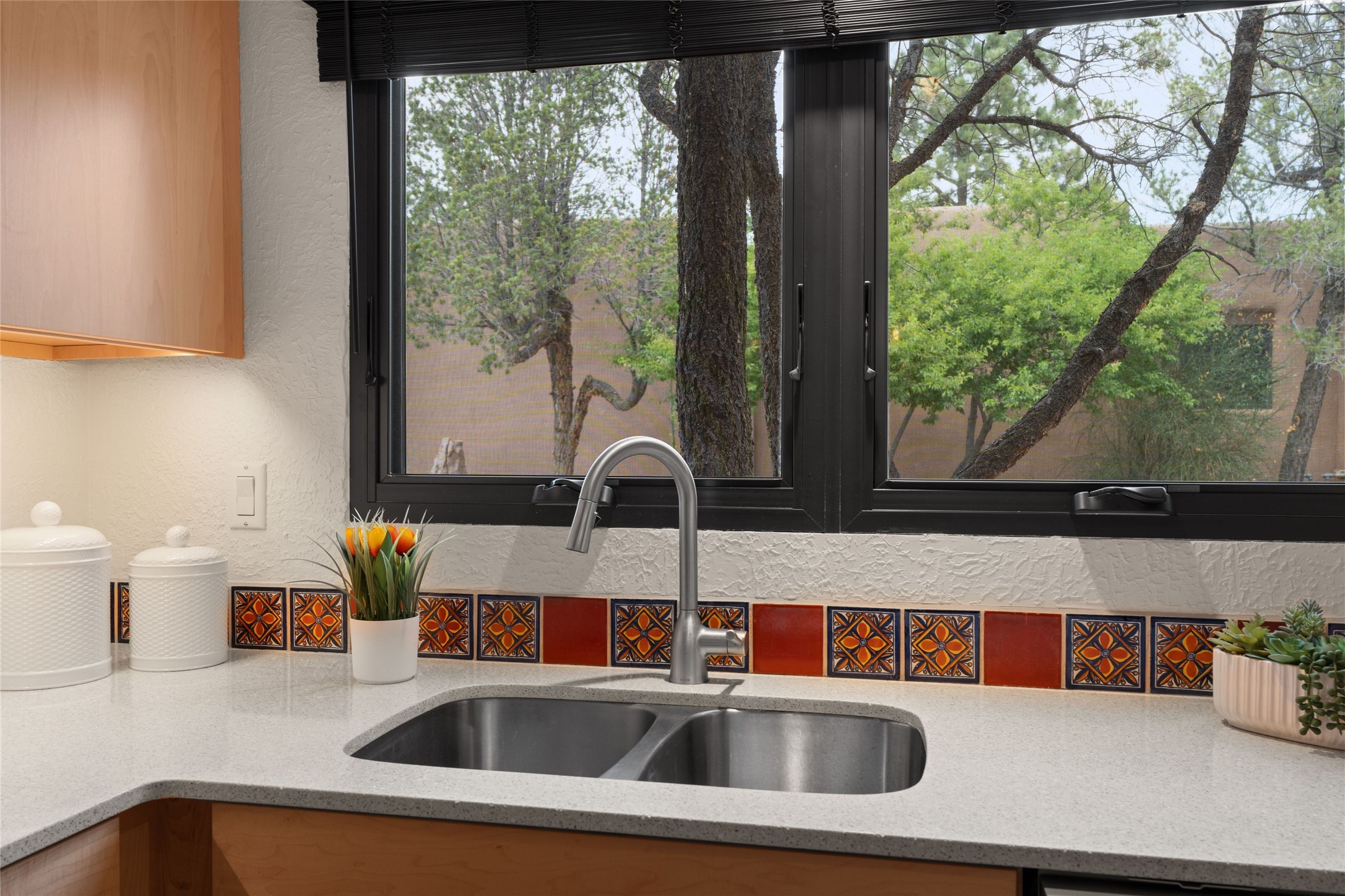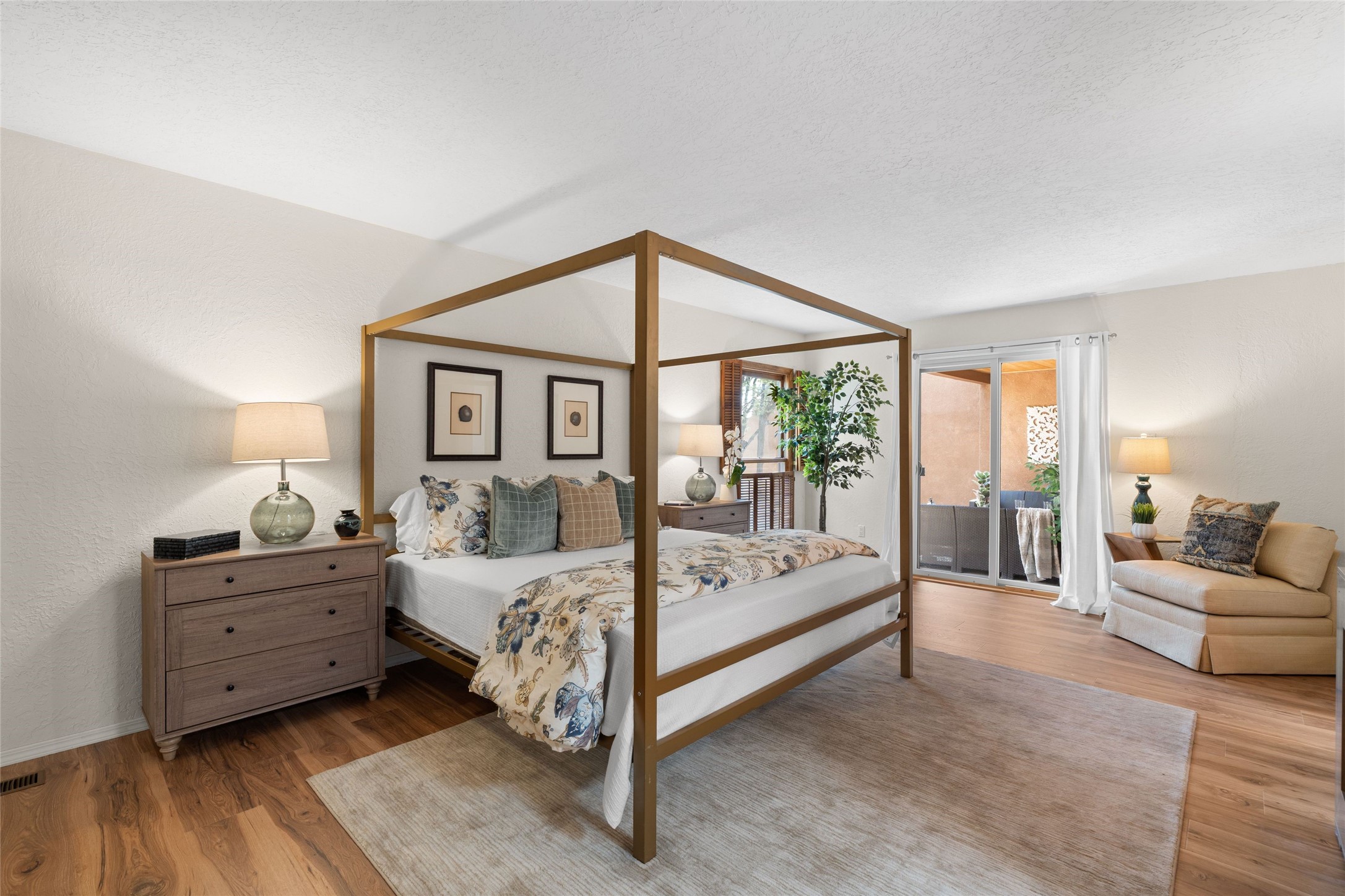 Live the Loma Encantada lifestyle (Enchanted Hill) in this updated & private 2 Bedroom/ 2 Bathroom single-level townhome only minutes to the Plaza, galleries, restaurants, museums, hiking, skiing and new Ft. Marcy pickleball courts! Set in a serene & wooded cul-de-sac, you are tucked away surrounded by Pinon and Juniper trees. This home has an exceptional floor plan with a large Living and Dining, wood beams and corbels and a classic corner kiva fireplace. Walk directly outside from the Living Area to a lovely covered portal and deck area with wooded views and distant southern views of the Sandia Mountains. Adjacent to the entry is an updated Kitchen and breakfast area. The Primary Bedroom and 2nd bedroom are located down a hallway and both are generously sized with ample closets and space for additional lounge seating and/or a desk area. Also the Primary Bedroom allows direct access to the outside portal and deck for morning coffee or nighttime star gazing. Many recent upgrades have been made which include: New engineered wood flooring (no carpeting); new Entry porcelain flooring; new central A/C; a converted kiva fireplace to gas with a custom steel fire screen door, lighting upgrades; Plus there is still one-year left on a membrane roof warranty. Last but not least, this home boasts an oversized 2-car garage with storage closets which is a hard-to-find amenity this close to downtown. Take advantage of this great opportunity to live the sweet Santa Fe lifestyle and call it your new home.